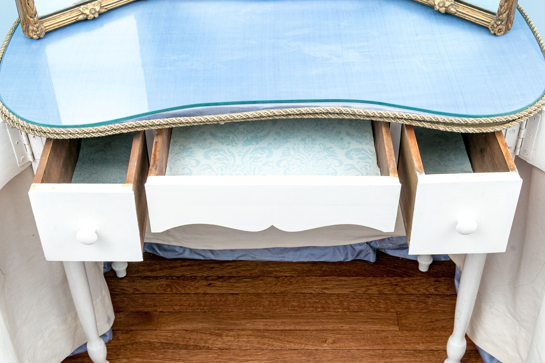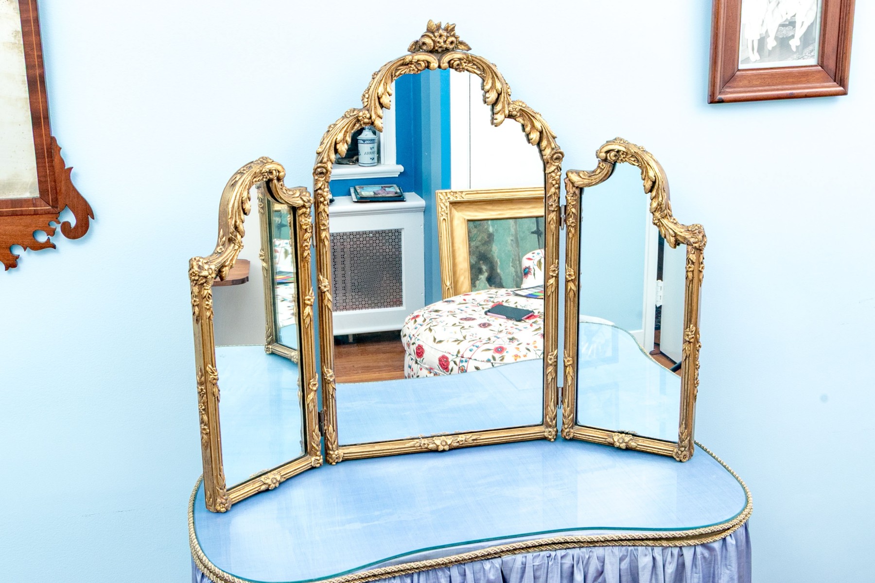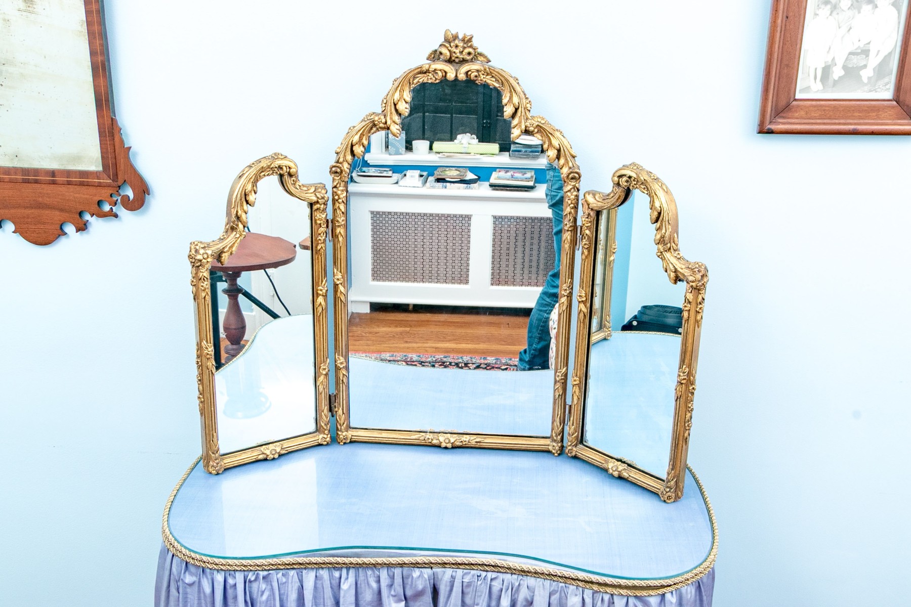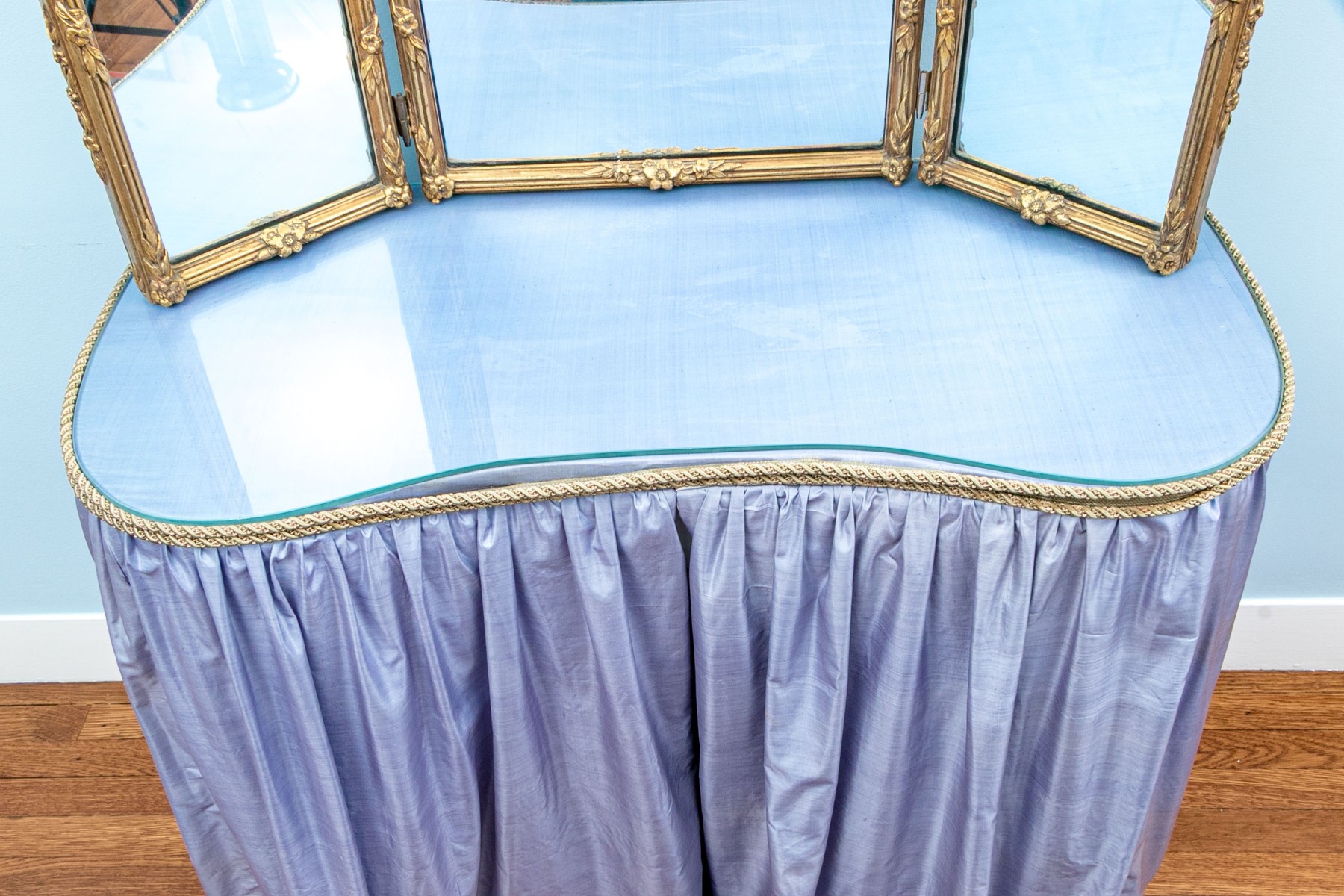 A fabulous vanity setup with eye-catching Louis XVI and Italianate splendor, featuring a three-panel mirror with a giltwood frame with carved gesso foliate flourishes and scrolls following arched forms. The mirror is set atop a glass-topped kidney shaped table draped with periwinkle fabric trimmed with a gilt piped trim, making for a sophisticated and timelessly elegant display.