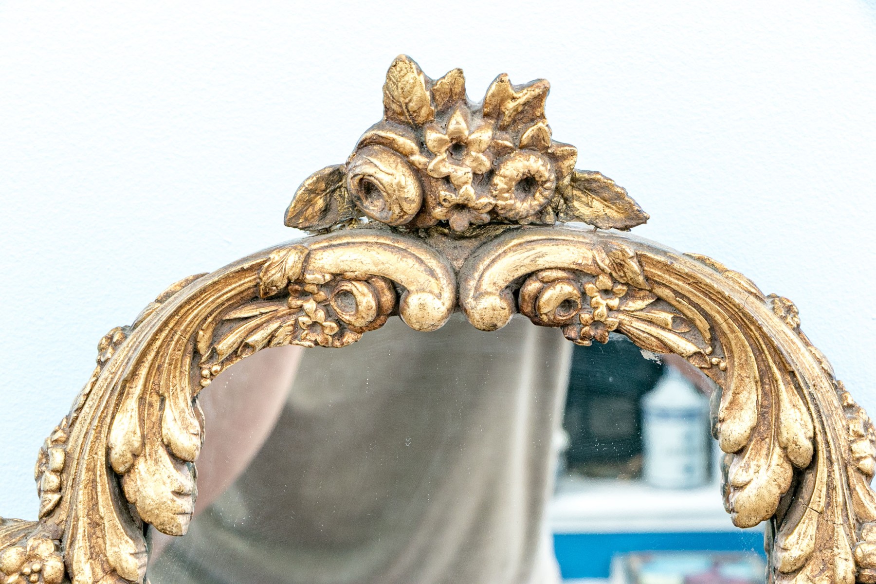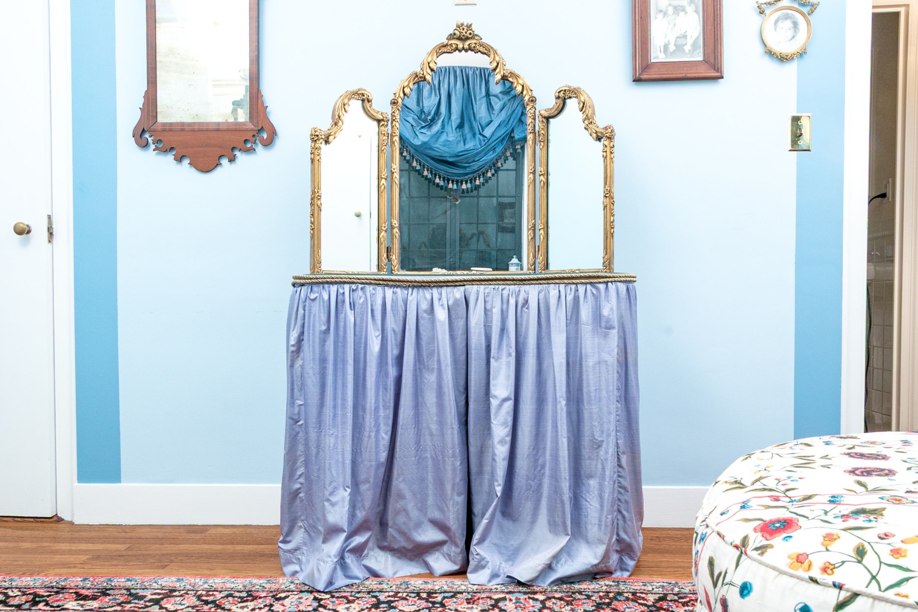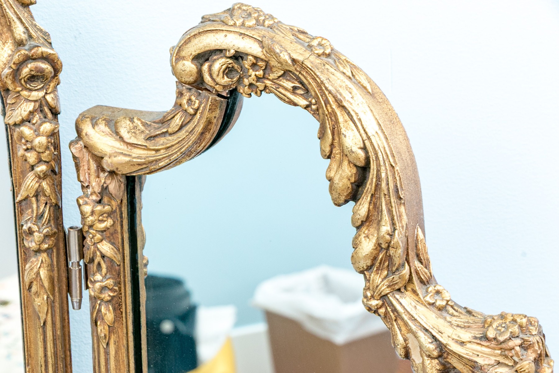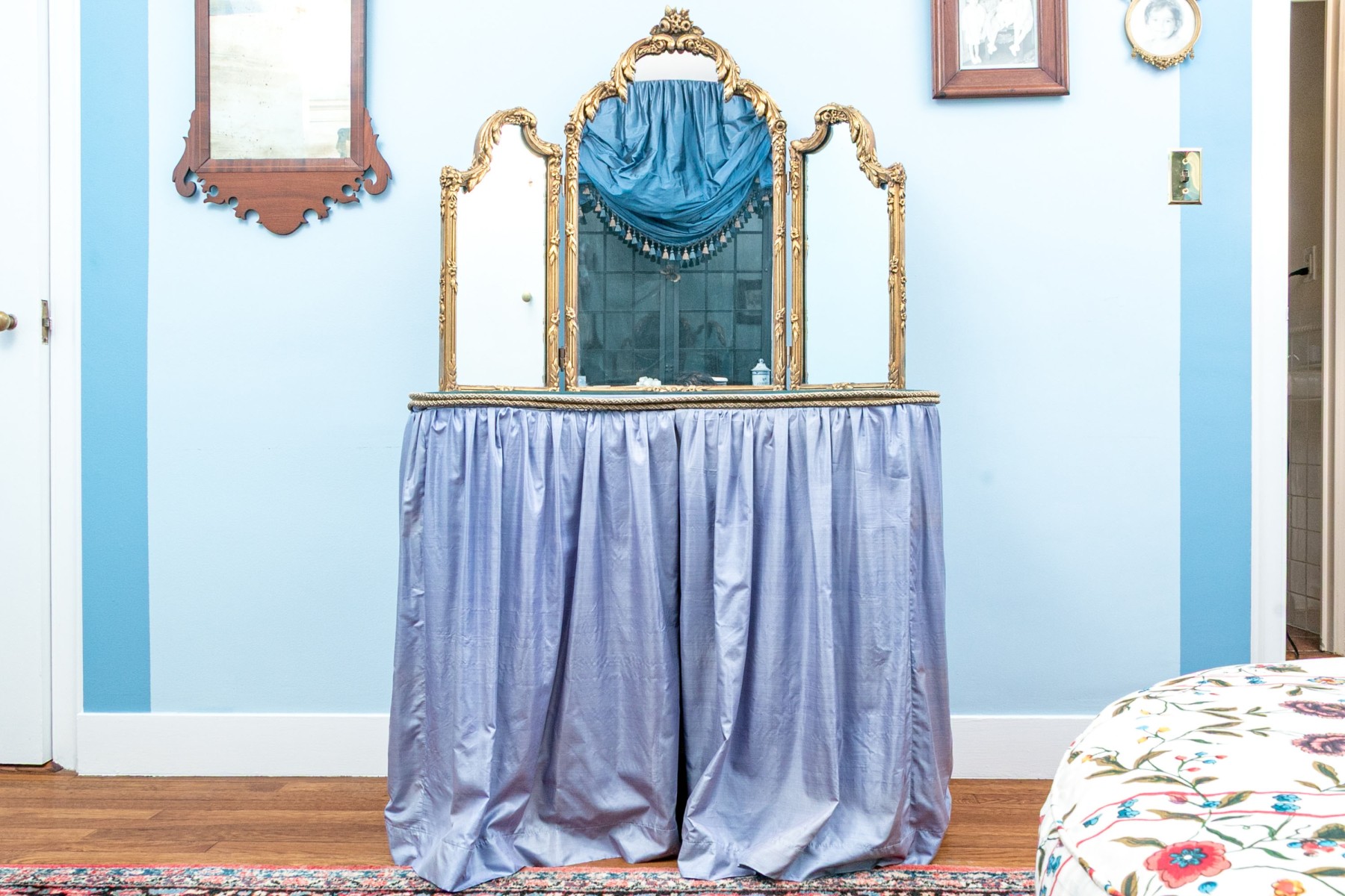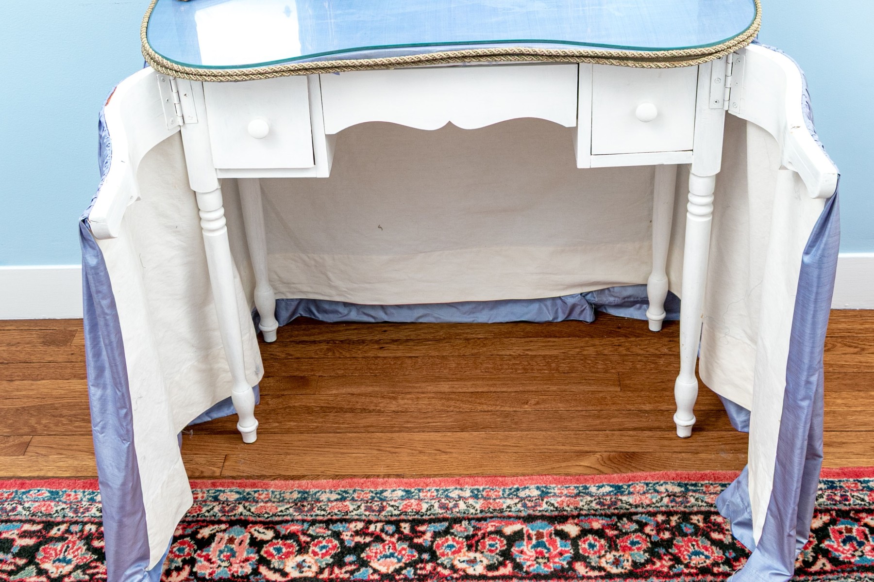 A fabulous vanity setup with eye-catching Louis XVI and Italianate splendor, featuring a three-panel mirror with a giltwood frame with carved gesso foliate flourishes and scrolls following arched forms. The mirror is set atop a glass-topped kidney shaped table draped with periwinkle fabric trimmed with a gilt piped trim, making for a sophisticated and timelessly elegant display.