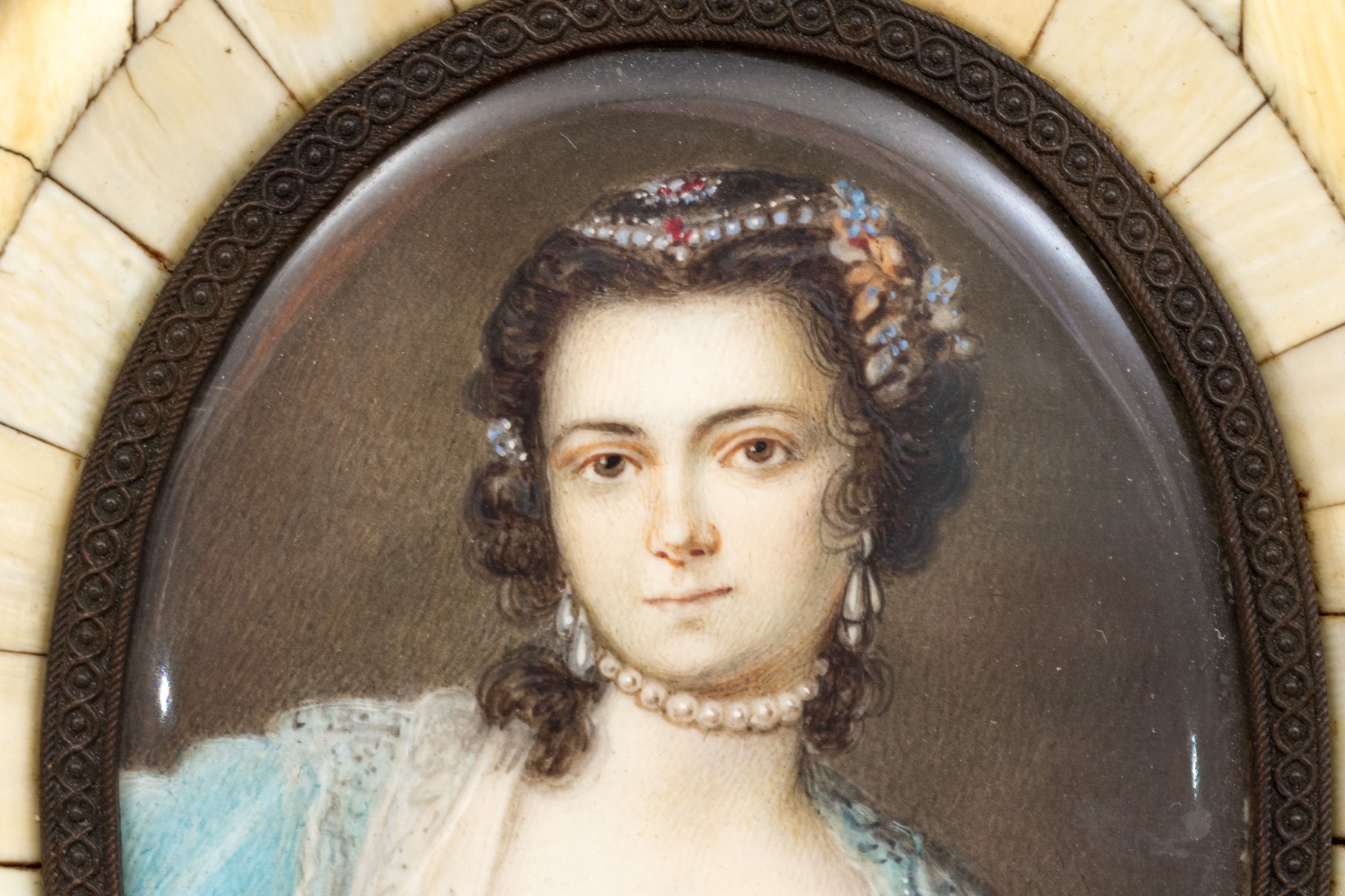 Image of a woman in an elegant blue dress with pearl necklace and earrings.