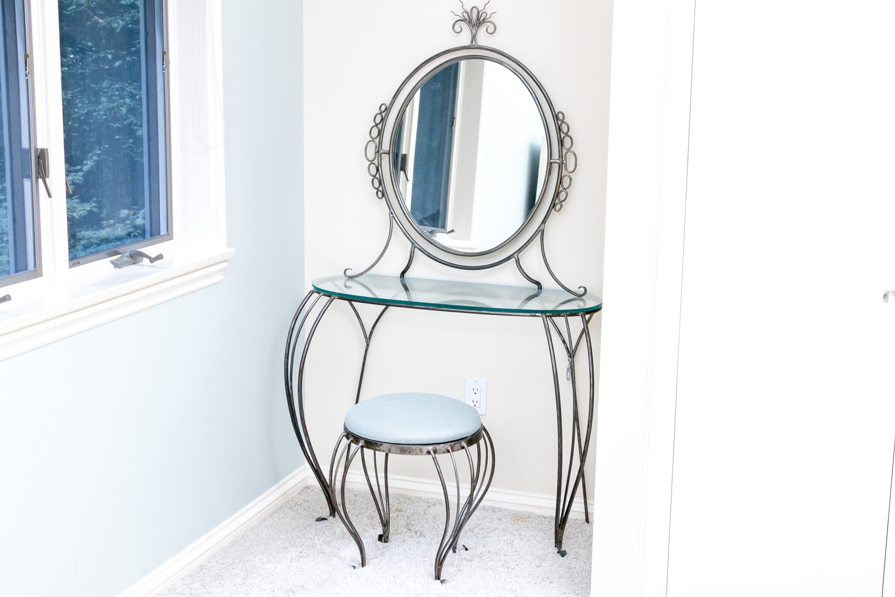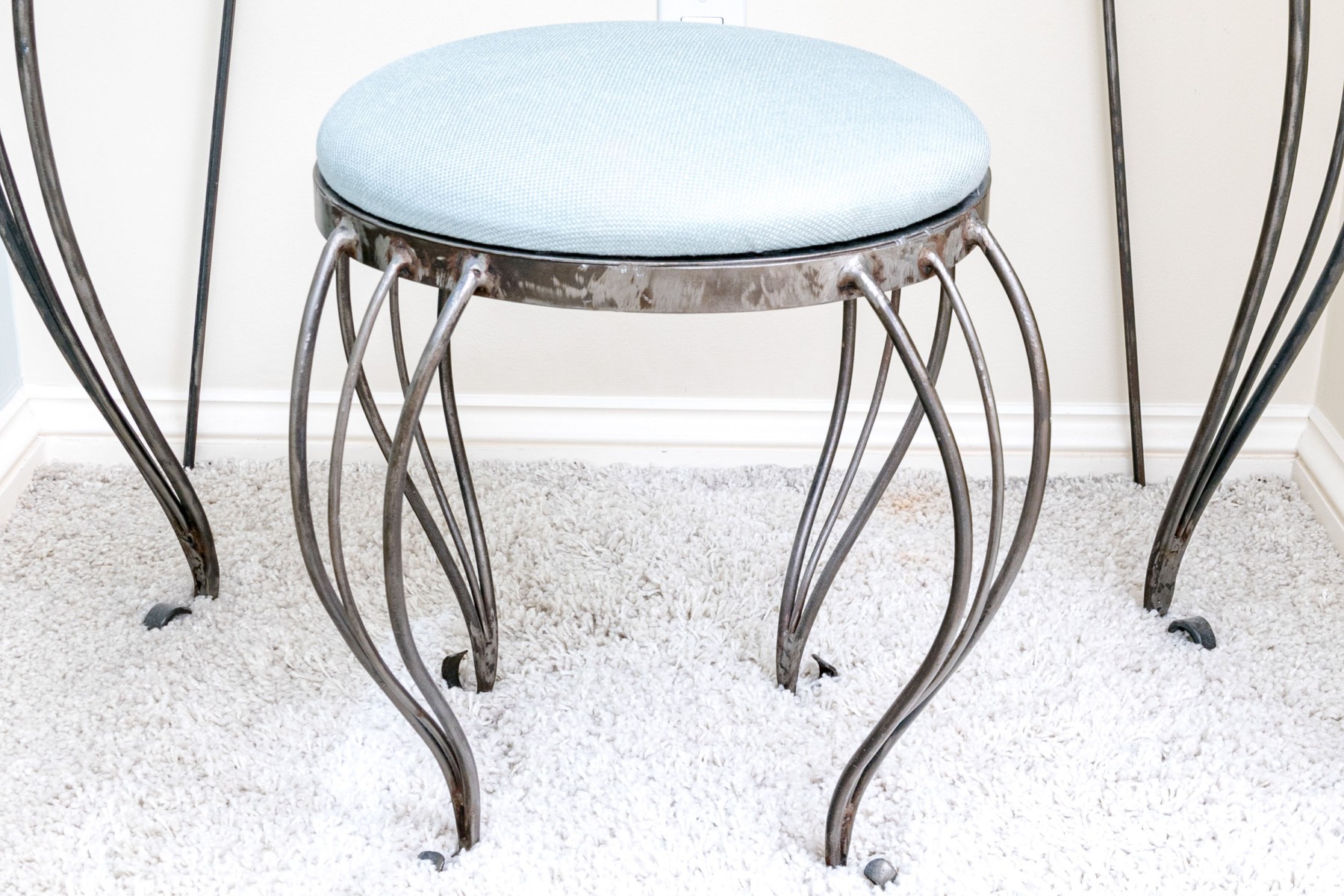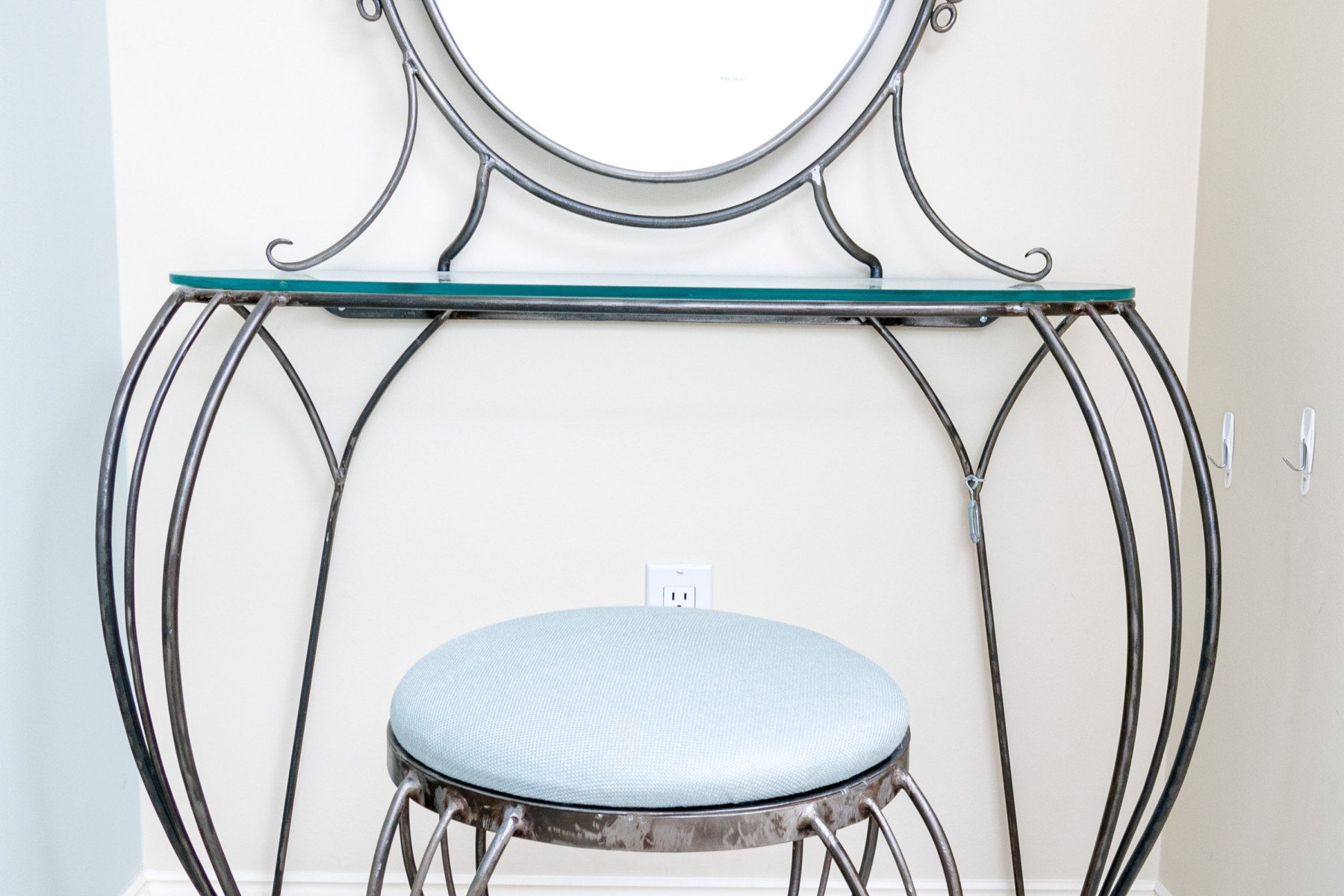 This elegant vanity set features a beautifully crafted iron frame with intricate scrollwork, supporting a sleek, clear glass top. The matching stool is cushioned for comfort, complementing the vanity with its own ornate iron design. Perfect for adding a touch of classic charm to any bedroom or dressing area, this set combines functionality with timeless style.