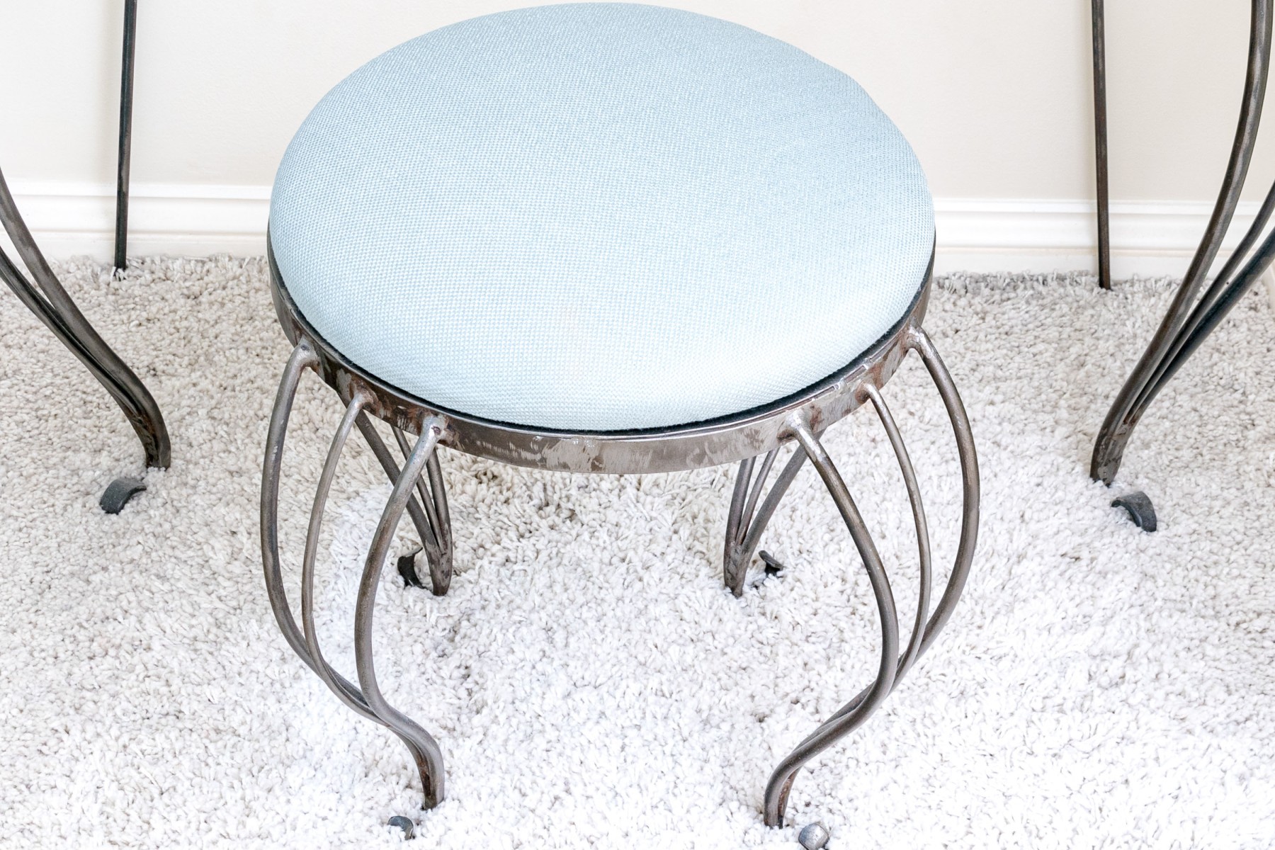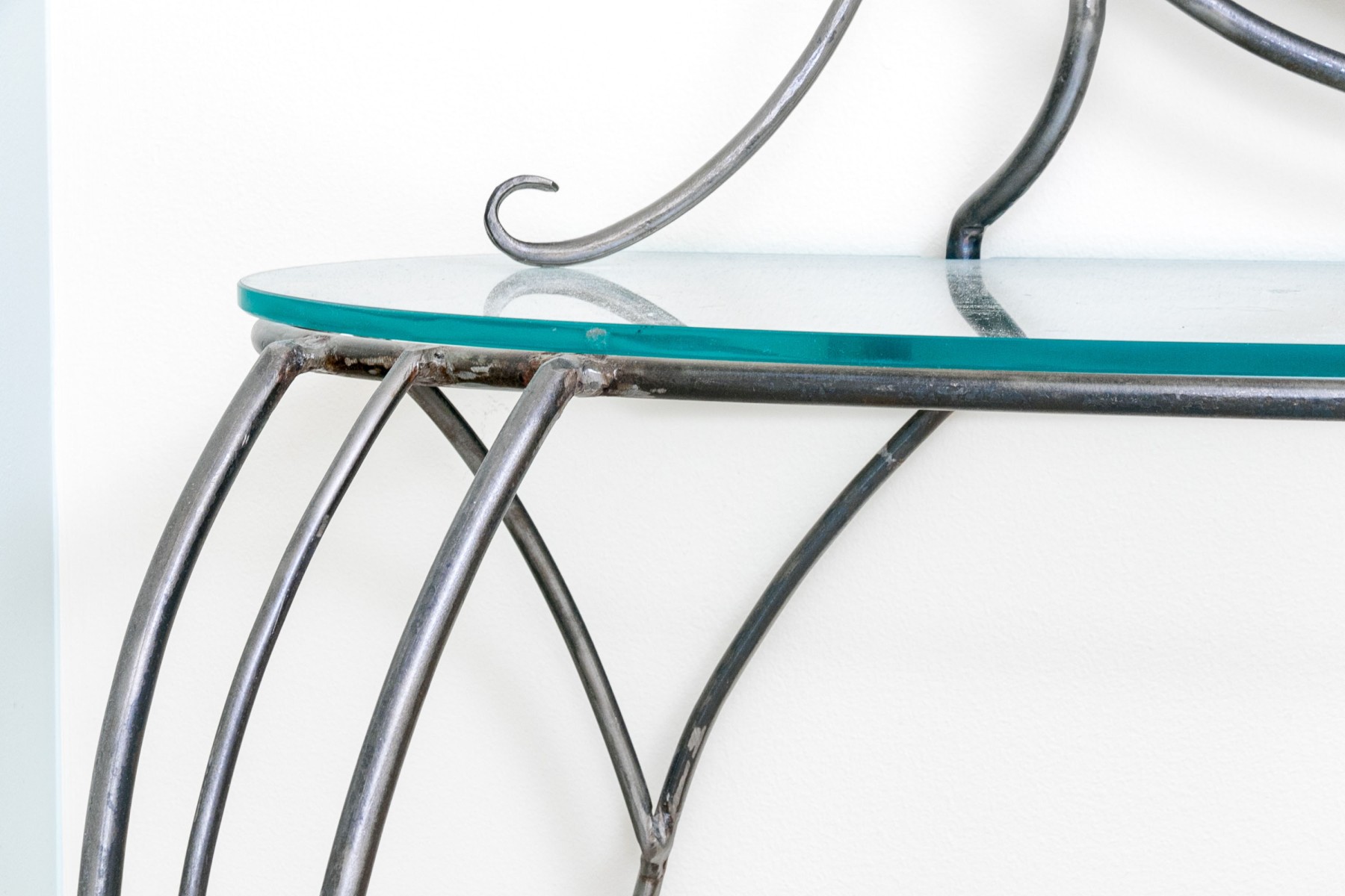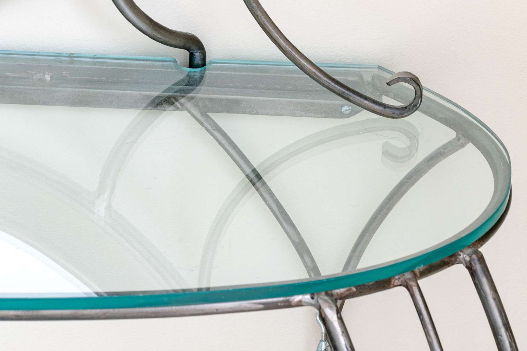This elegant vanity set features a beautifully crafted iron frame with intricate scrollwork, supporting a sleek, clear glass top. The matching stool is cushioned for comfort, complementing the vanity with its own ornate iron design. Perfect for adding a touch of classic charm to any bedroom or dressing area, this set combines functionality with timeless style.