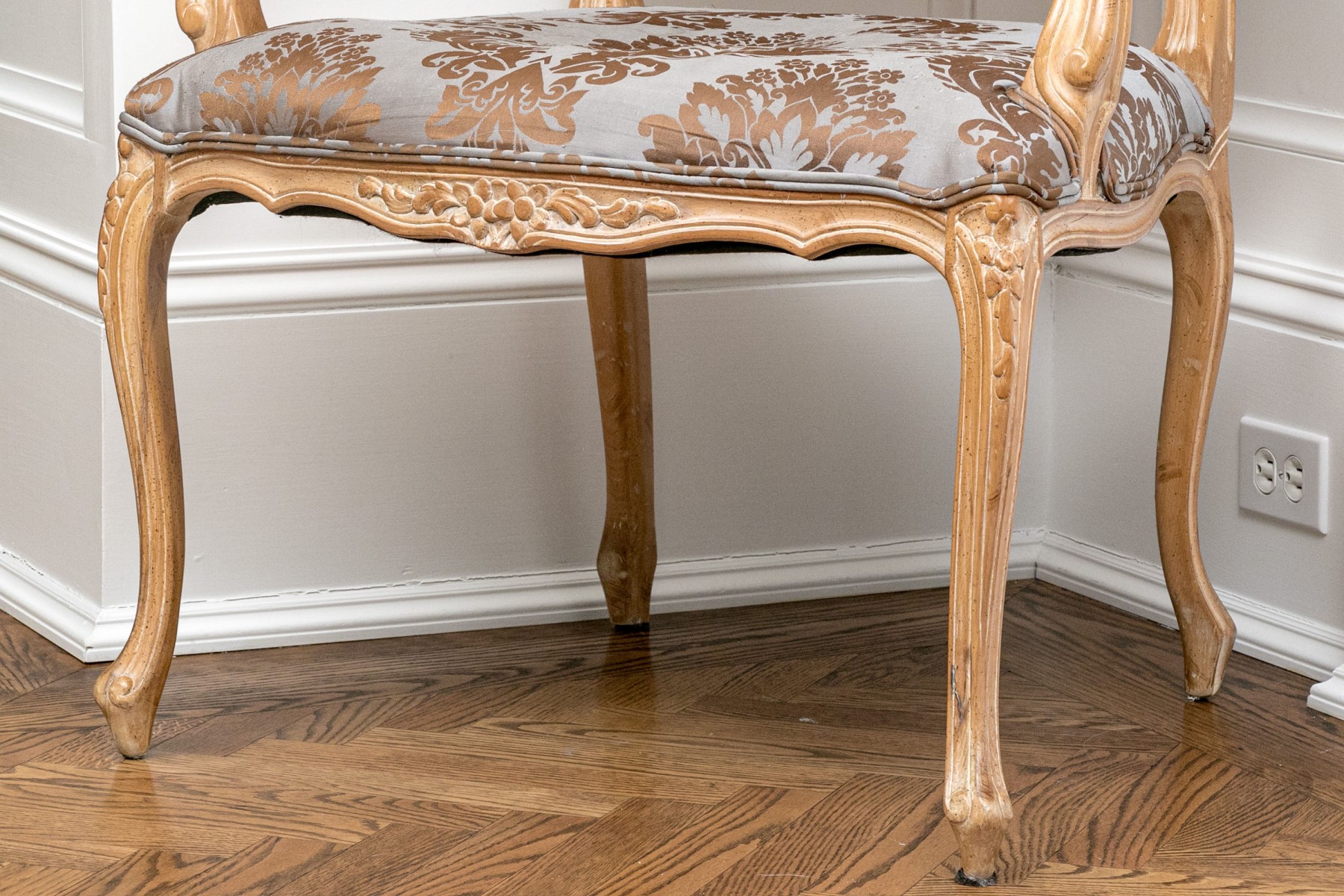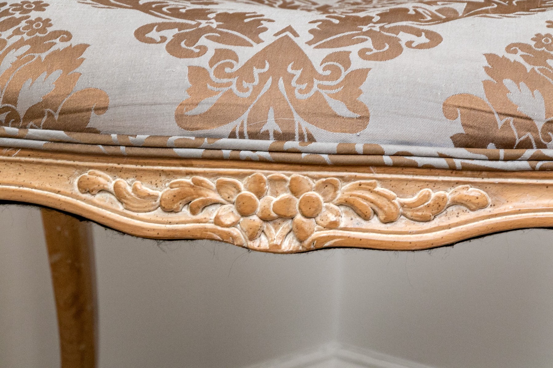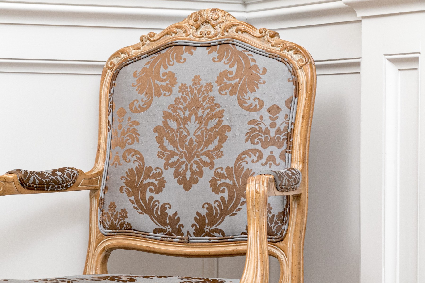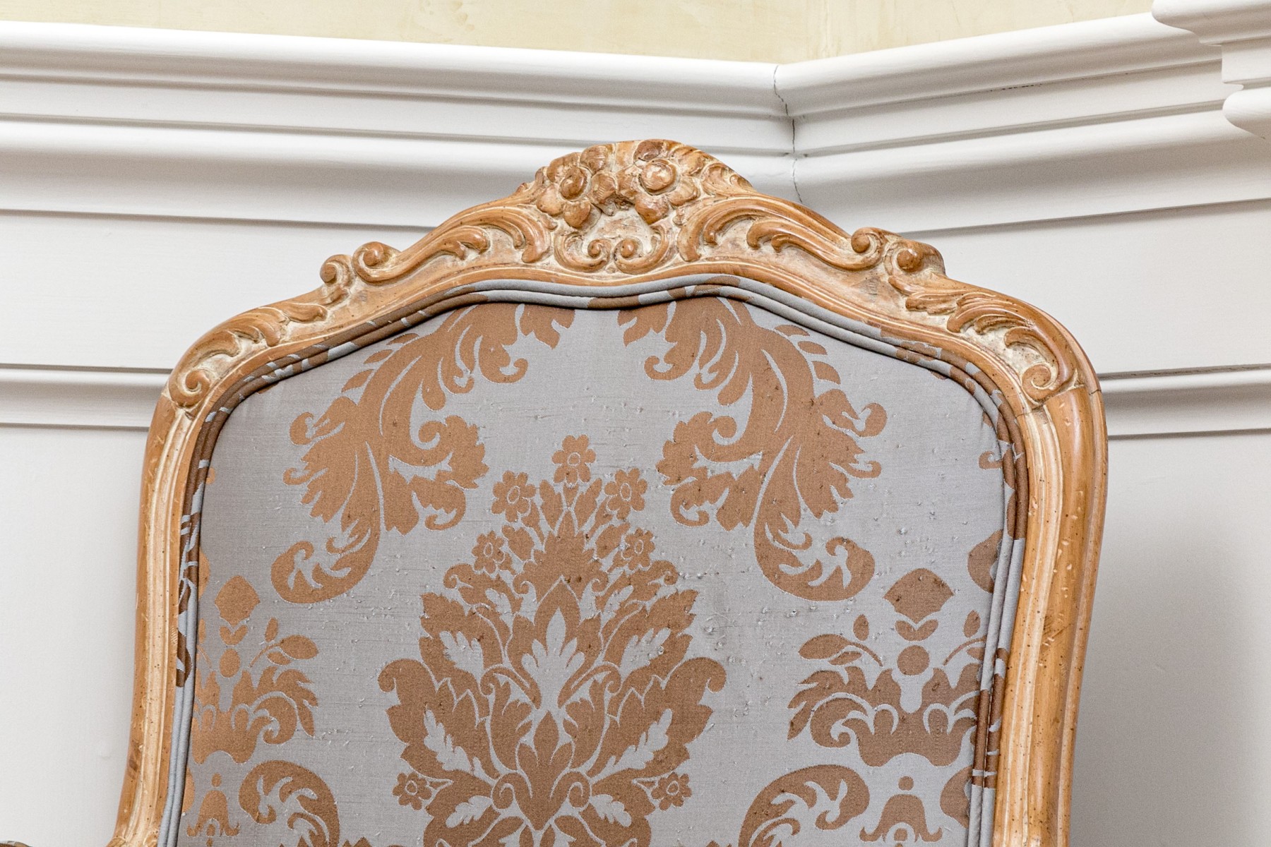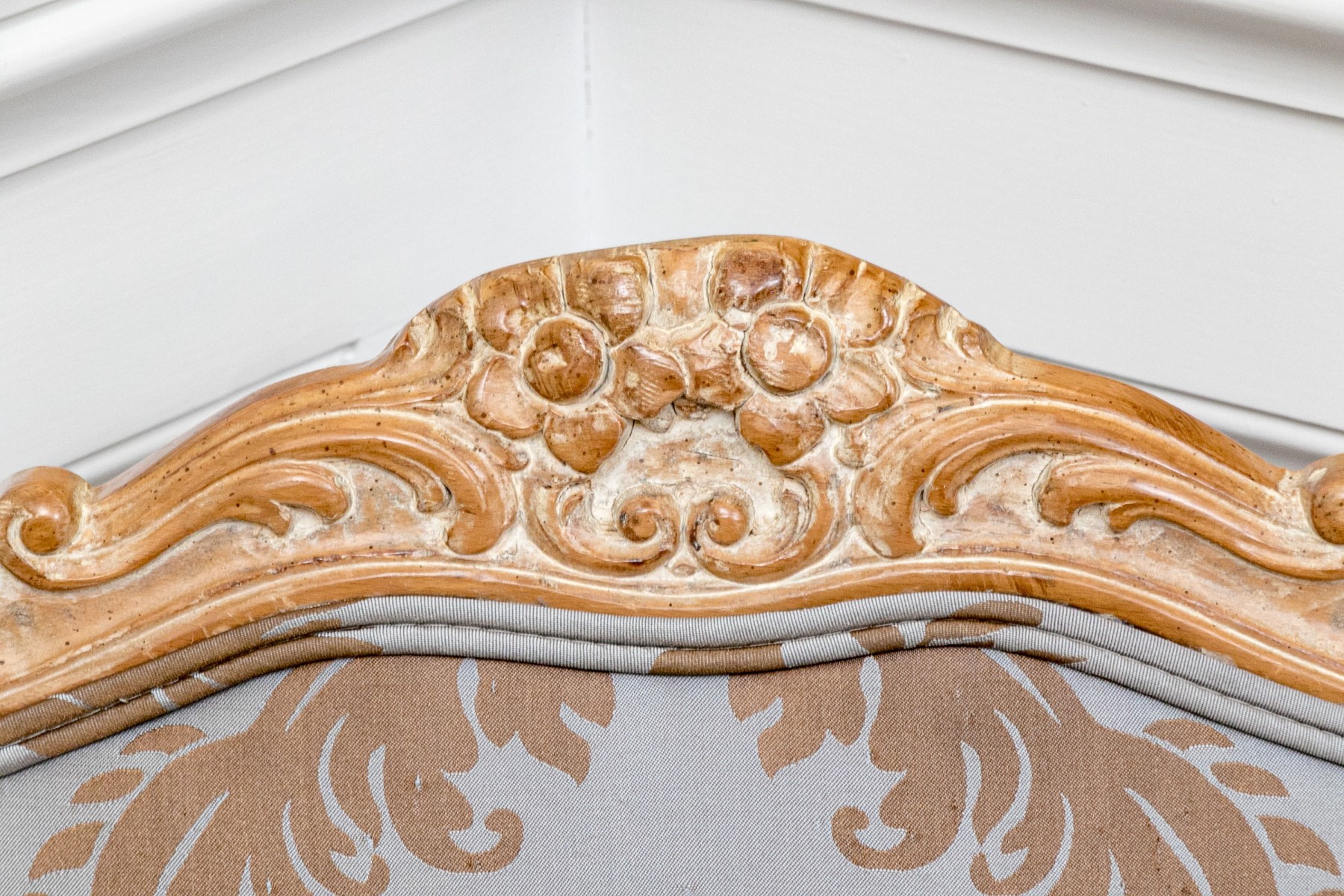 Handsomely carved frame, raised on cabriole legs. The fauteuil has a floral carved pediment to top rail, seen in relief. The fauteuil is handsomely upholstered to the seat cushion and seat back.