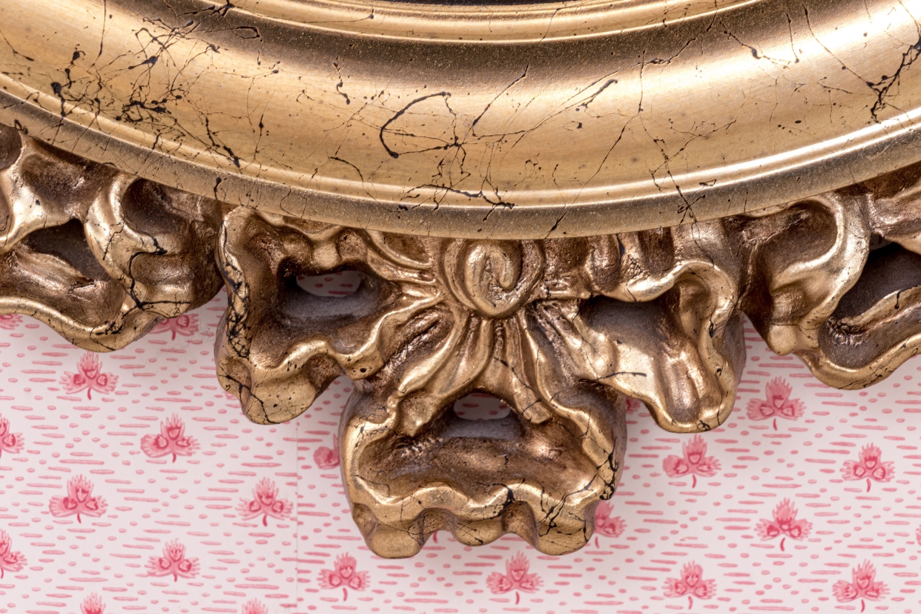 A gorgeous oval mirror with classic Louis XV elegance, featuring a gilt and curved beveled frame detailed with a finely carved crest of flowers tied with a ribbon flanked by tapering curved shoulders of pierced foliate relief, echoed along the bottom crest.