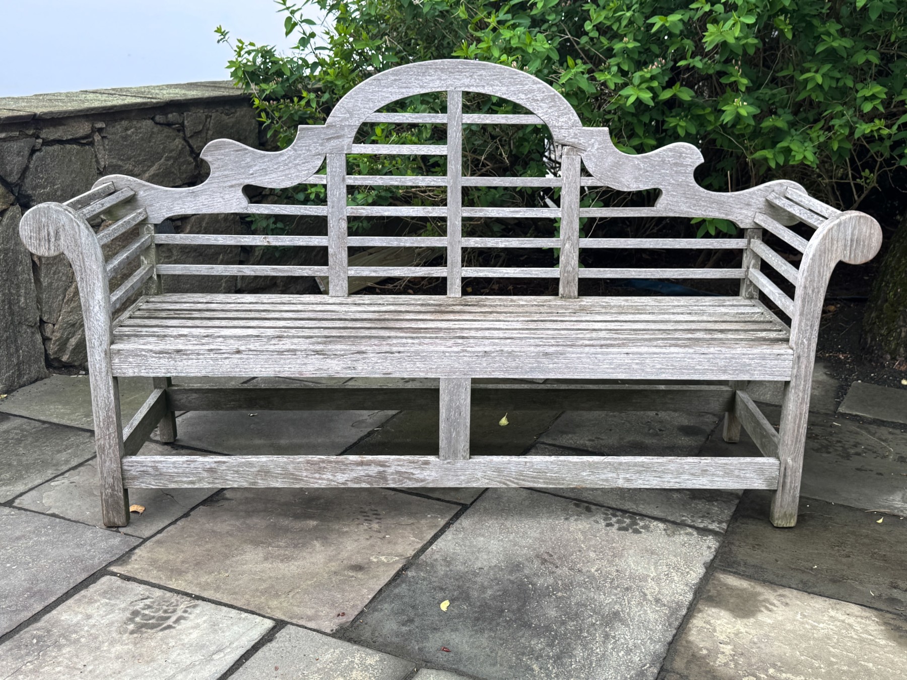 A gorgeous Lutyens style outdoor bench in classic gray-hued teak wood, designed with an eye-catching and shapely arched top rail and horizontal rail back, rolled arms, and slatted seat raised over rectangular legs with a box stretcher.