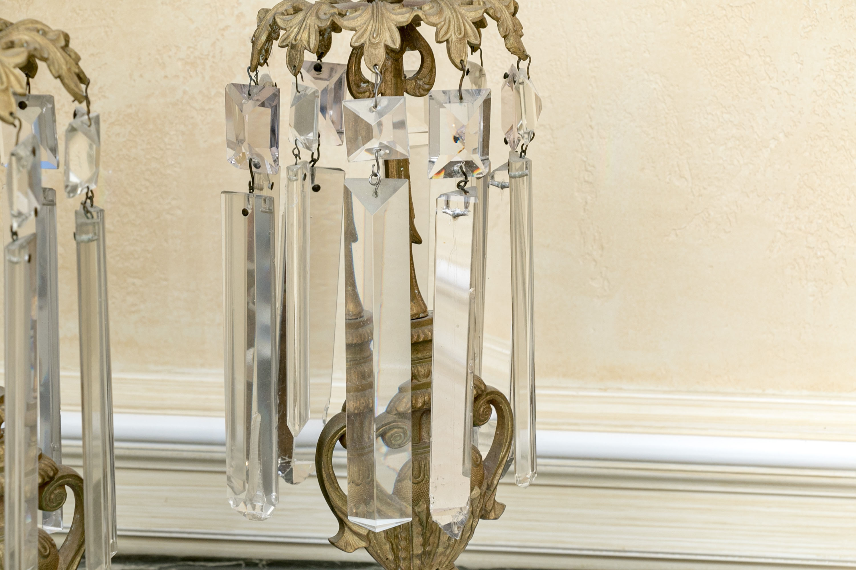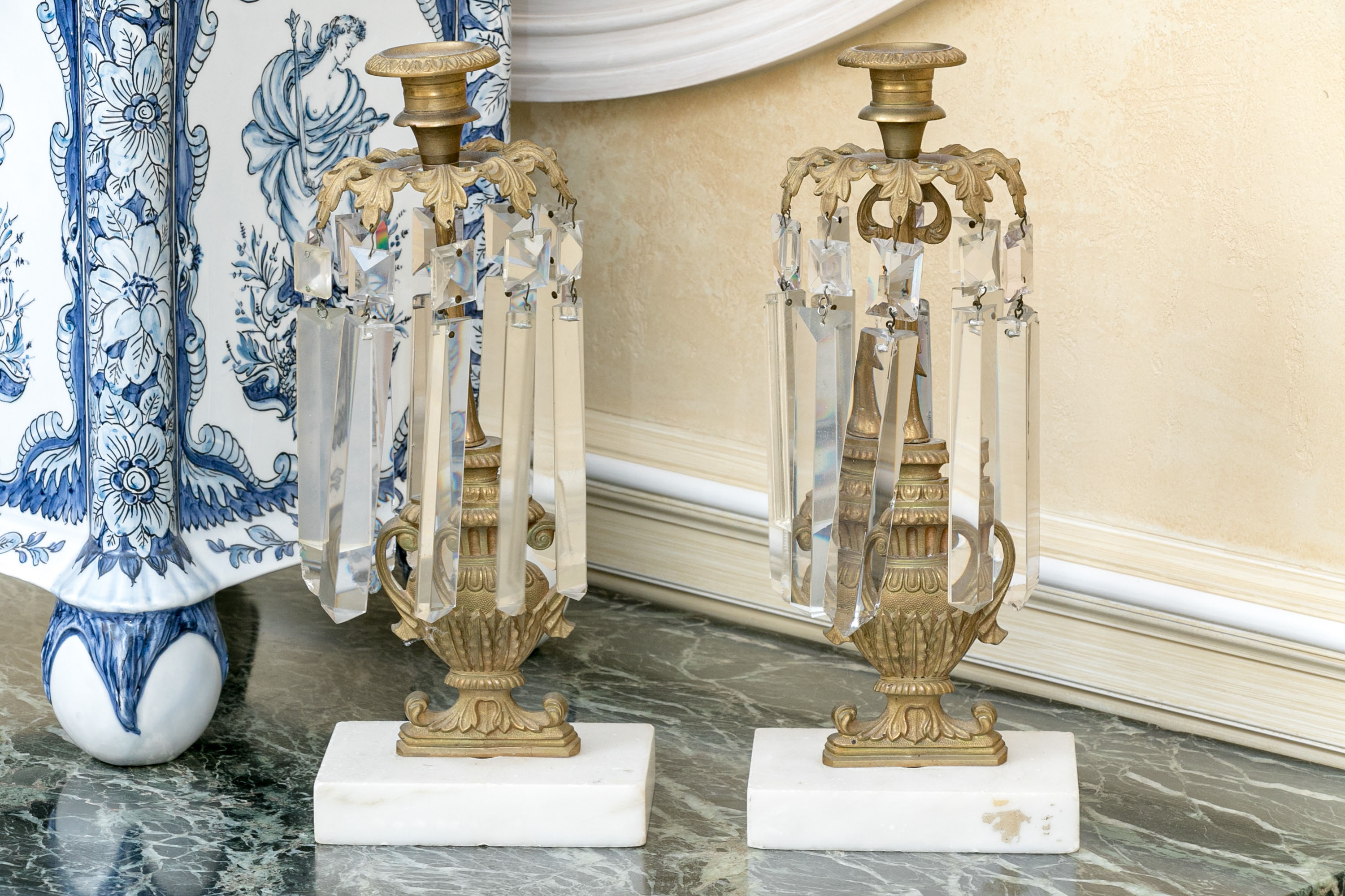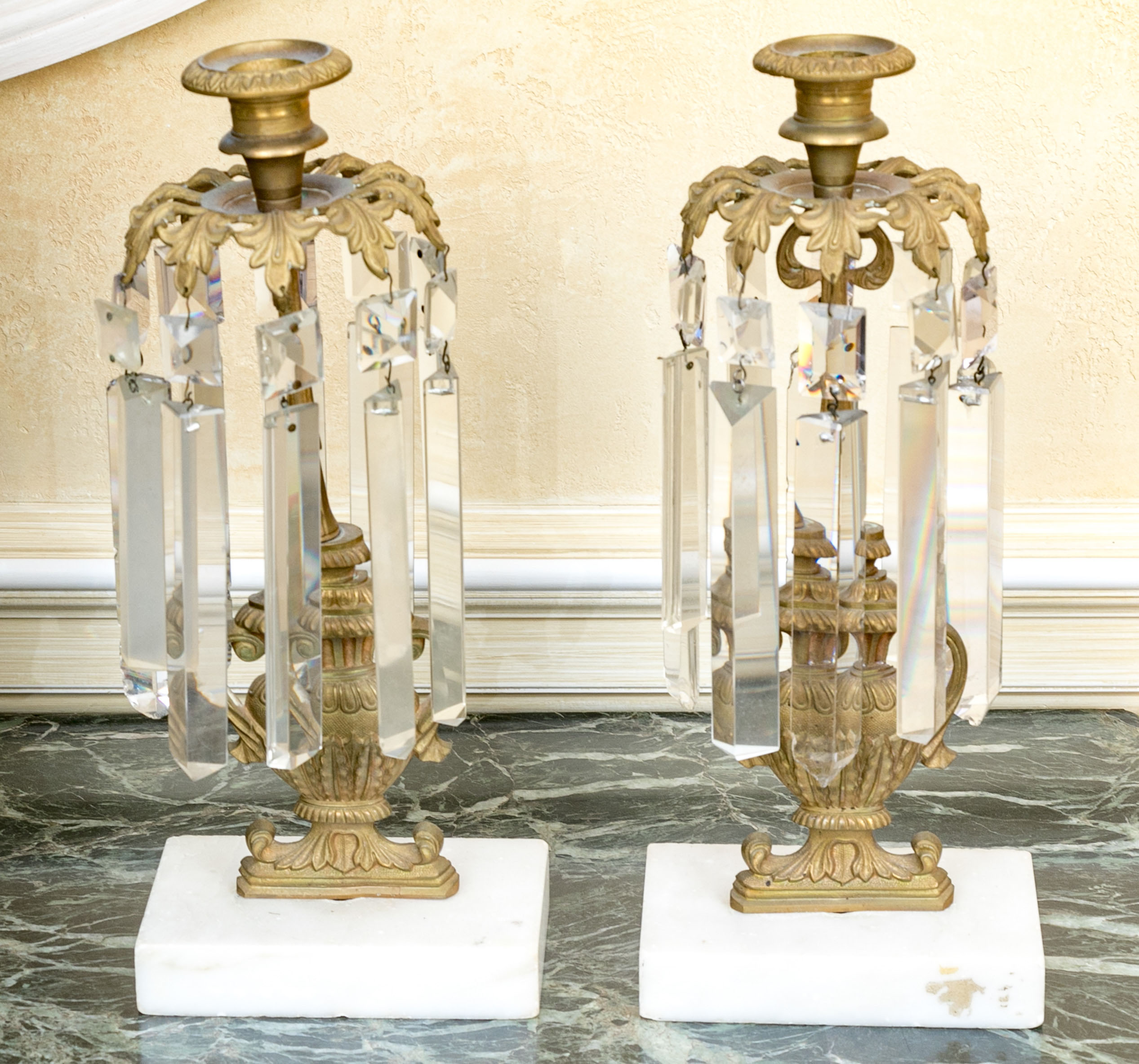 An elegant pair of girandole candlesticks showcasing egg and dart nozzles on tapered cylindrical capitals with foliage shoulders supporting long faceted prisms. The columns feature figural urn forms over white stone bases, making for sophisticated and fanciful designs.