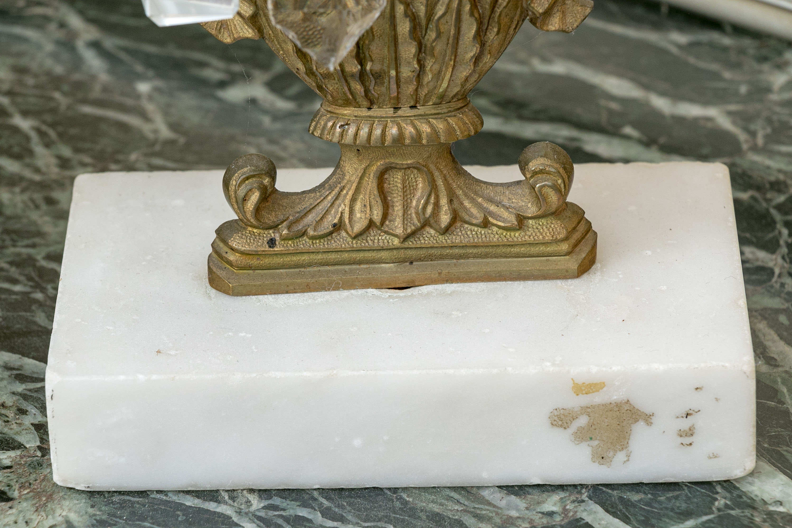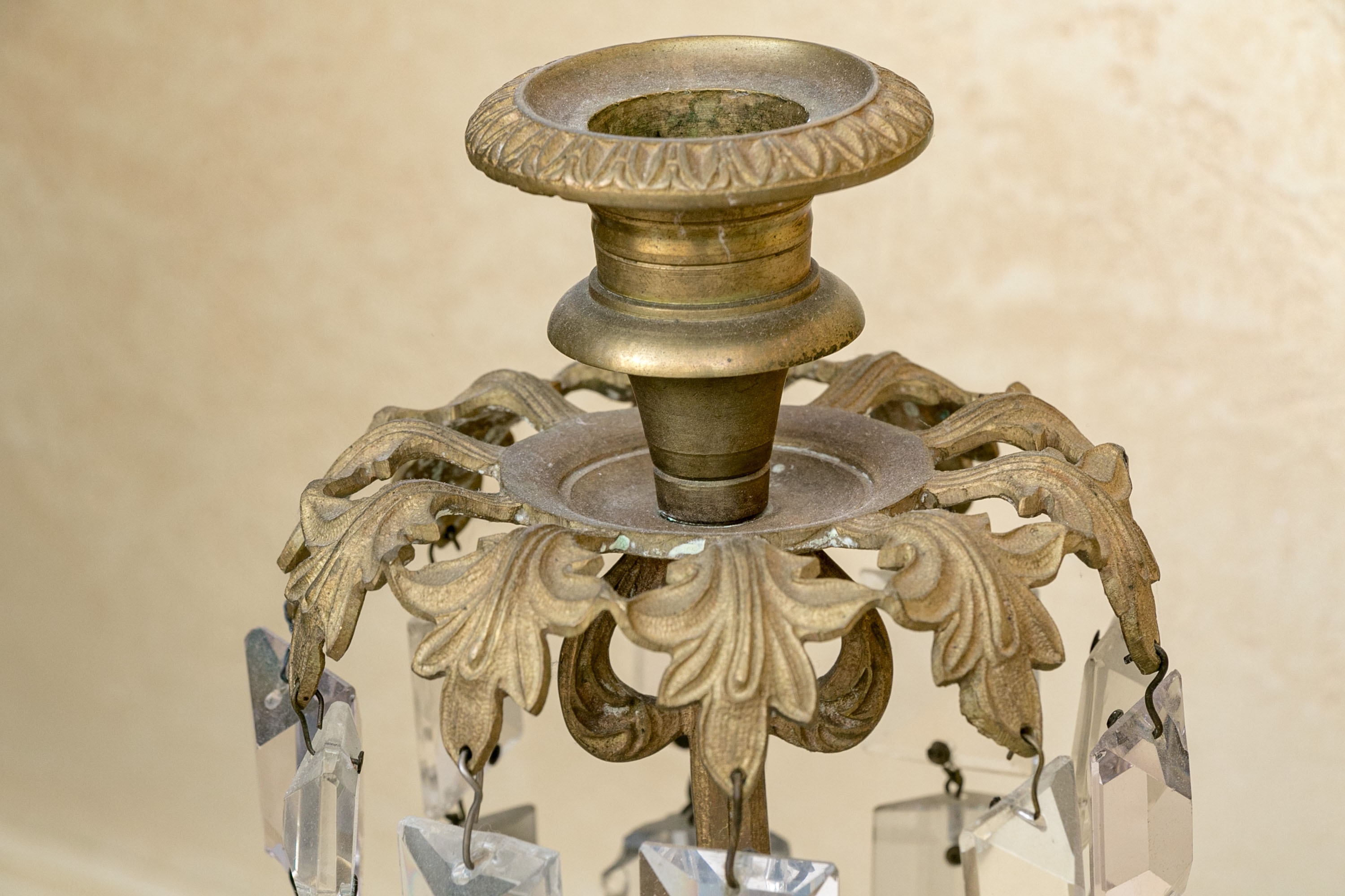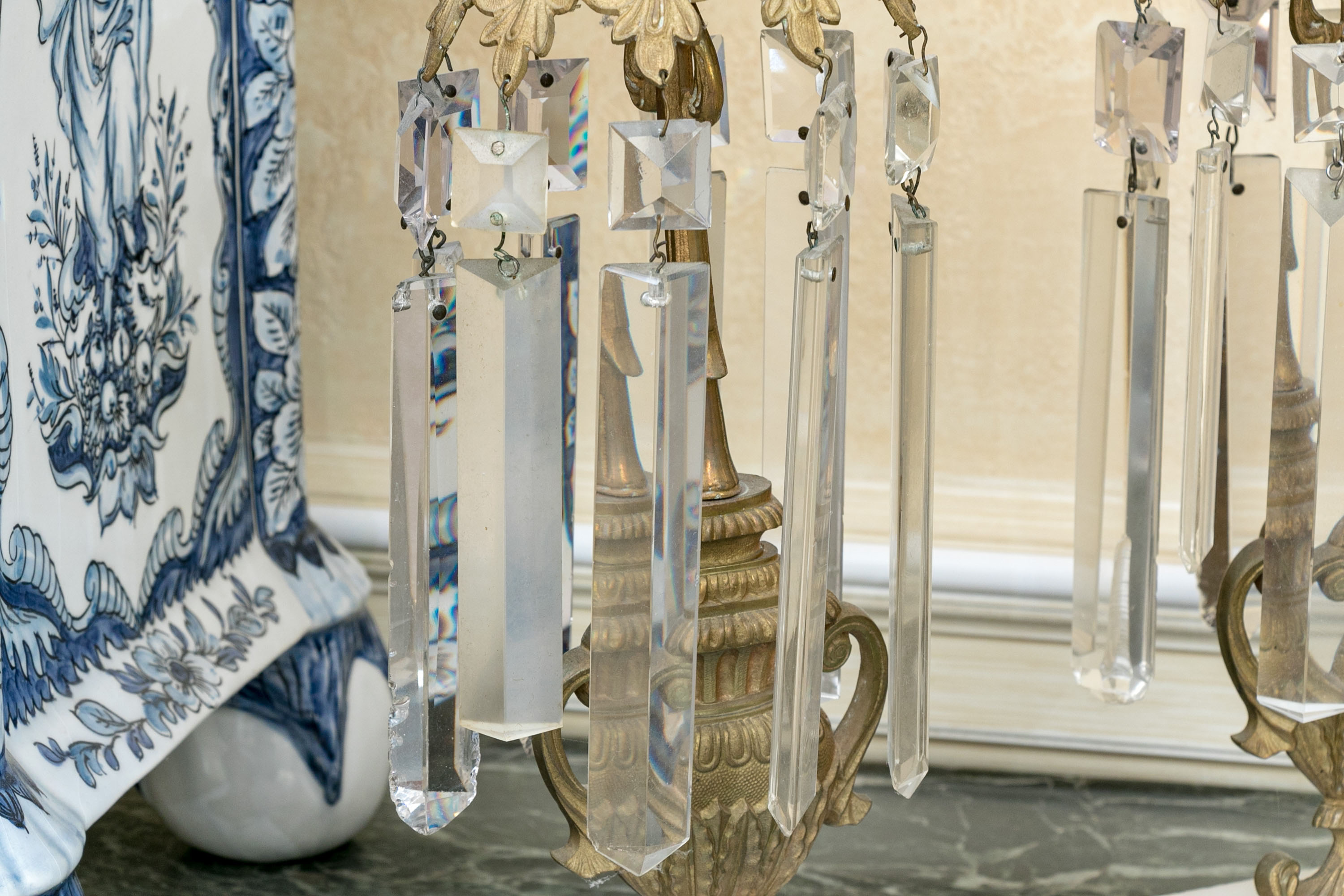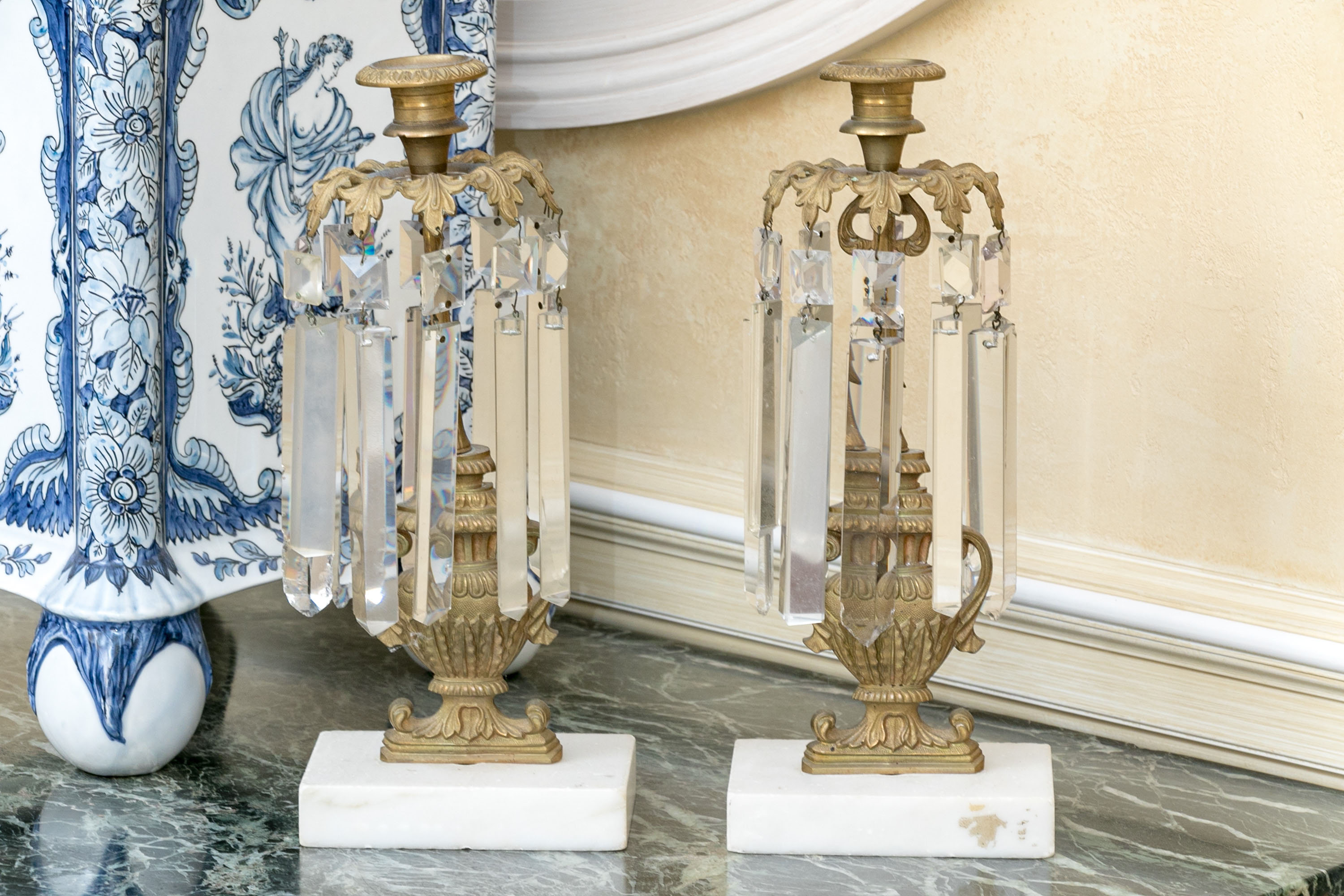 An elegant pair of girandole candlesticks showcasing egg and dart nozzles on tapered cylindrical capitals with foliage shoulders supporting long faceted prisms. The columns feature figural urn forms over white stone bases, making for sophisticated and fanciful designs.