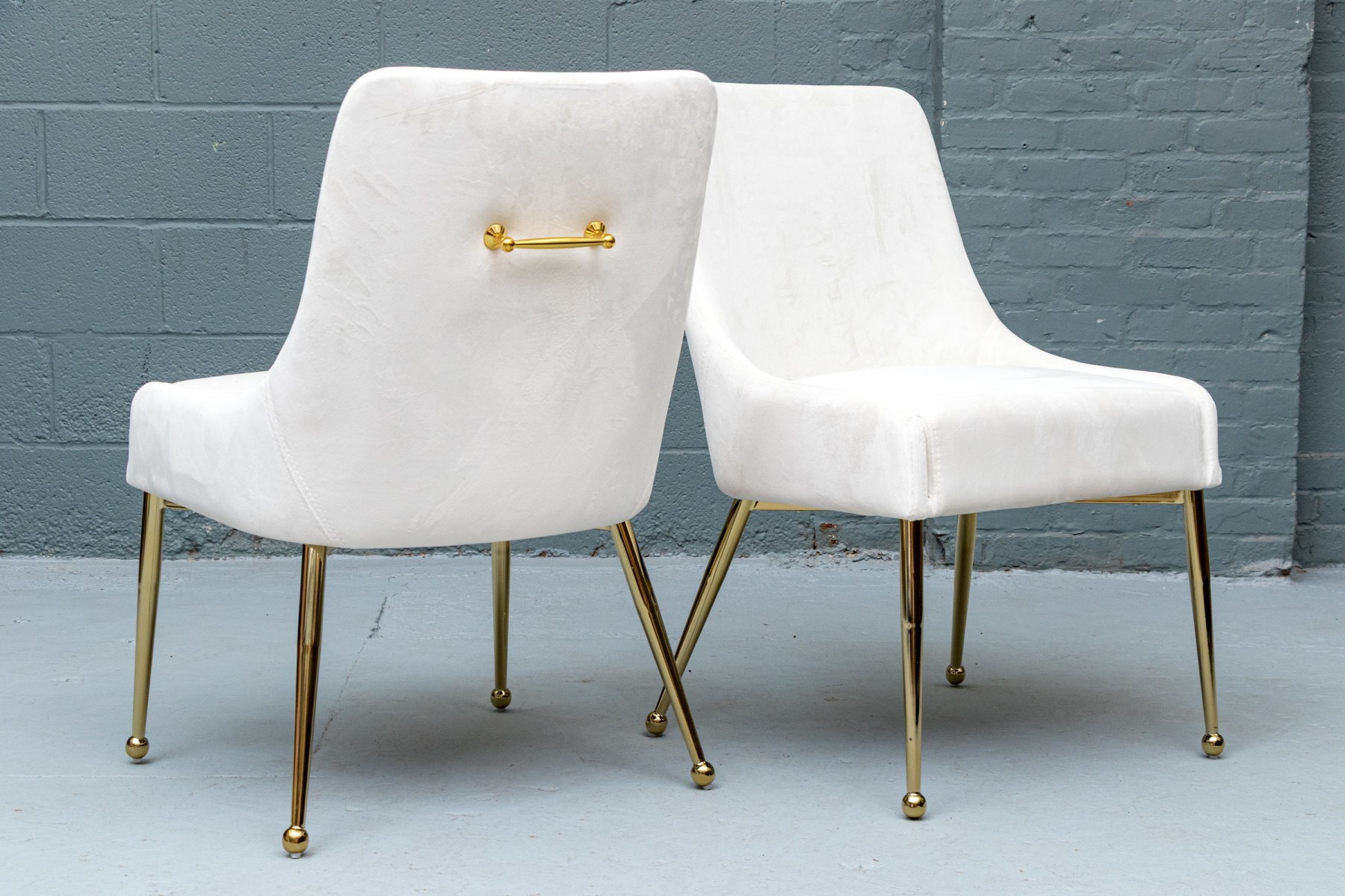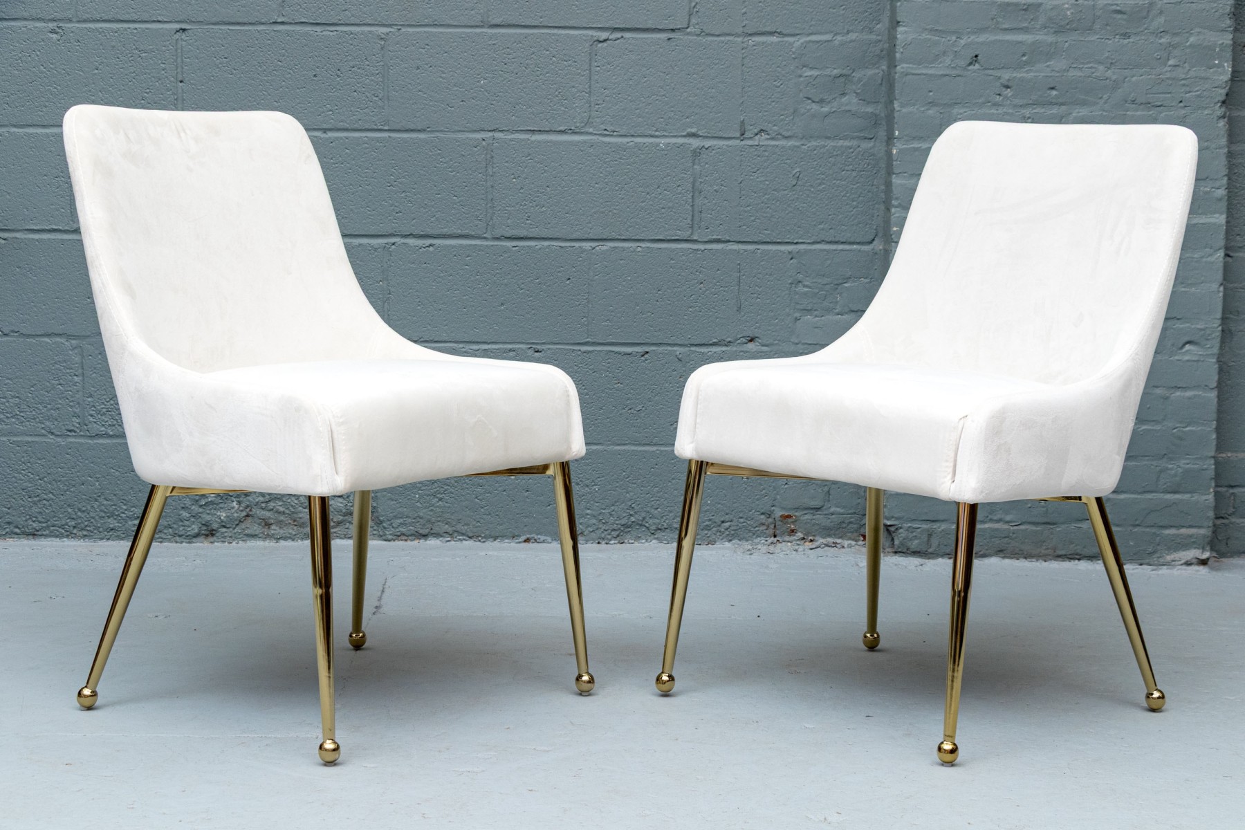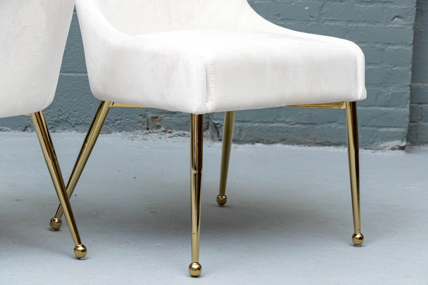 Standing on wonderful brass finished legs with ball form feet, the seats and seat backs with cream colored upholstery. Each chair with brass handle on the seat back reverse.
