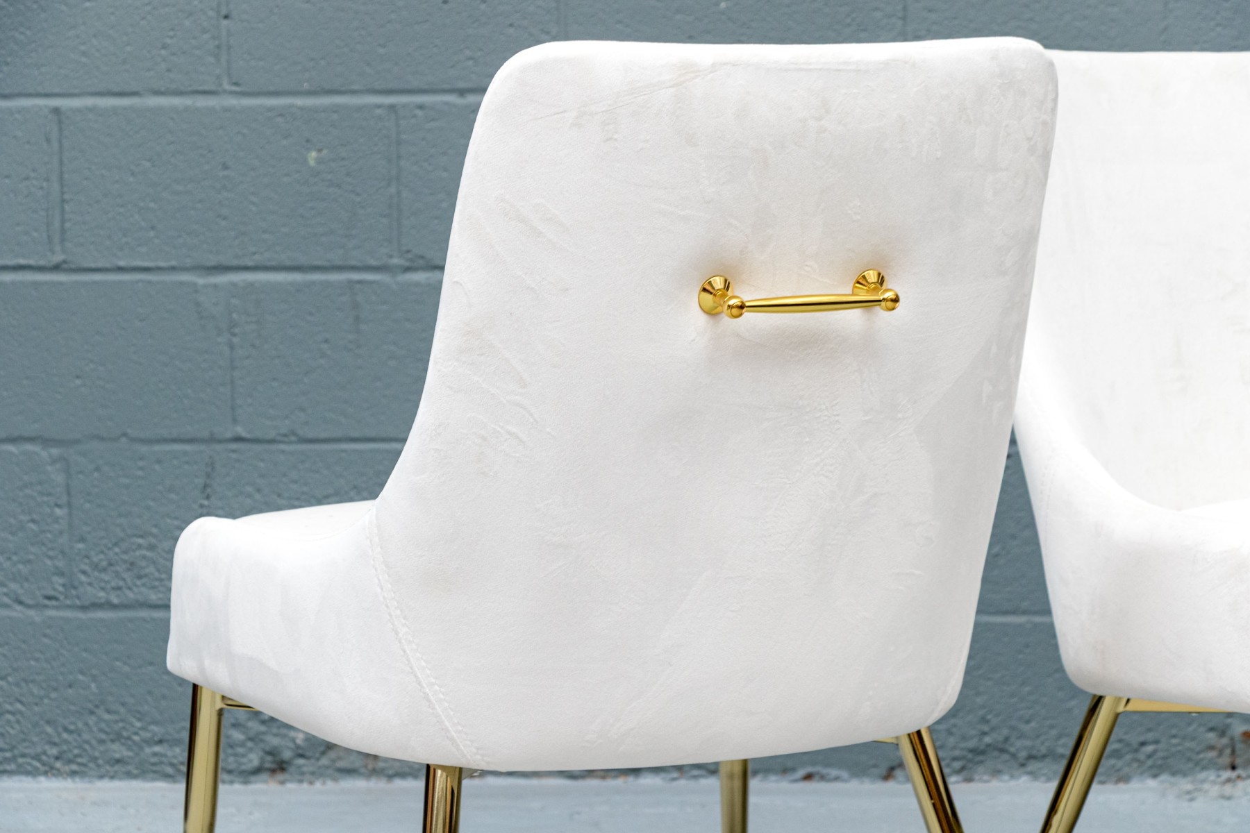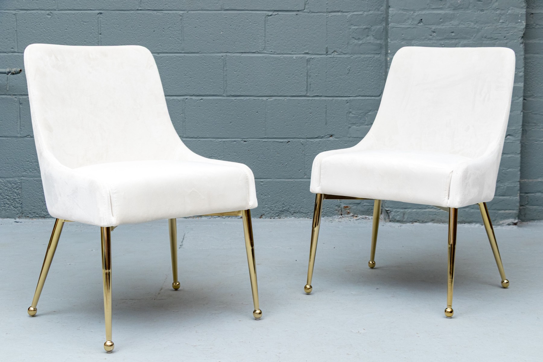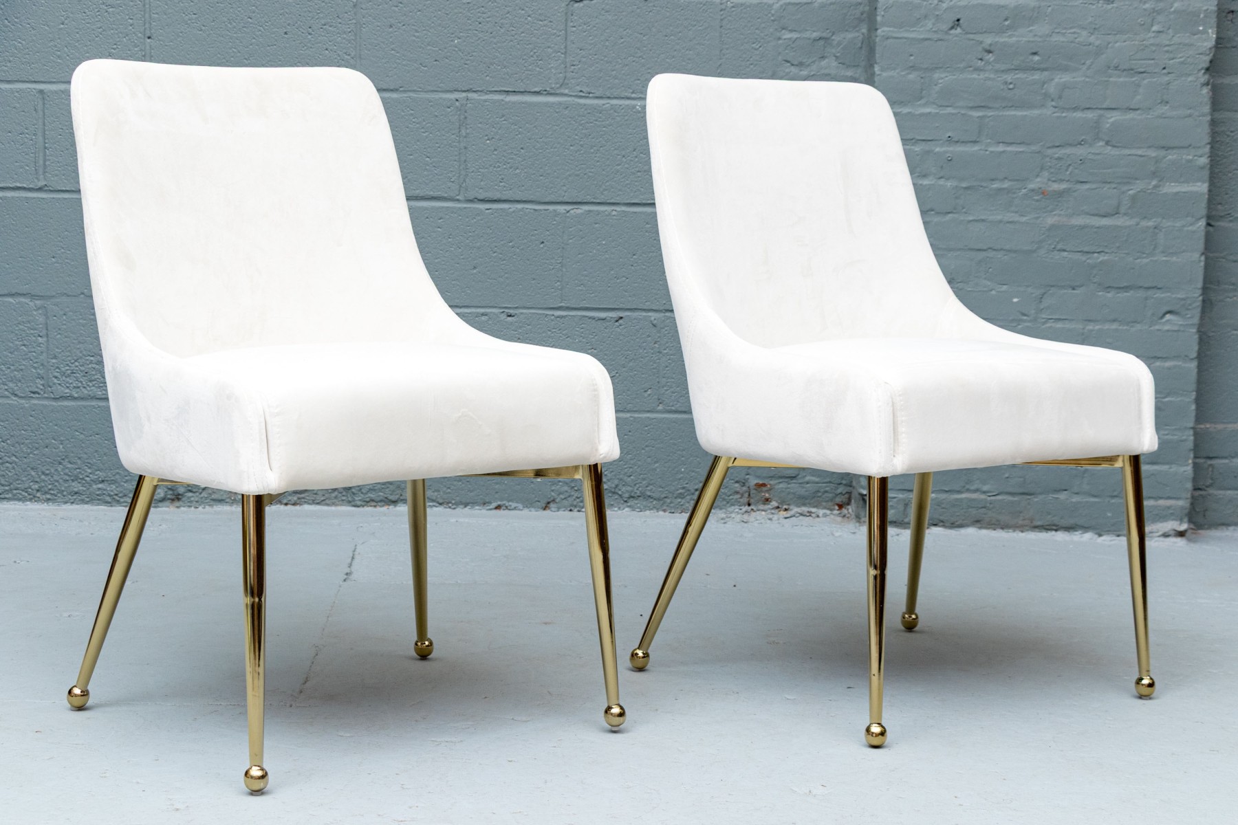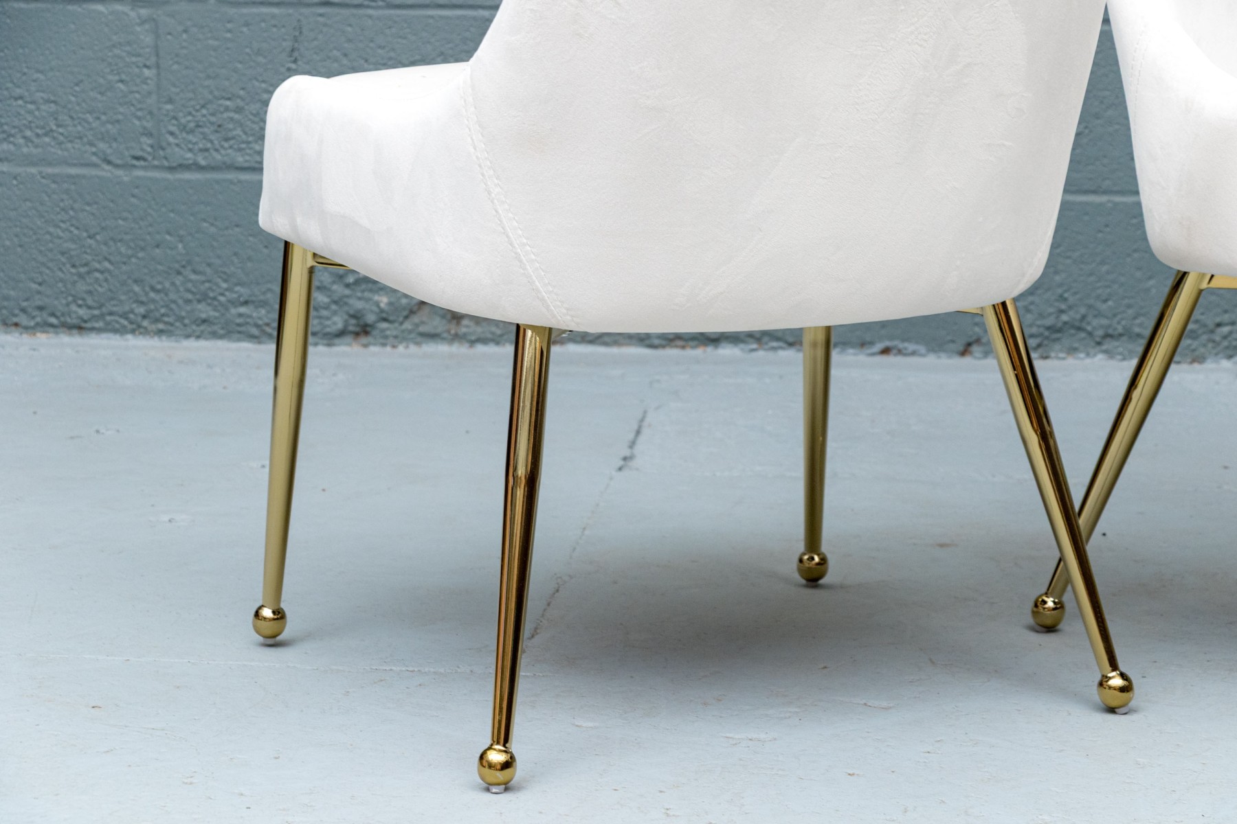 Standing on wonderful brass finished legs with ball form feet, the seats and seat backs with cream colored upholstery. Each chair with brass handle on the seat back reverse.