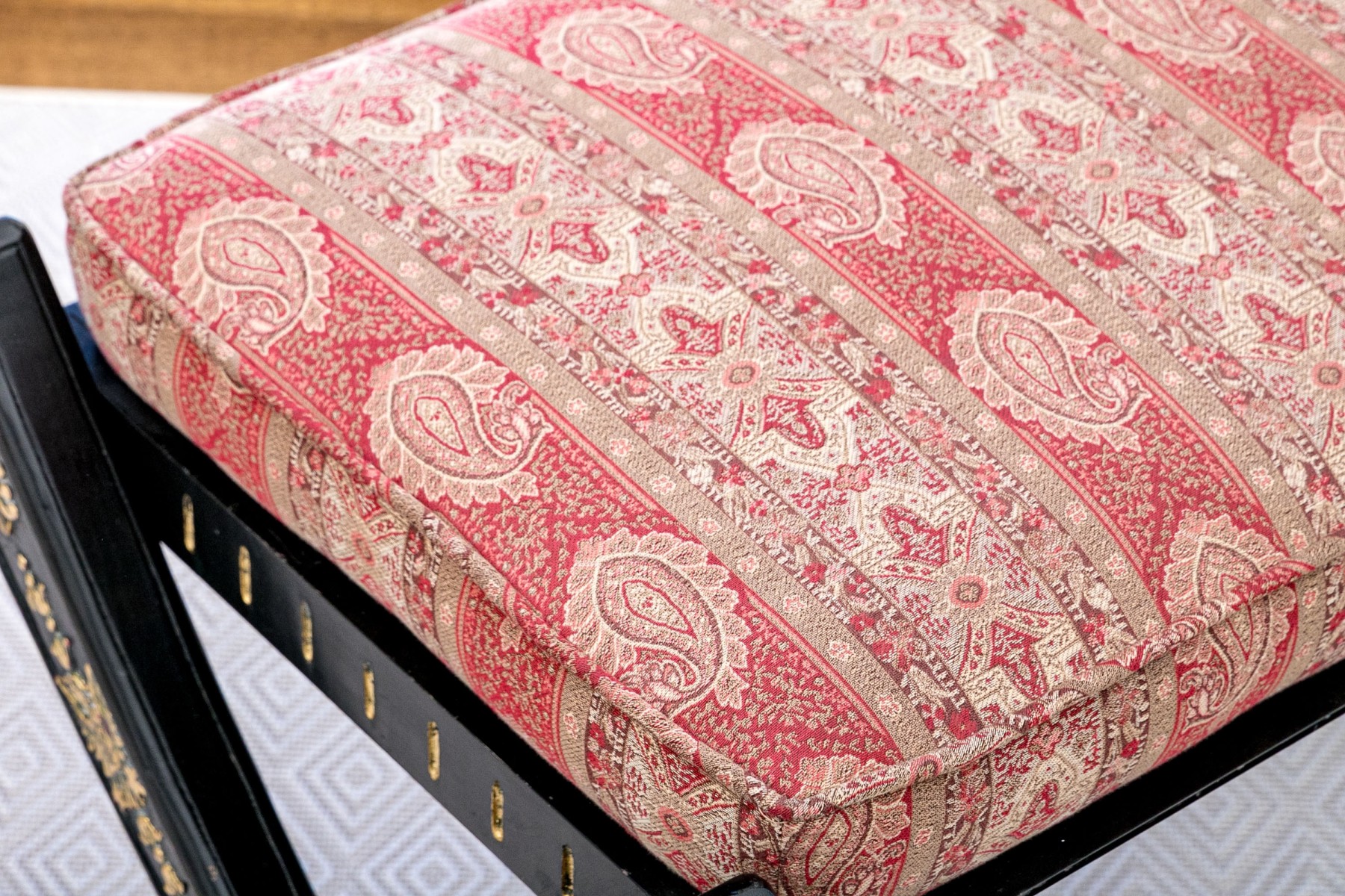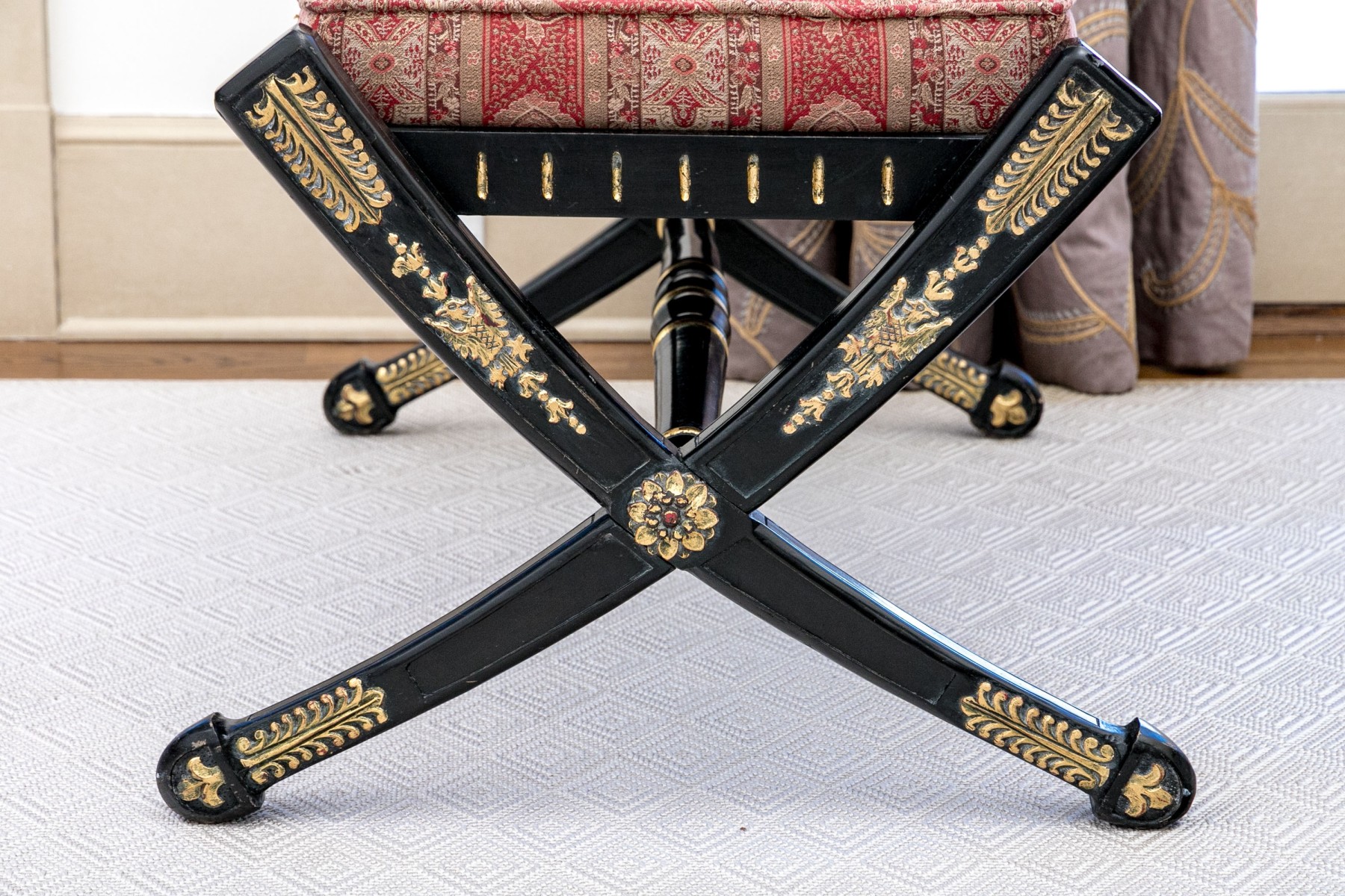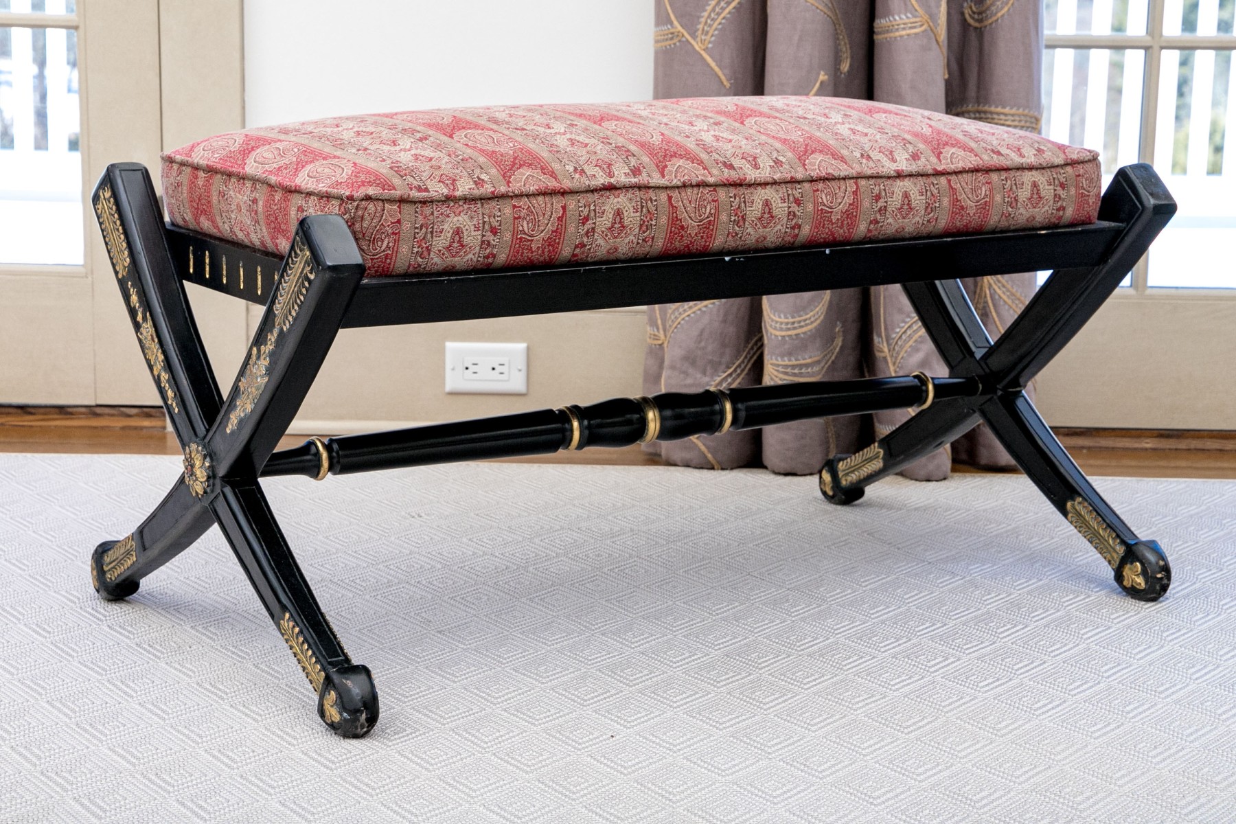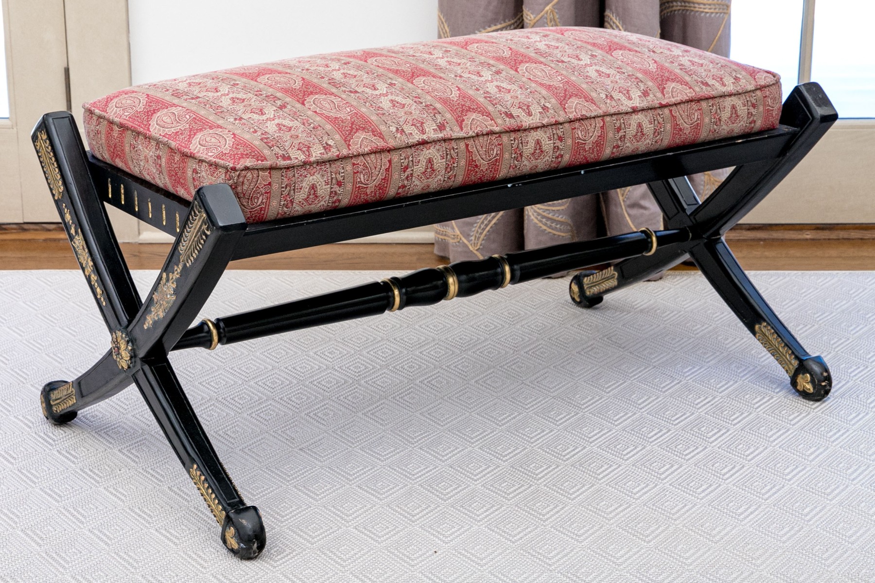 A handsome bench exuding Regency and Empire elegance with a gorgeous red striped paisley motif upholstered cushion raised over an ebonized frame with dramatic X-form trestle legs and a banded stretcher detailed with parcel gilt accents. Gilt relief leaves, crowned birds, floral medallions and small fleur-de-lis details add an excellent distinguished aesthetic.