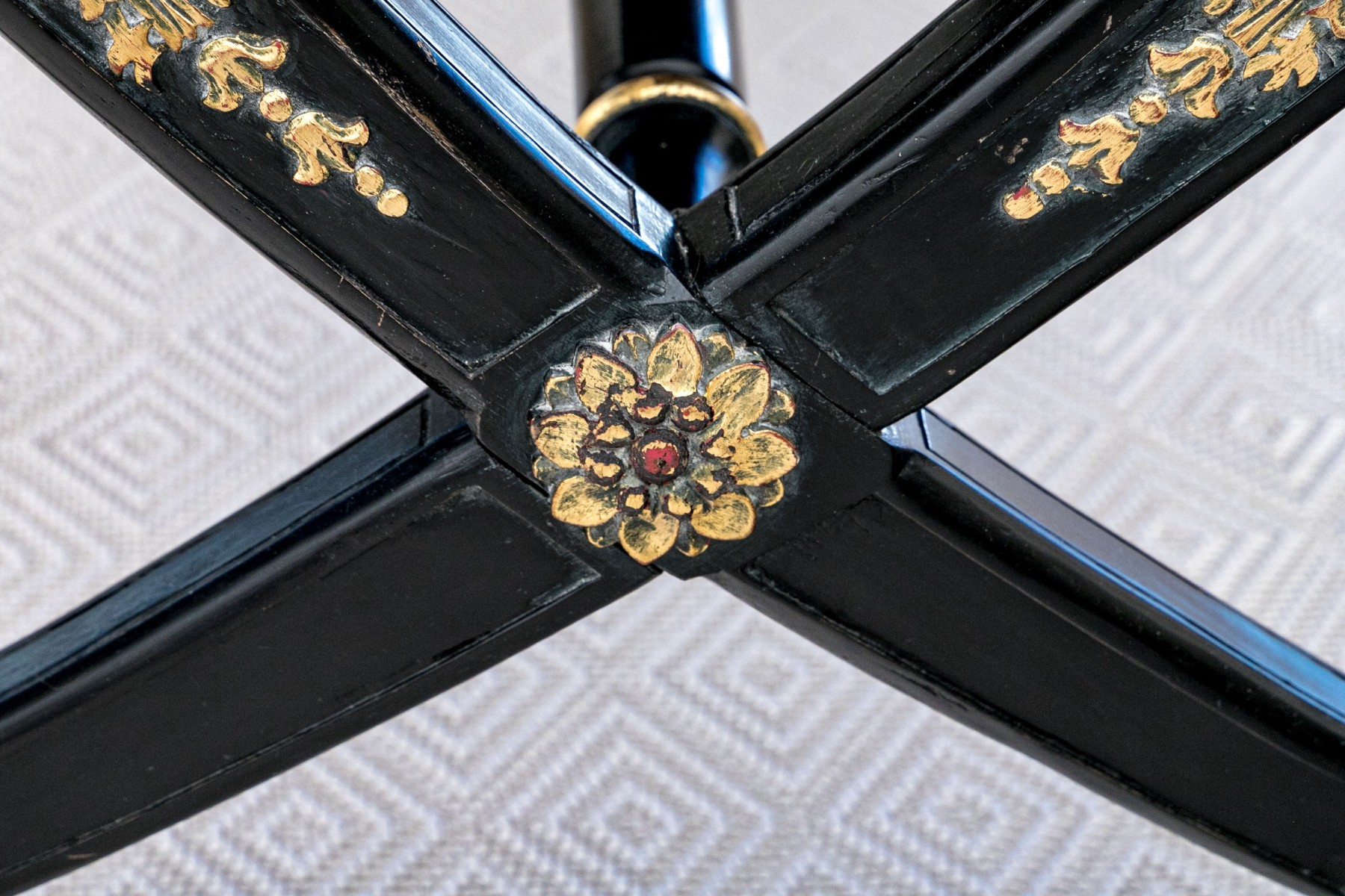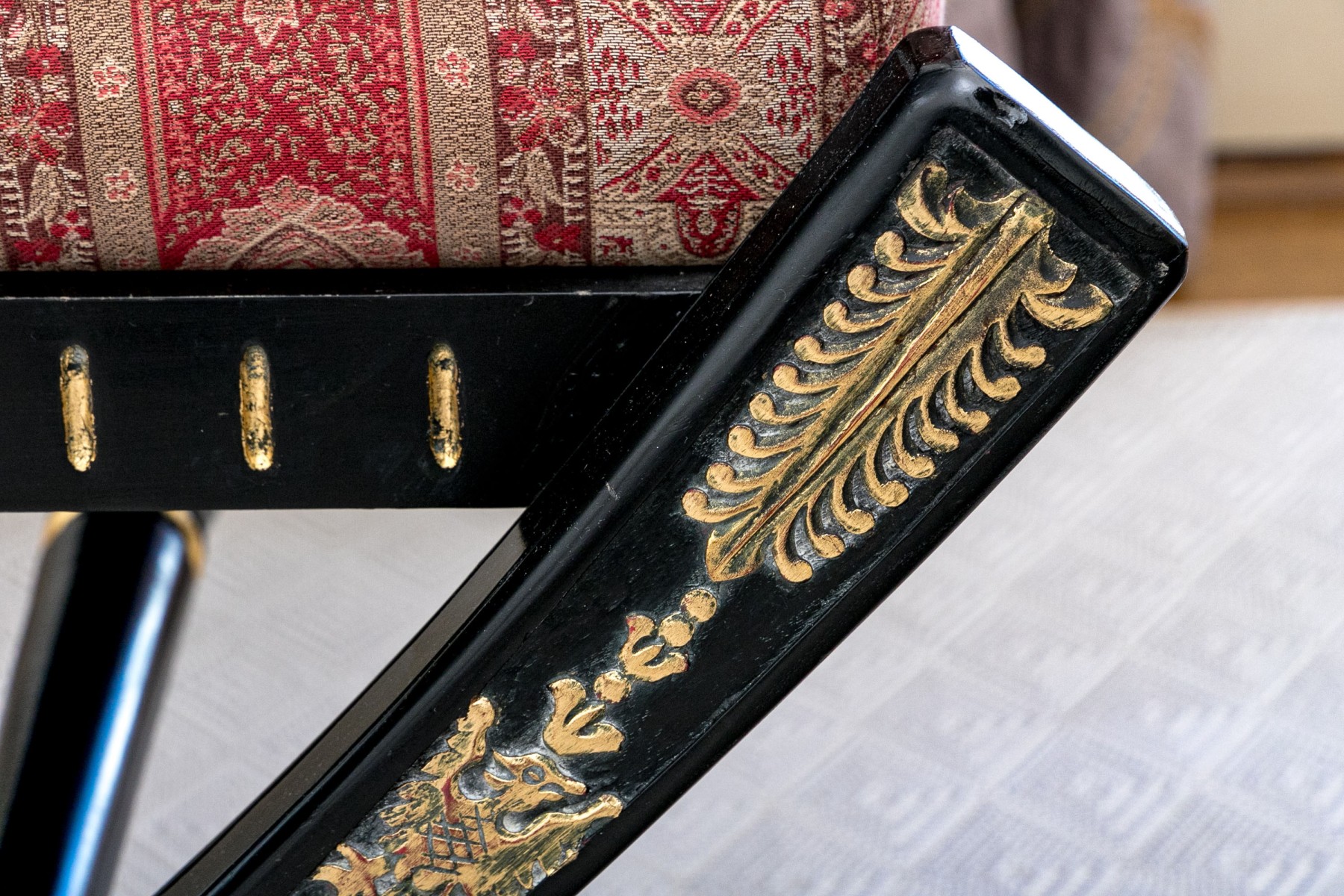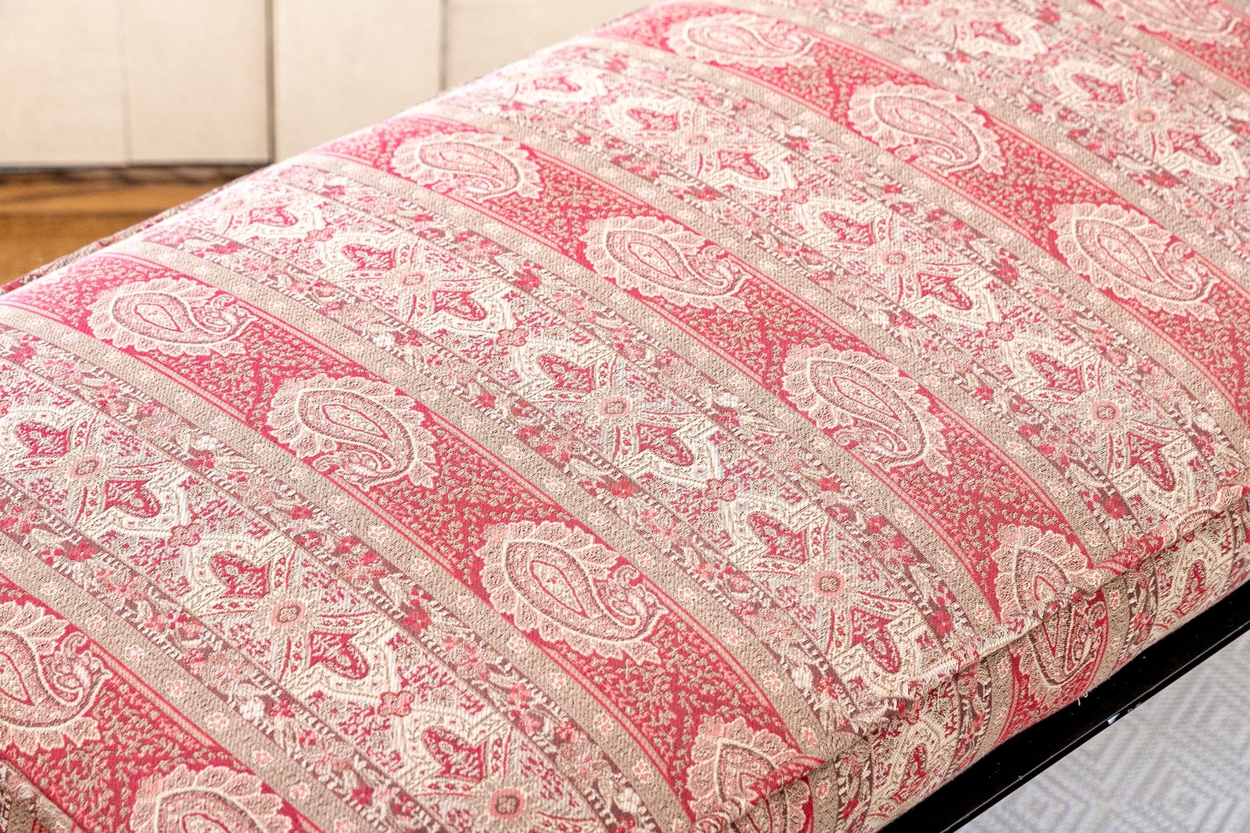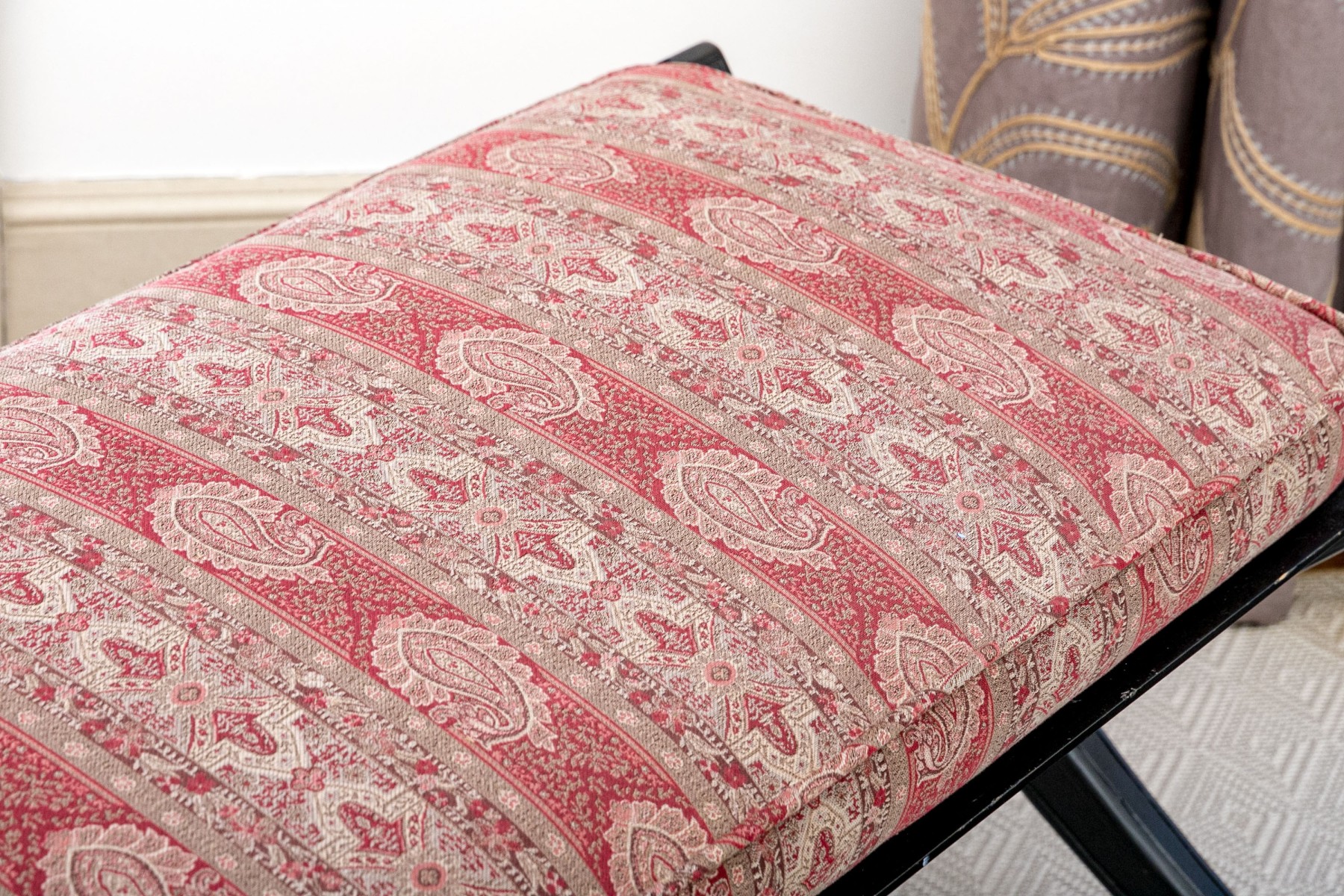 A handsome bench exuding Regency and Empire elegance with a gorgeous red striped paisley motif upholstered cushion raised over an ebonized frame with dramatic X-form trestle legs and a banded stretcher detailed with parcel gilt accents. Gilt relief leaves, crowned birds, floral medallions and small fleur-de-lis details add an excellent distinguished aesthetic.