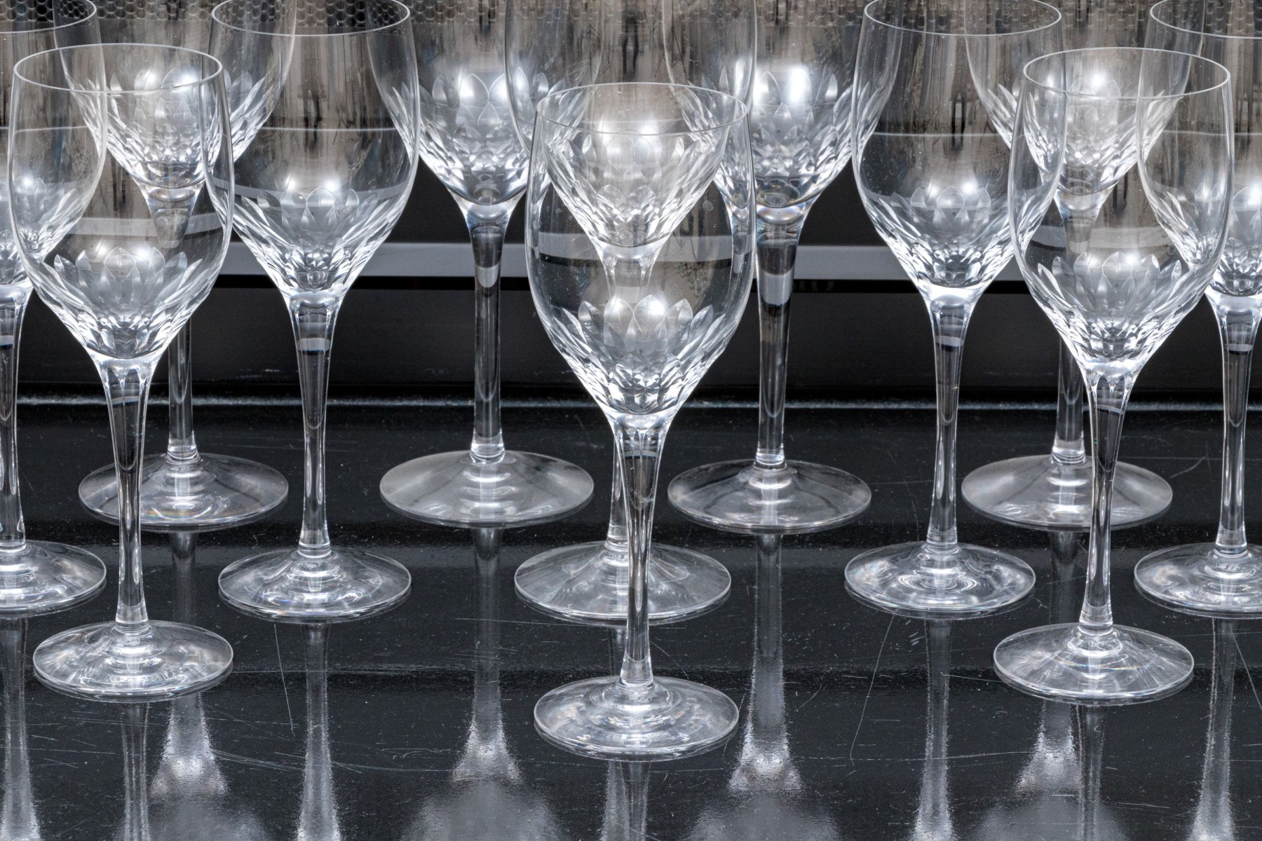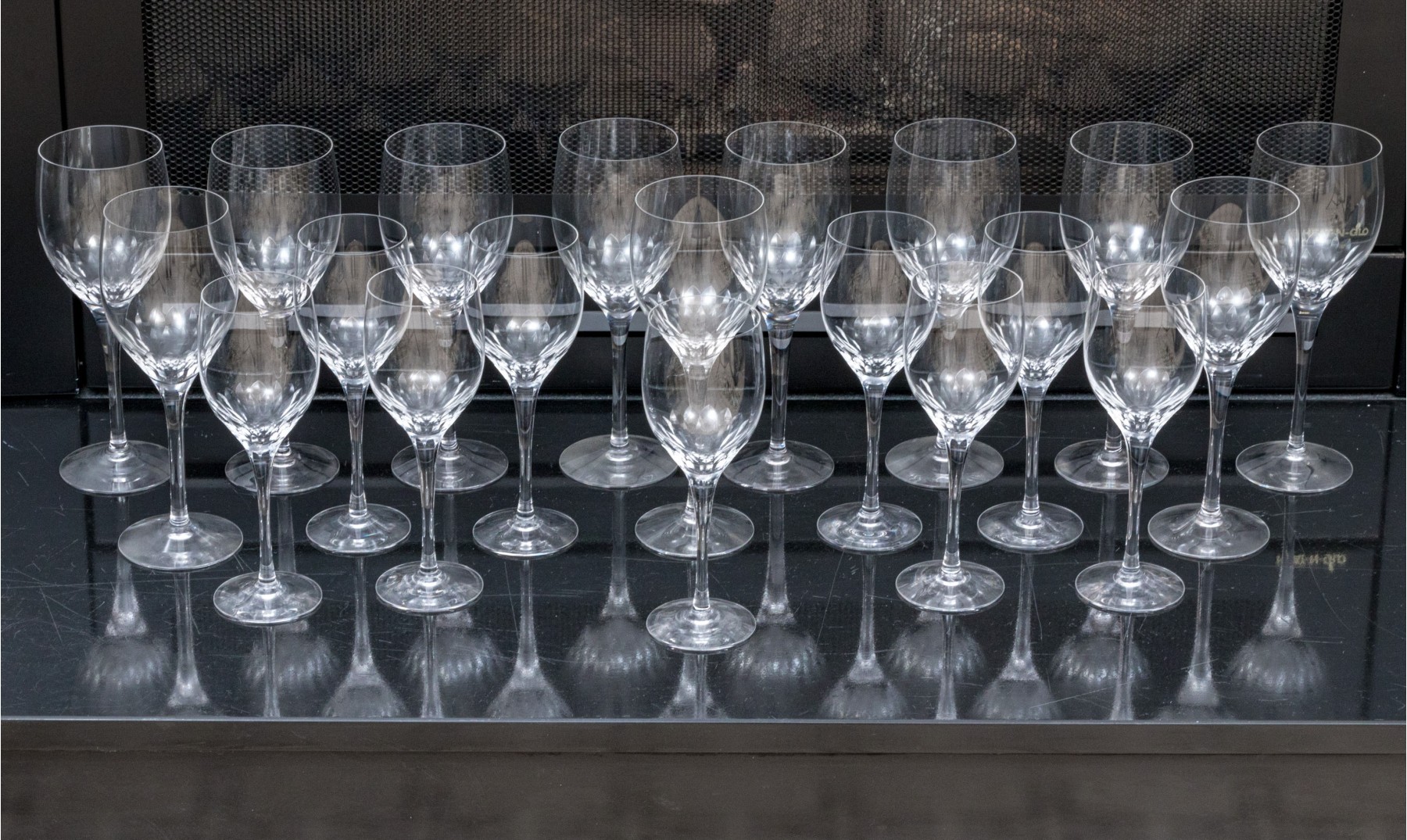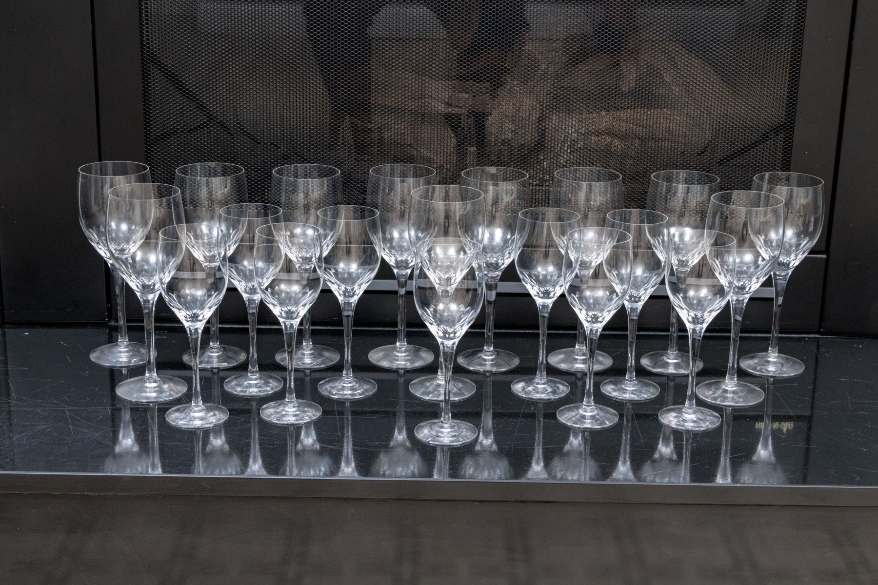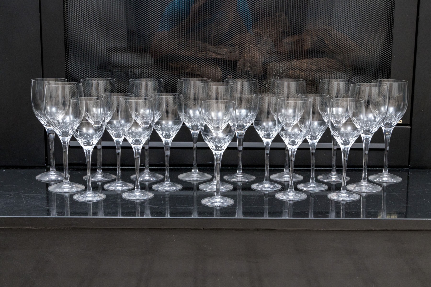 An elegant set of 20 Swedish, Orrefors crystal "Prelude" pattern stemware. The "Prelude" pattern features delicate, faceted bowl bases. All are marked underfoot.