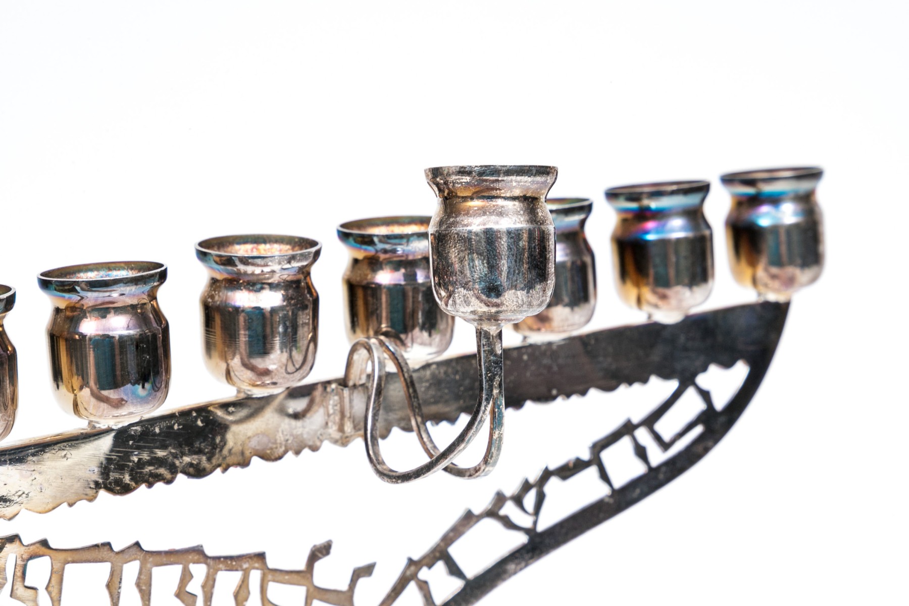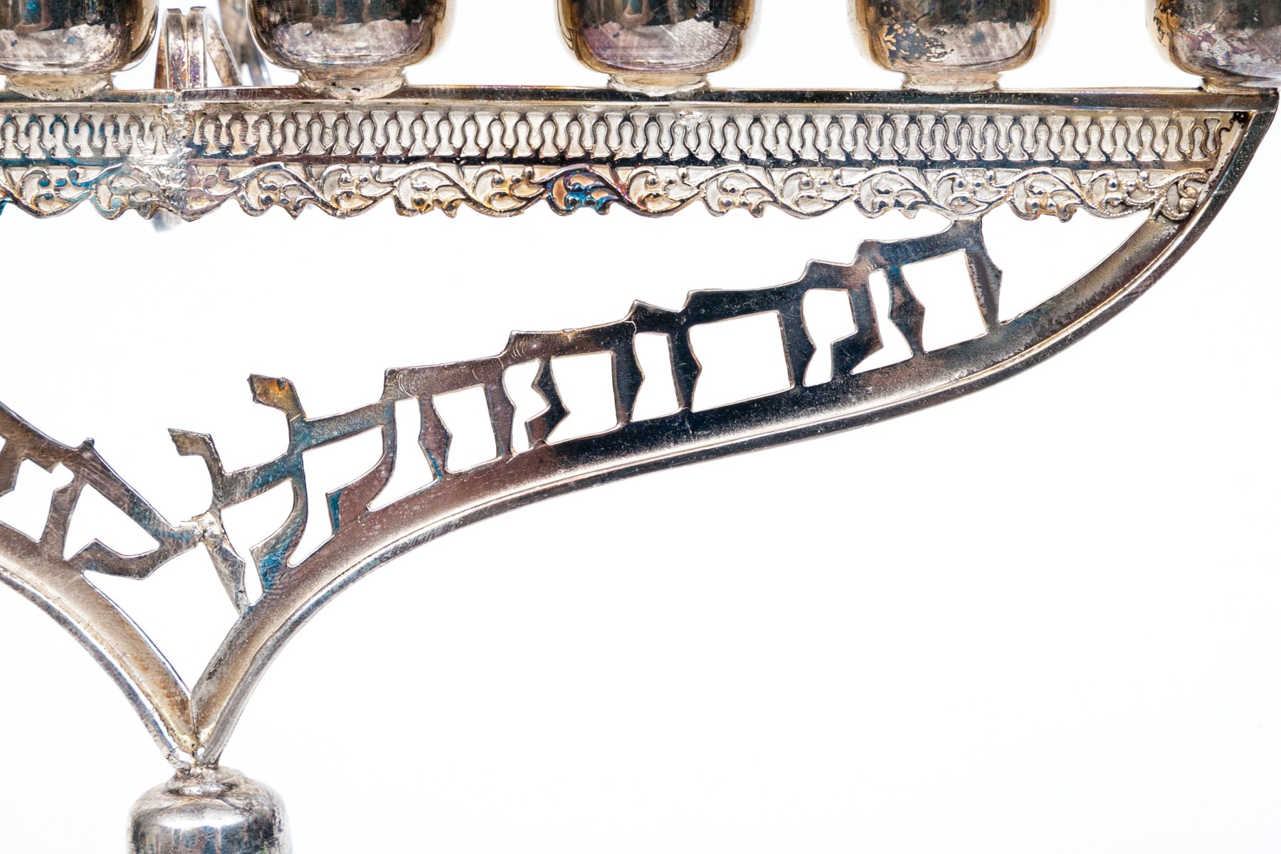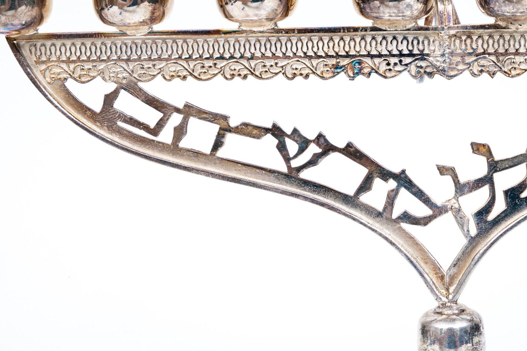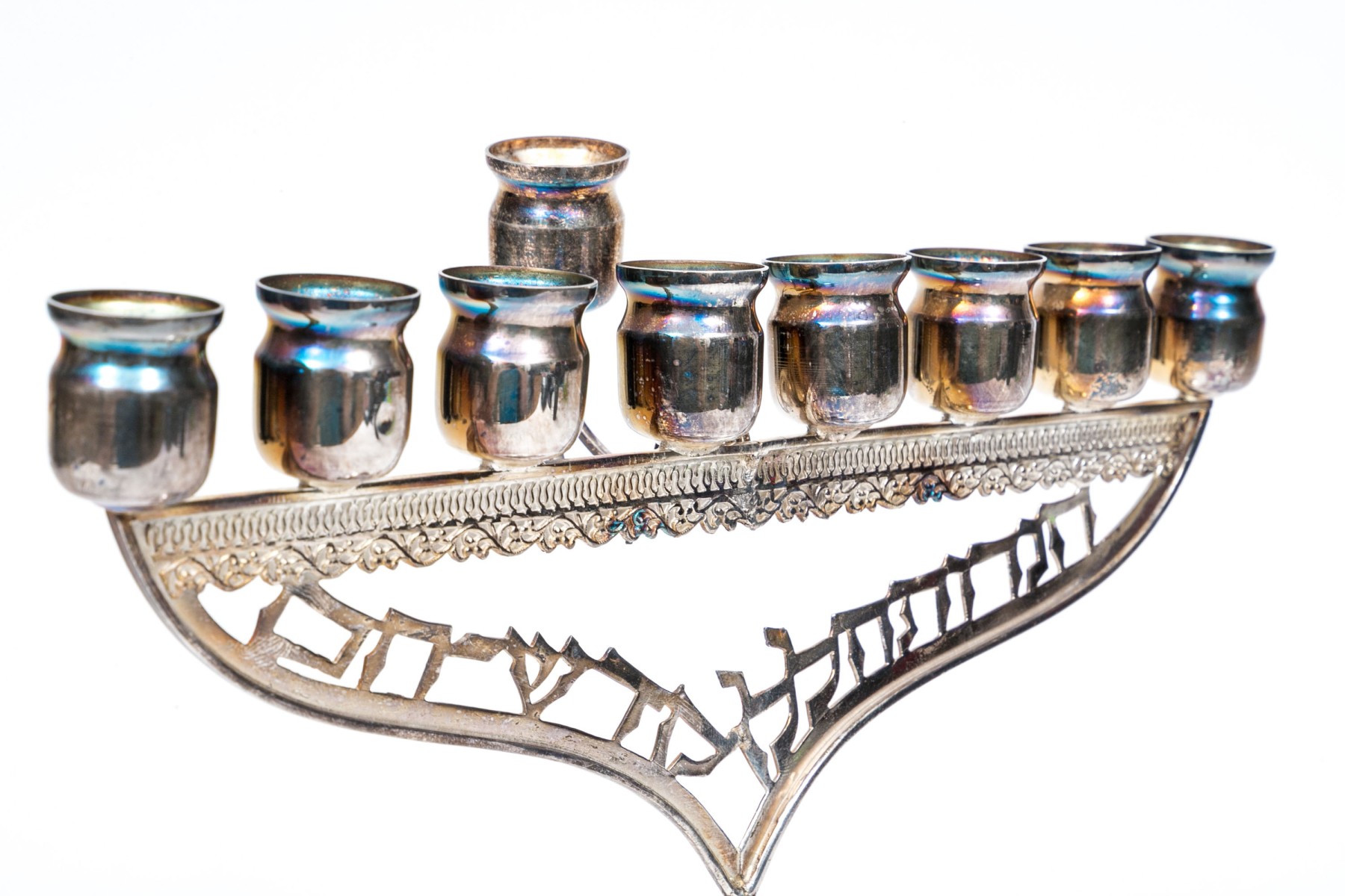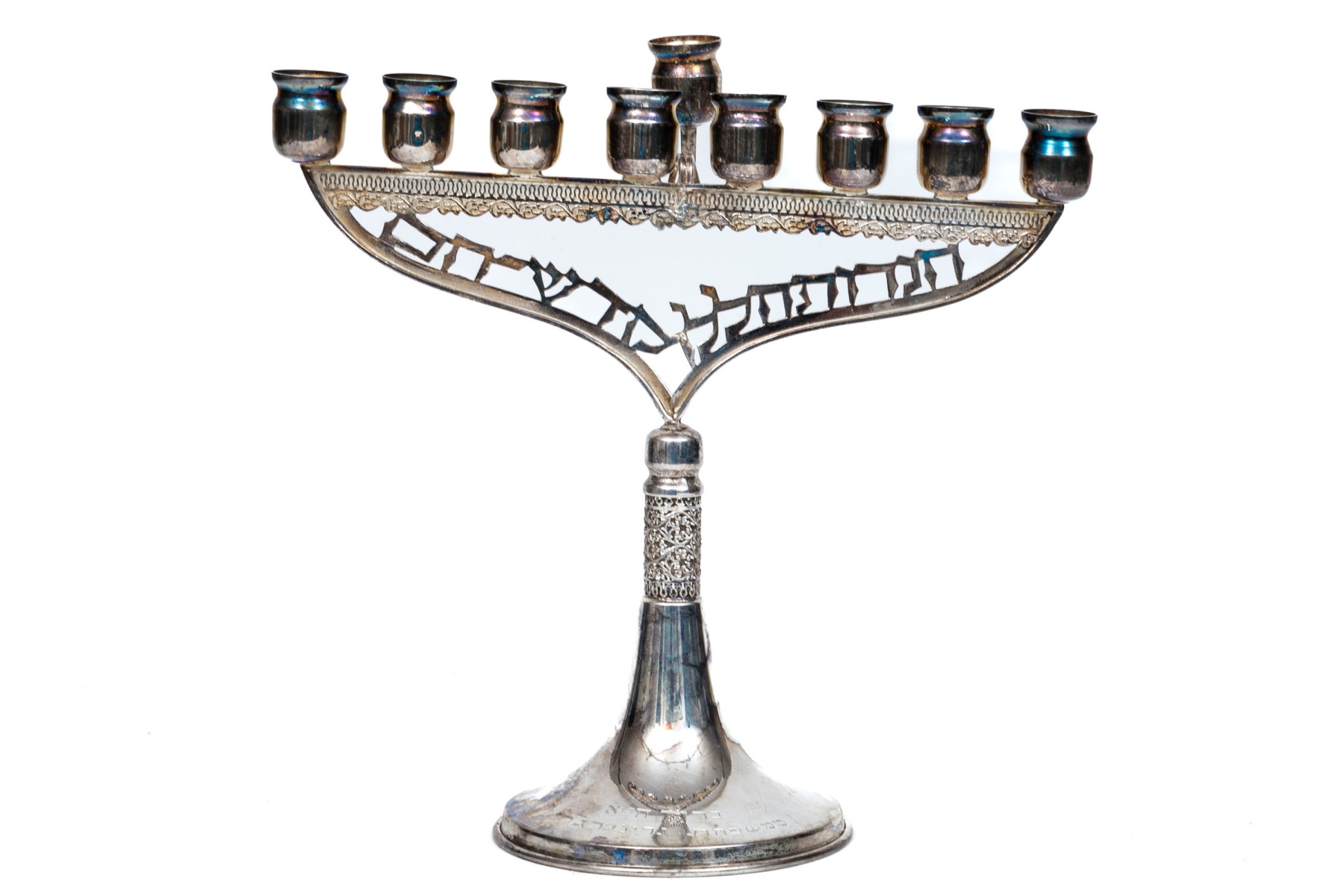 A sterling silver menorah with engraving at the base. The top of the menorah has a ninth removable candle holder.