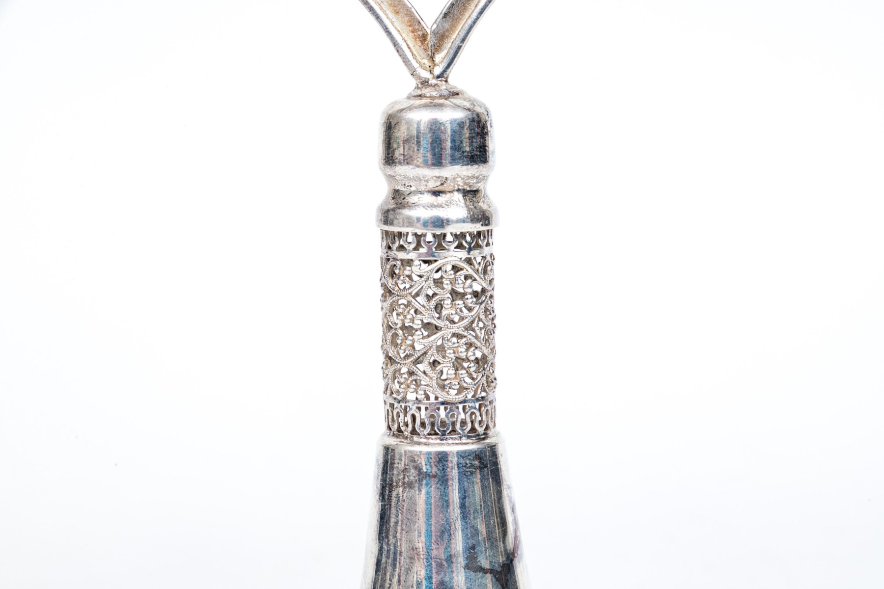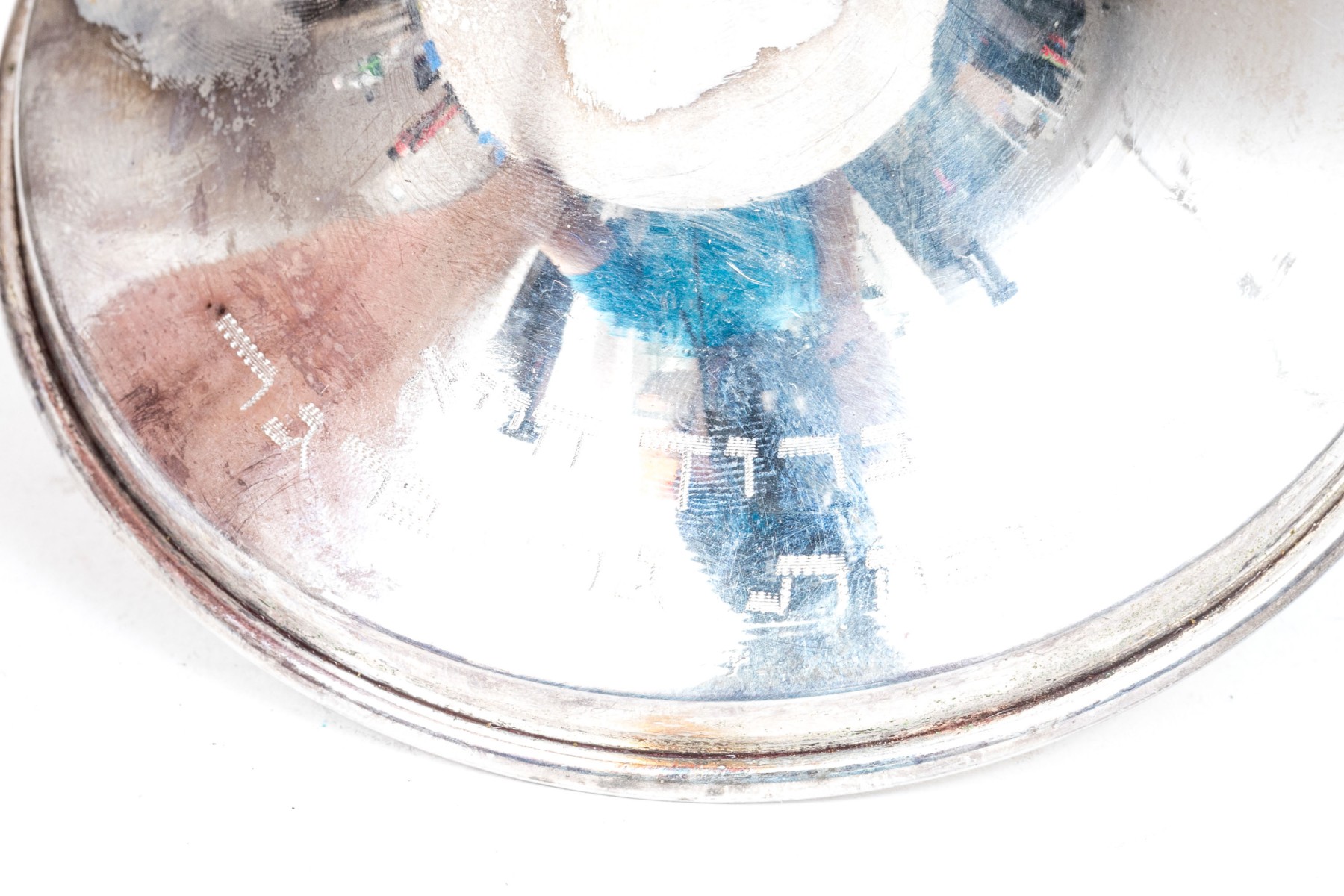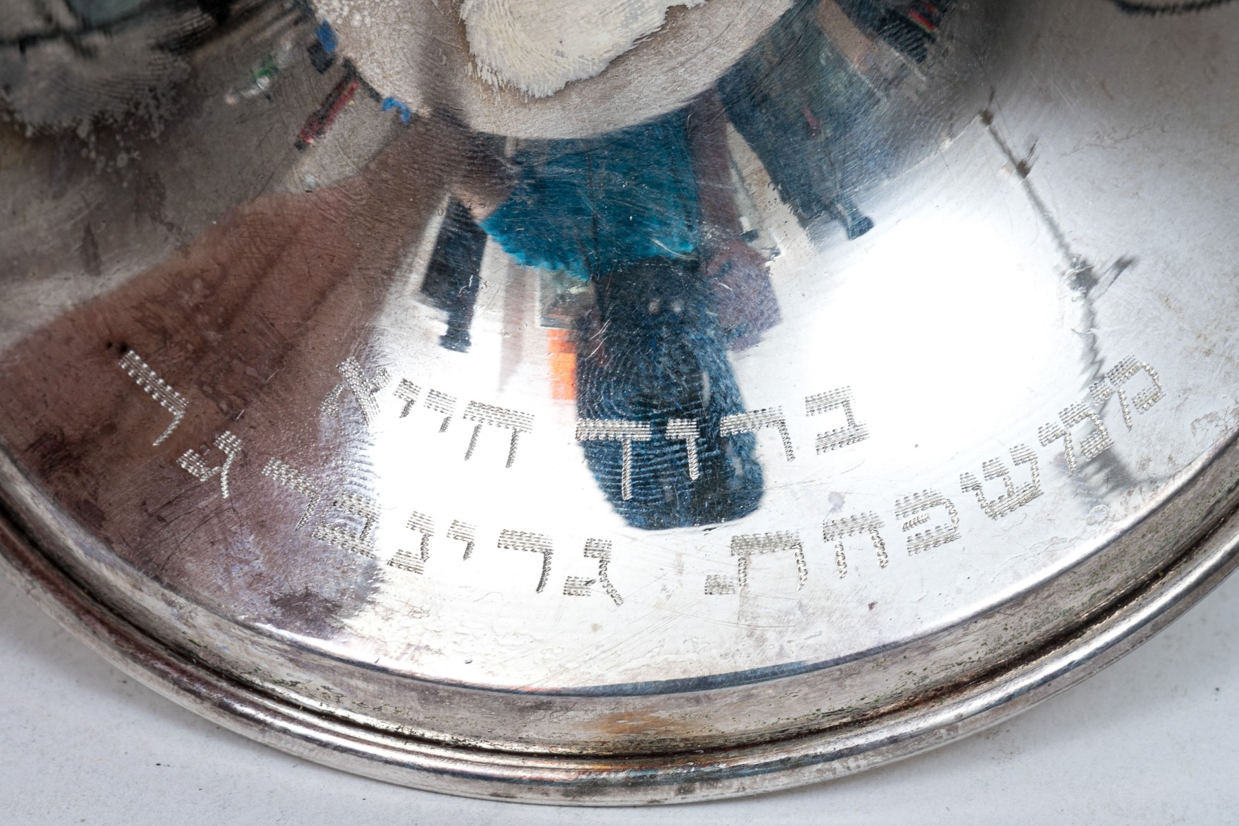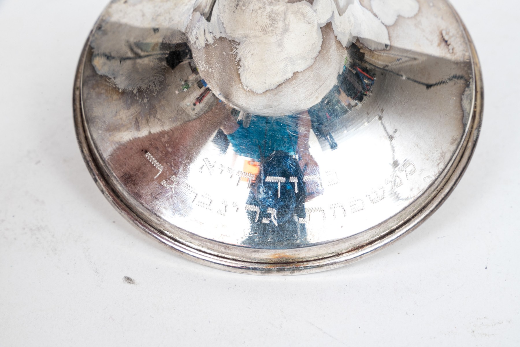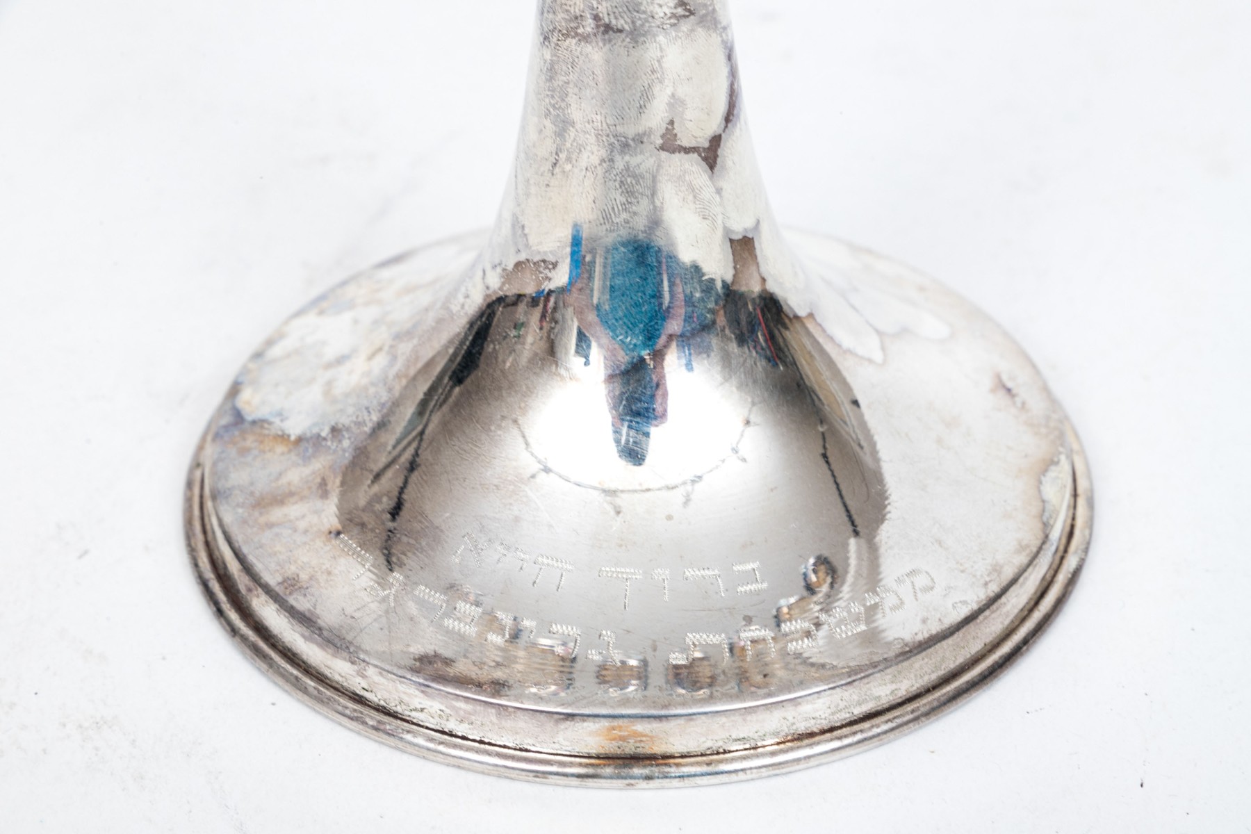 A sterling silver menorah with engraving at the base. The top of the menorah has a ninth removable candle holder.