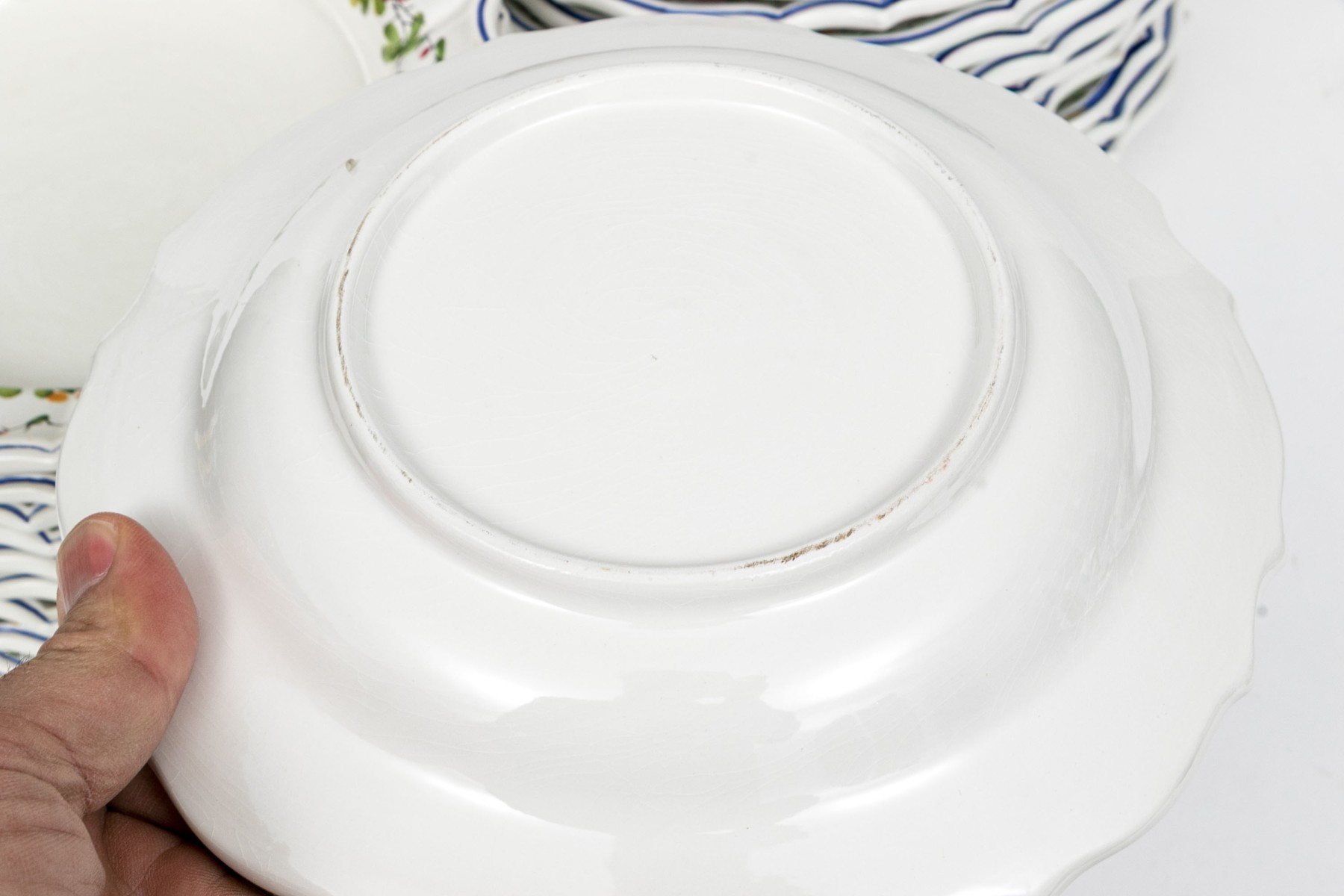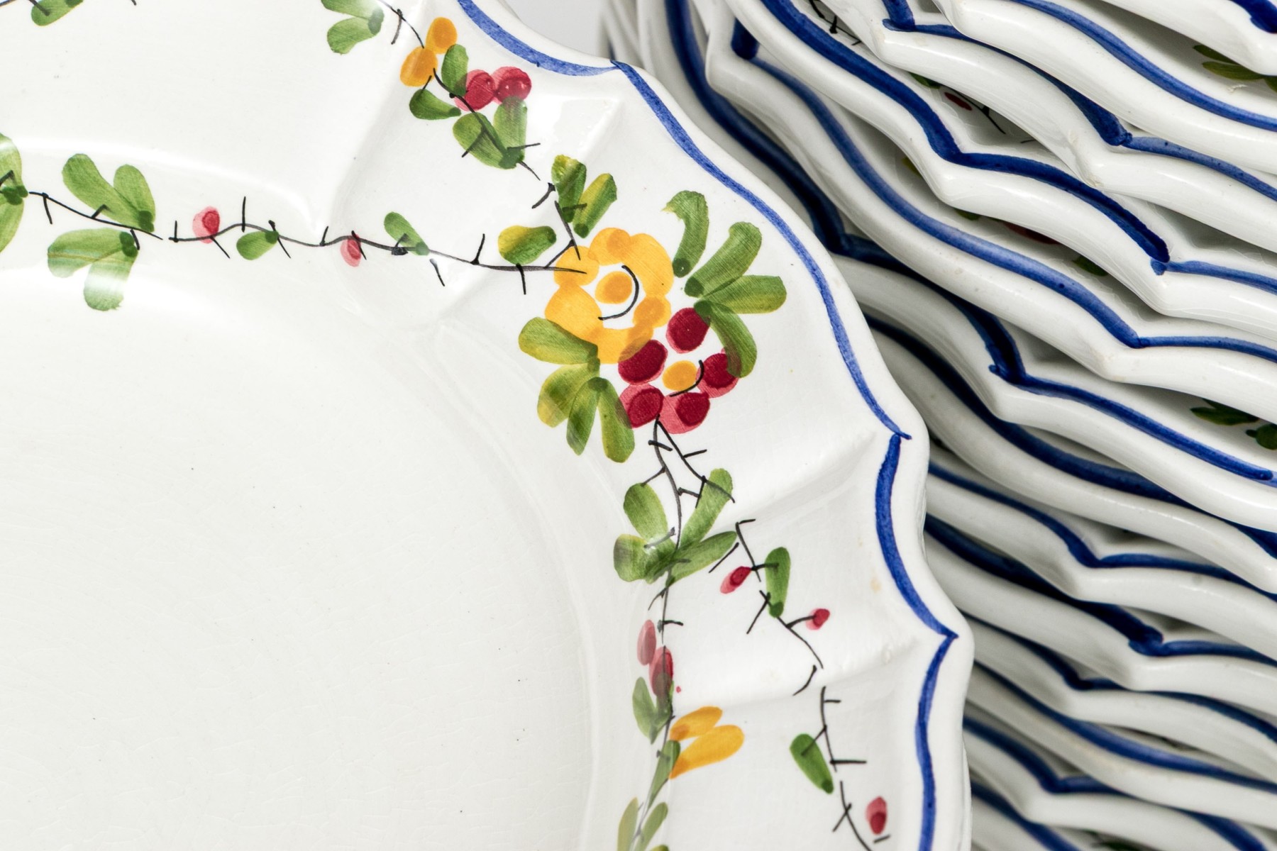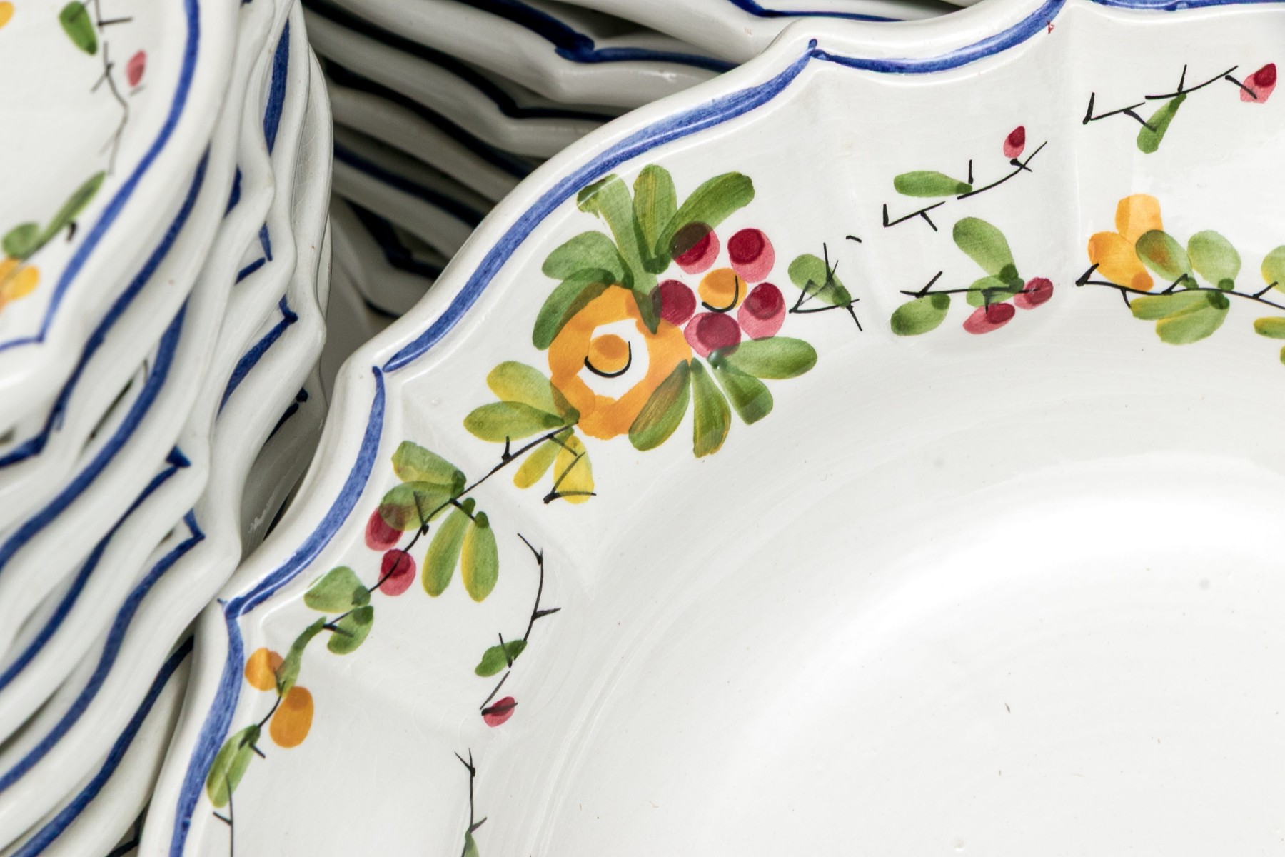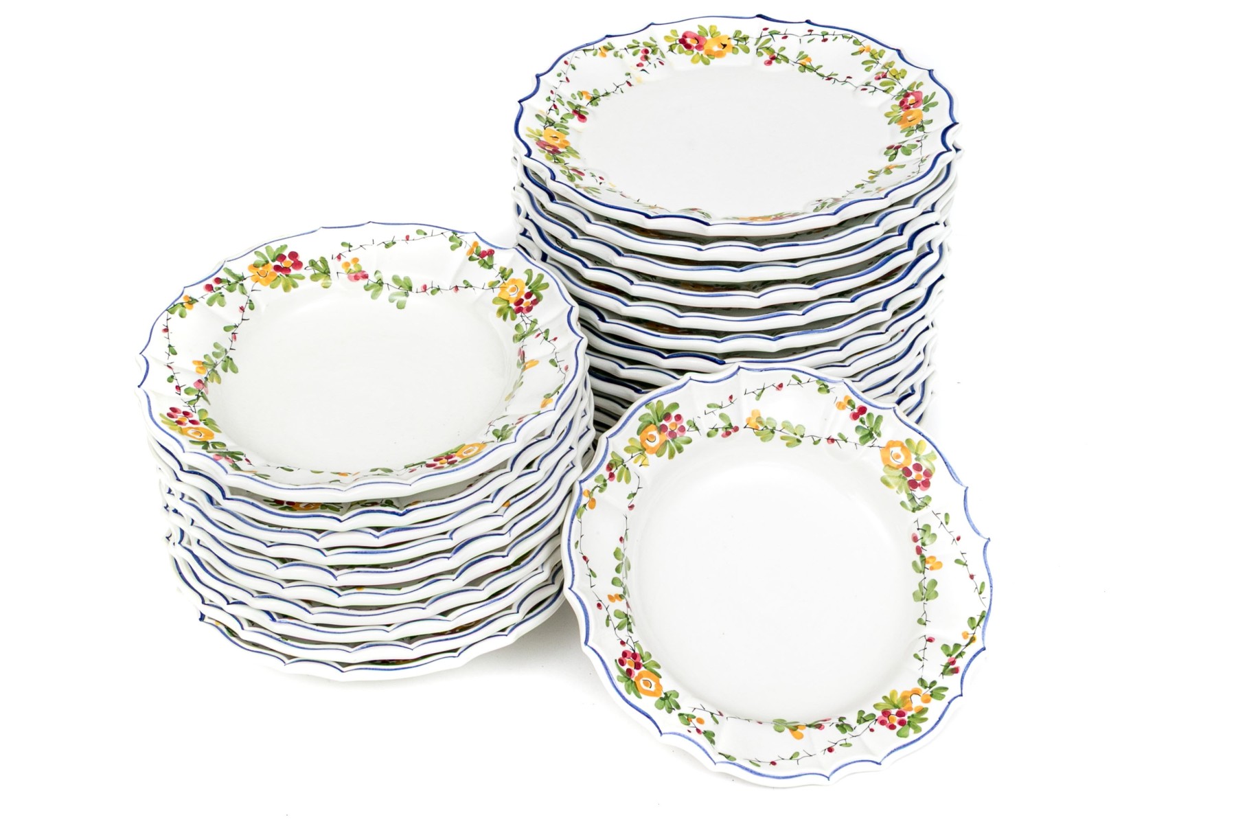 A wonderful collection of ceramics including fourteen plates and eleven bowls. All designed with shapely bracketed blue rims hand-painted with yellow and red floral swags.