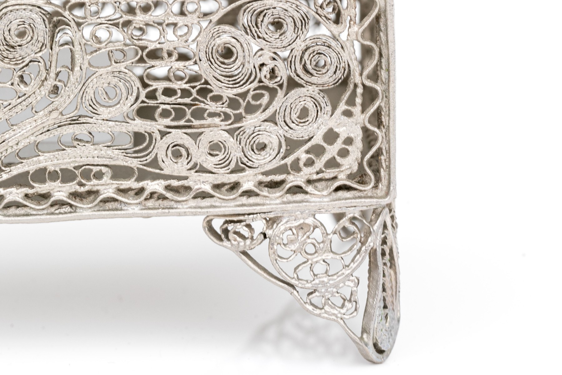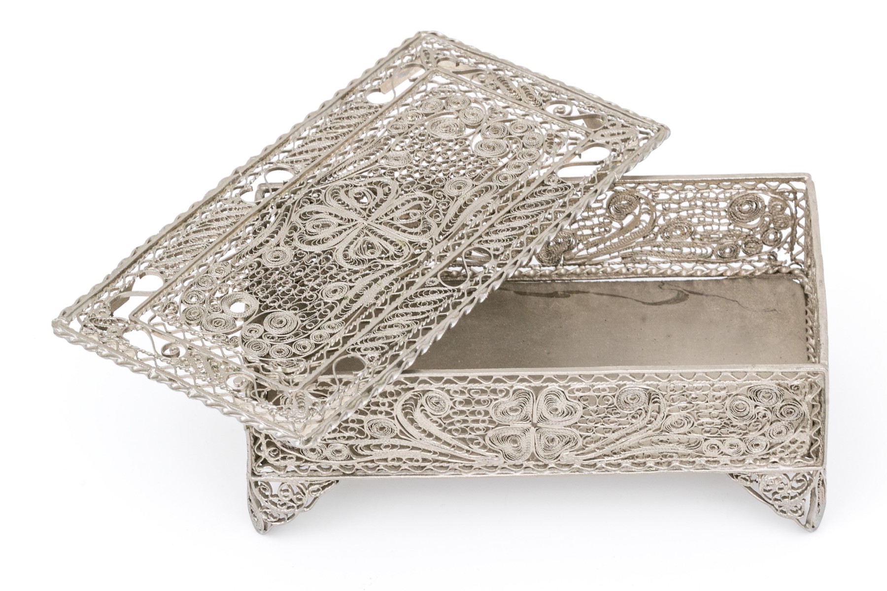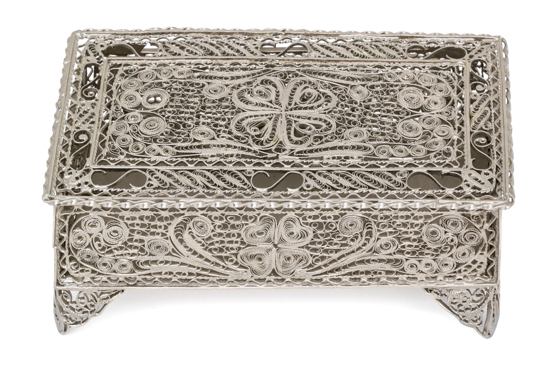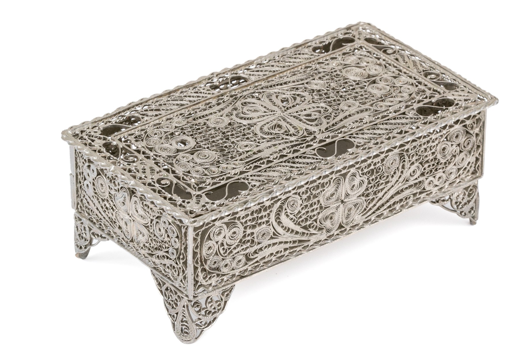 A rectangular footed box with openwork filigree on the lid, sides and feet in a foliate scrolled pattern.