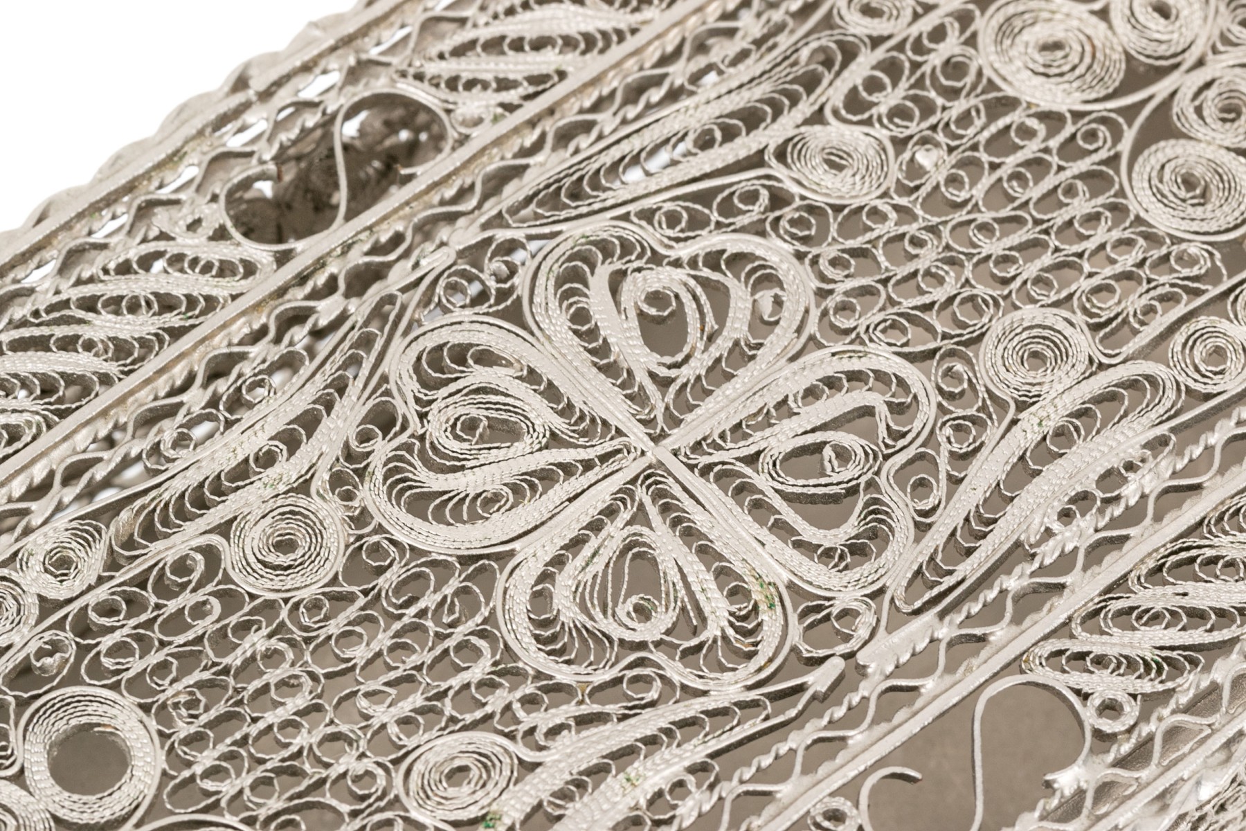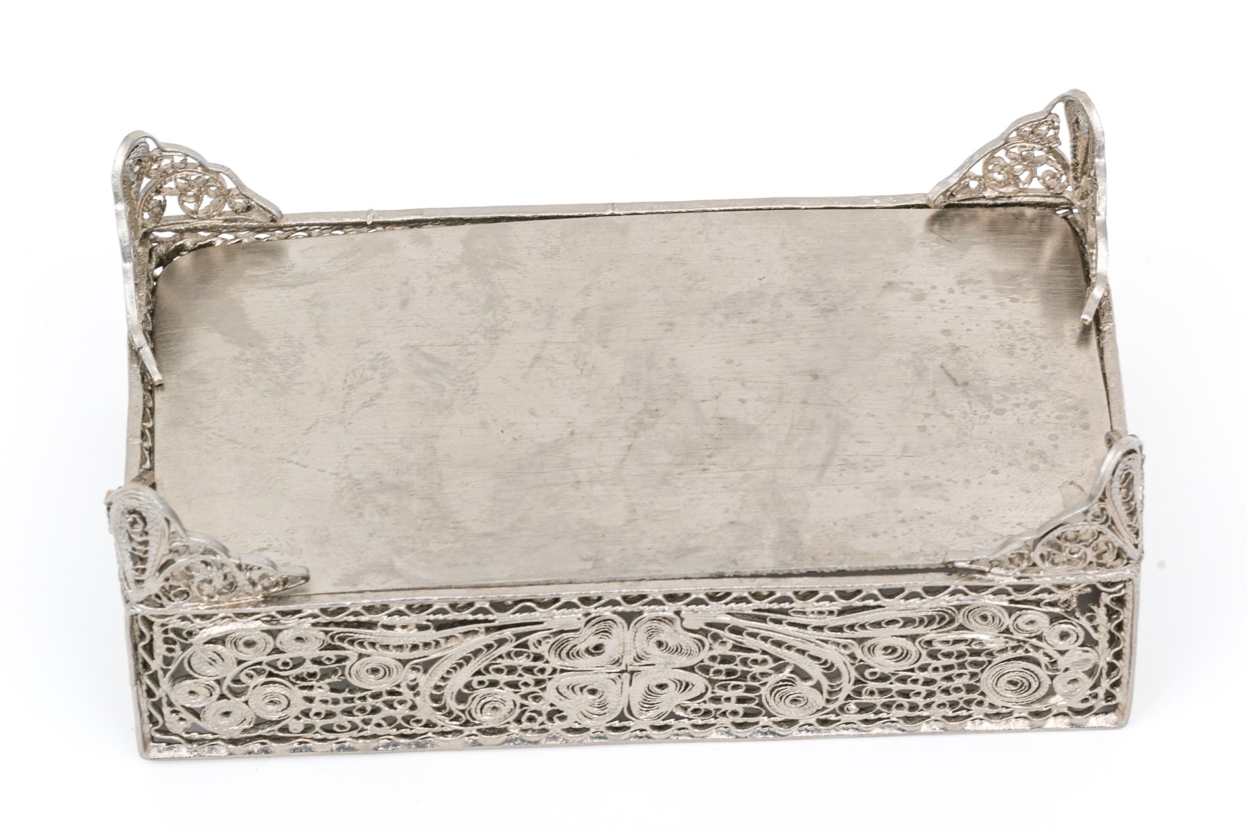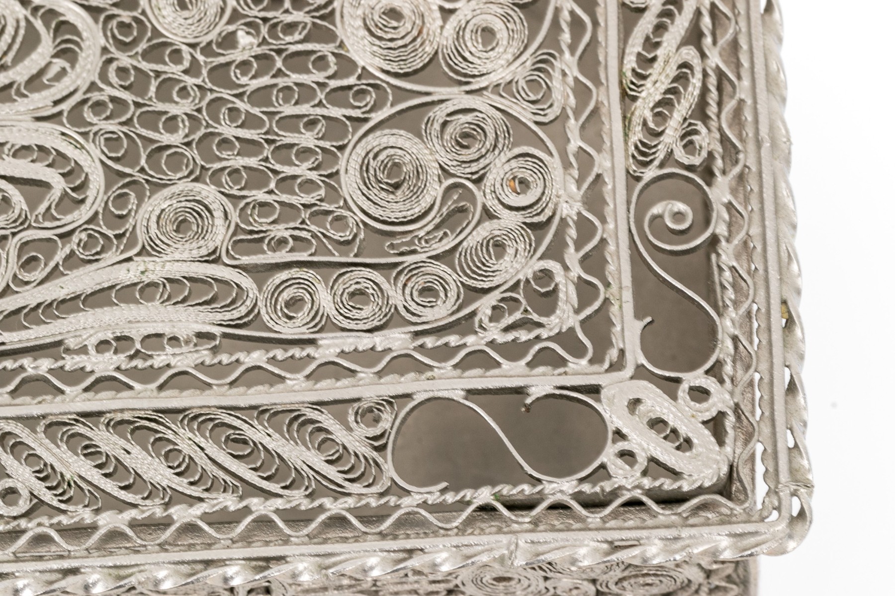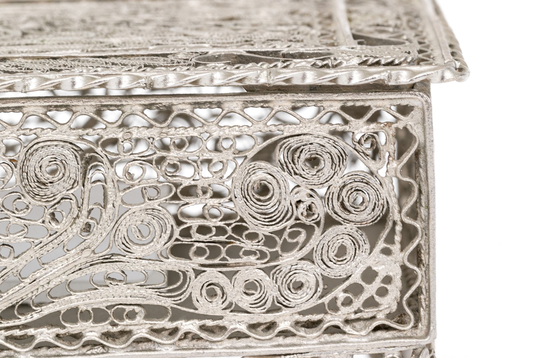 A rectangular footed box with openwork filigree on the lid, sides and feet in a foliate scrolled pattern.