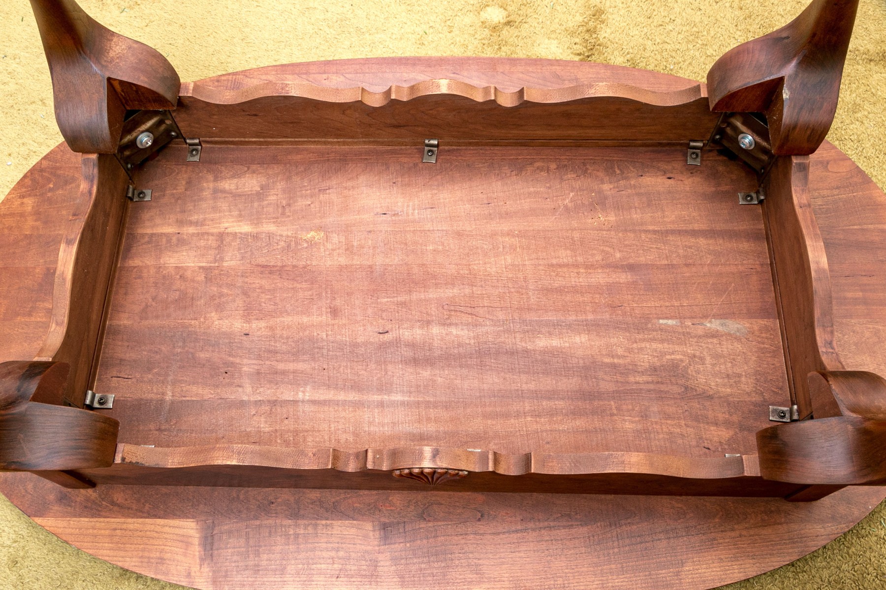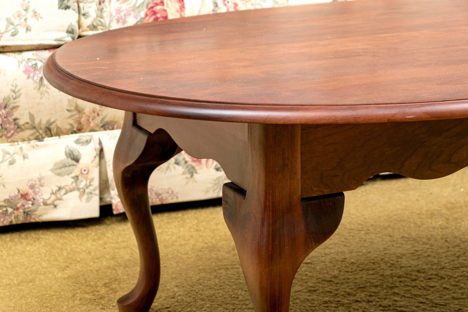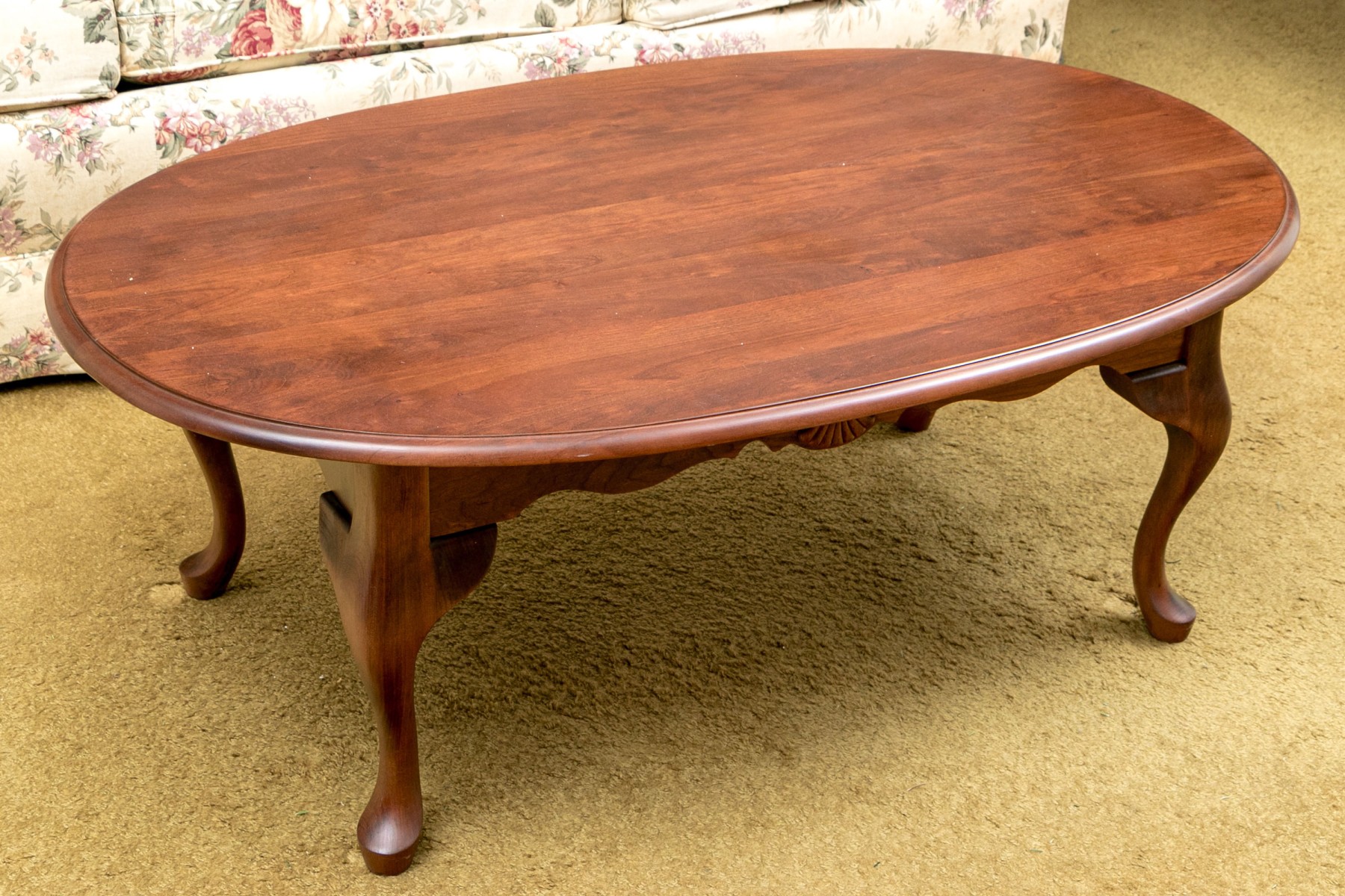 An oval wood low table with a plank constructed top and carved and shaped skirt rail with a shell center motif. Raised on curved legs with wide knees.