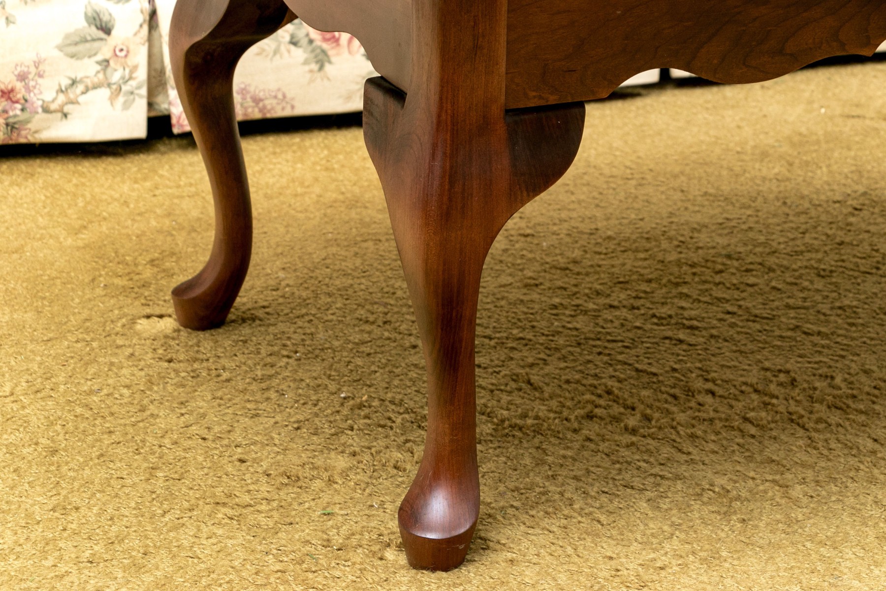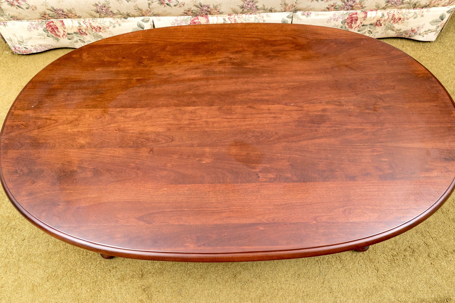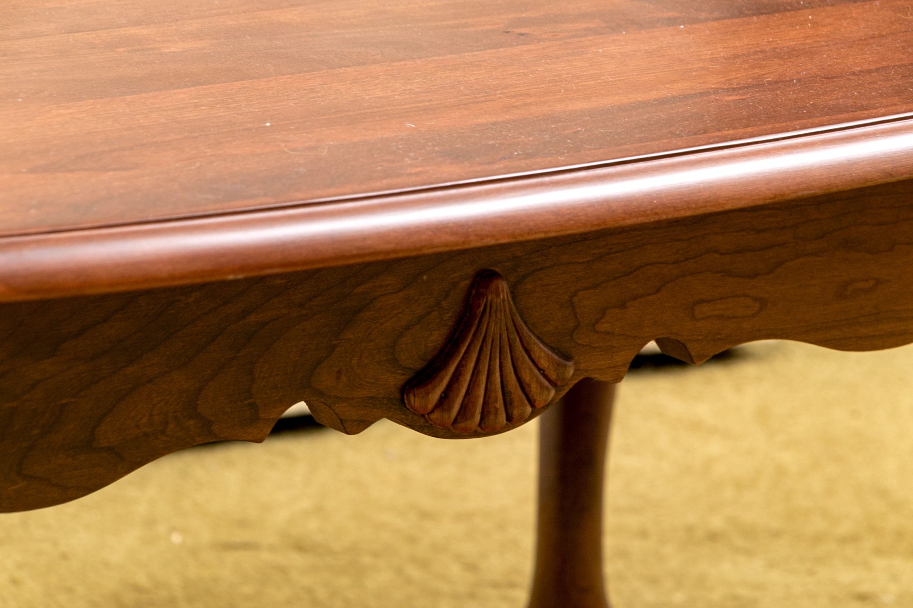 An oval wood low table with a plank constructed top and carved and shaped skirt rail with a shell center motif. Raised on curved legs with wide knees.