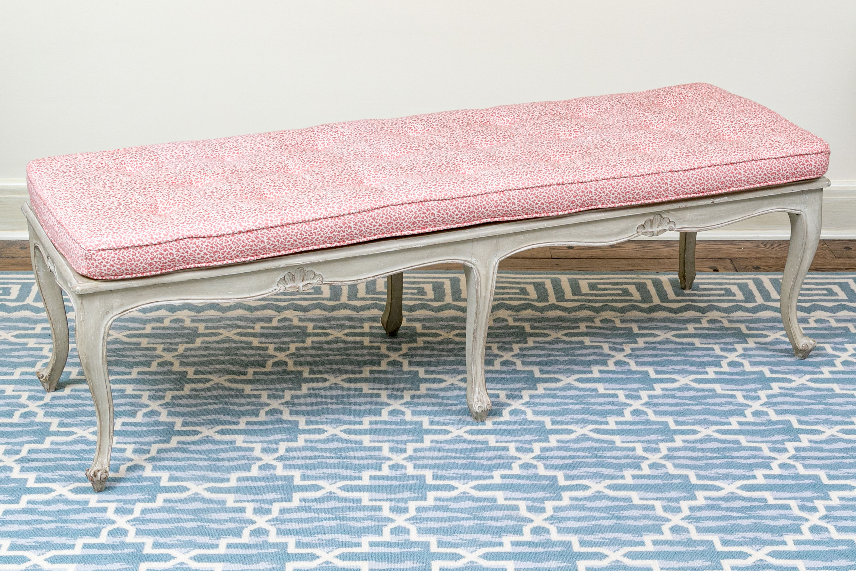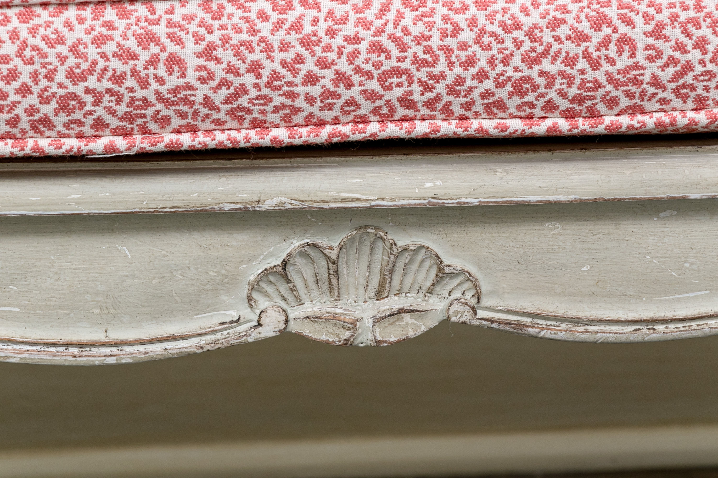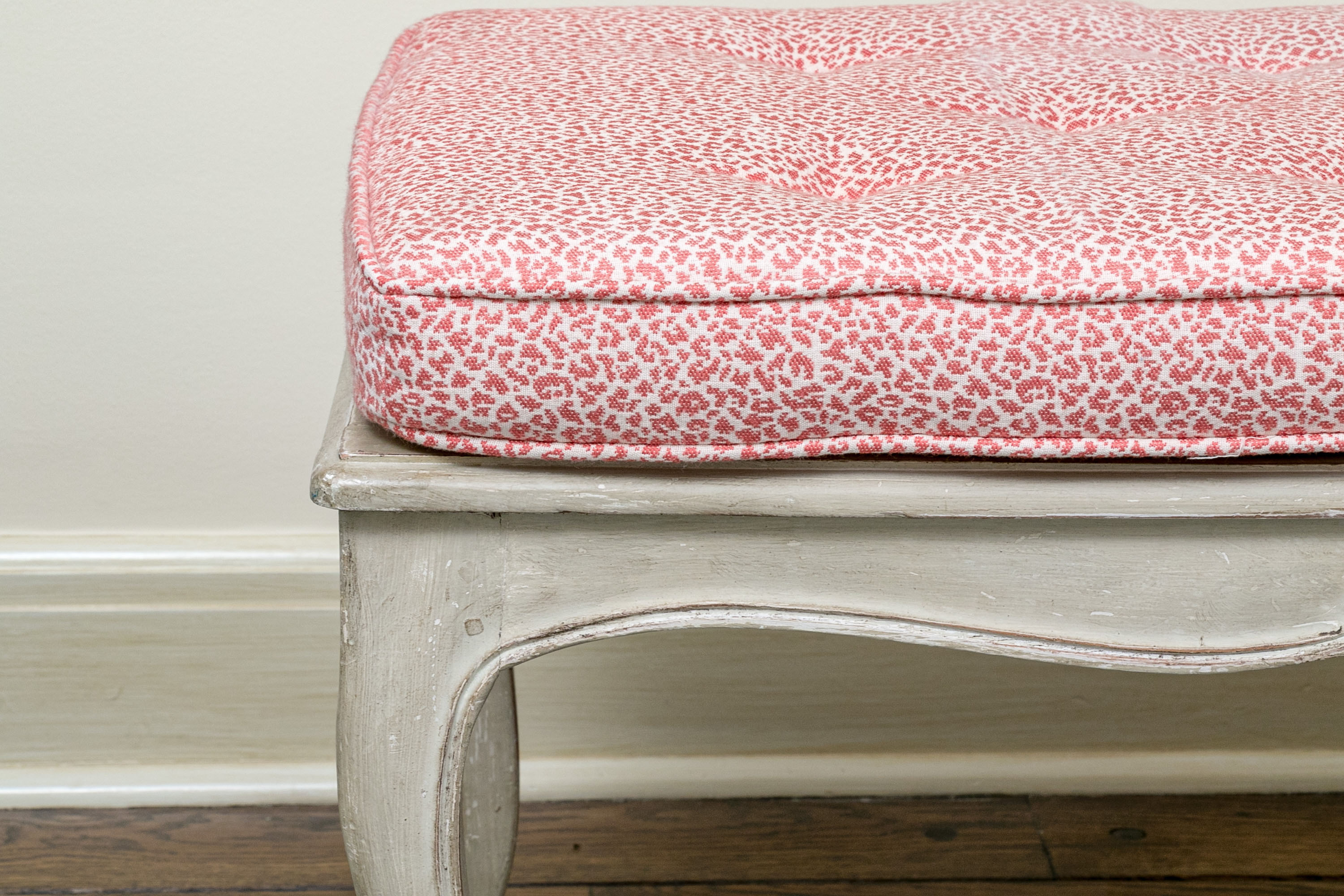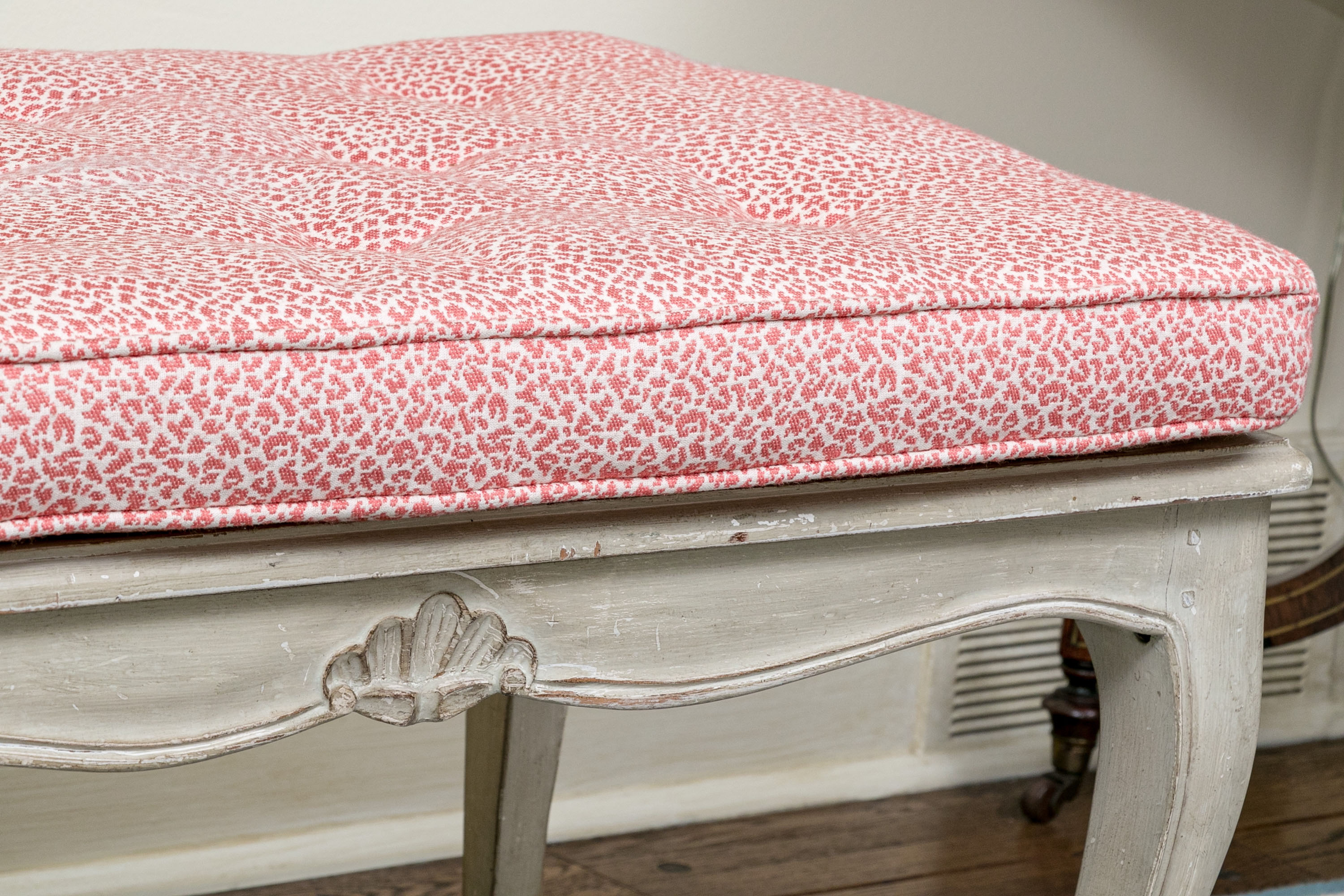 On nicely carved frame with six cabriole legs in an antiqued white finish with lovely animal print motif upholstered seat cushion.