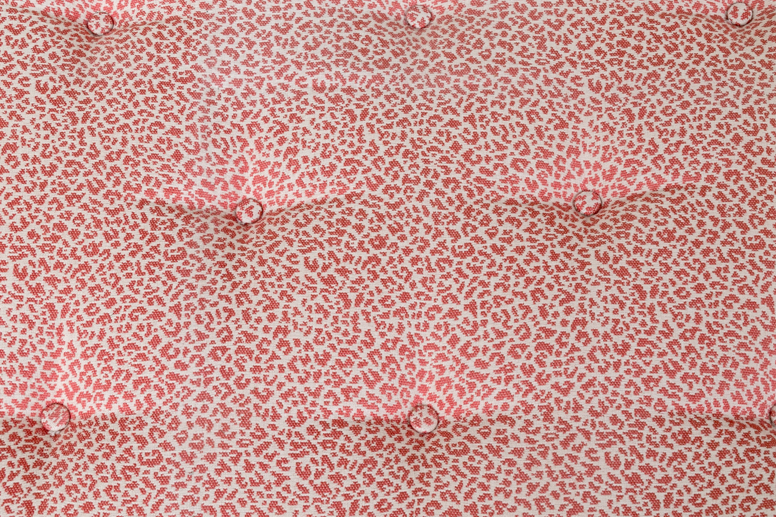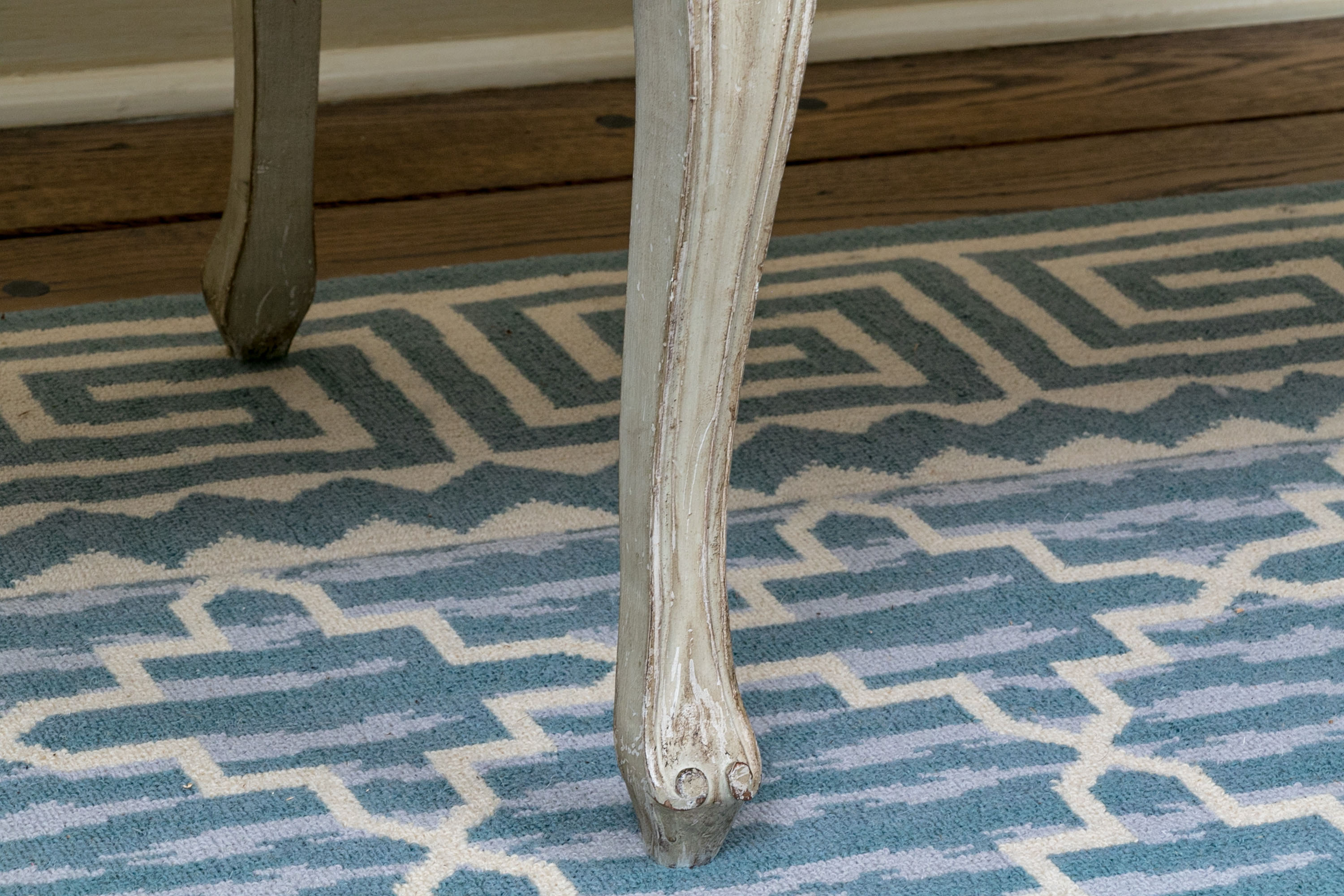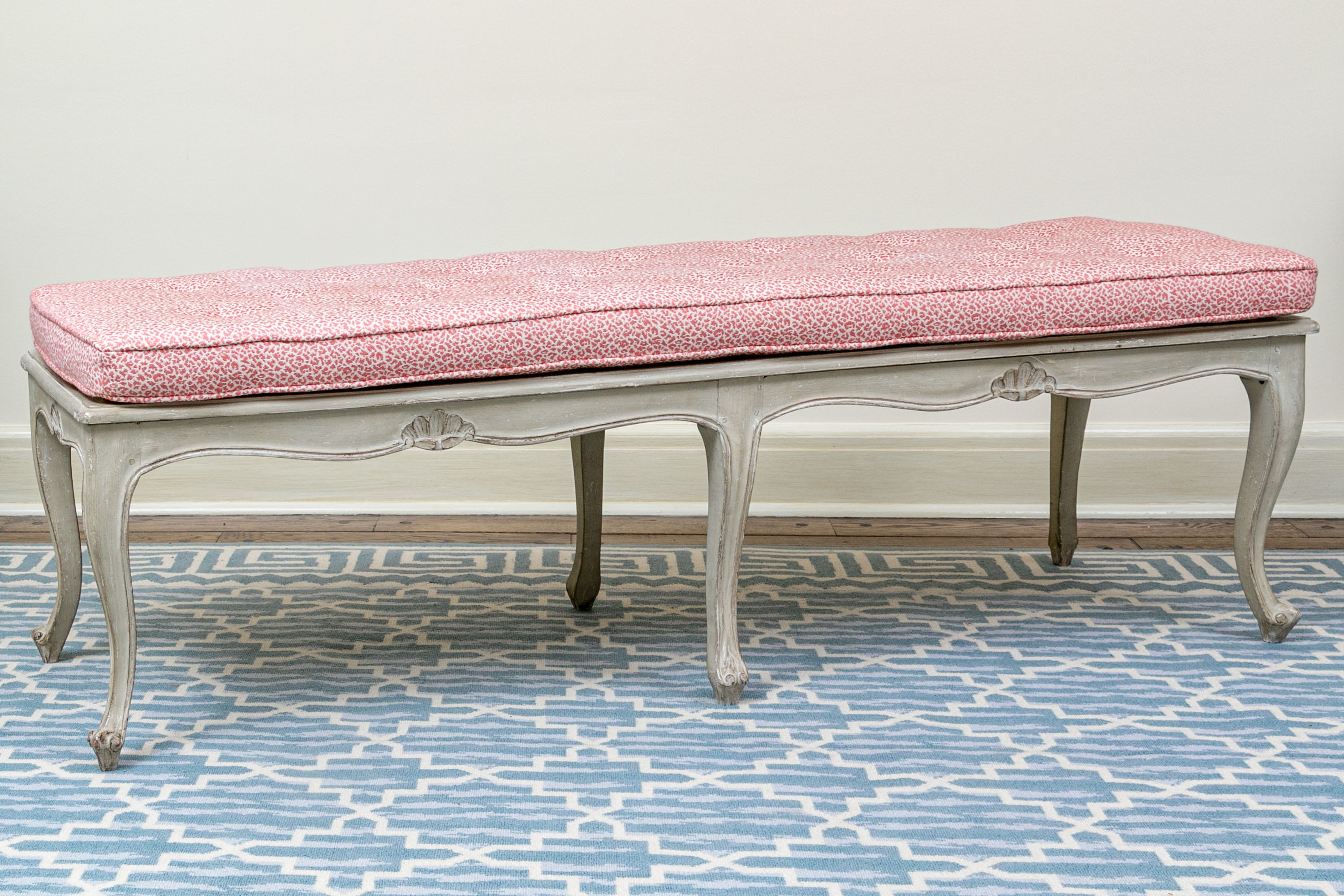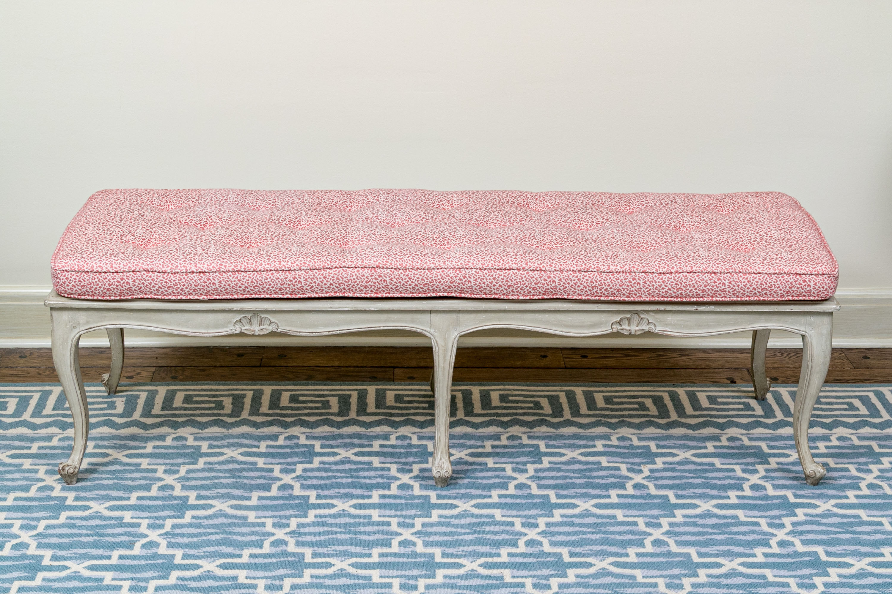 On nicely carved frame with six cabriole legs in an antiqued white finish with lovely animal print motif upholstered seat cushion.