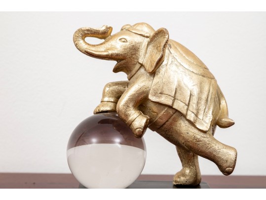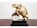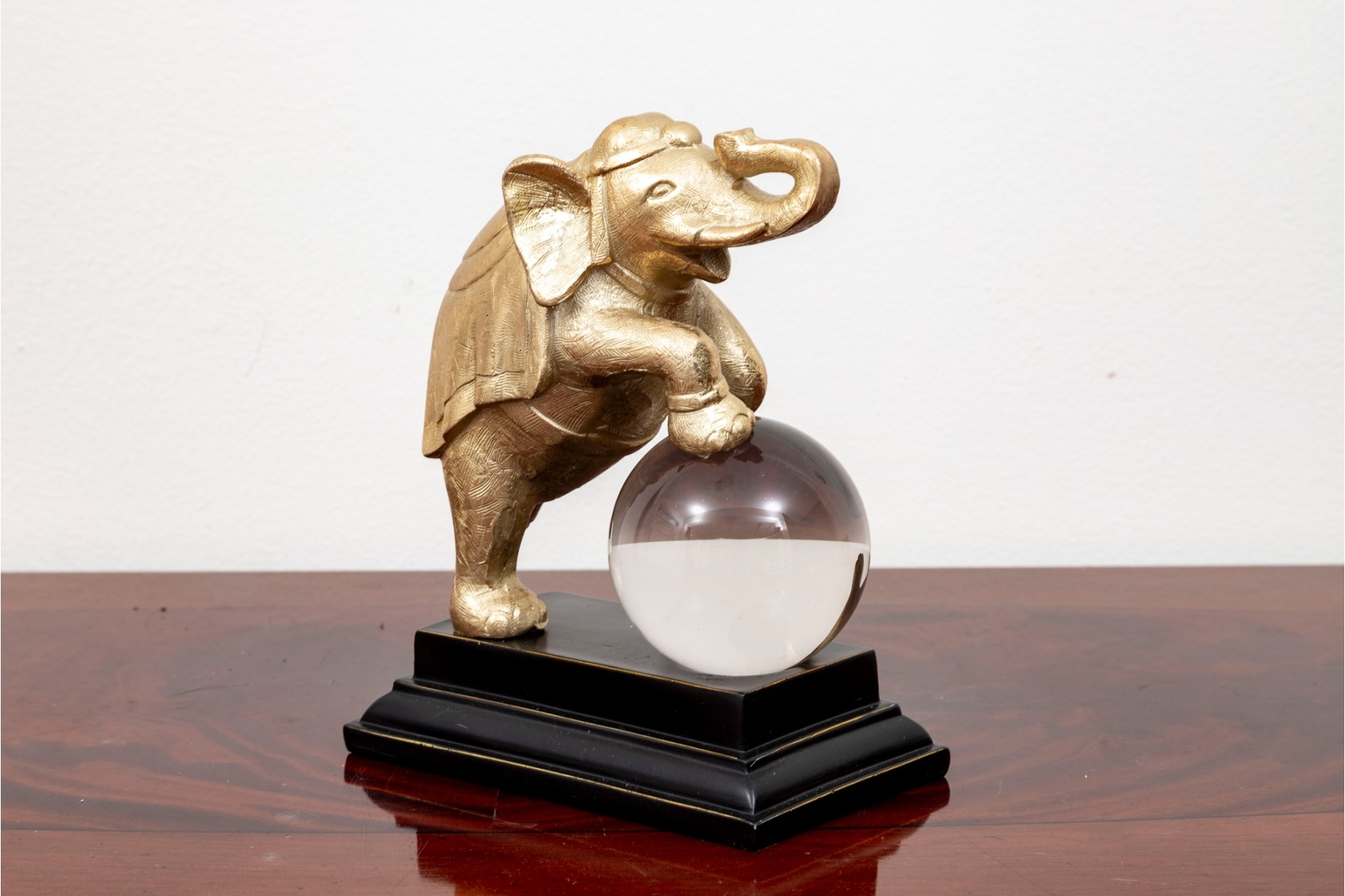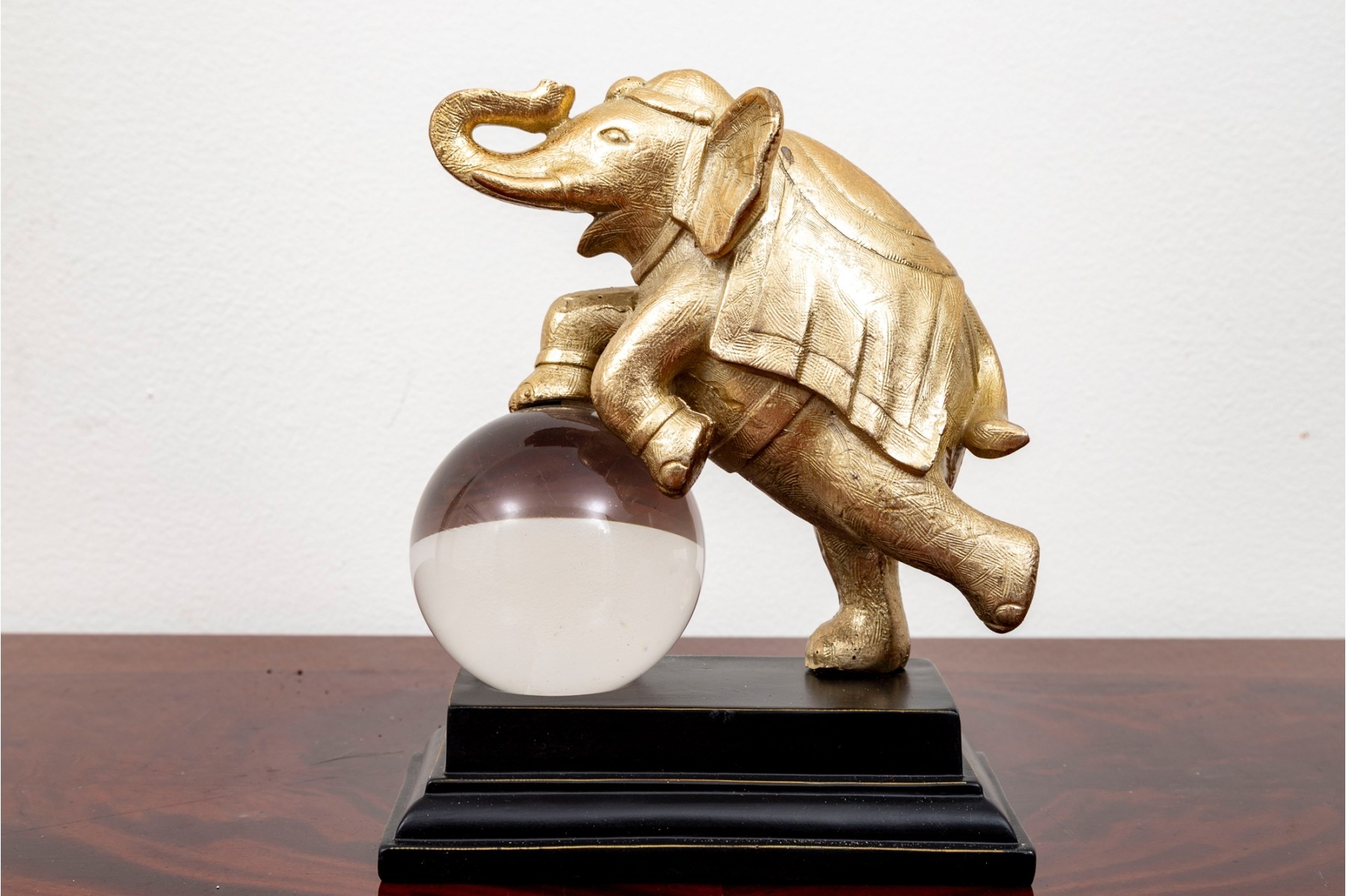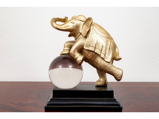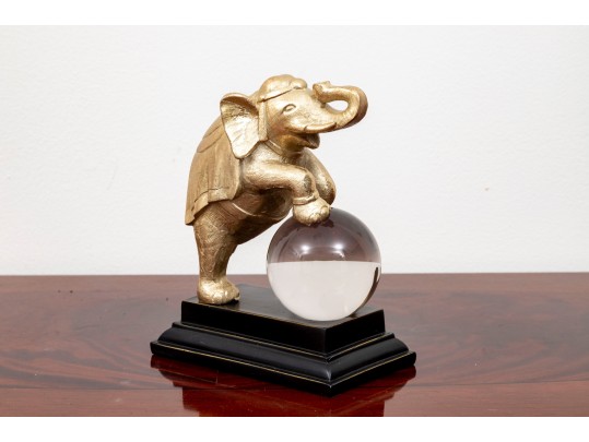 A small desktop circus act display of an elephant. The glass sphere is neatly propped beneath the elephant's foot, but is otherwise unmounted can can be removed.