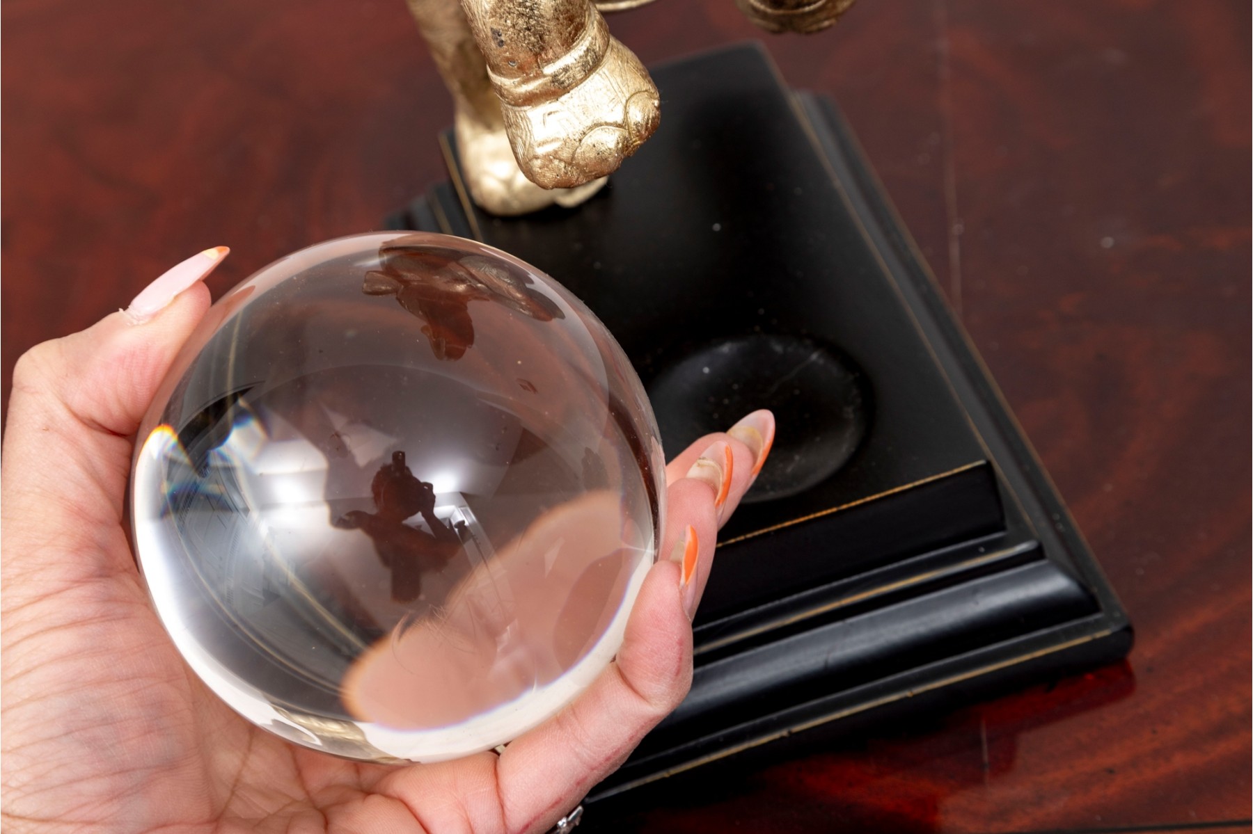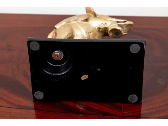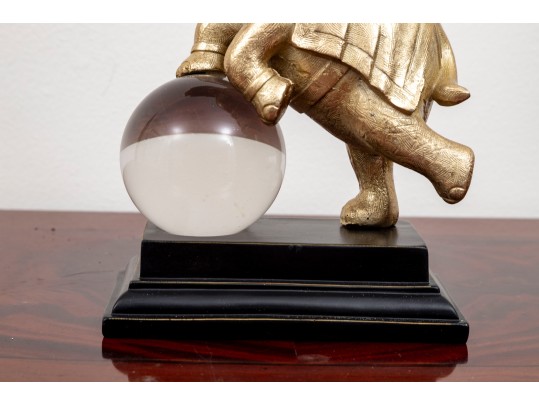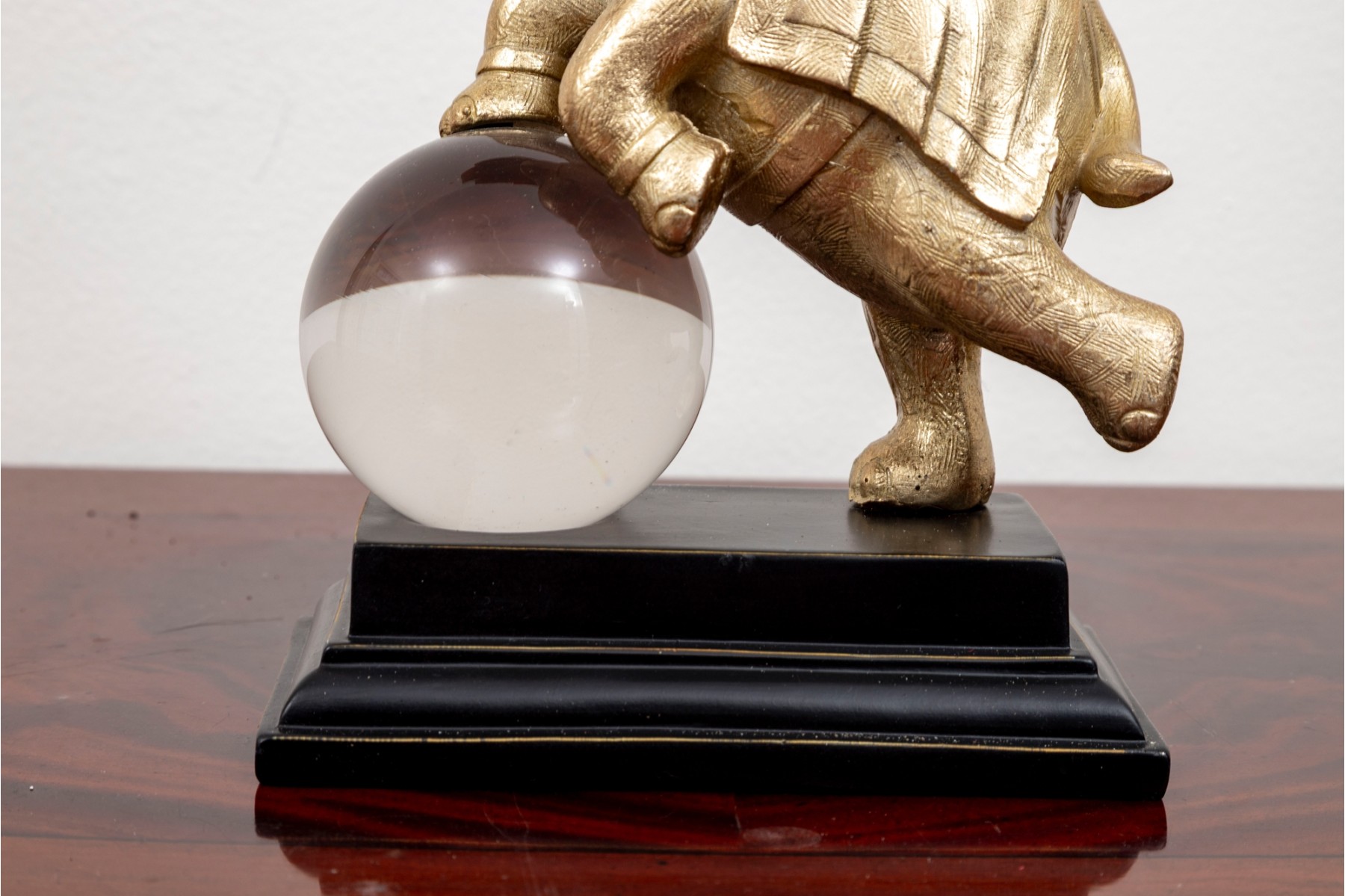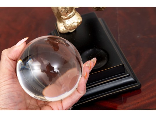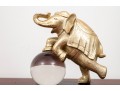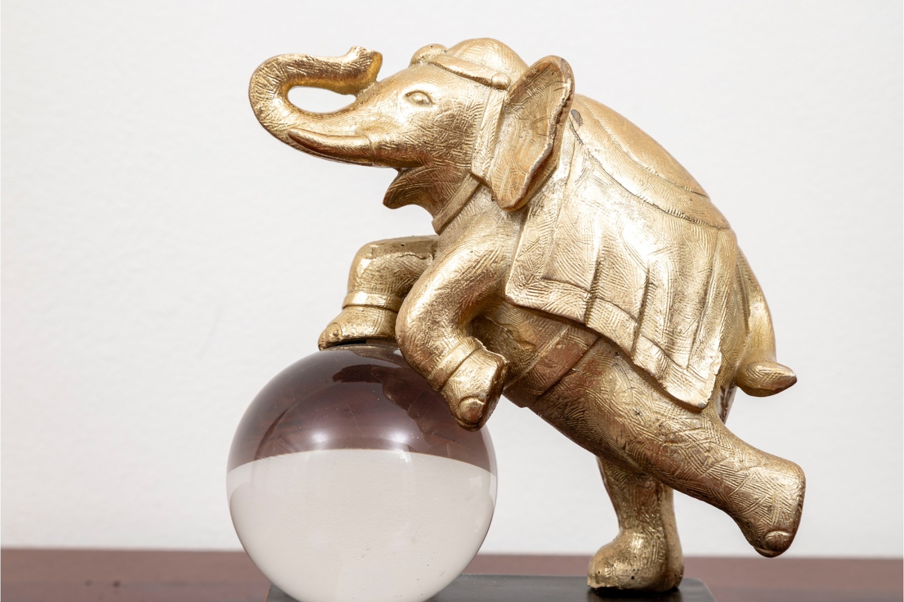 A small desktop circus act display of an elephant. The glass sphere is neatly propped beneath the elephant's foot, but is otherwise unmounted can can be removed.