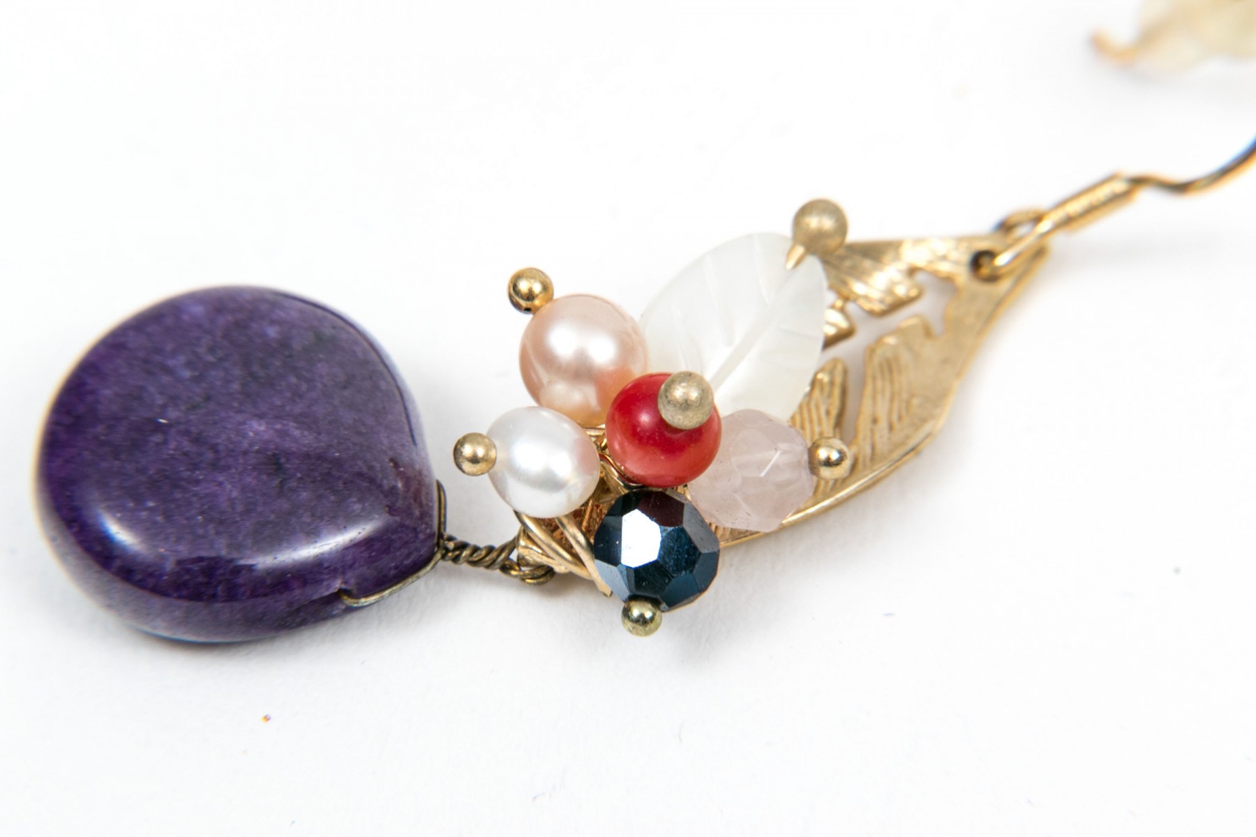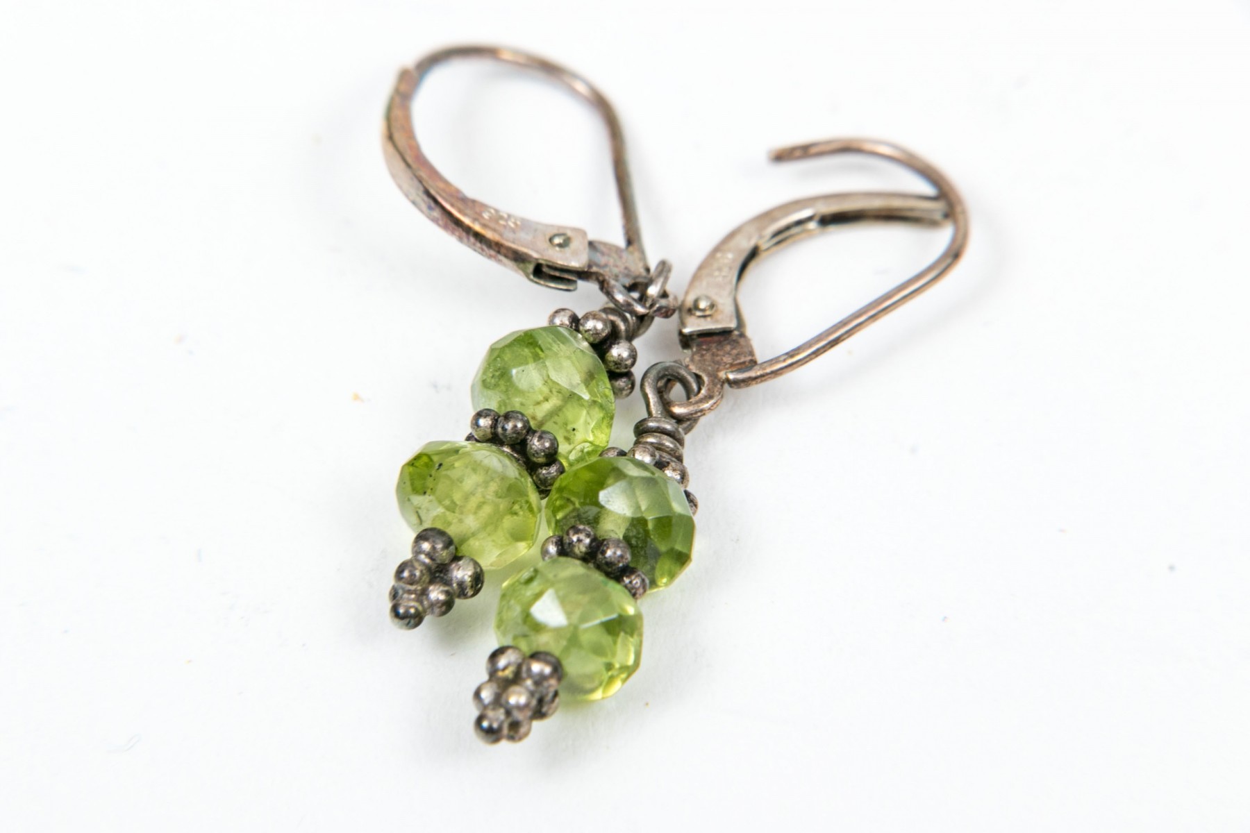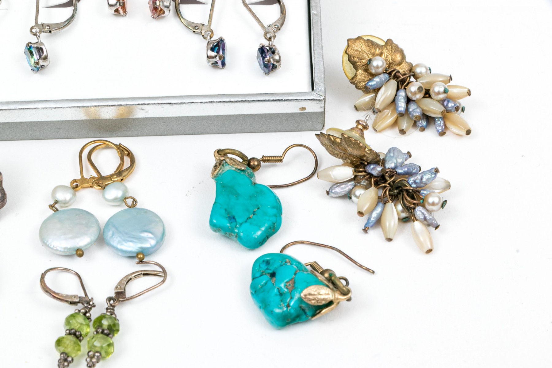 A collection of eleven sterling silver earrings. These earrings are set with mystic topaz, turquoise, baroque cultured freshwater pearls and peridots. Hook and post and clutch style backings.