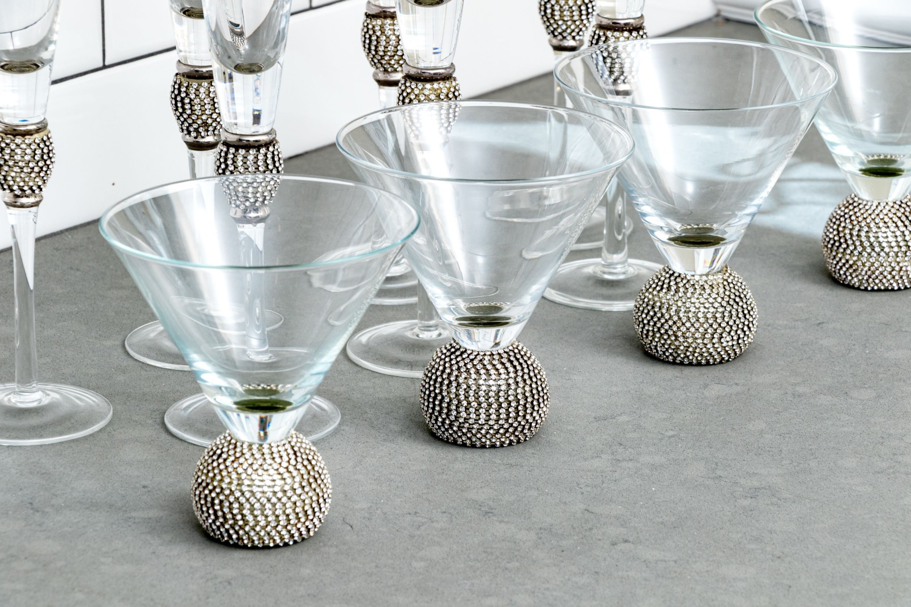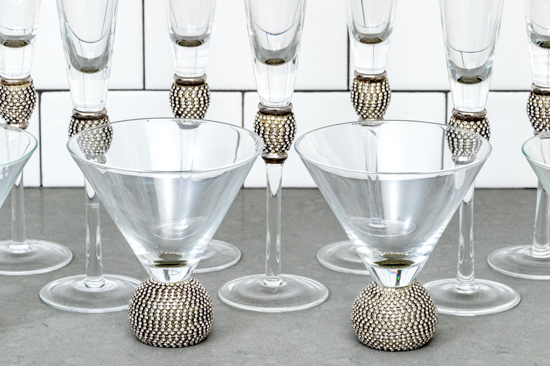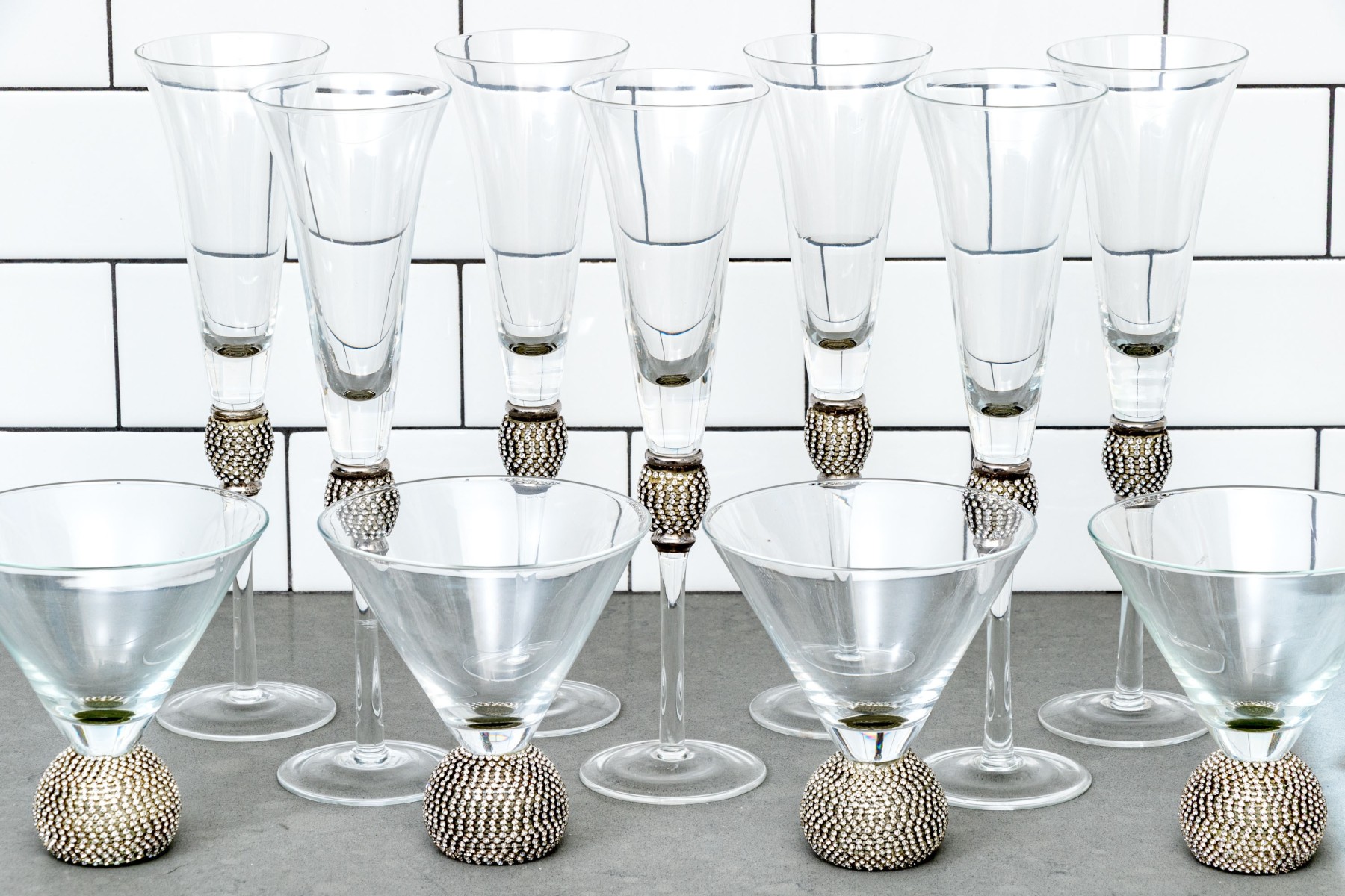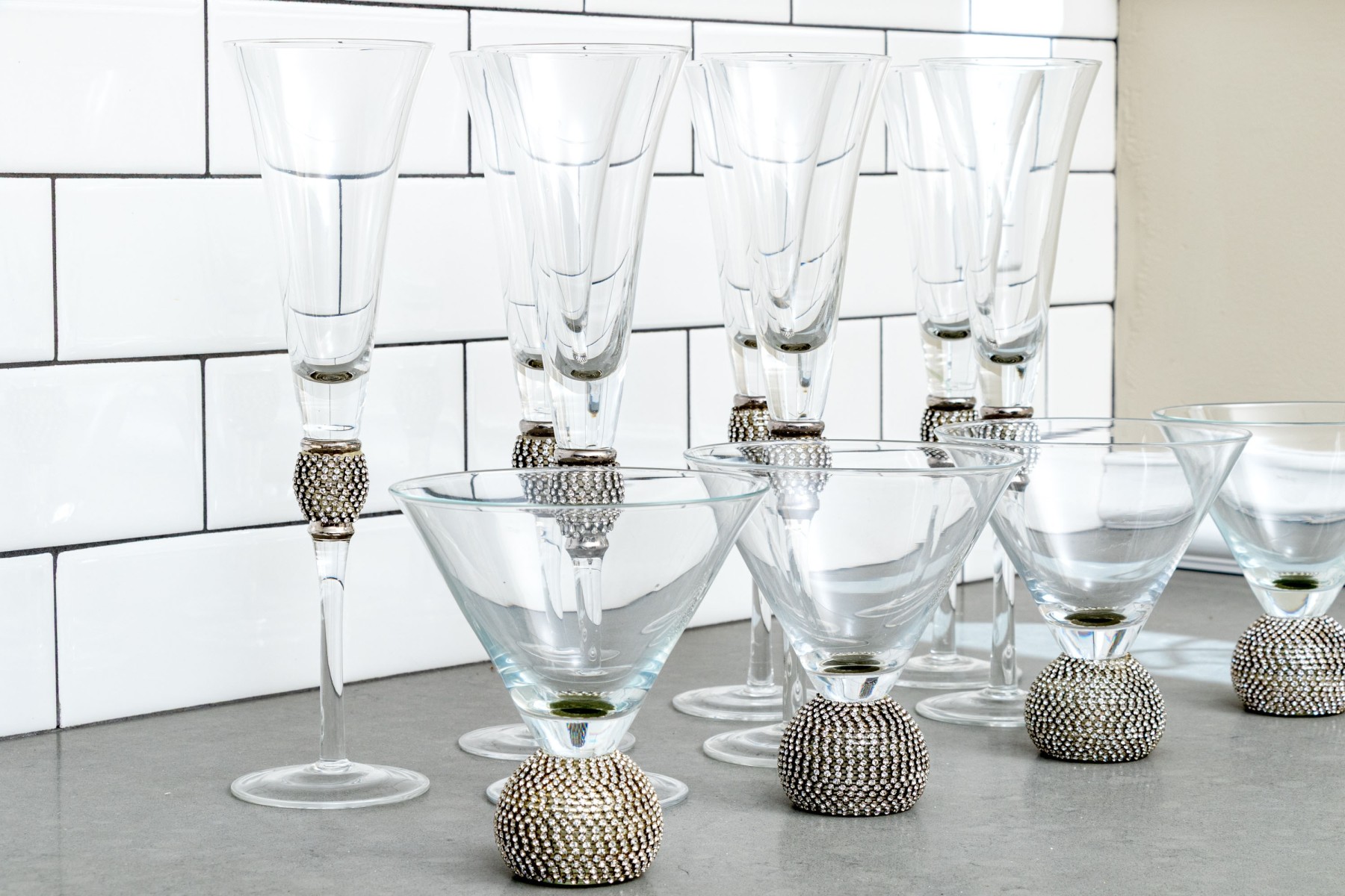 7 flutes, 4 martinis. All with decorative embellished sections.