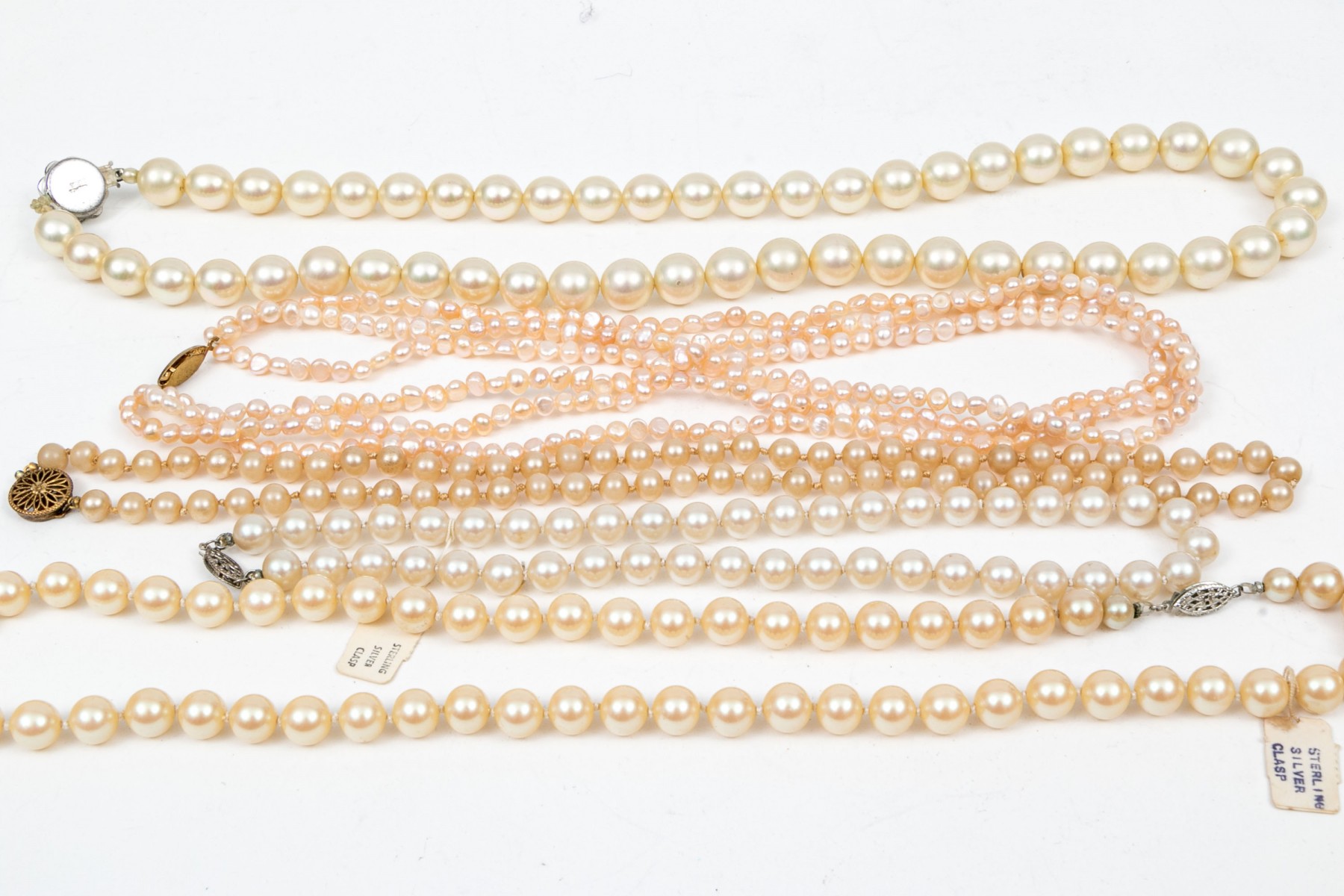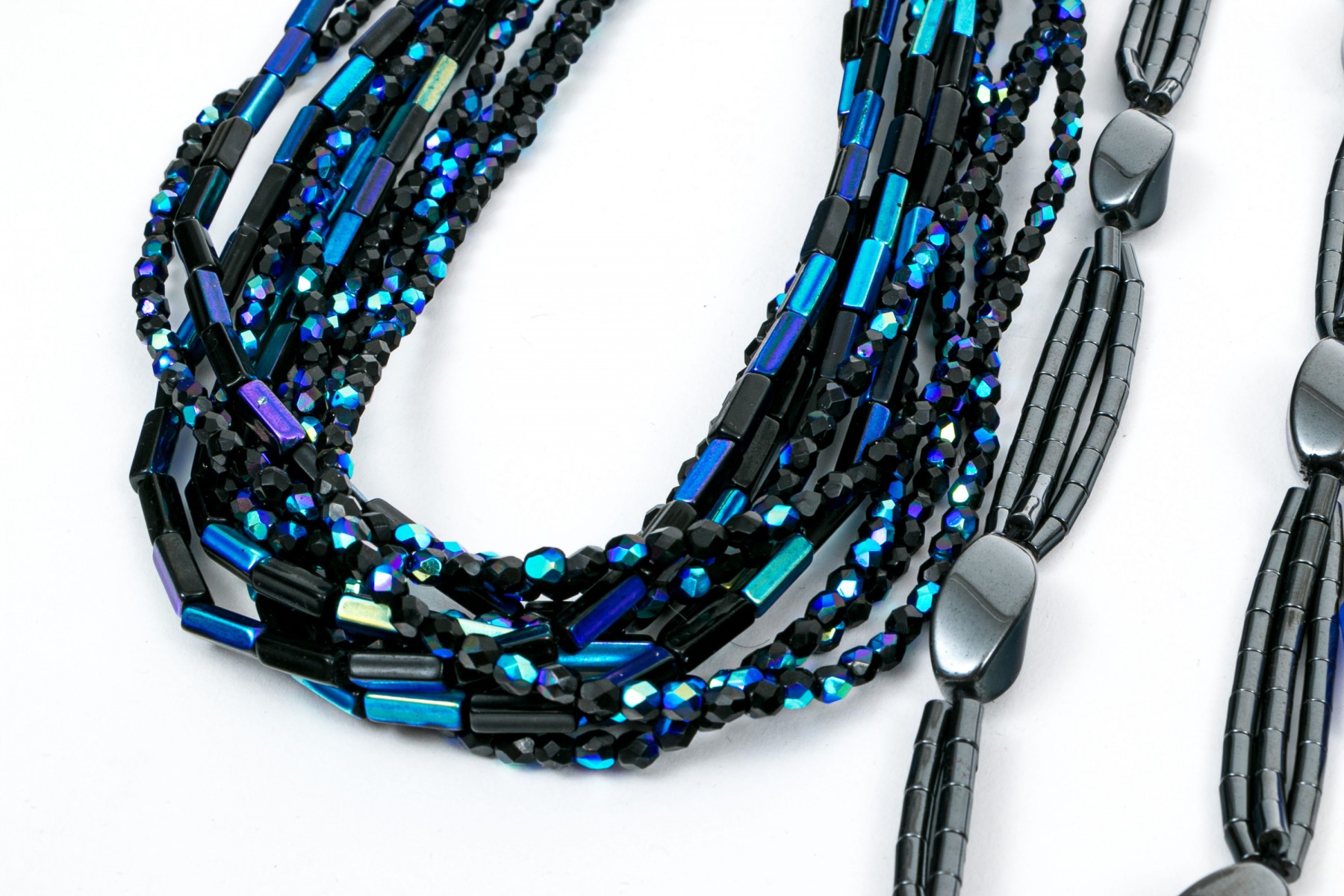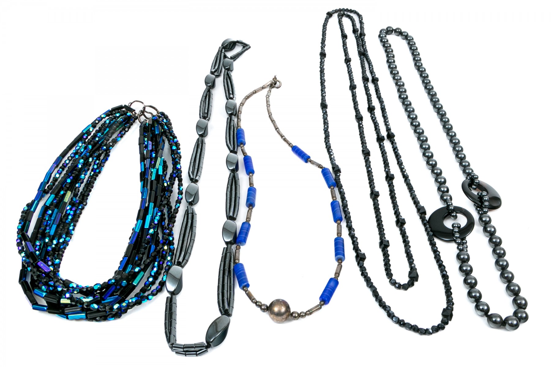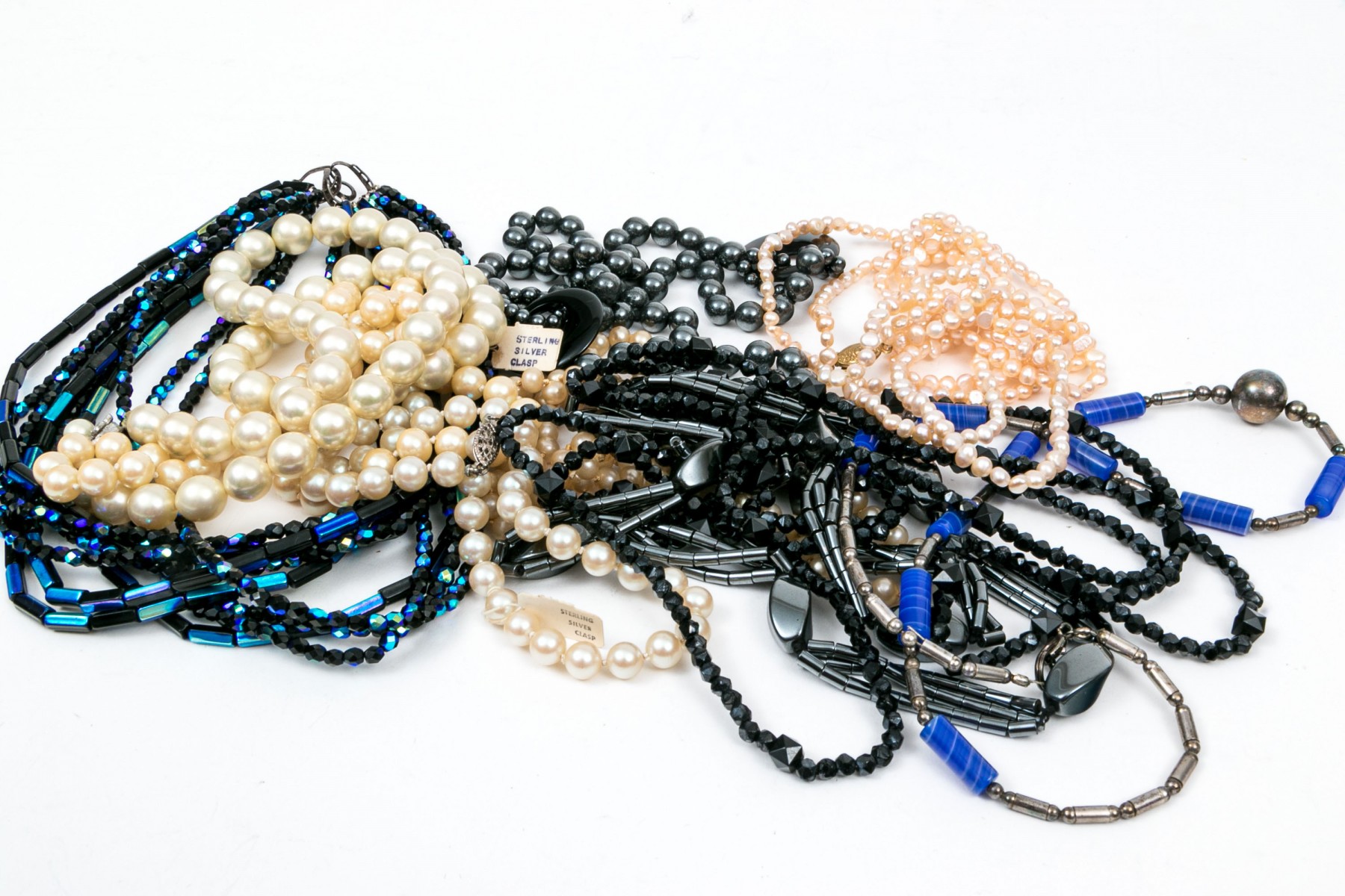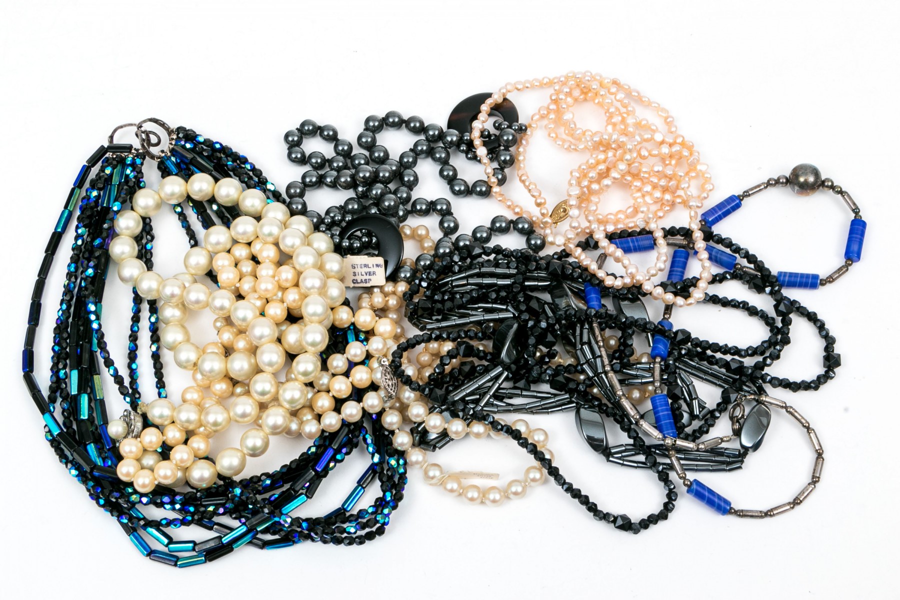 Eleven beaded necklaces. The collection included faux pearls, hematite, onyx and iridescent synthetic beads.