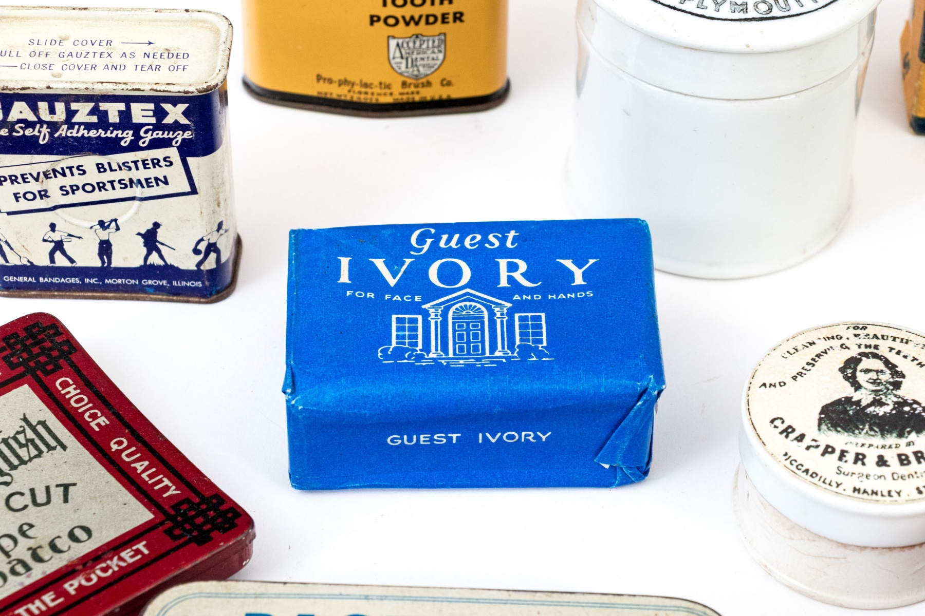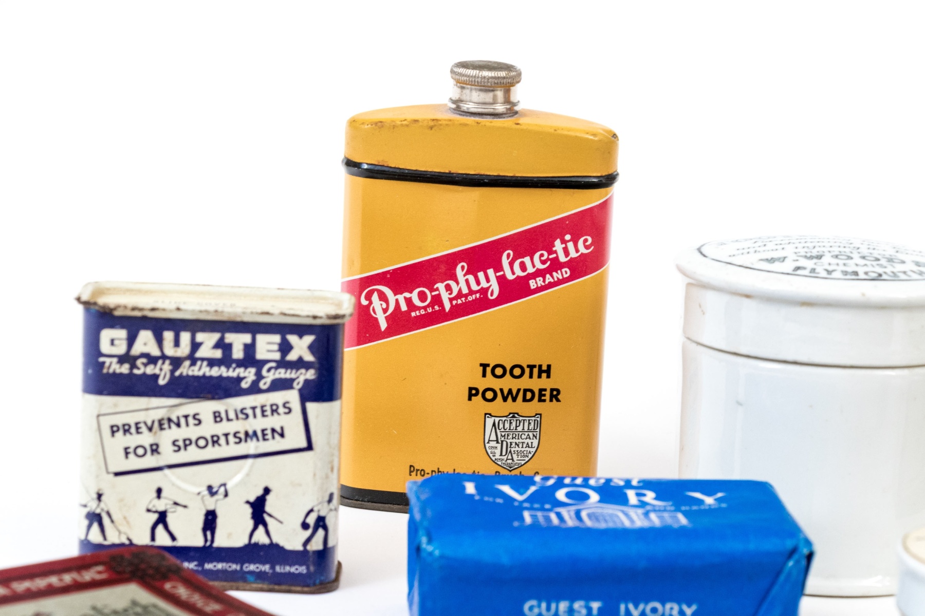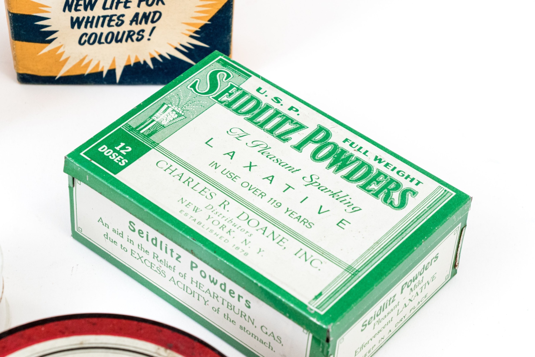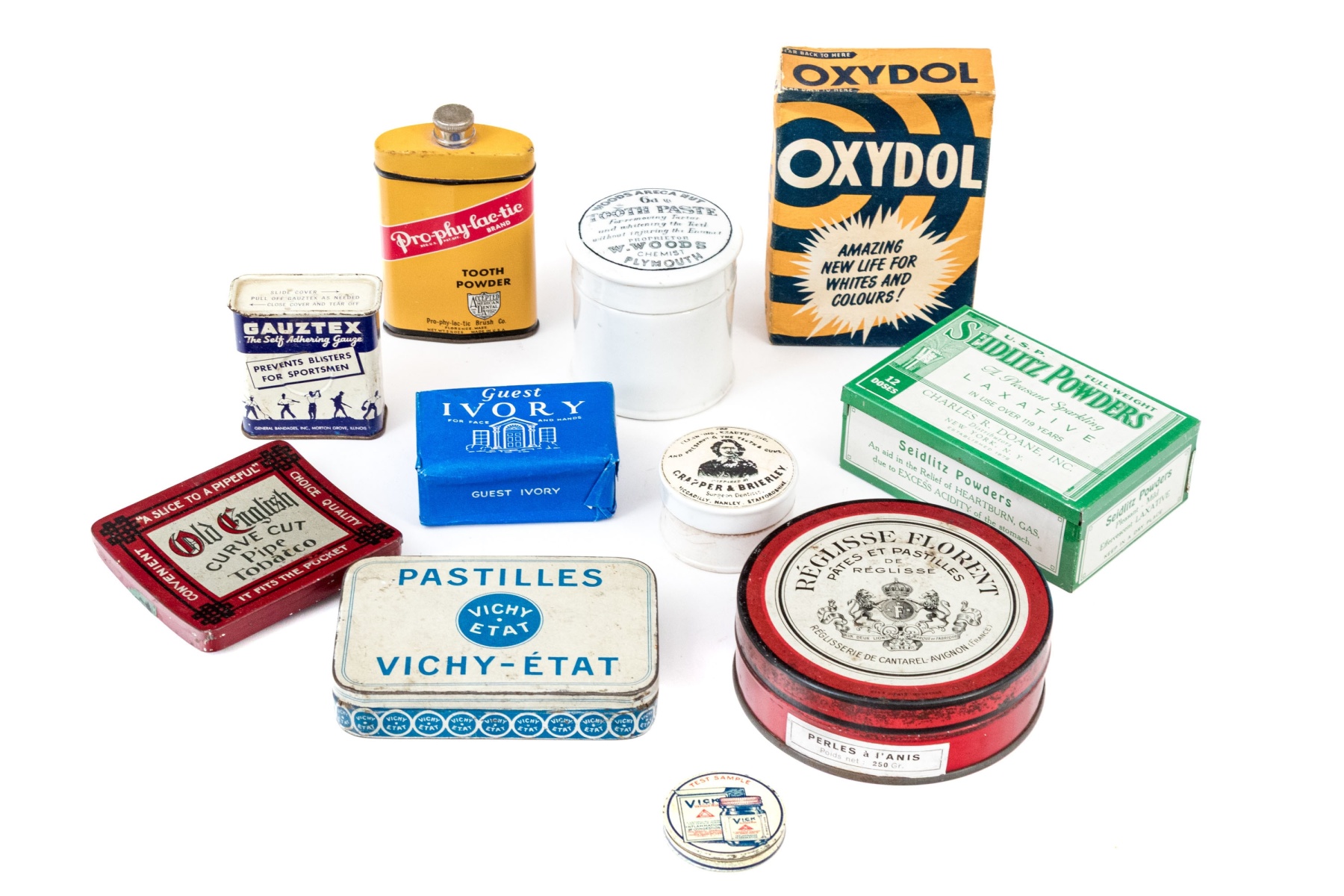 A wonderful variety of vintage vanity and bathroom items including Old English curve cut pipe tobacco, Gauztex, tooth powder and toothpaste, Oxydol, Seidlitz Powders and more.