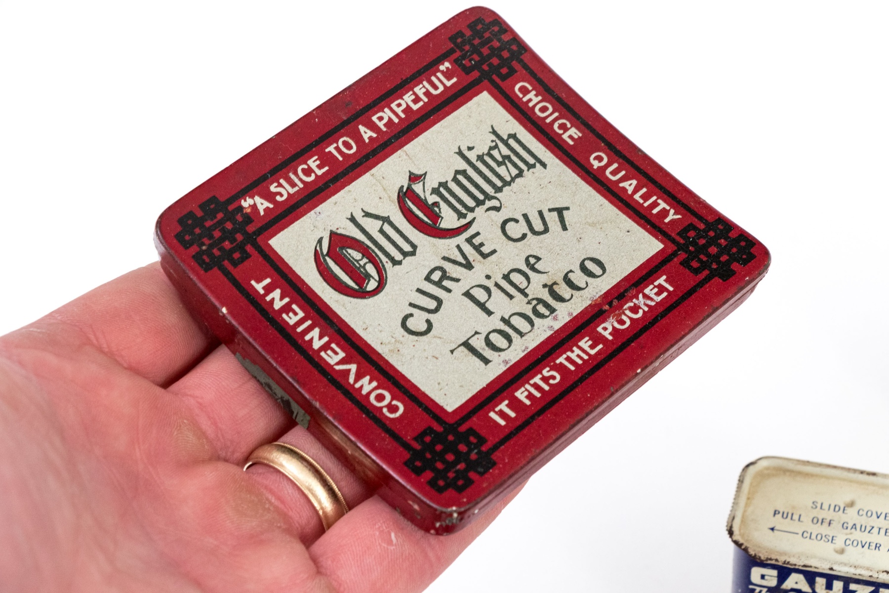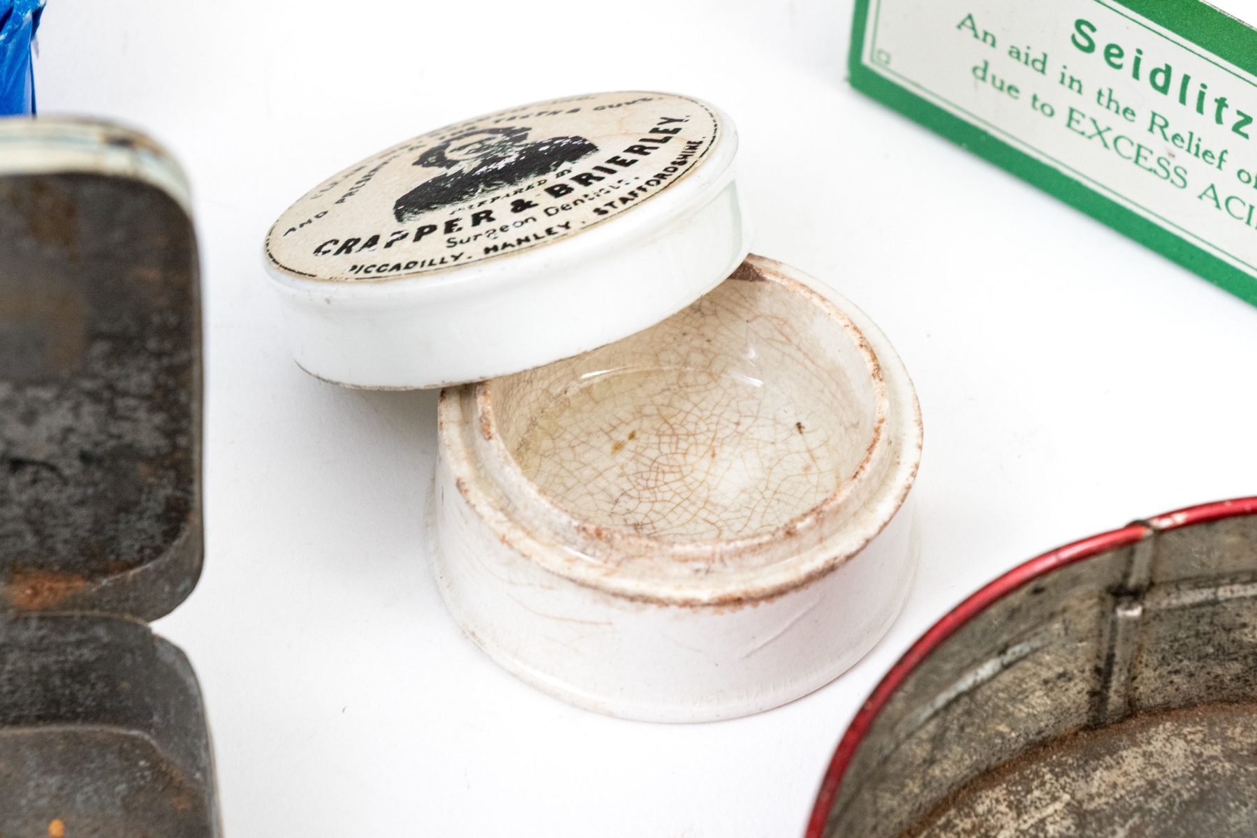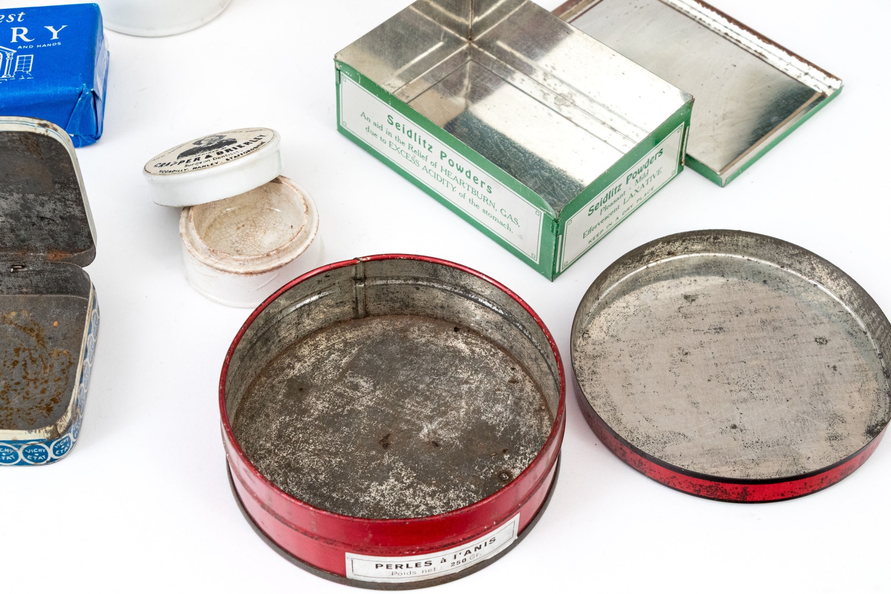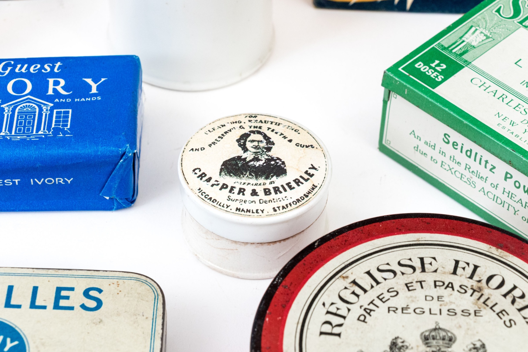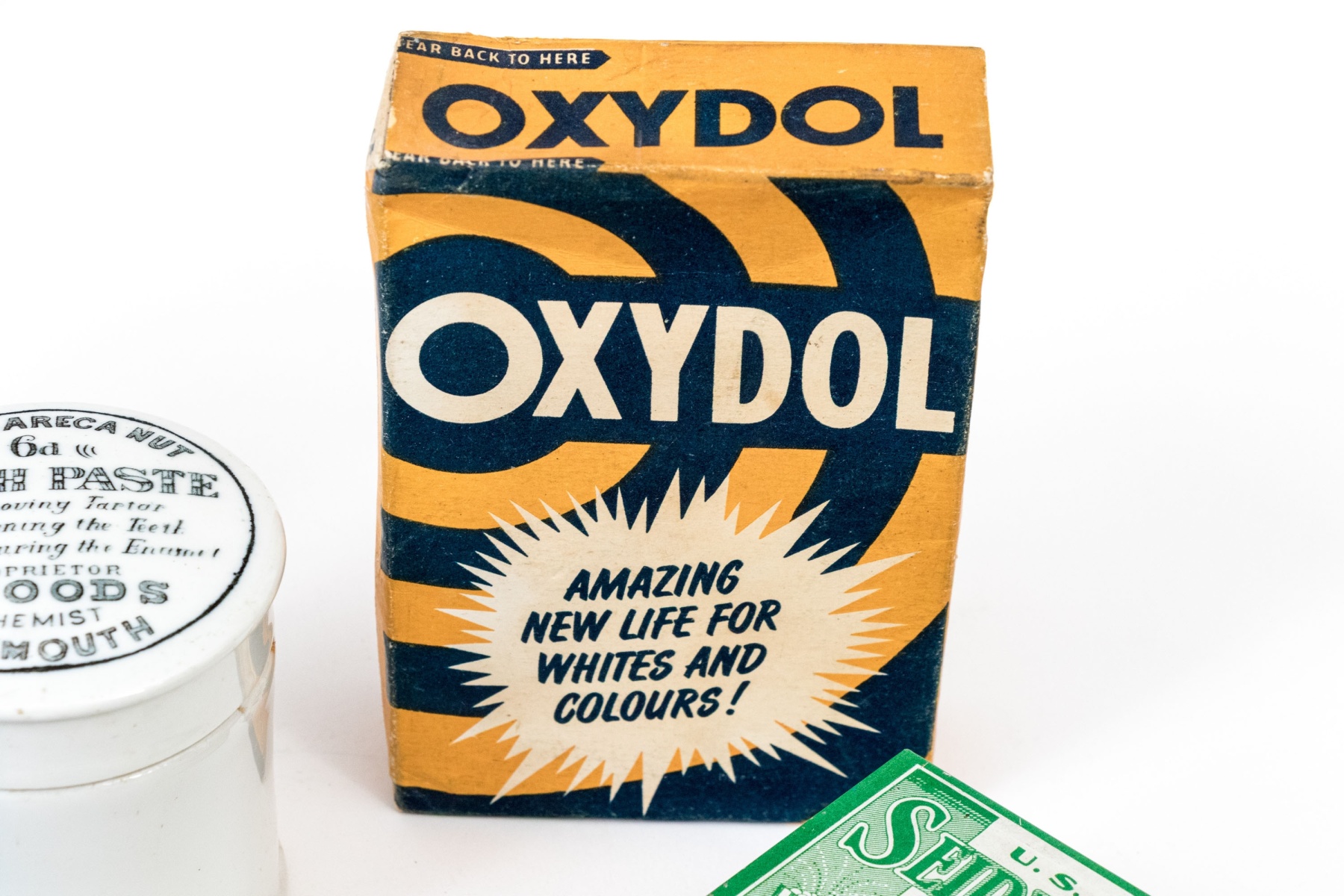 A wonderful variety of vintage vanity and bathroom items including Old English curve cut pipe tobacco, Gauztex, tooth powder and toothpaste, Oxydol, Seidlitz Powders and more.