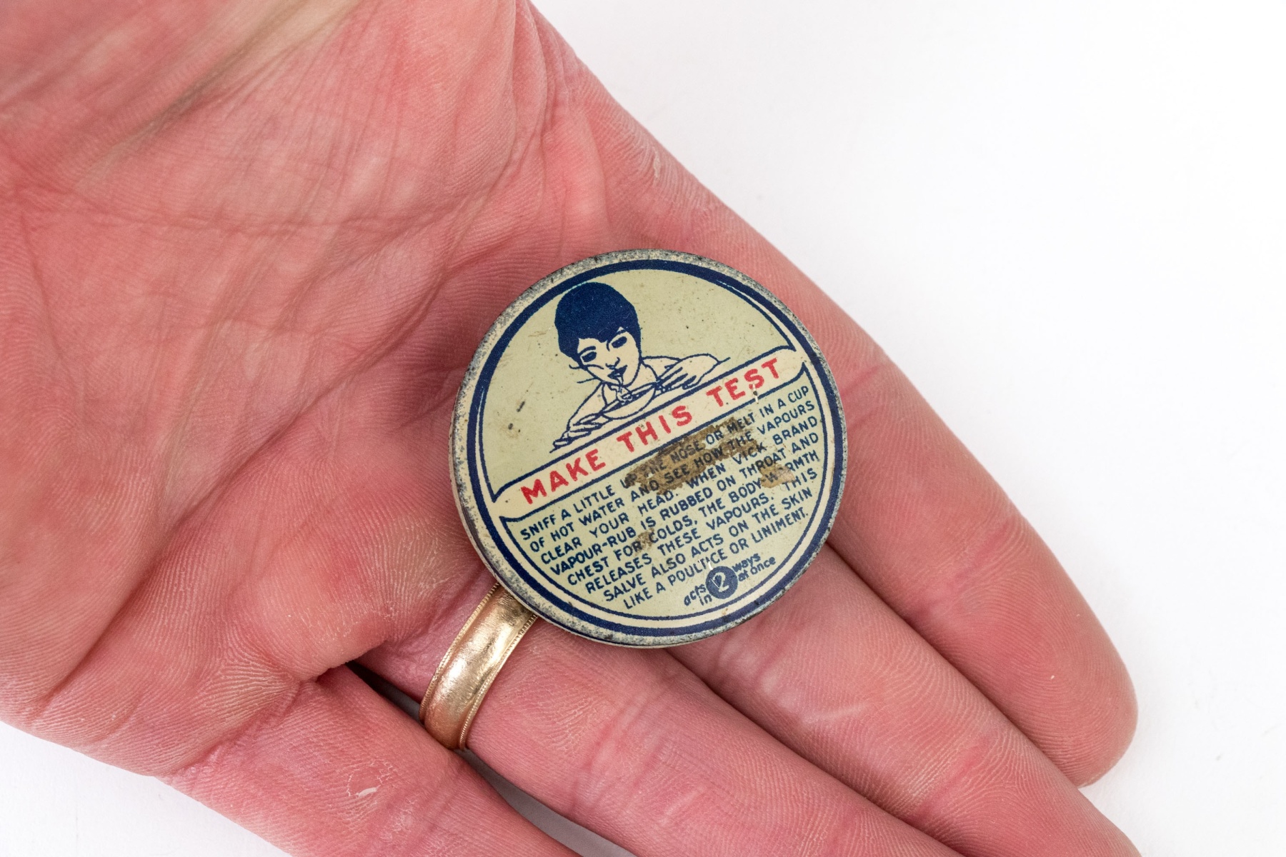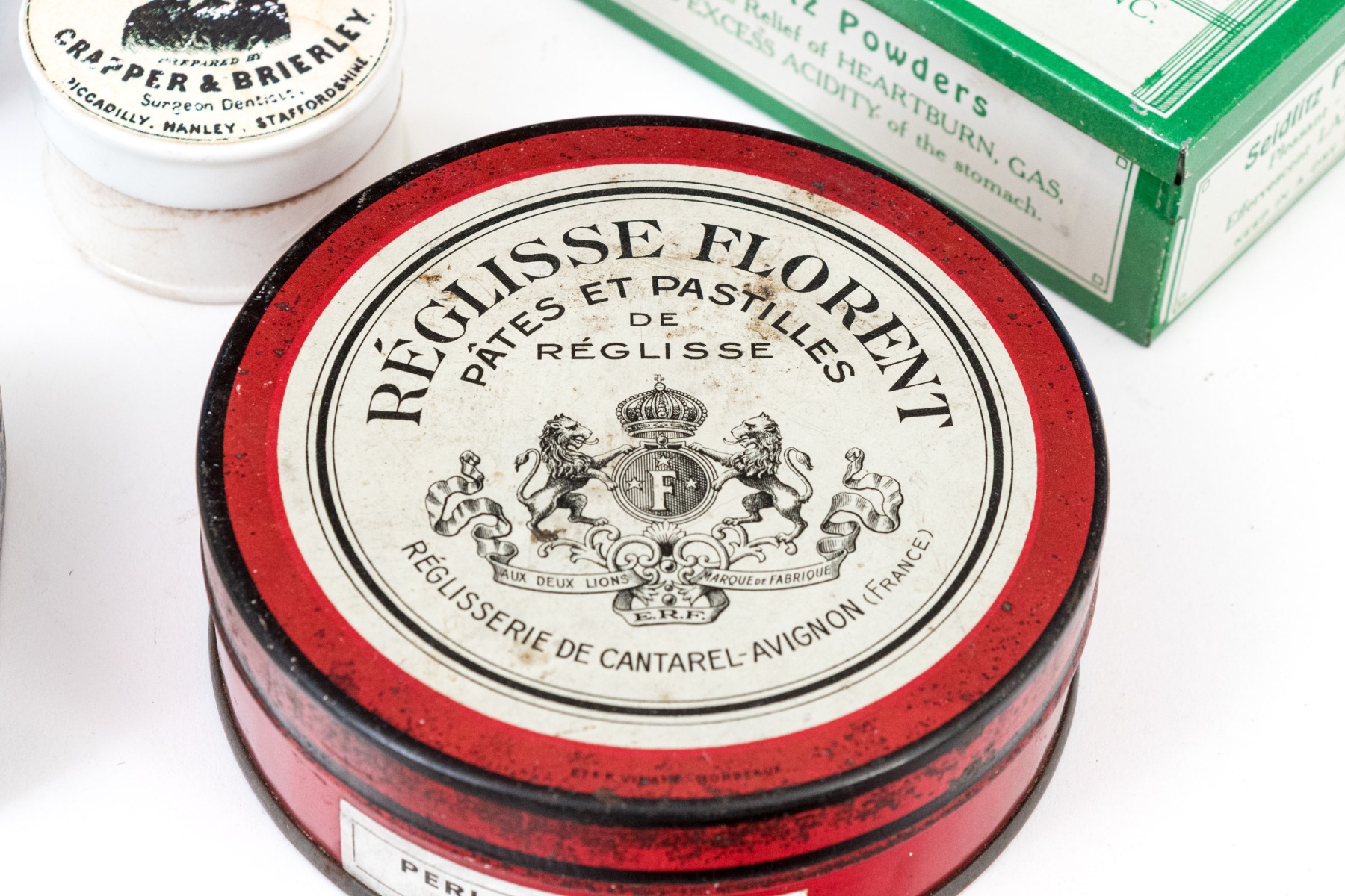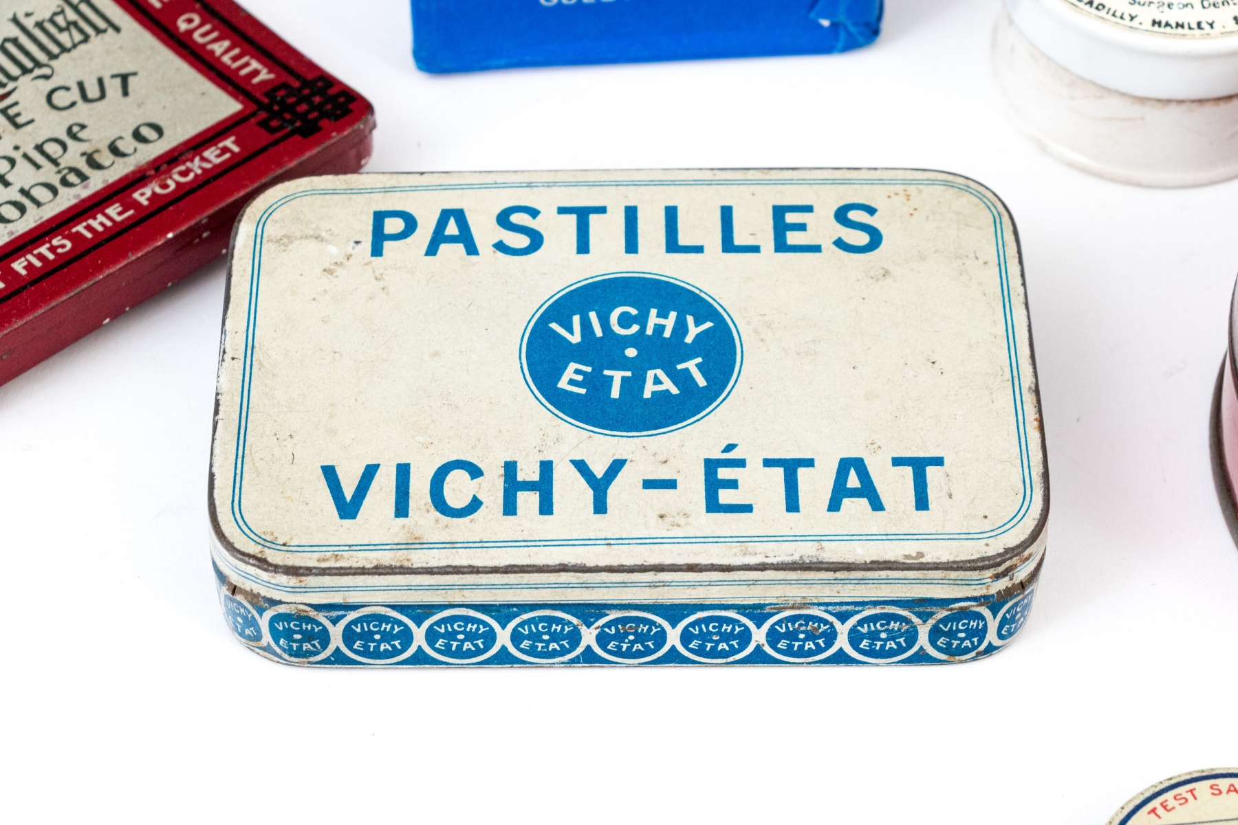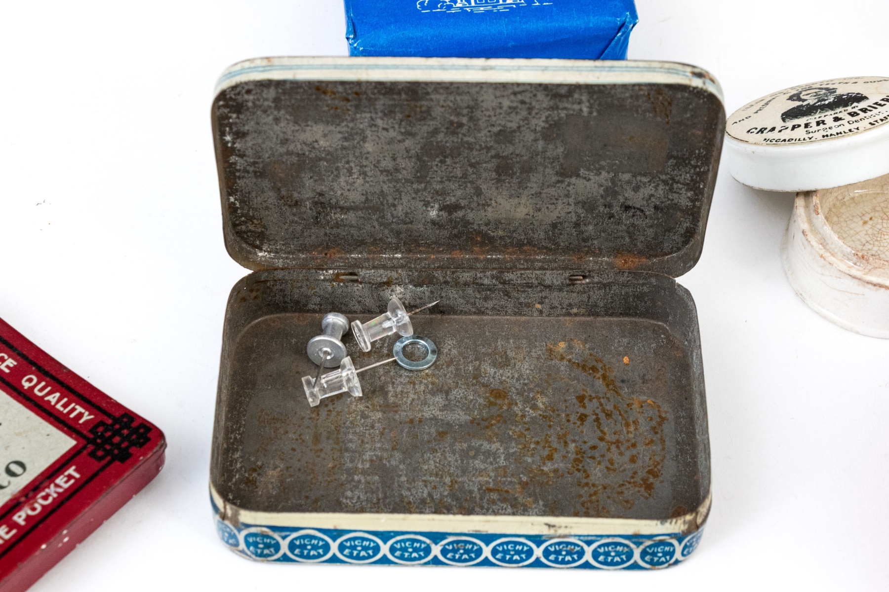 A wonderful variety of vintage vanity and bathroom items including Old English curve cut pipe tobacco, Gauztex, tooth powder and toothpaste, Oxydol, Seidlitz Powders and more.