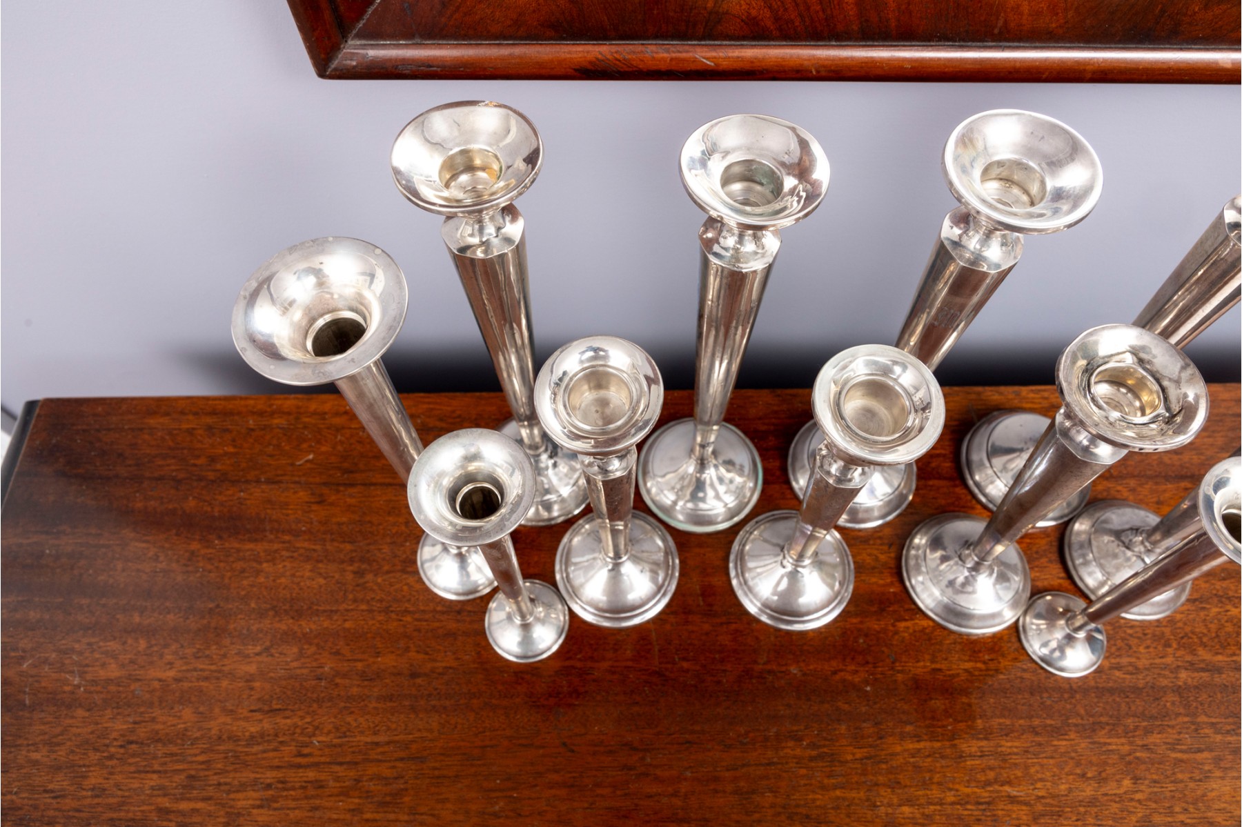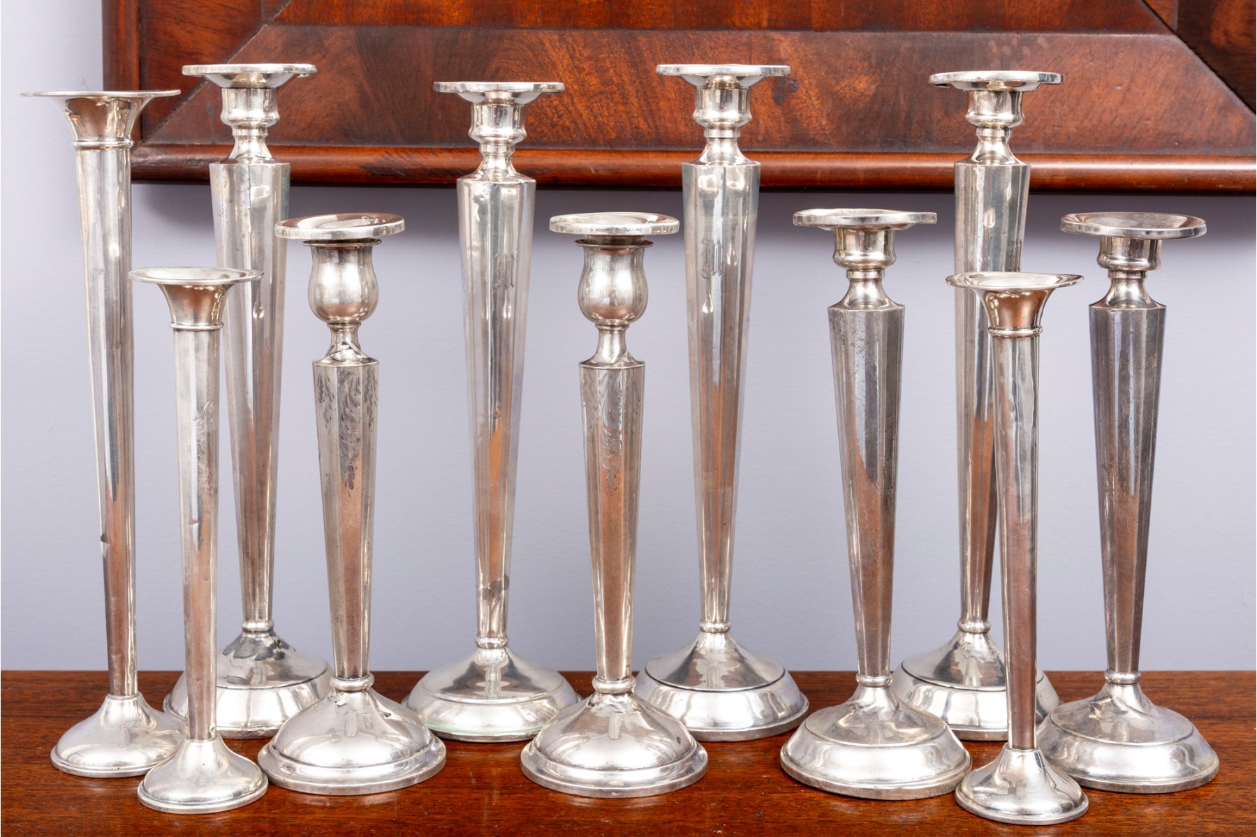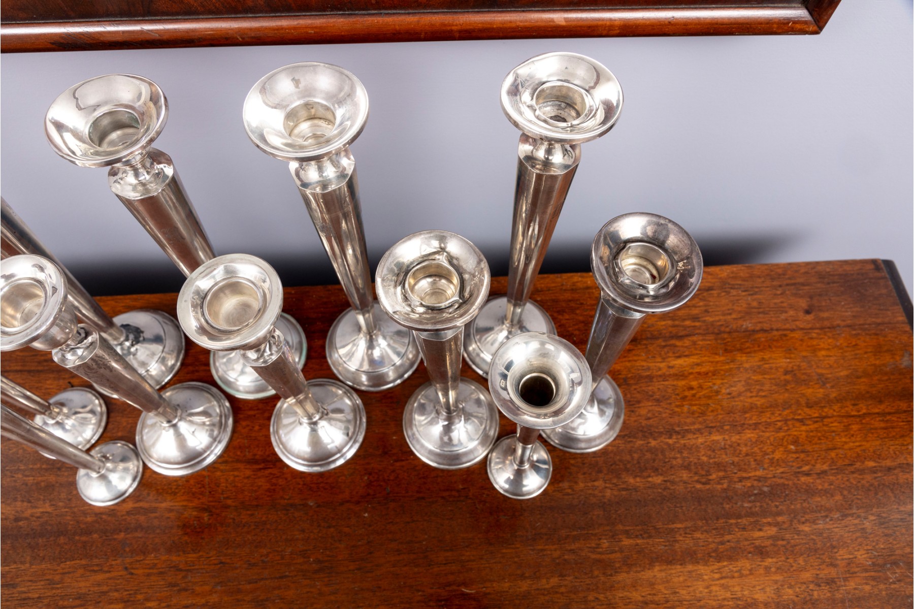 A lovely collection of weighted sterling candlesticks, including five pairs and one single. All with similar tapered profiles over circular bases.
