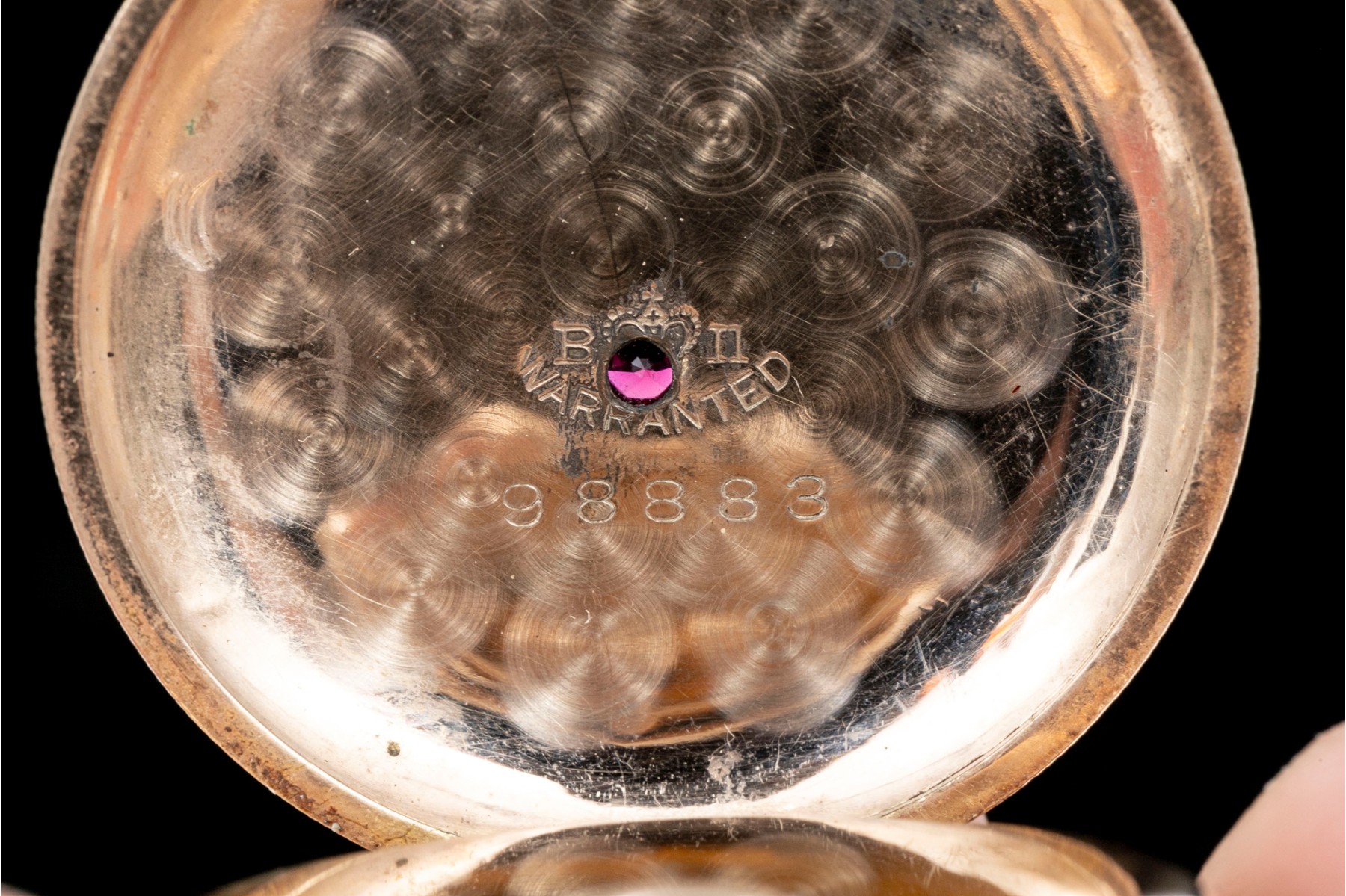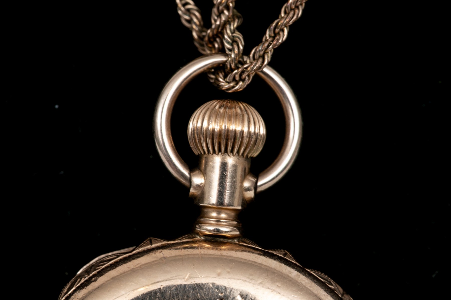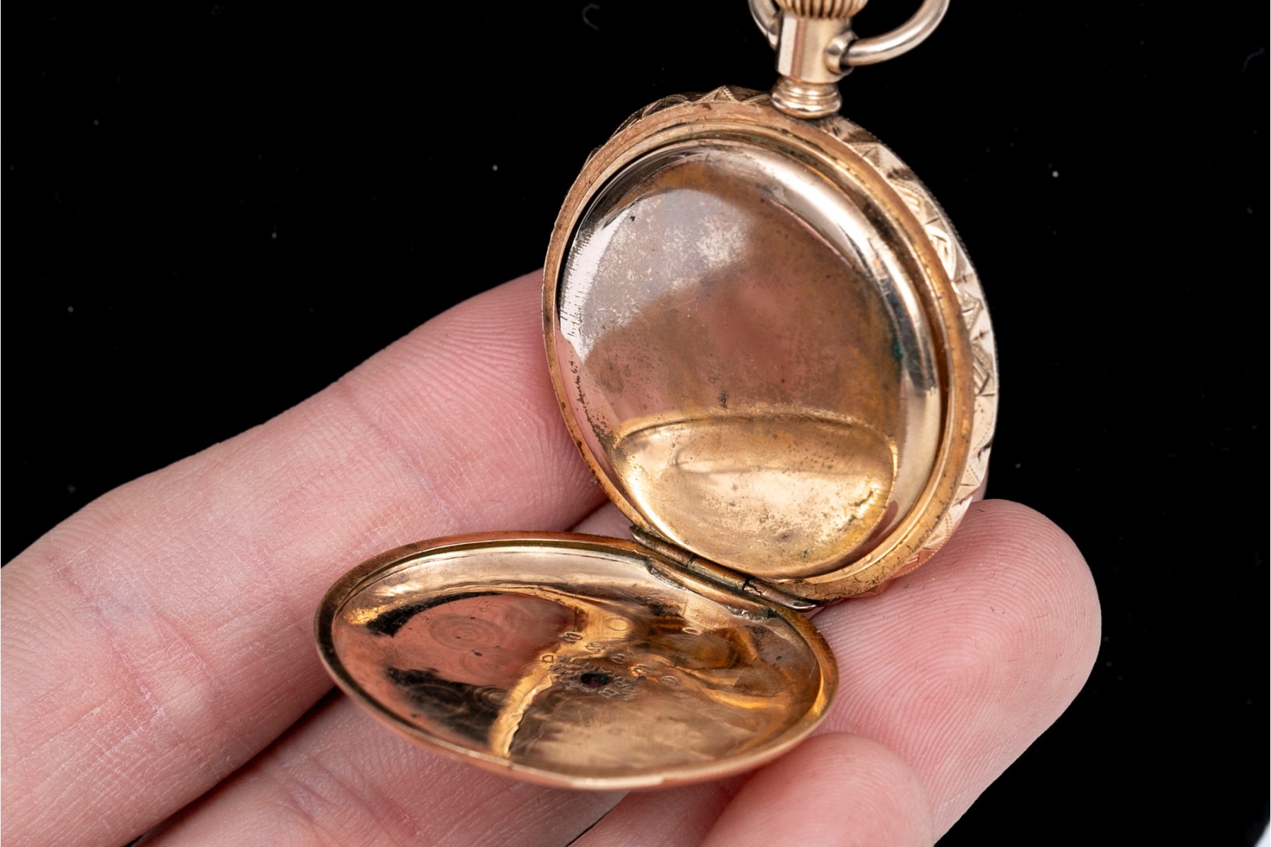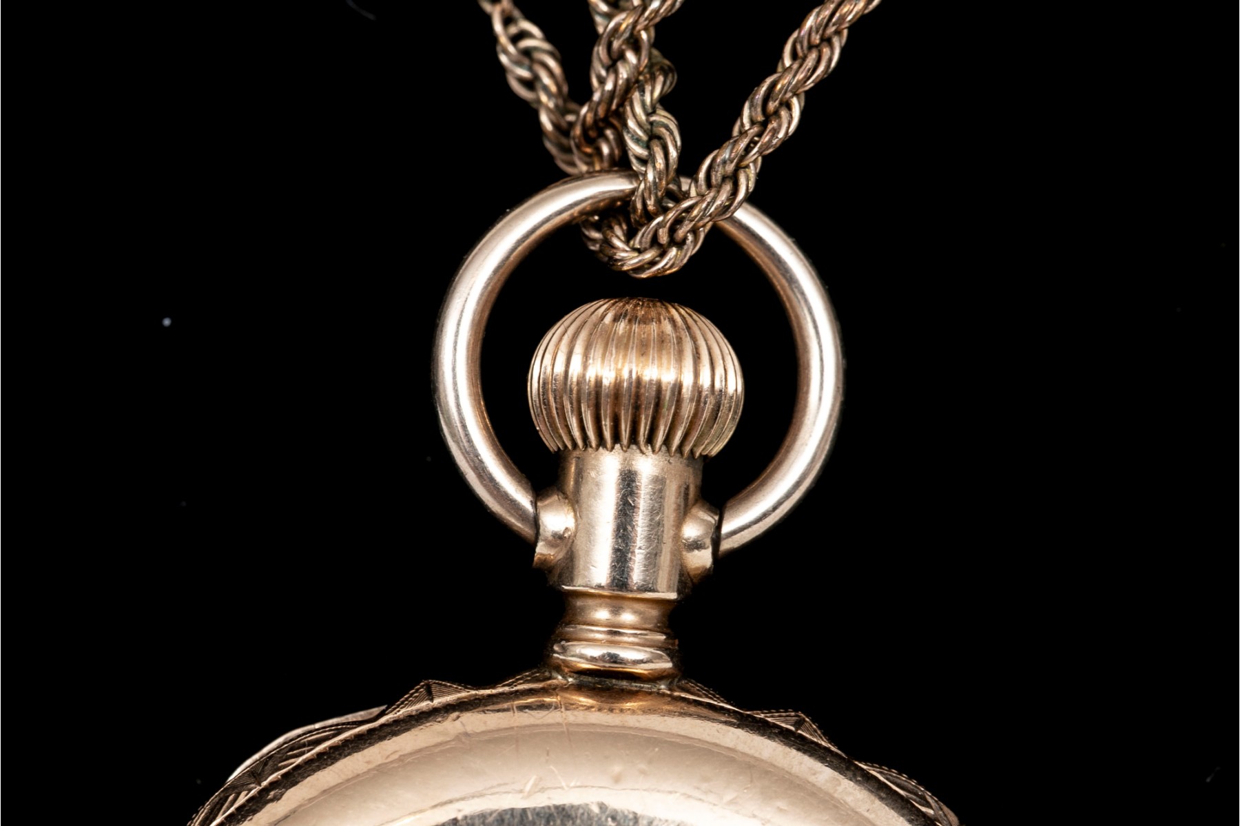 Elgin antique gold filled ornate hunter case pocketwatch, white dial, made circa 1891, model 1, grade 13, with synthetic ruby and gold filled watch chain