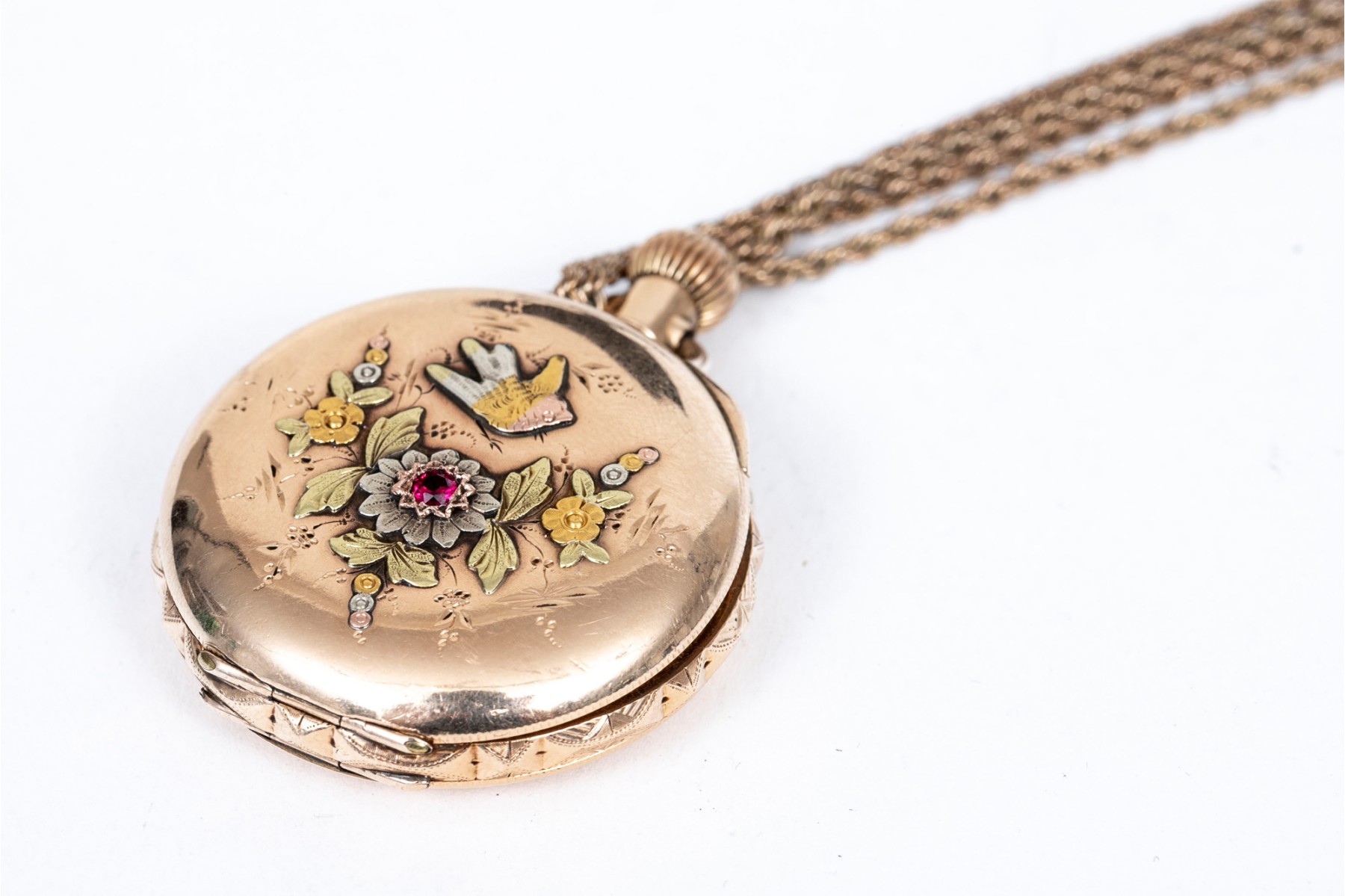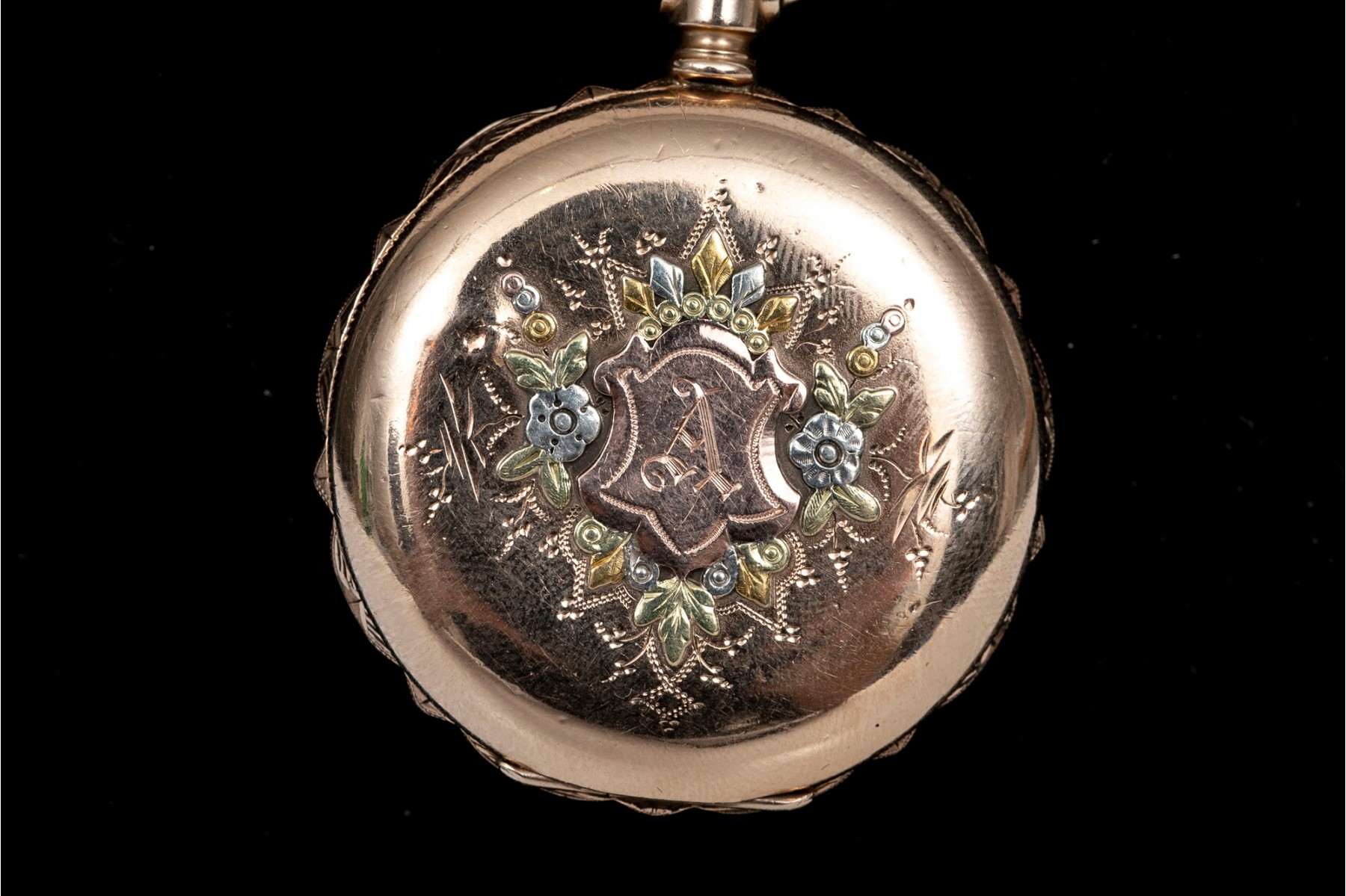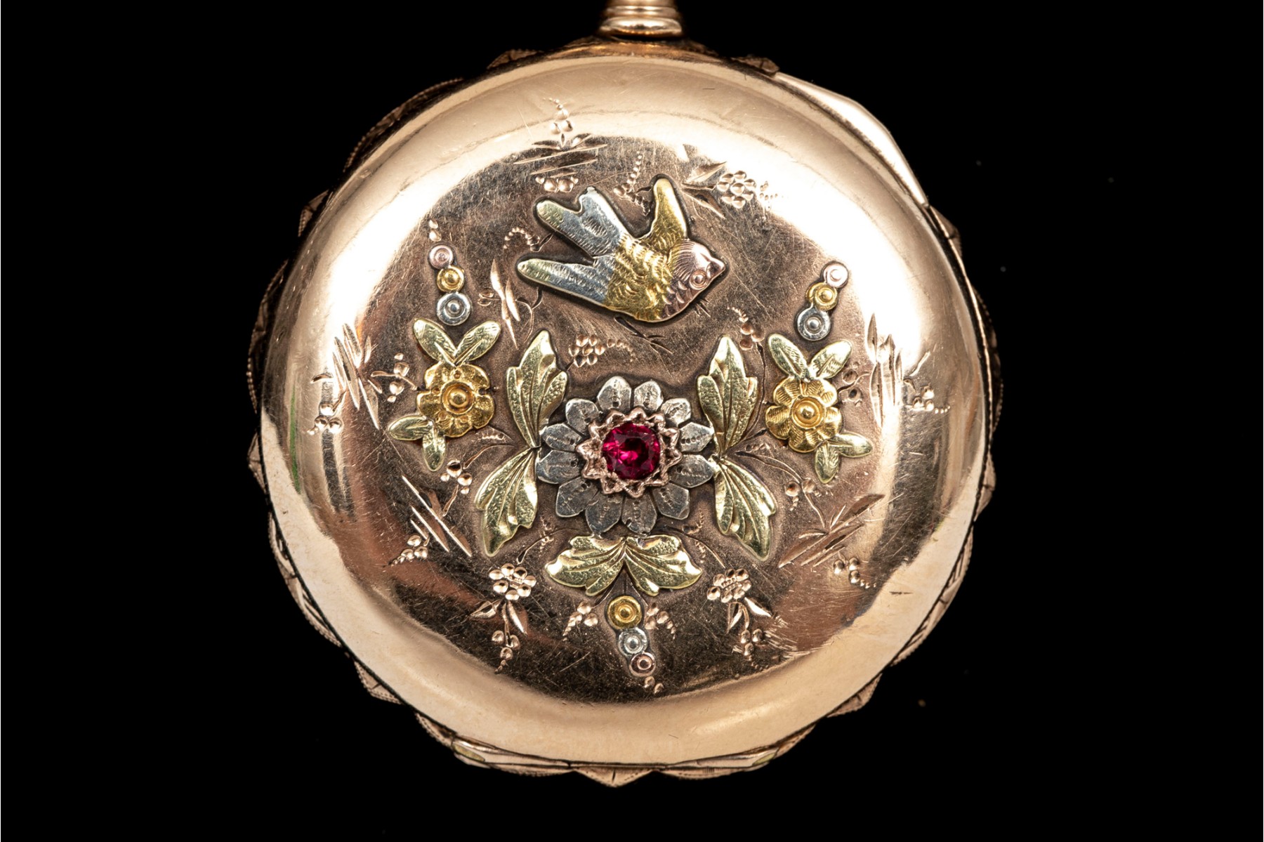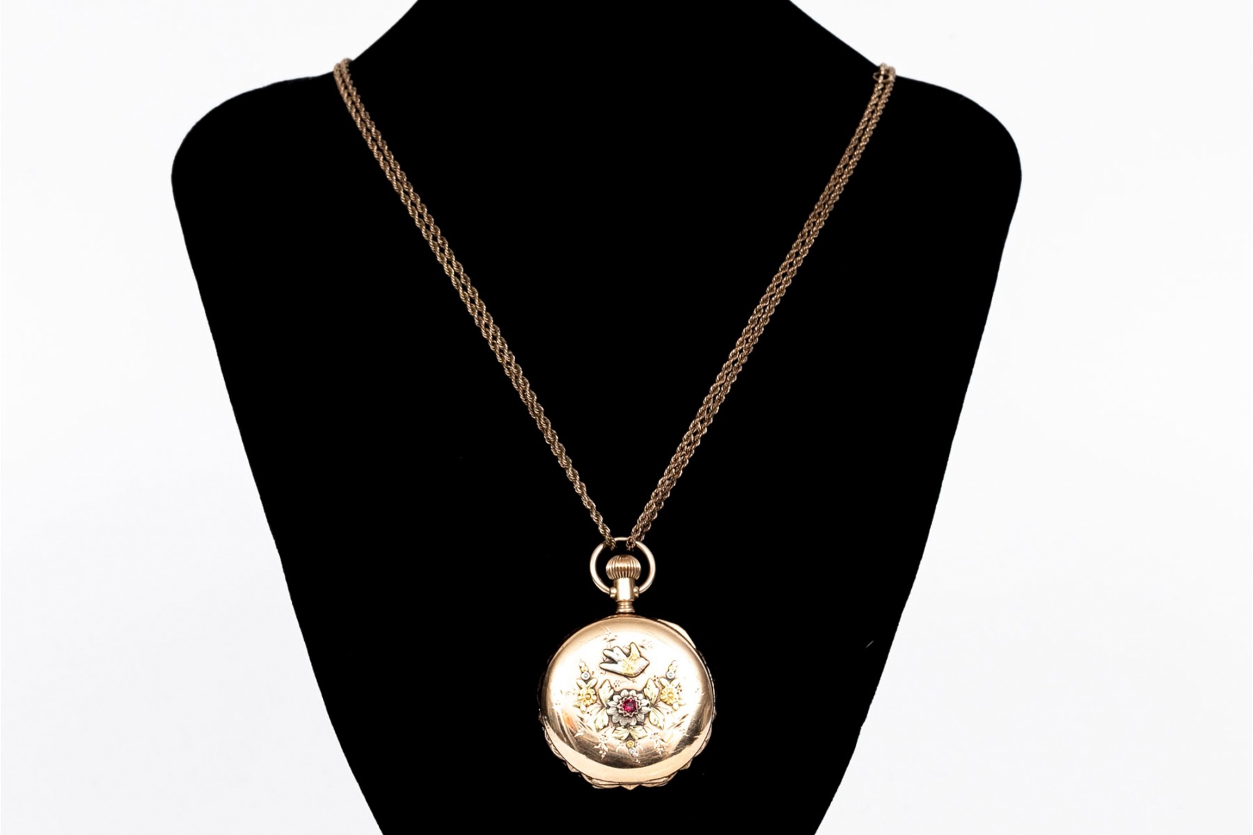 Elgin antique gold filled ornate hunter case pocketwatch, white dial, made circa 1891, model 1, grade 13, with synthetic ruby and gold filled watch chain