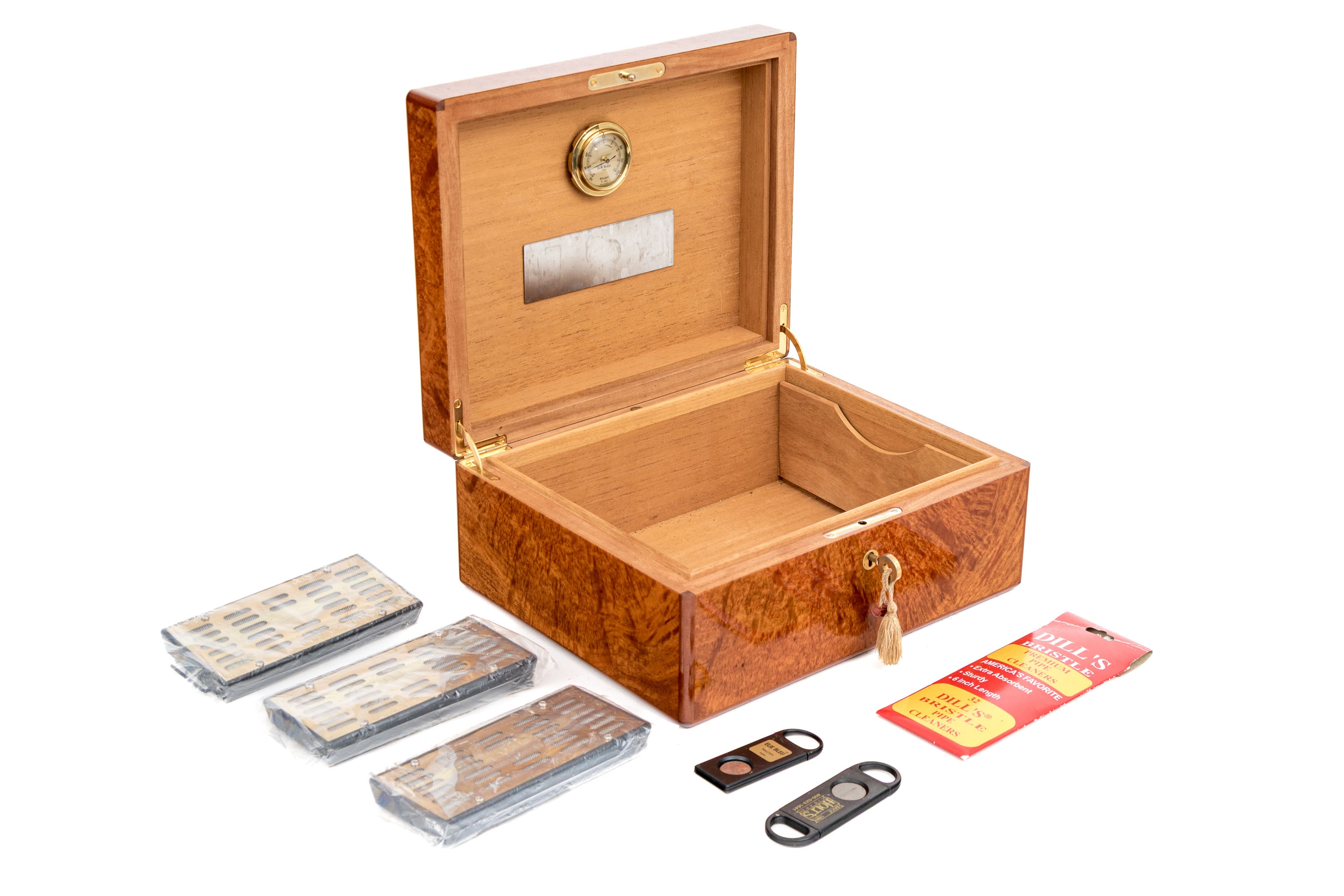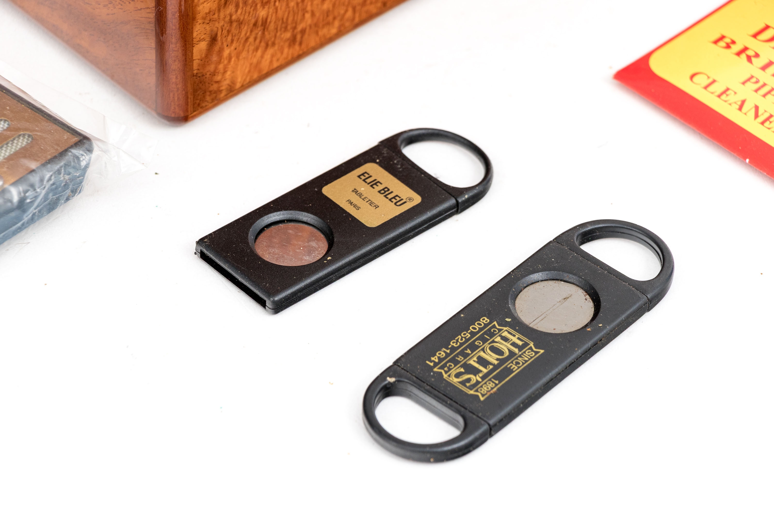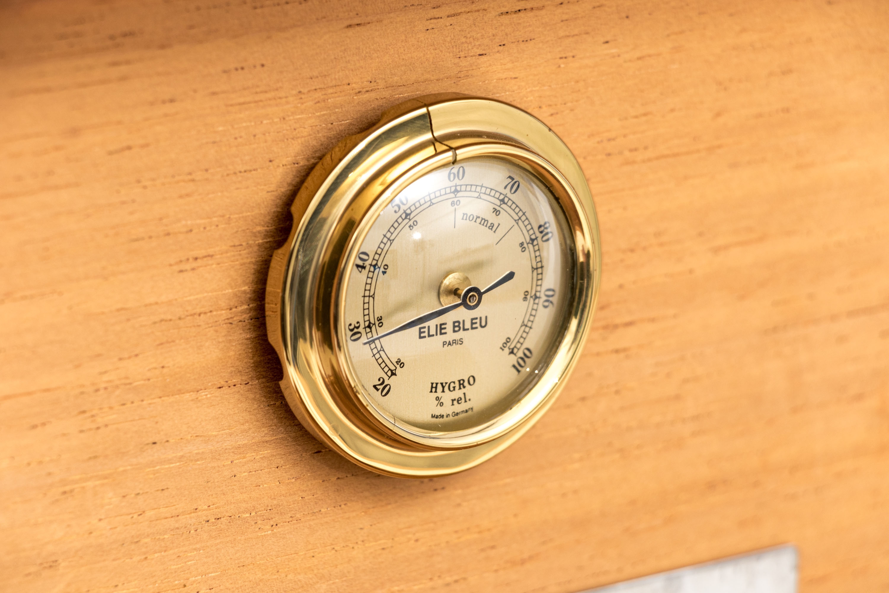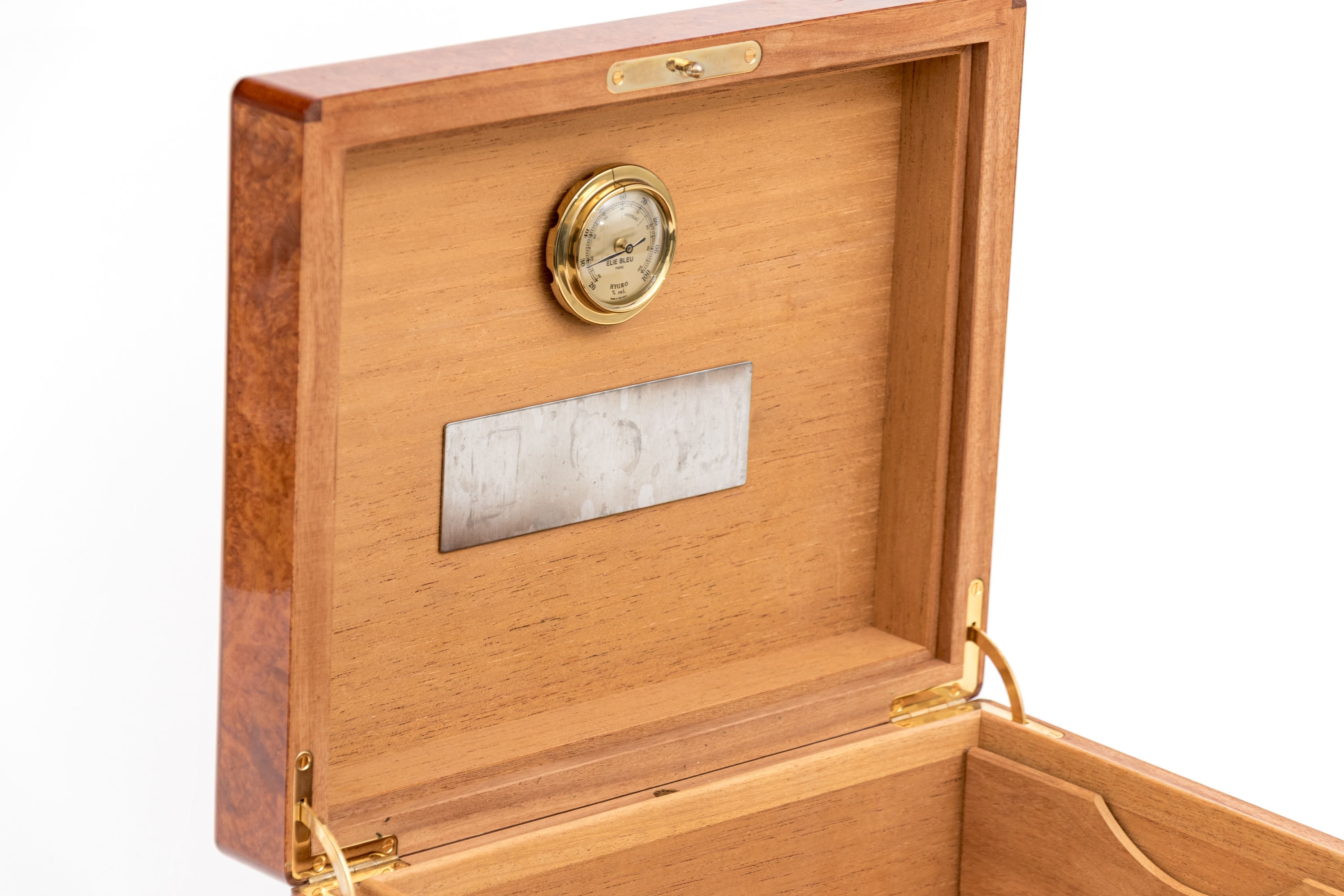 A fabulous Elie Bleu cigar humidor box with a gorgeous veneered exterior in richly hued, medium brown wood. The hinged lid opens to a spacious interior with a hygrometer on the inner lid. Includes three humidor humidifiers, two guillotine cutters, and a pack of Dill's bristle pipe cleaners.