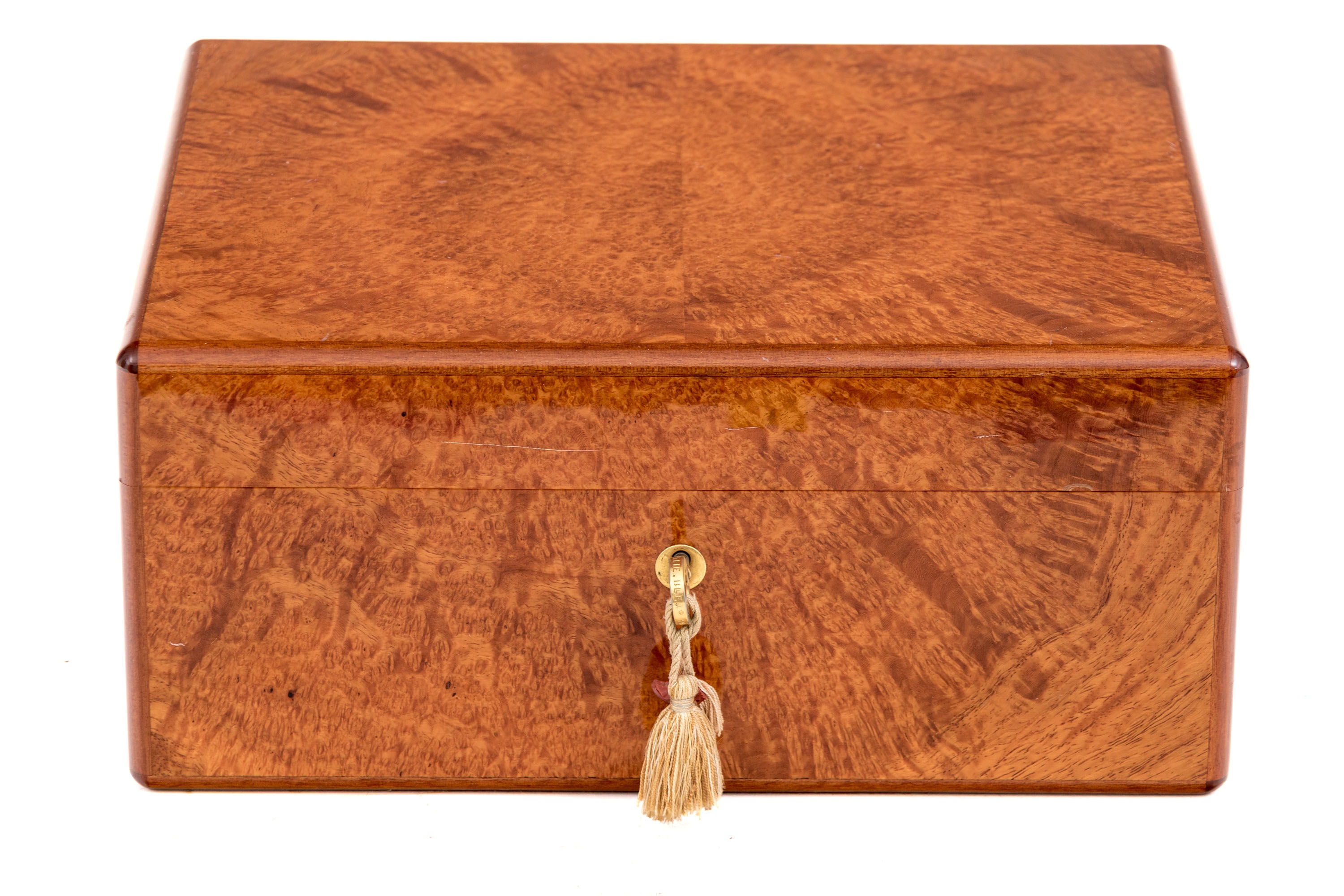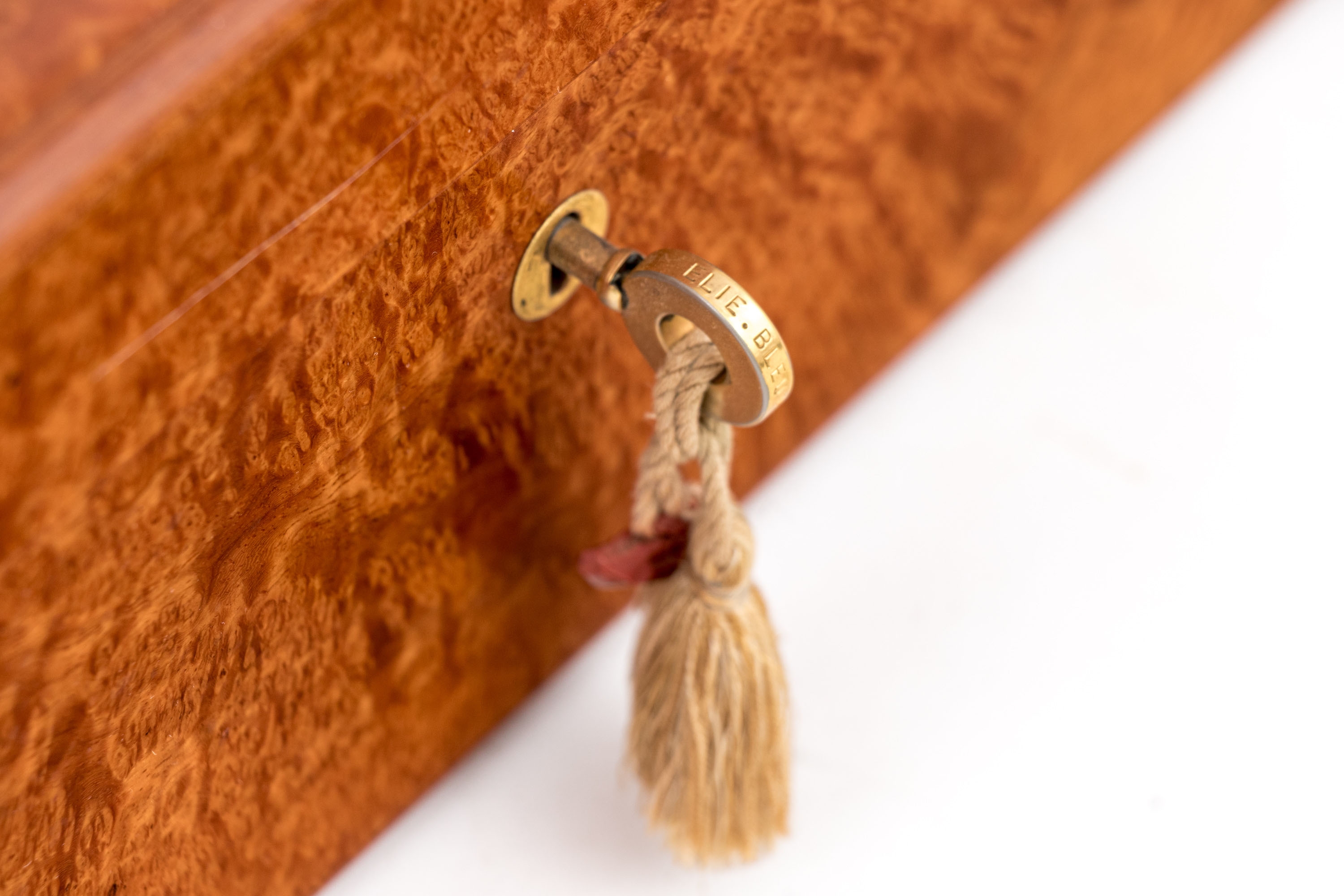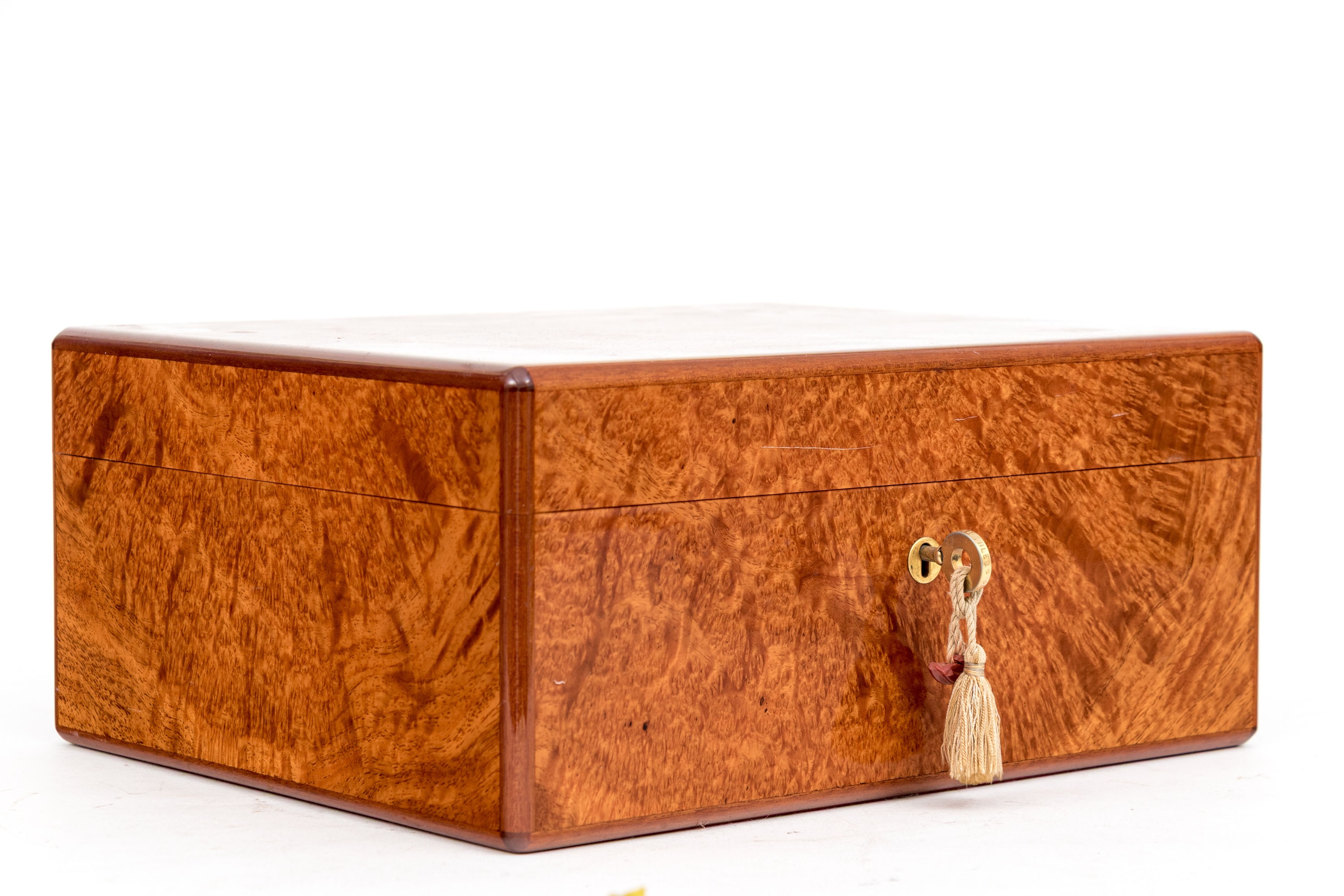 A fabulous Elie Bleu cigar humidor box with a gorgeous veneered exterior in richly hued, medium brown wood. The hinged lid opens to a spacious interior with a hygrometer on the inner lid. Includes three humidor humidifiers, two guillotine cutters, and a pack of Dill's bristle pipe cleaners.