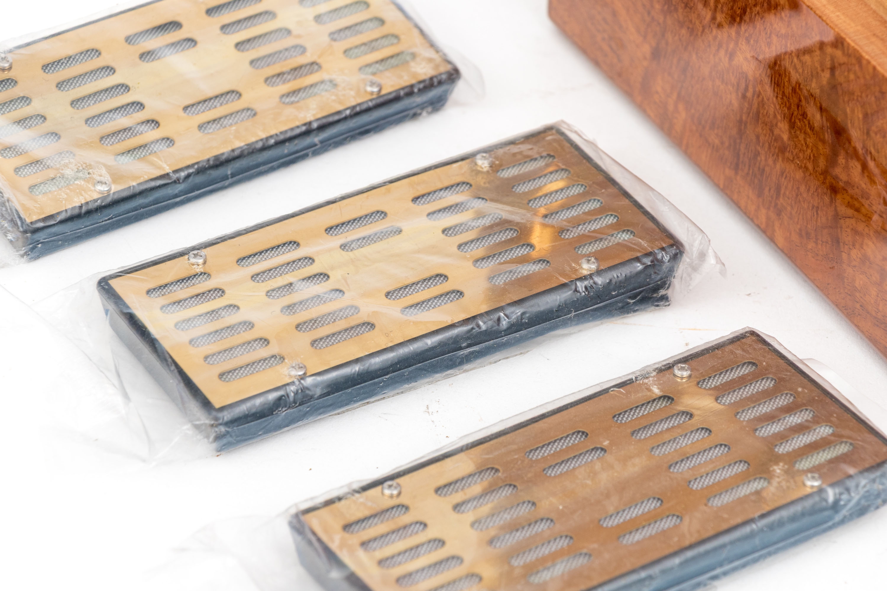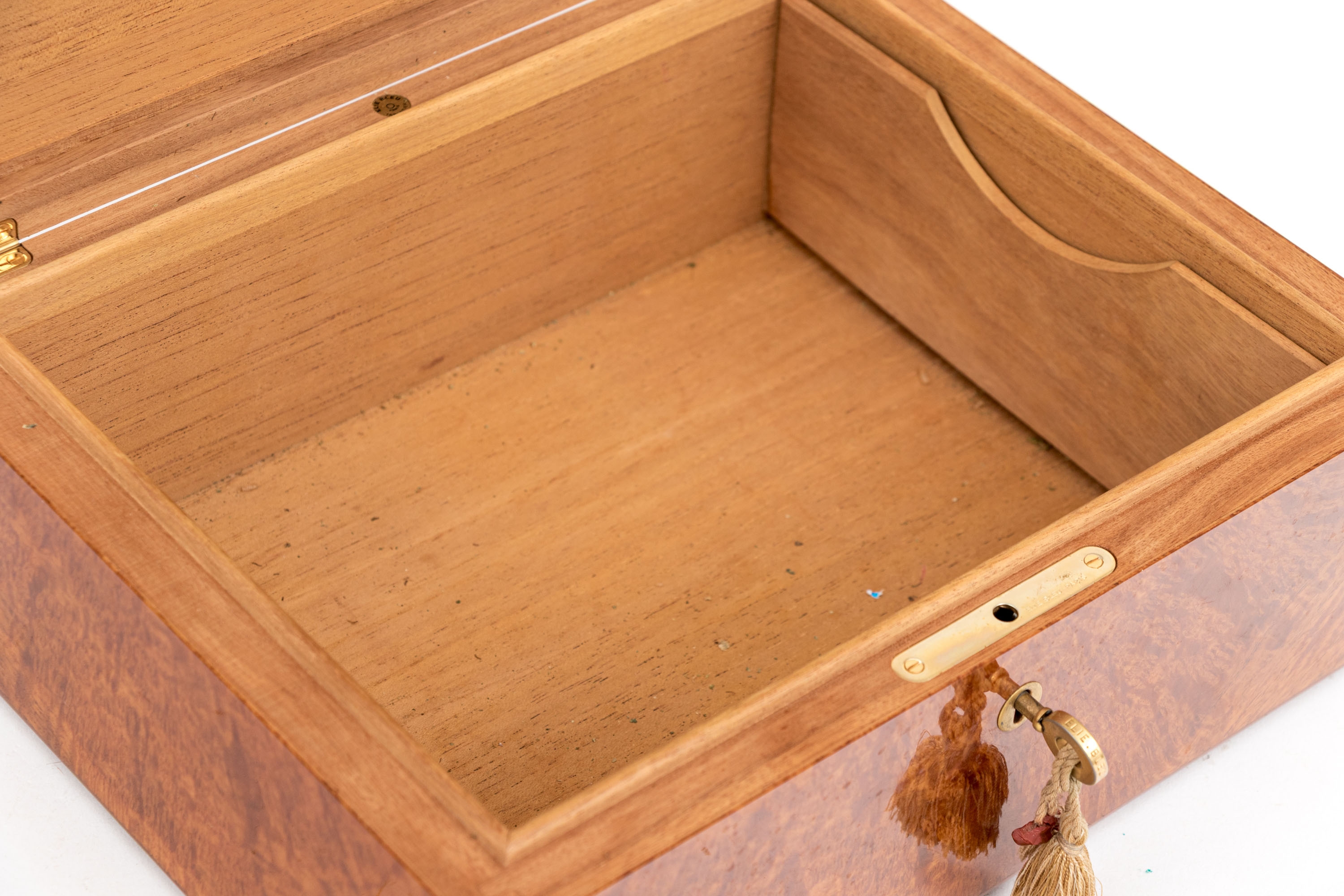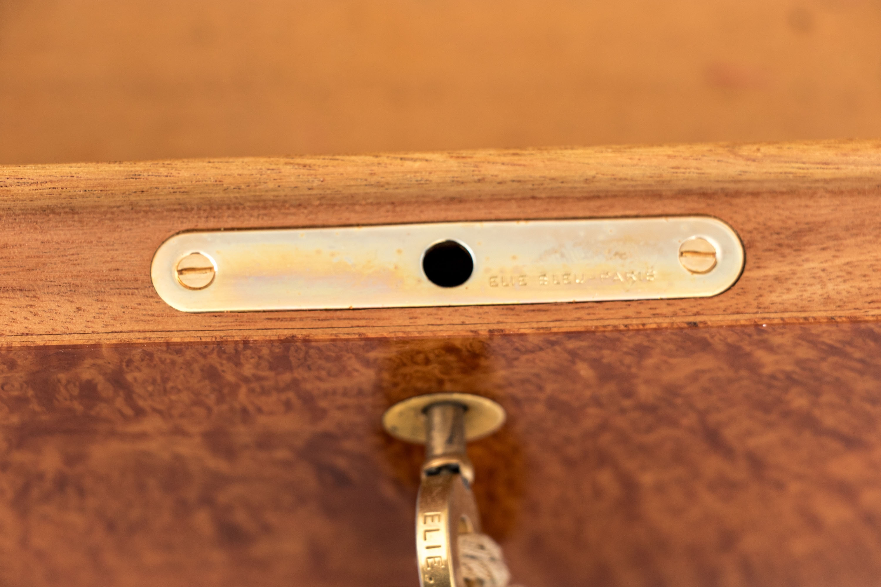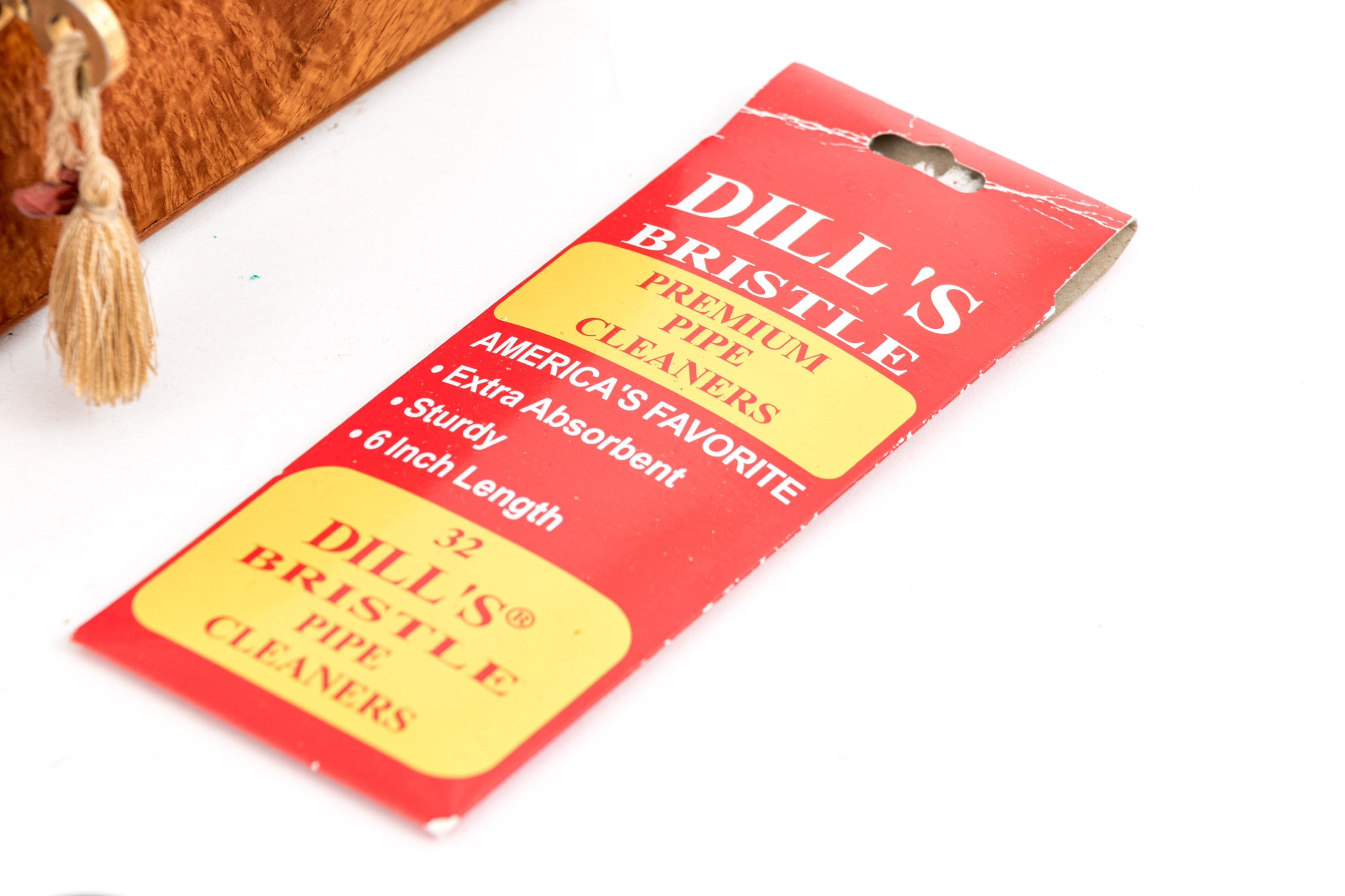 A fabulous Elie Bleu cigar humidor box with a gorgeous veneered exterior in richly hued, medium brown wood. The hinged lid opens to a spacious interior with a hygrometer on the inner lid. Includes three humidor humidifiers, two guillotine cutters, and a pack of Dill's bristle pipe cleaners.