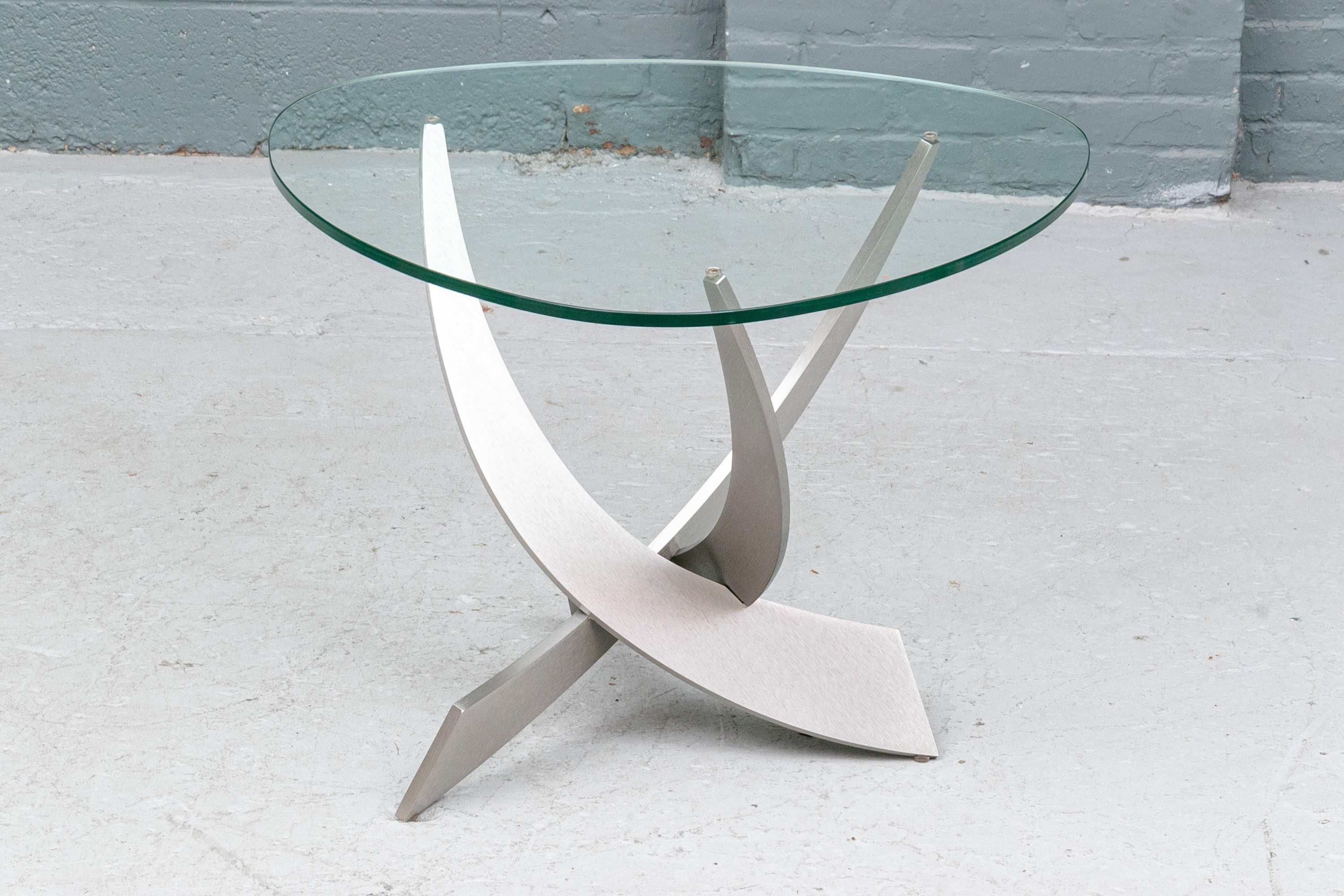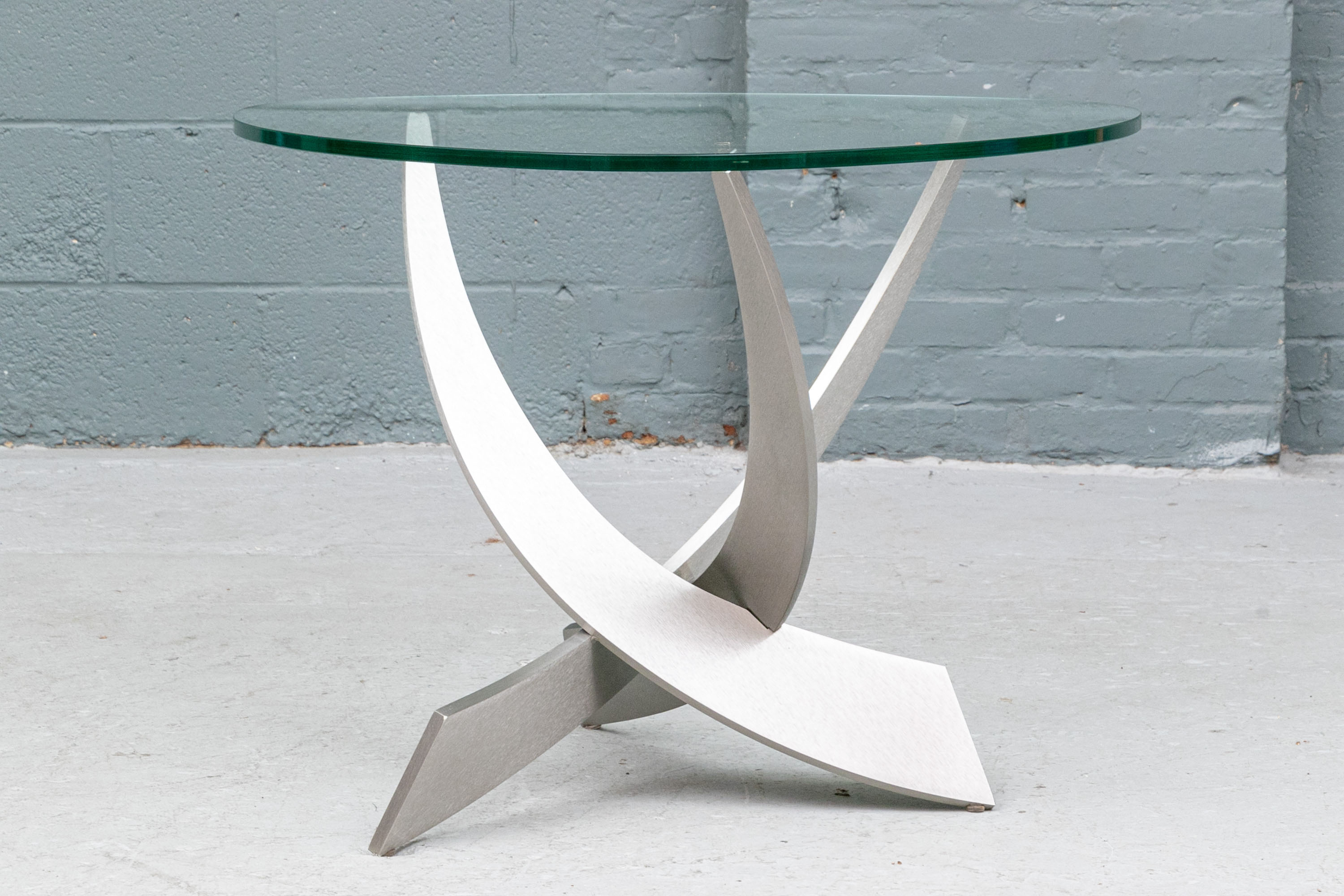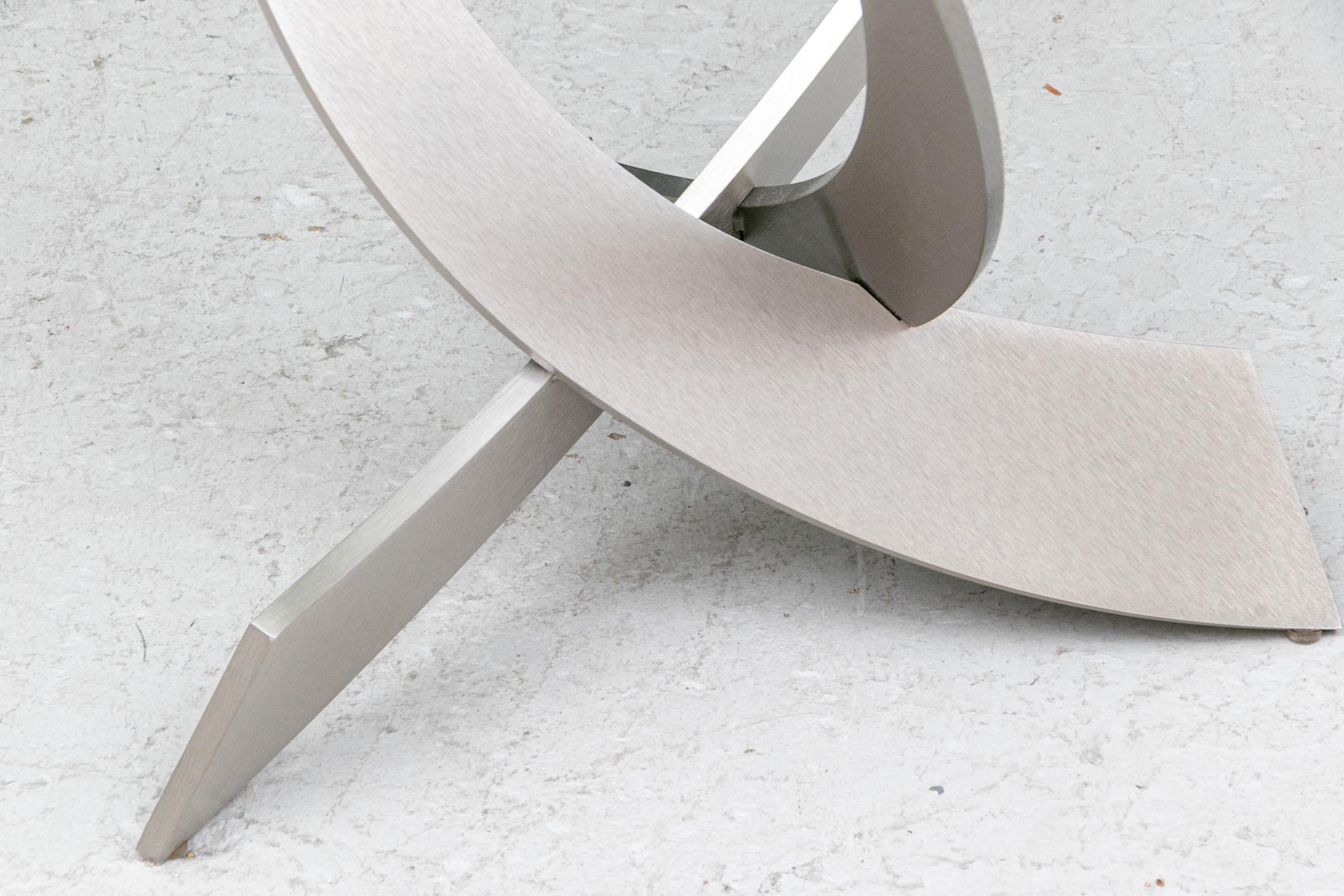 Constructed from thick solid steel with a lustrous champagne-plated finish, this elegant design mimics a piece of between sculpture rather than furniture. The table features three interlocking arms, reaching up to support the glass top, which is softly contoured to suggest gently worn sea stones after their Reef Collection, designed by Carl Muller.