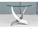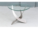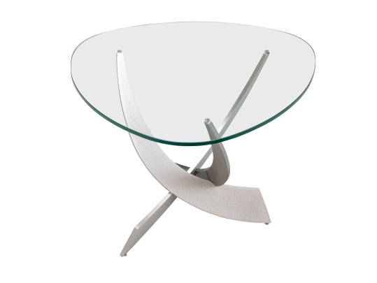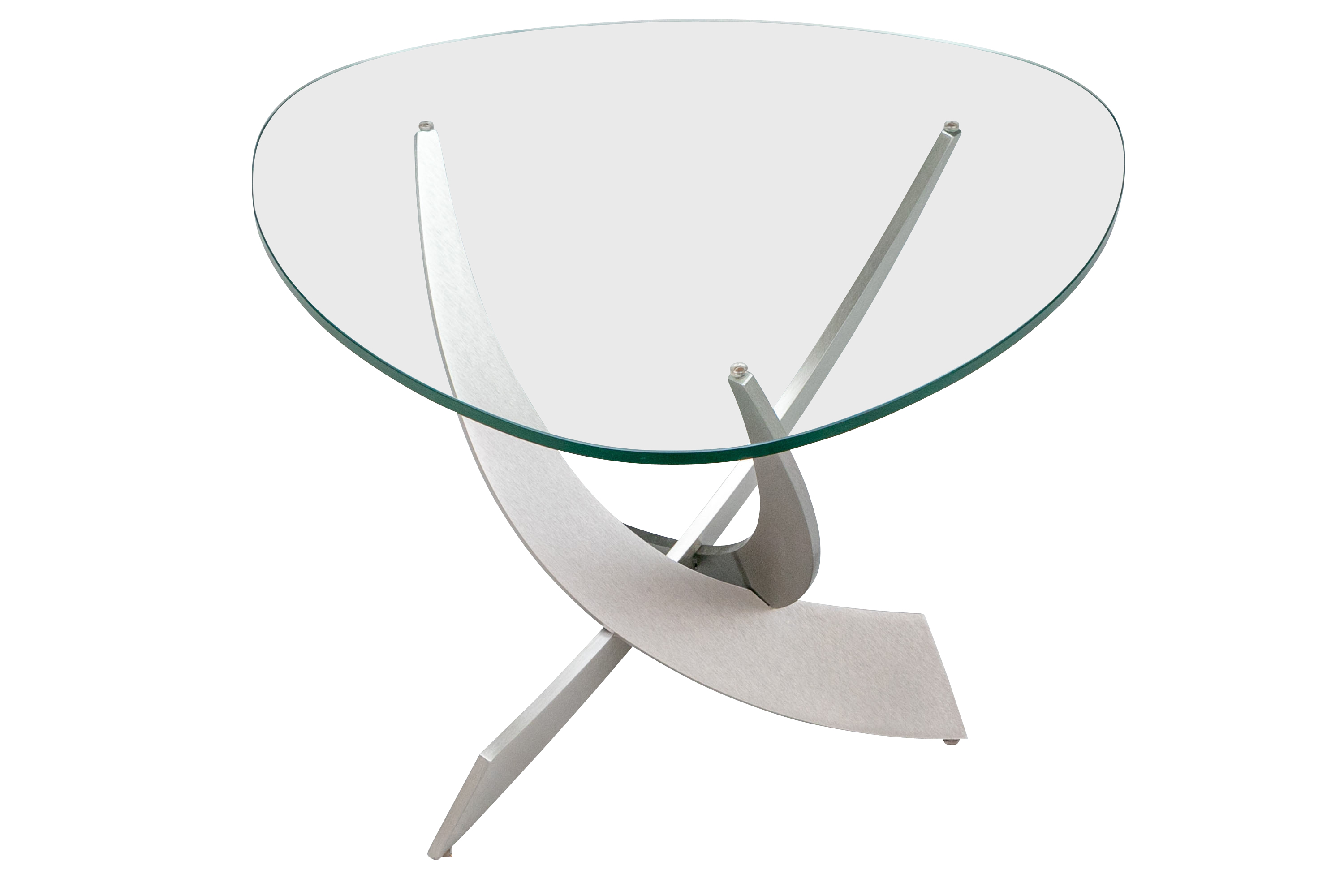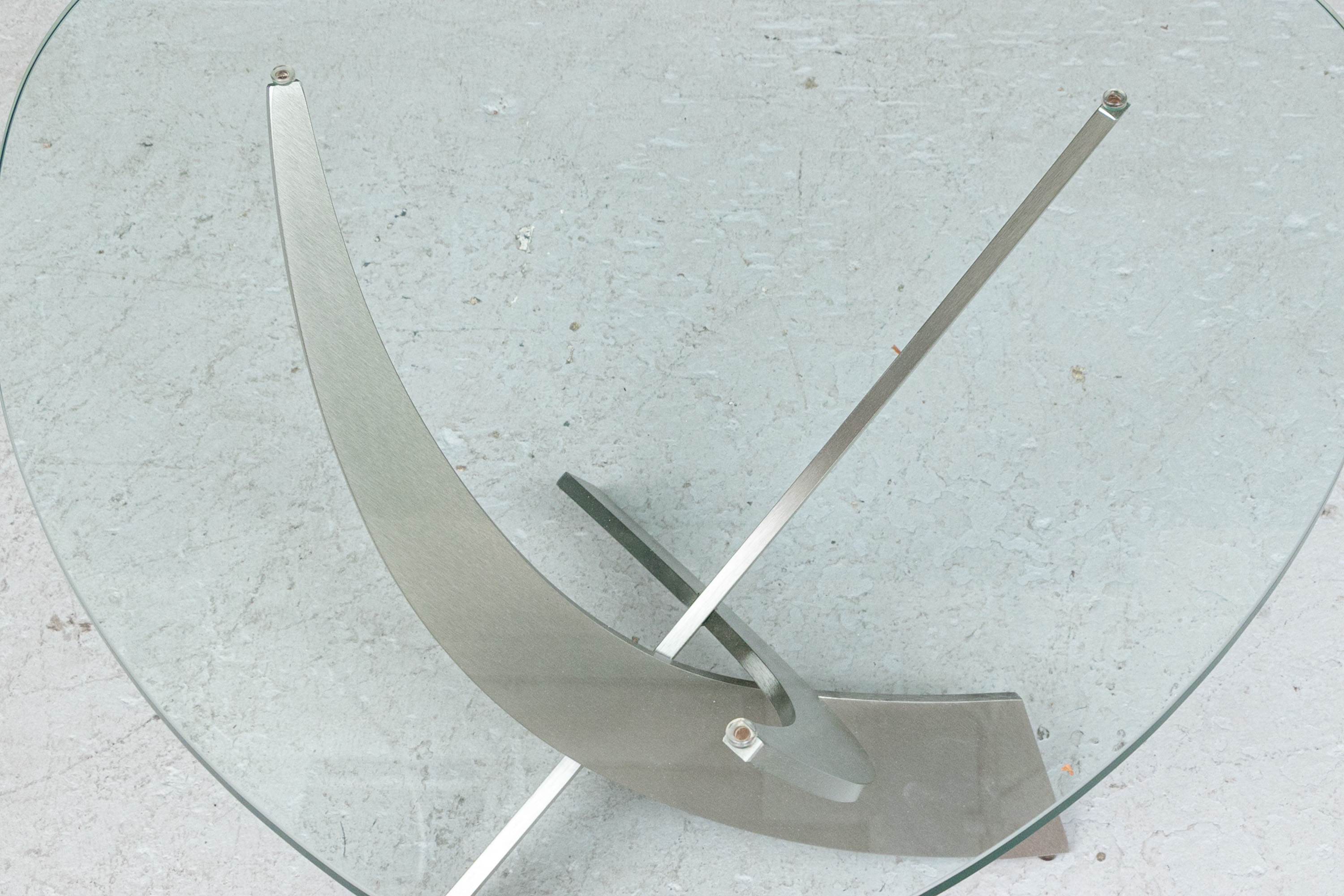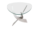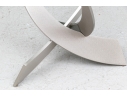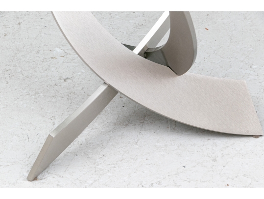 Constructed from thick solid steel with a lustrous champagne-plated finish, this elegant design mimics a piece of between sculpture rather than furniture. The table features three interlocking arms, reaching up to support the glass top, which is softly contoured to suggest gently worn sea stones after their Reef Collection, designed by Carl Muller.