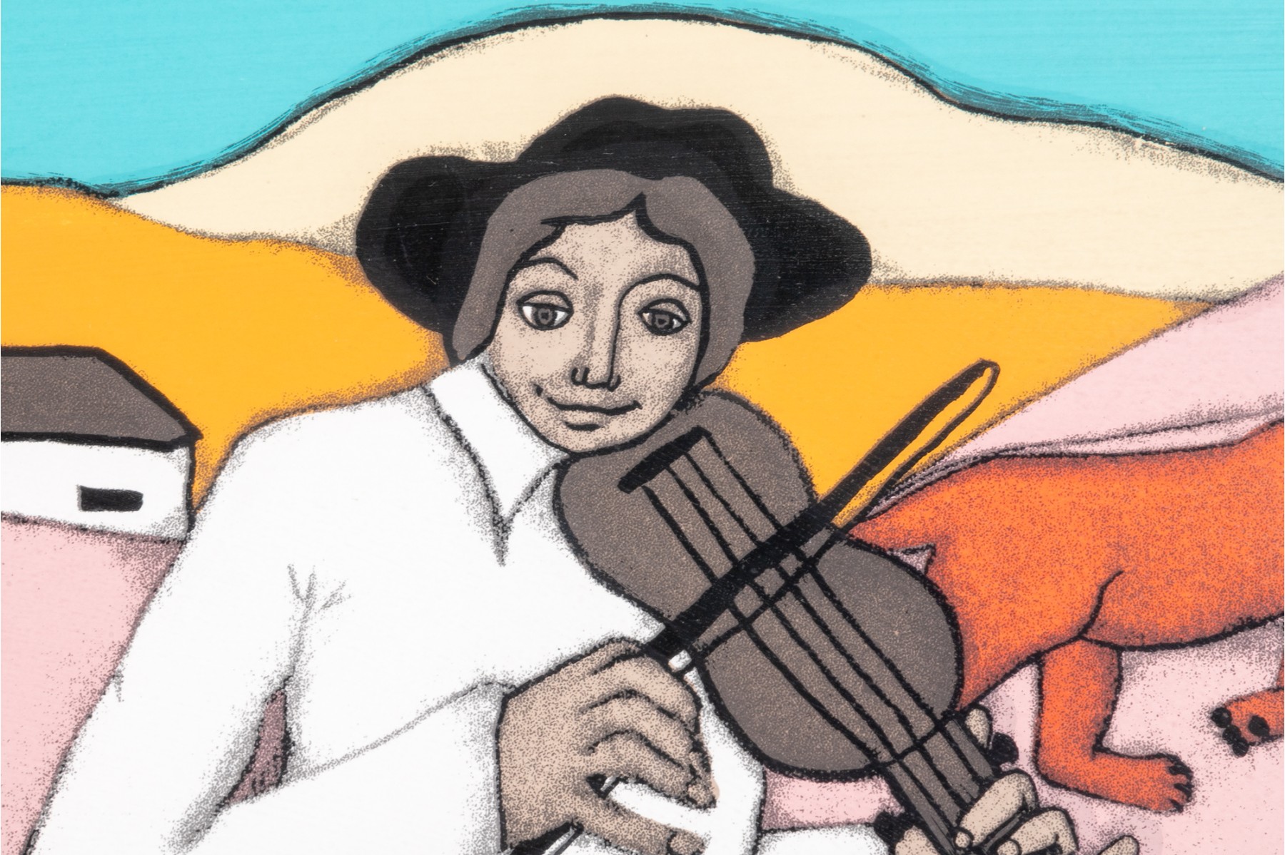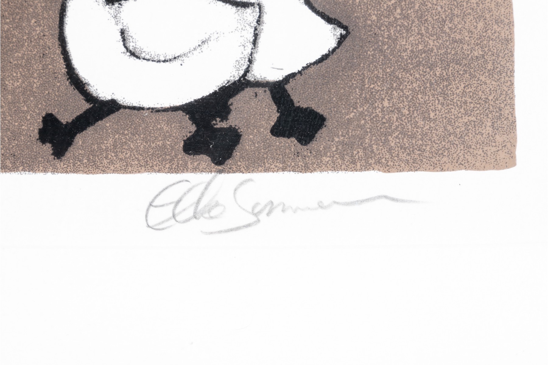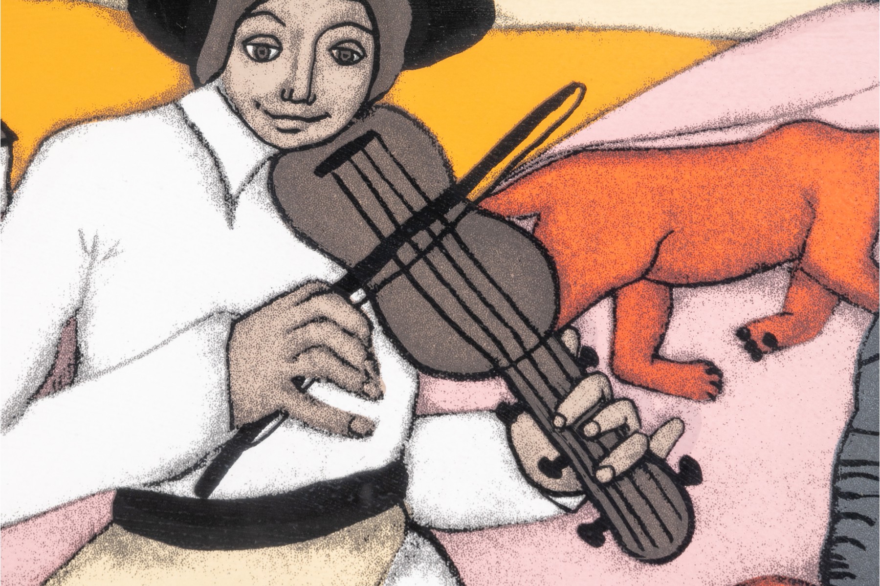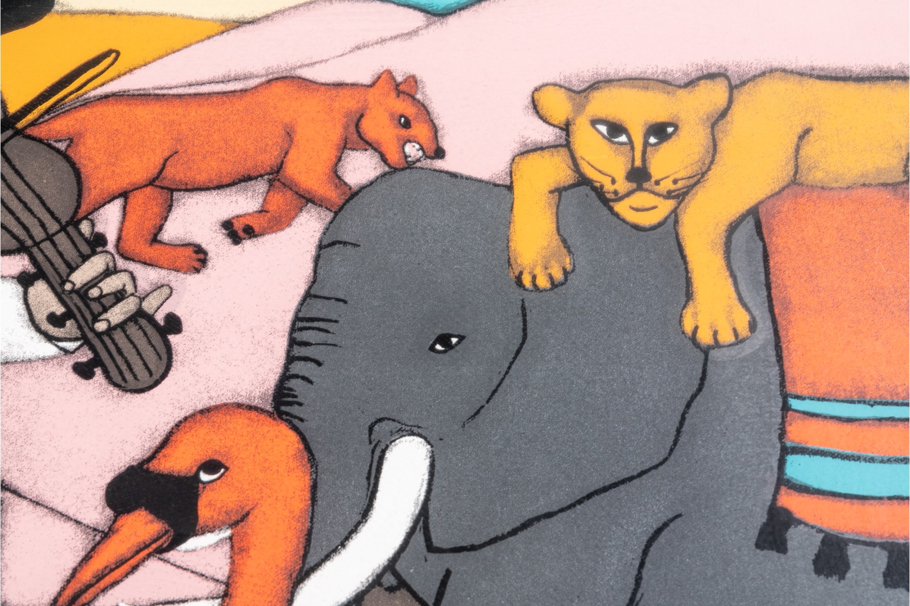 A whimsical artist proof depicting a girl playing a fiddle or violin amidst a menagerie of elephants, geese, lions, and ducks with rolling hills and a bold sun in the distance.