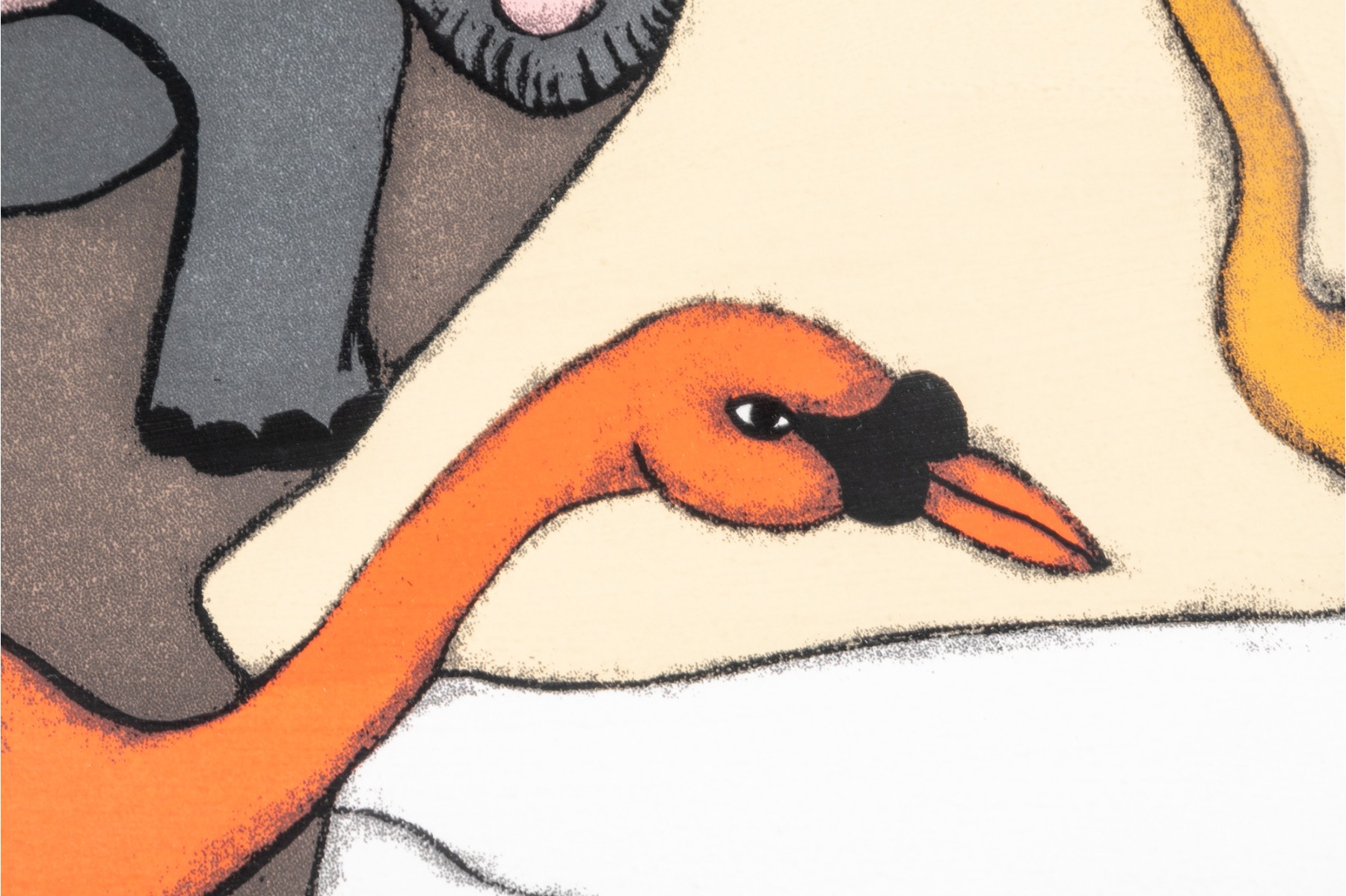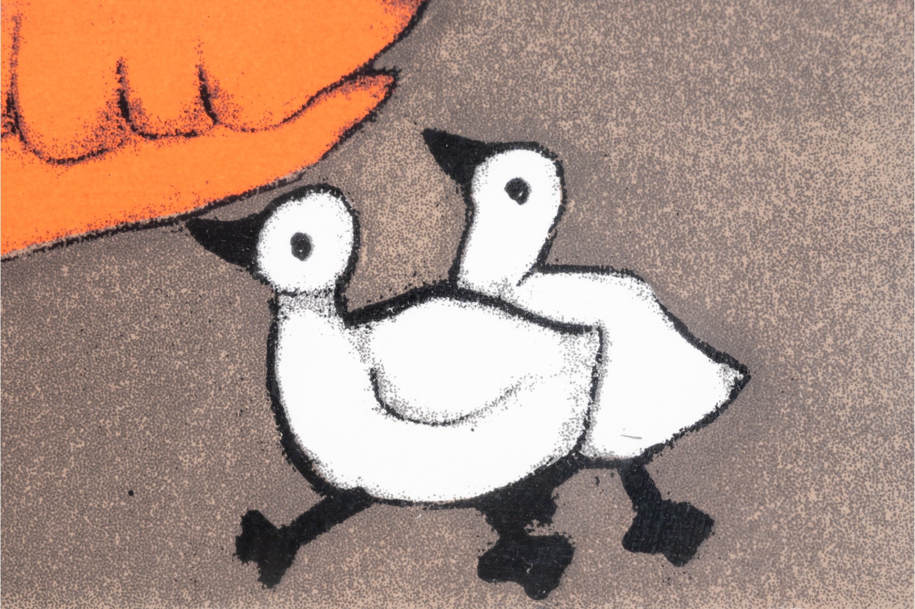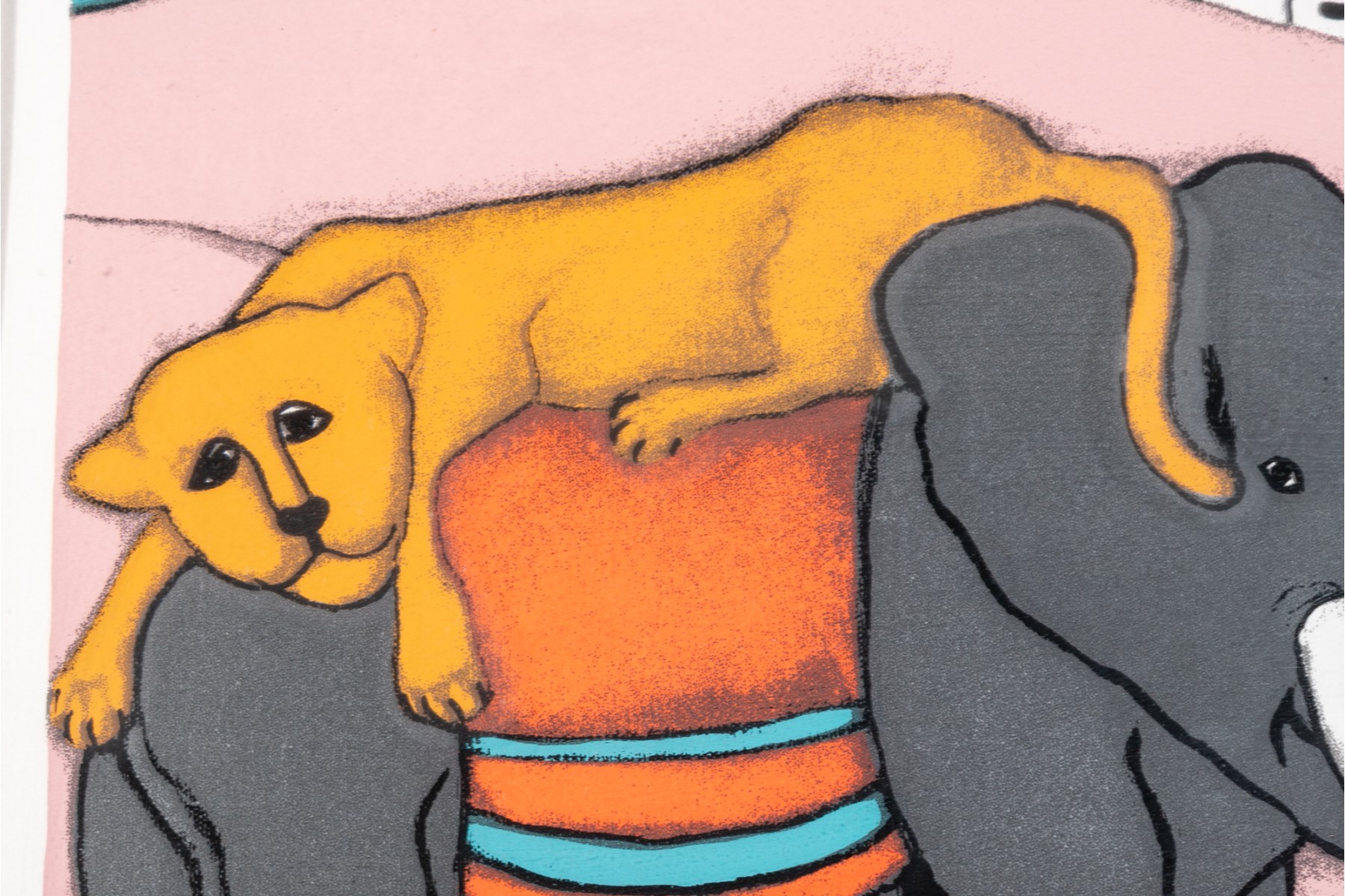 A whimsical artist proof depicting a girl playing a fiddle or violin amidst a menagerie of elephants, geese, lions, and ducks with rolling hills and a bold sun in the distance.