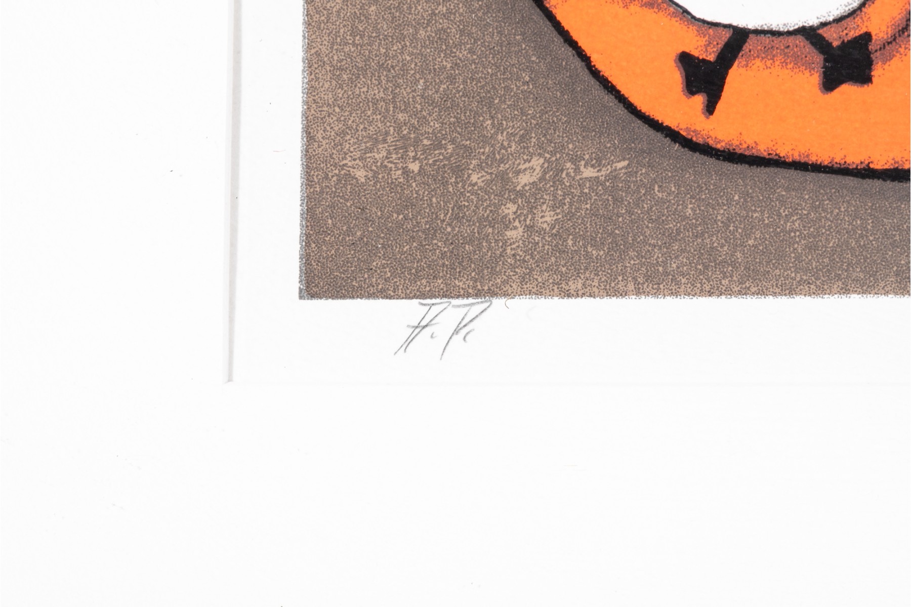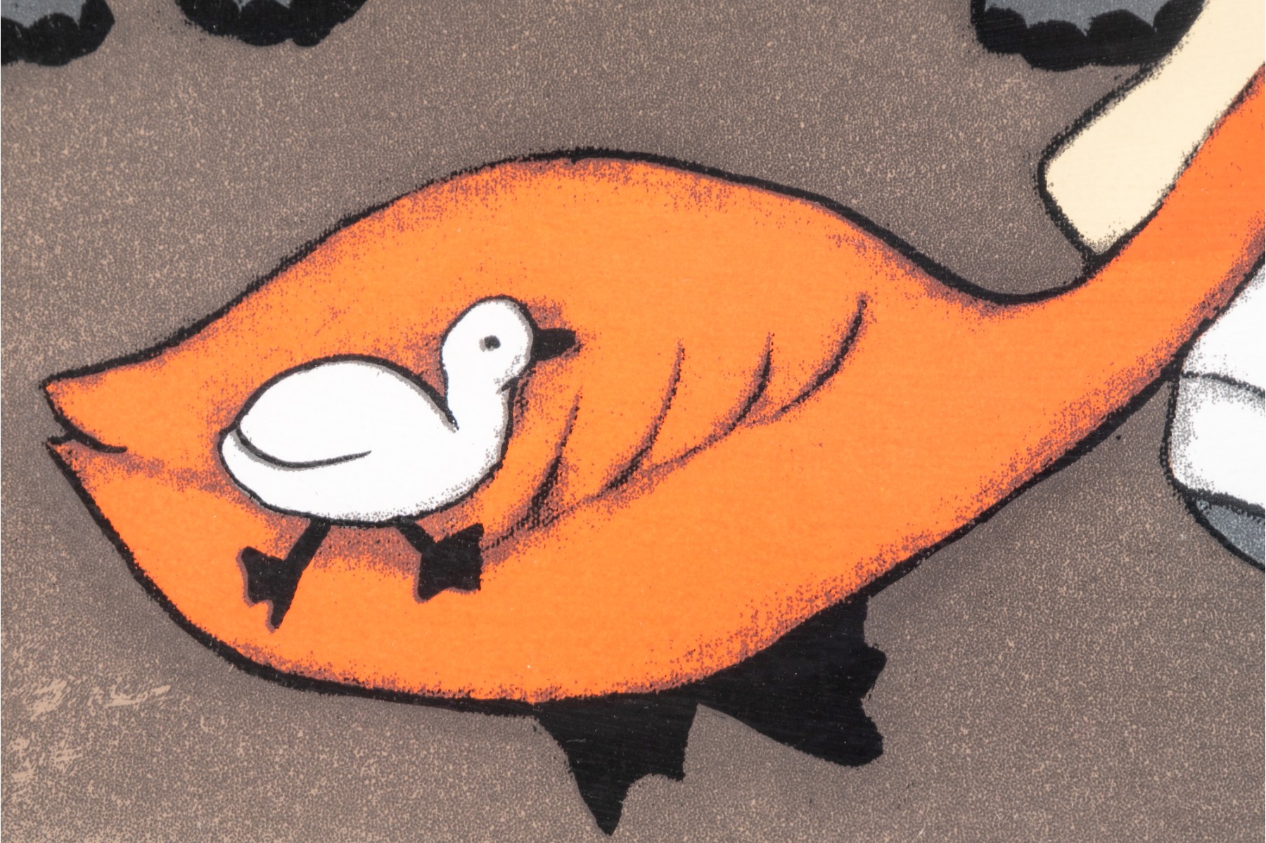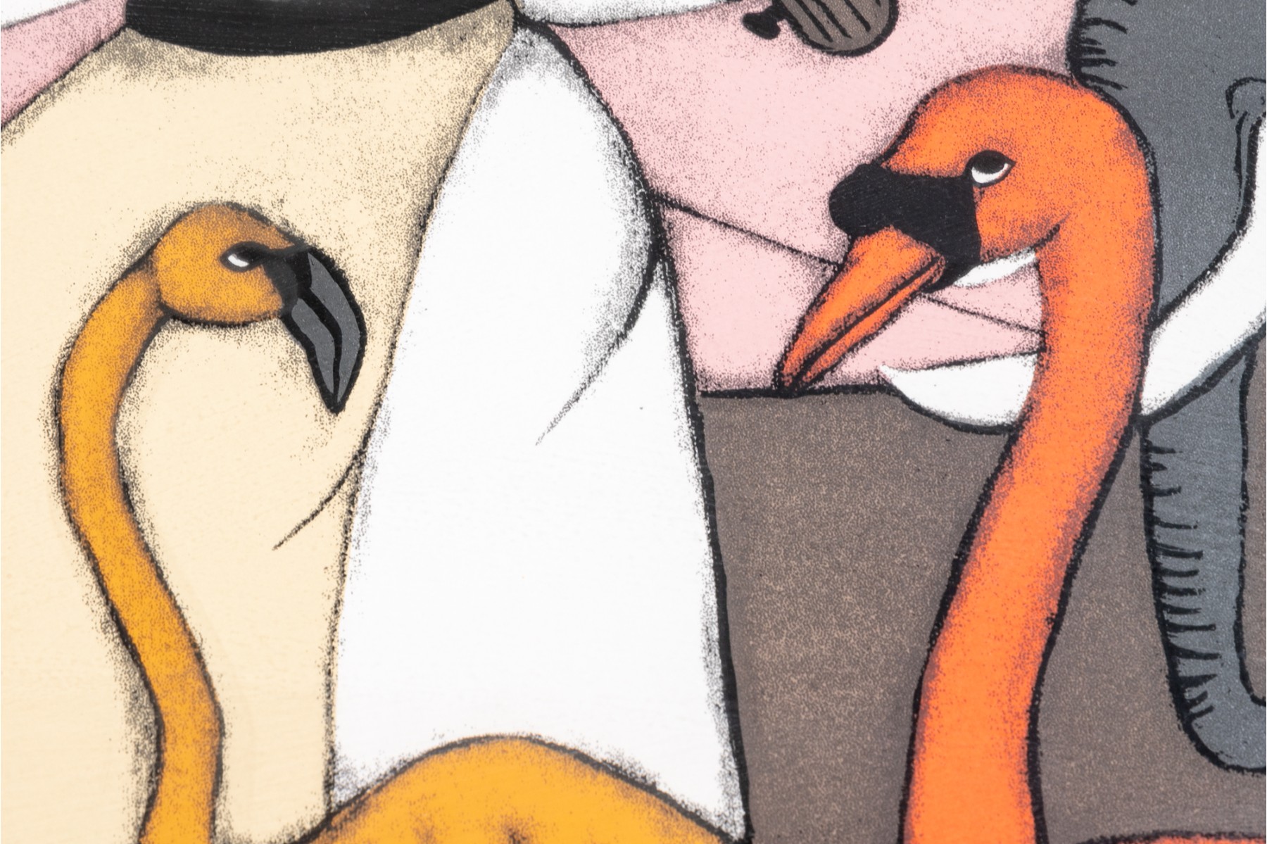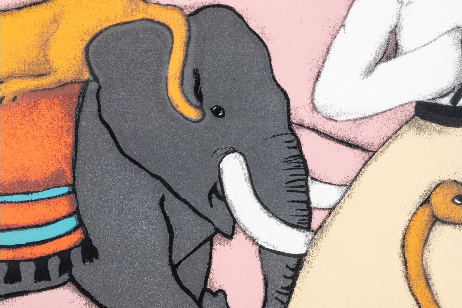 A whimsical artist proof depicting a girl playing a fiddle or violin amidst a menagerie of elephants, geese, lions, and ducks with rolling hills and a bold sun in the distance.
