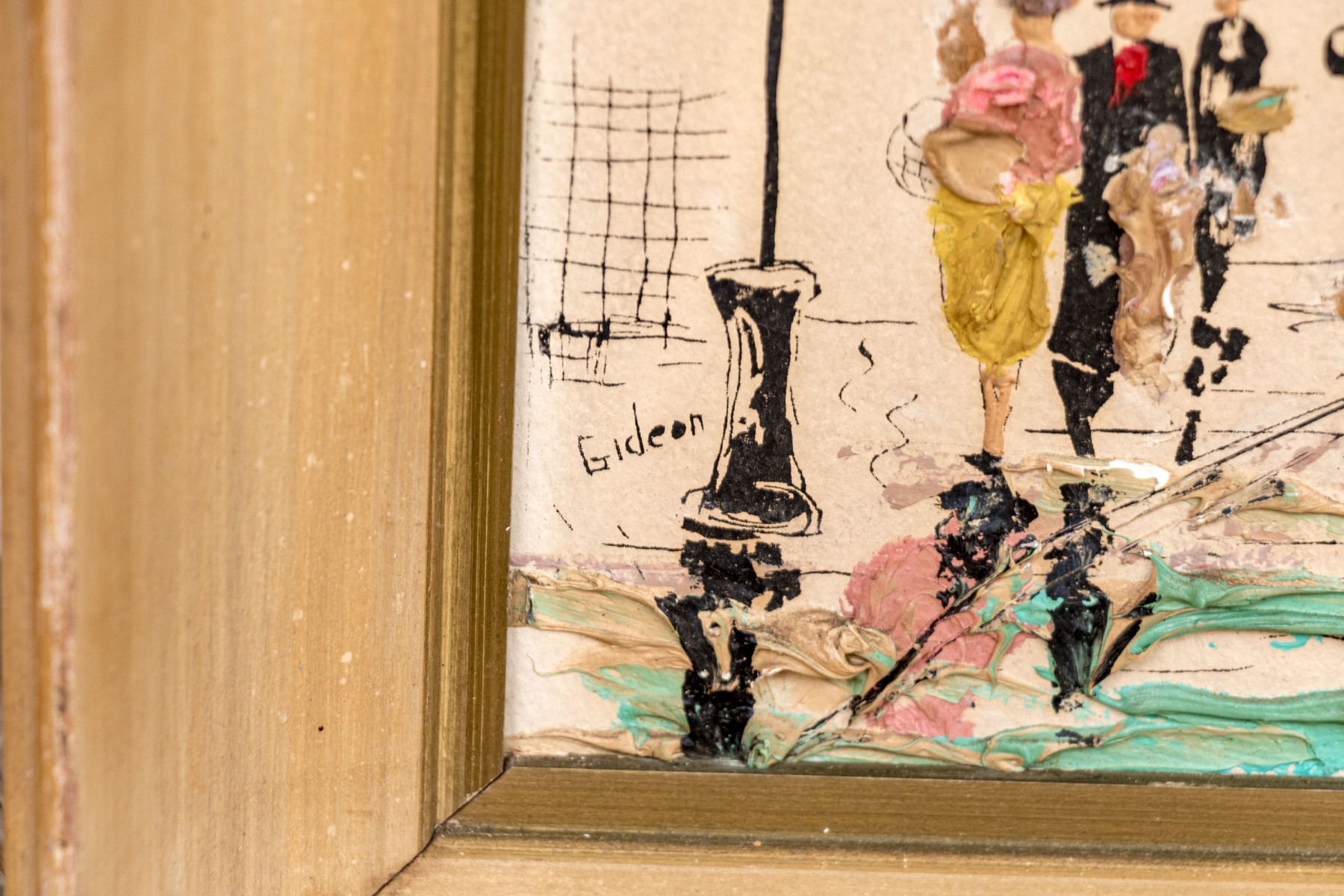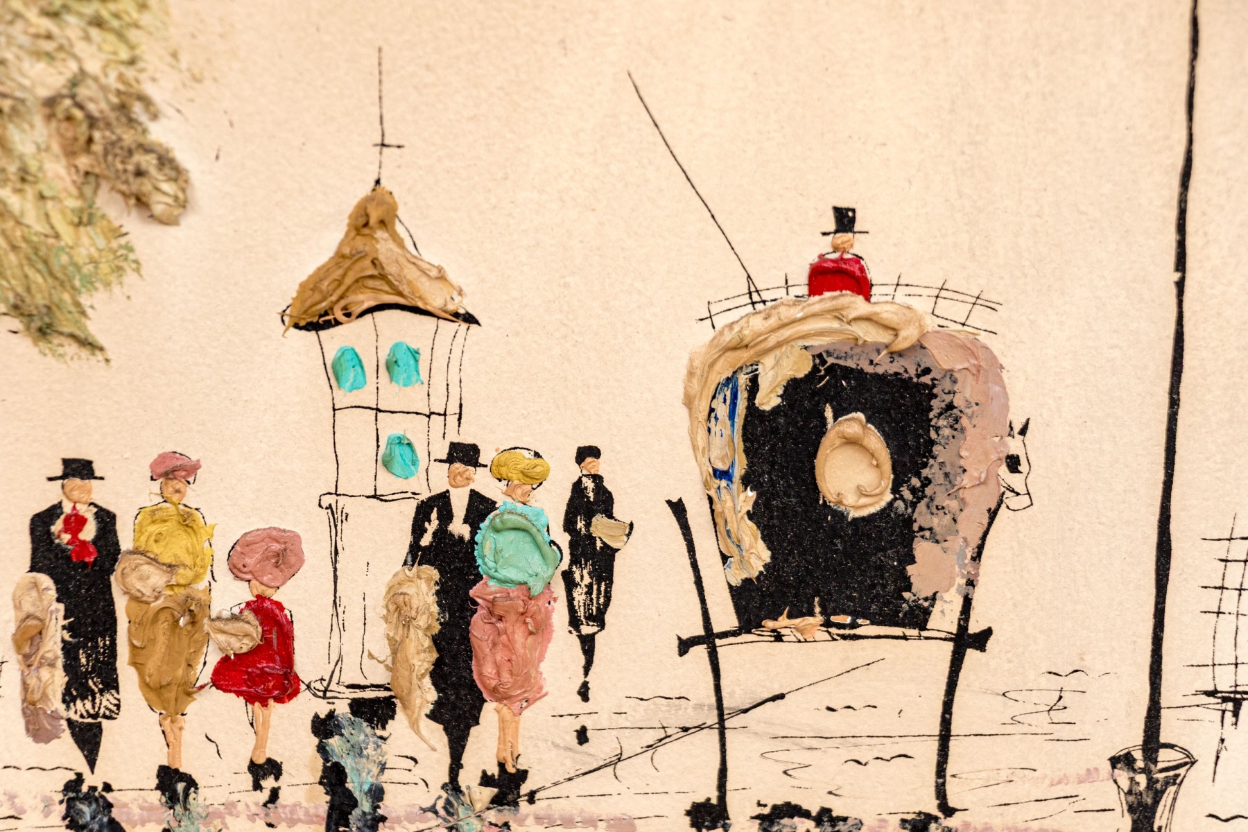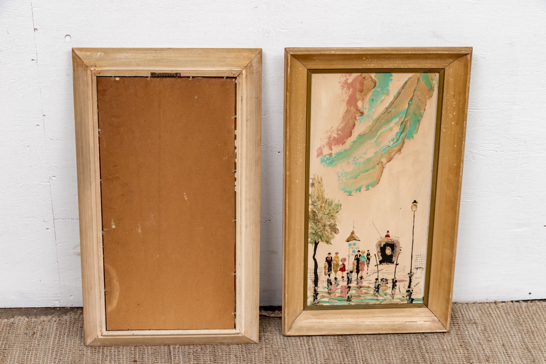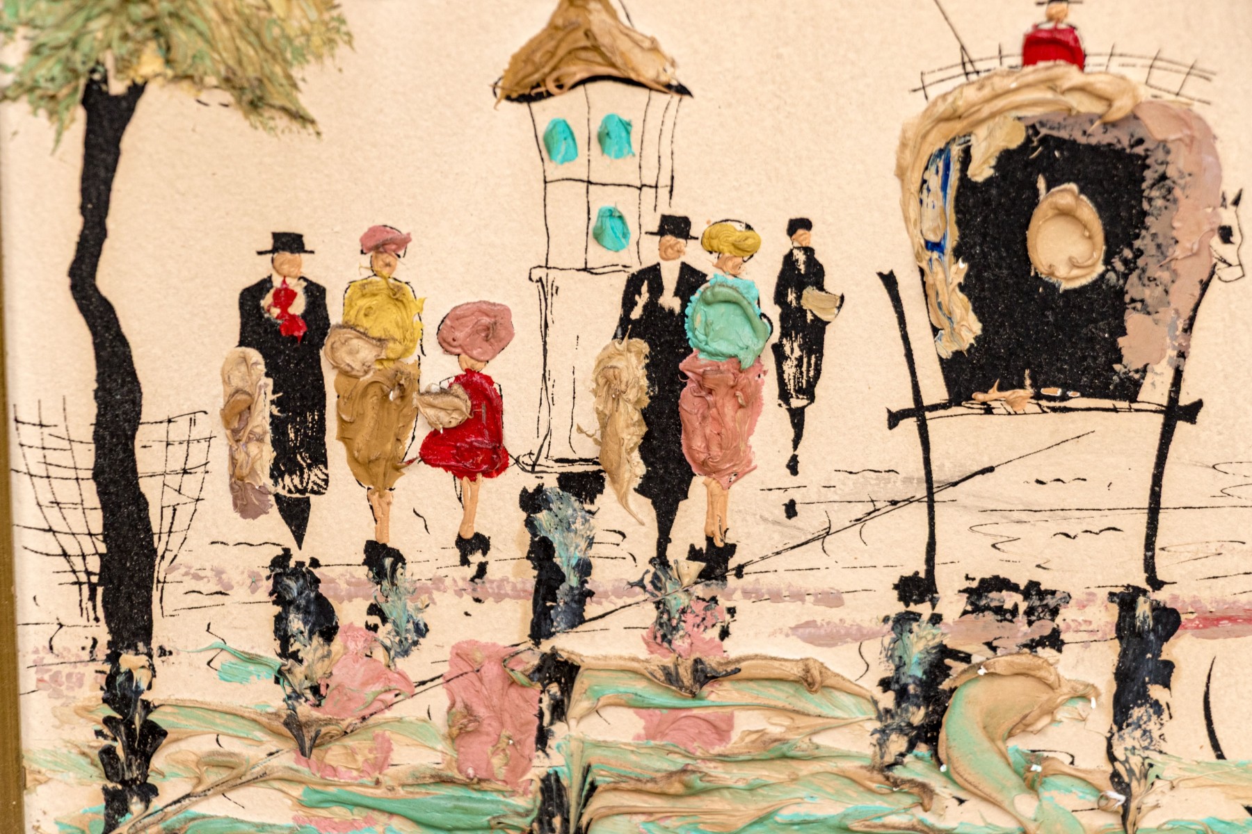Signed lower left and lower right, One features figures walking and others seated at a cafe, The other painting has elegantly dress figures walking near a kiosk and a horse drawn carriage on the road, Each painting has thick textured 3-D details overall under colorful striped thick clouds. Presented in wood frames.