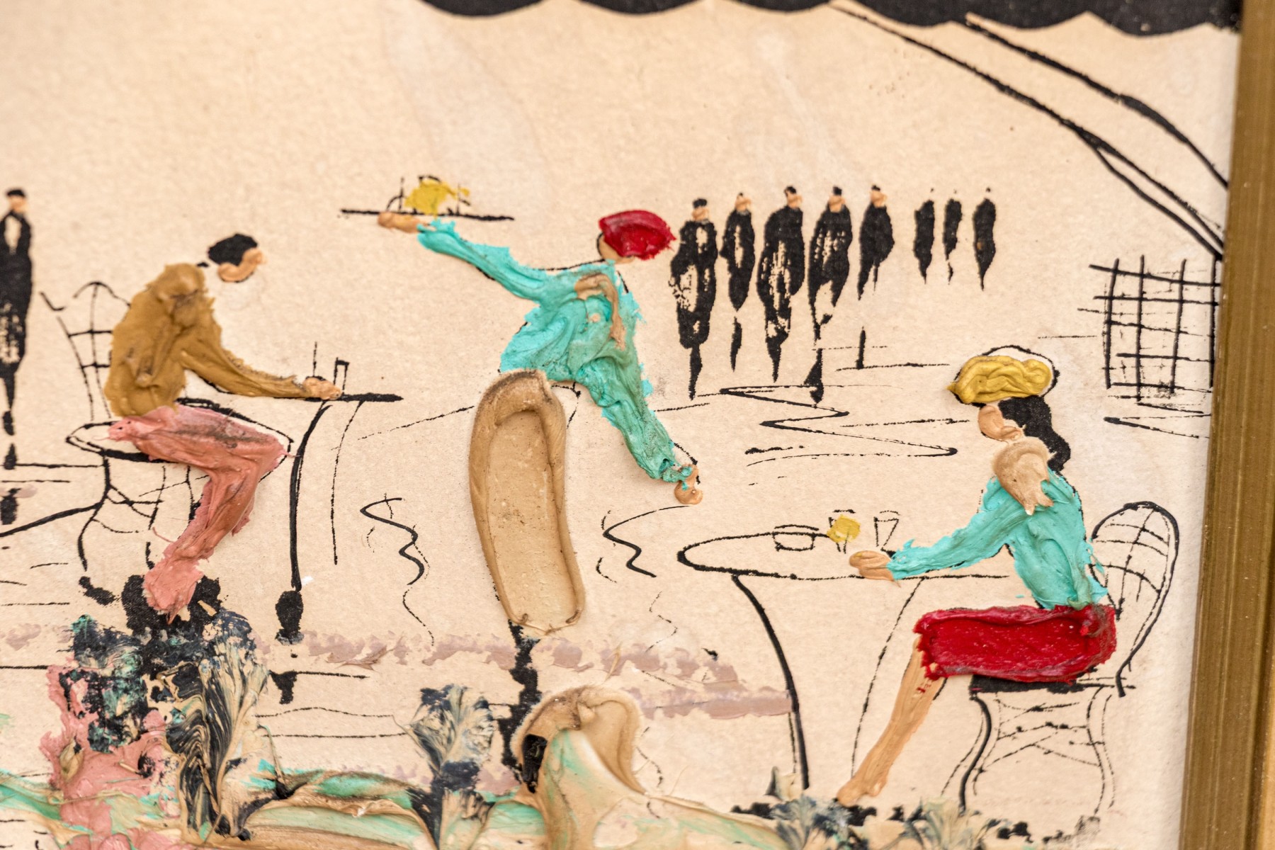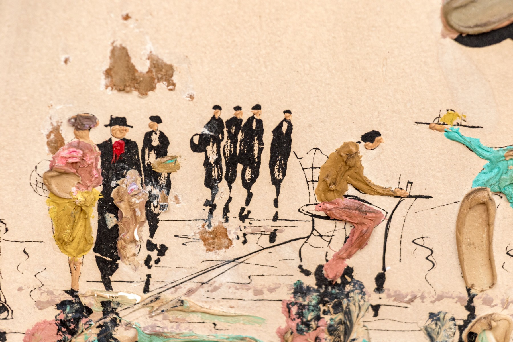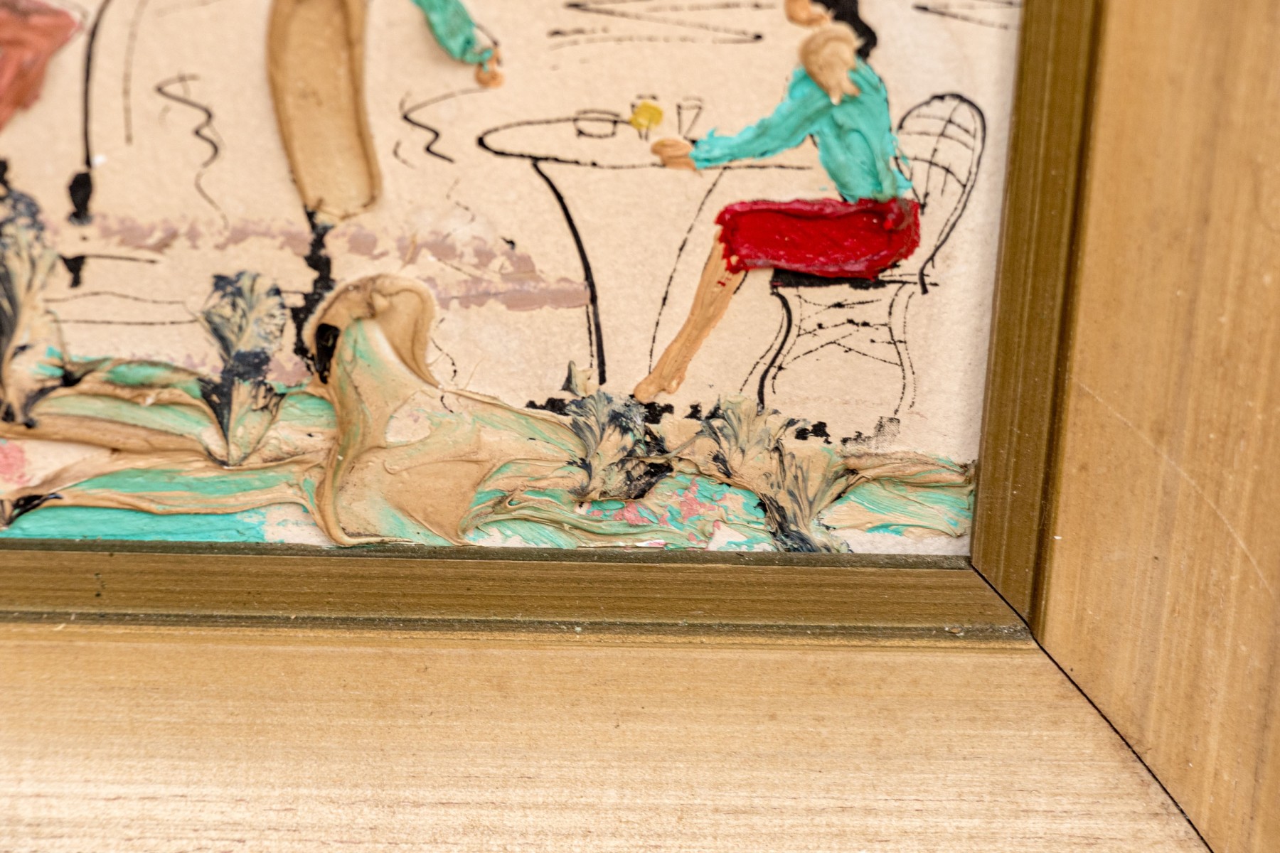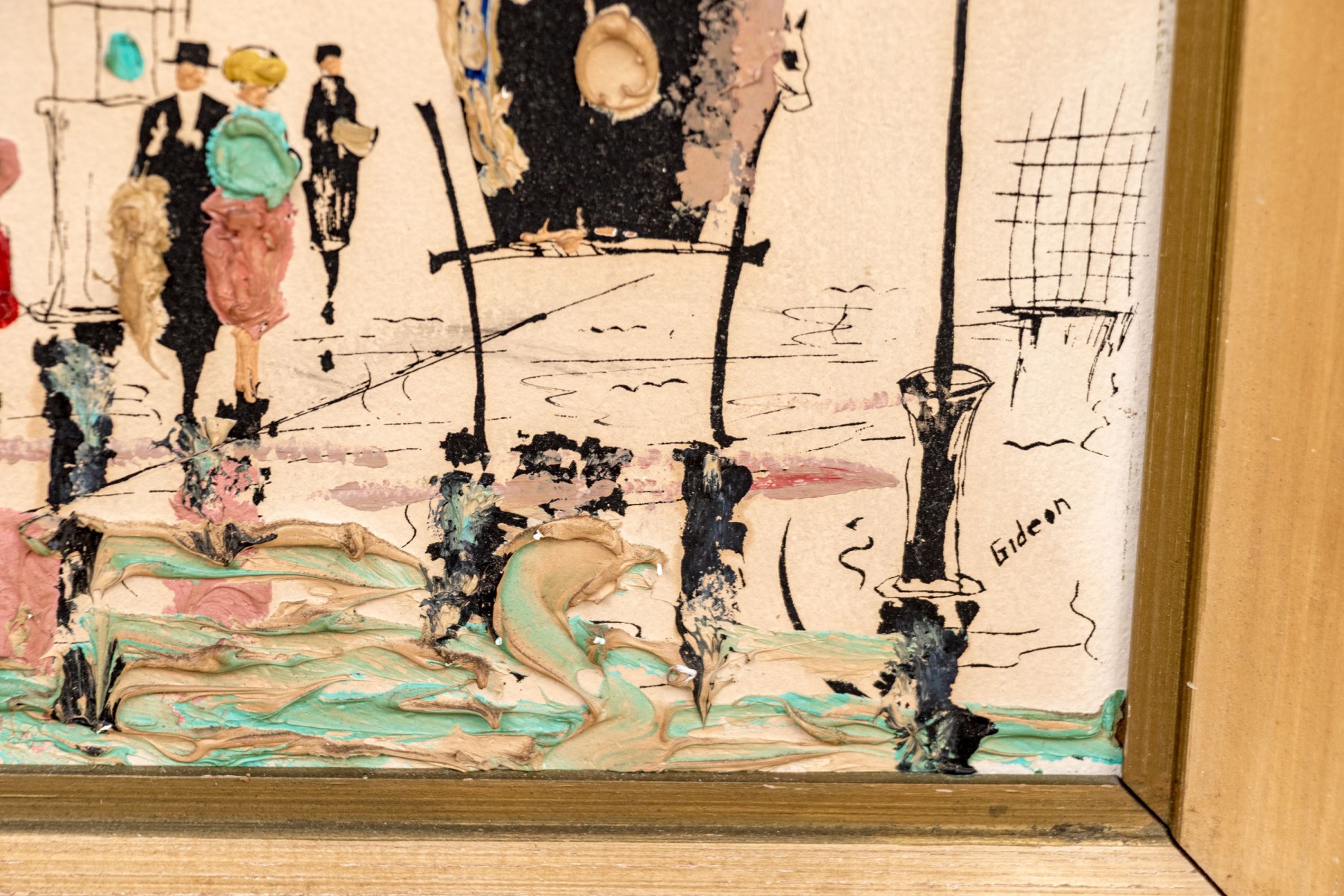 Signed lower left and lower right, One features figures walking and others seated at a cafe, The other painting has elegantly dress figures walking near a kiosk and a horse drawn carriage on the road, Each painting has thick textured 3-D details overall under colorful striped thick clouds. Presented in wood frames.
