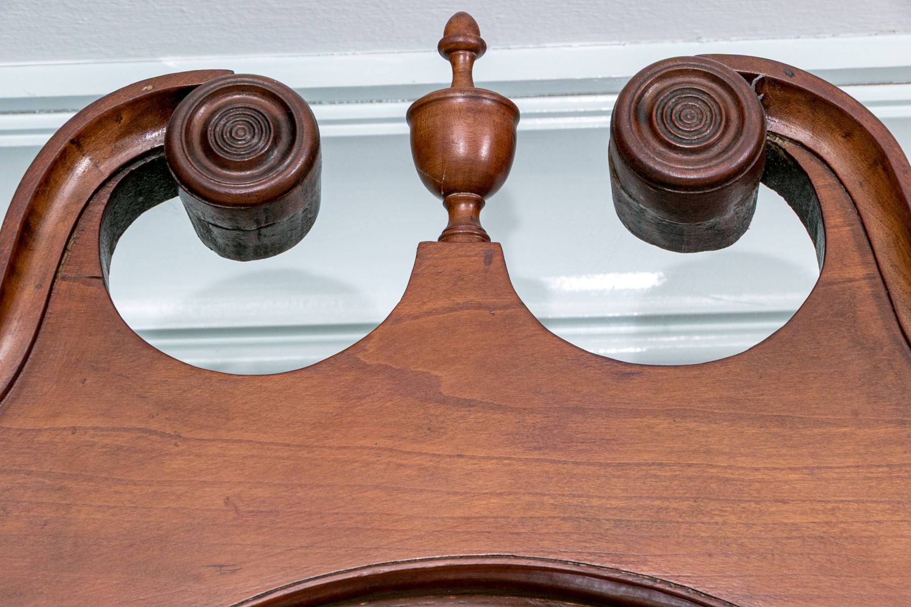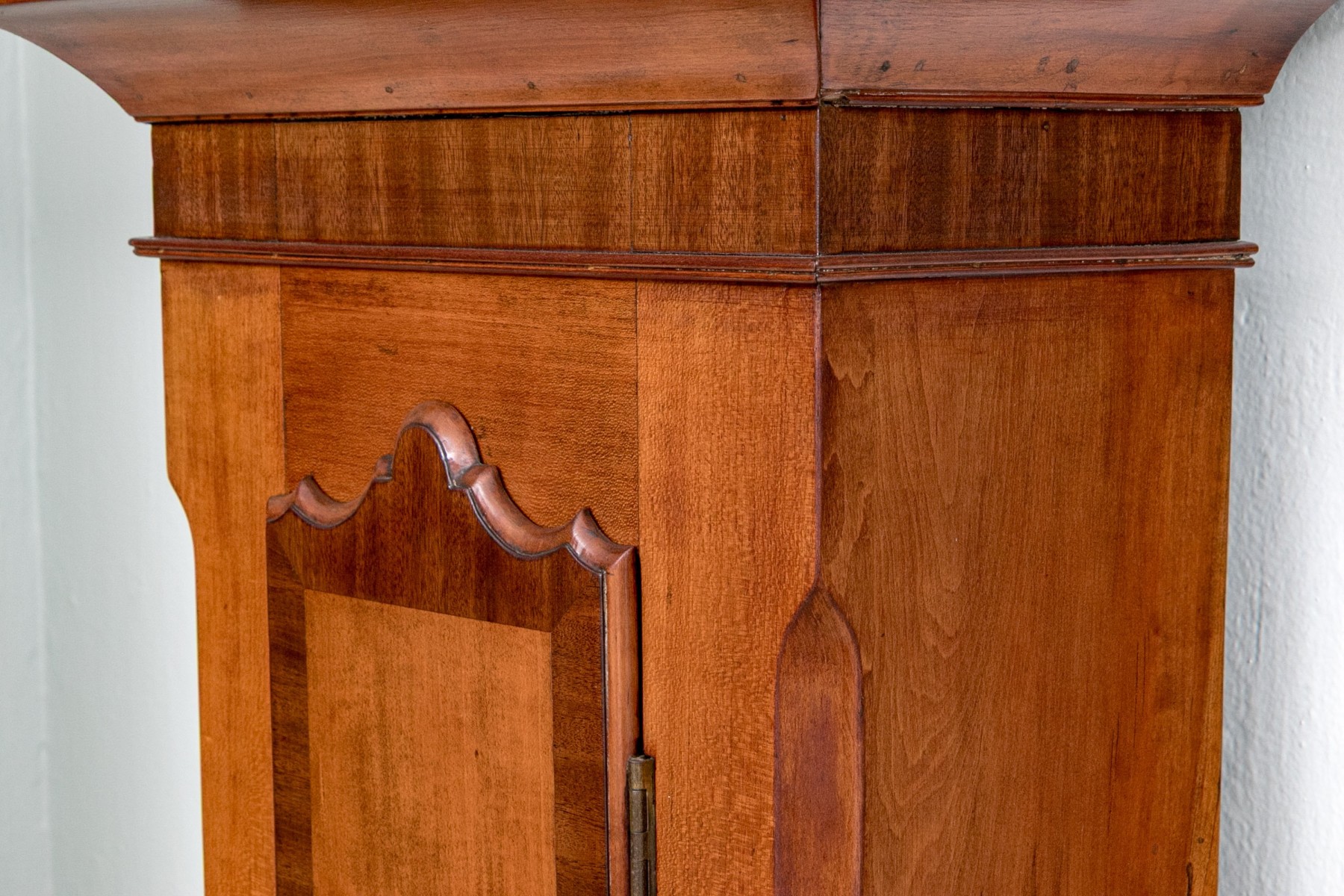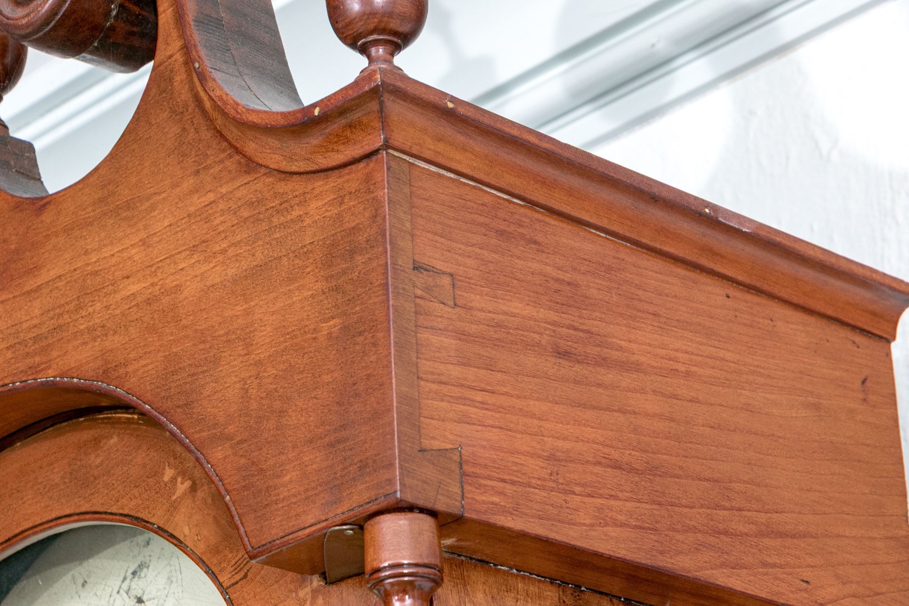 A gorgeous Elnathan Taber (Massachusetts, 1768-1854) Federal tall case clock in classic design, finely crafted with gorgeous warm-toned brown wood with a swan neck pediment sporting rosettes and urn-form finials over an arched glass case flanked by stately columnar posts around a white dial. The dial, marked E. Taber, is detailed with black Roman numerals, along with two subdials and is decorated with elegant black details at the corners. The trunk of the clock is nicely banded with a darker inlaid panel, leading to a rectangular base with nicely faceted corners and a shapely, serpentine apron on bracket feet. The case more than likely made in the Elijah Warner factory in Lexington Kentucky.
