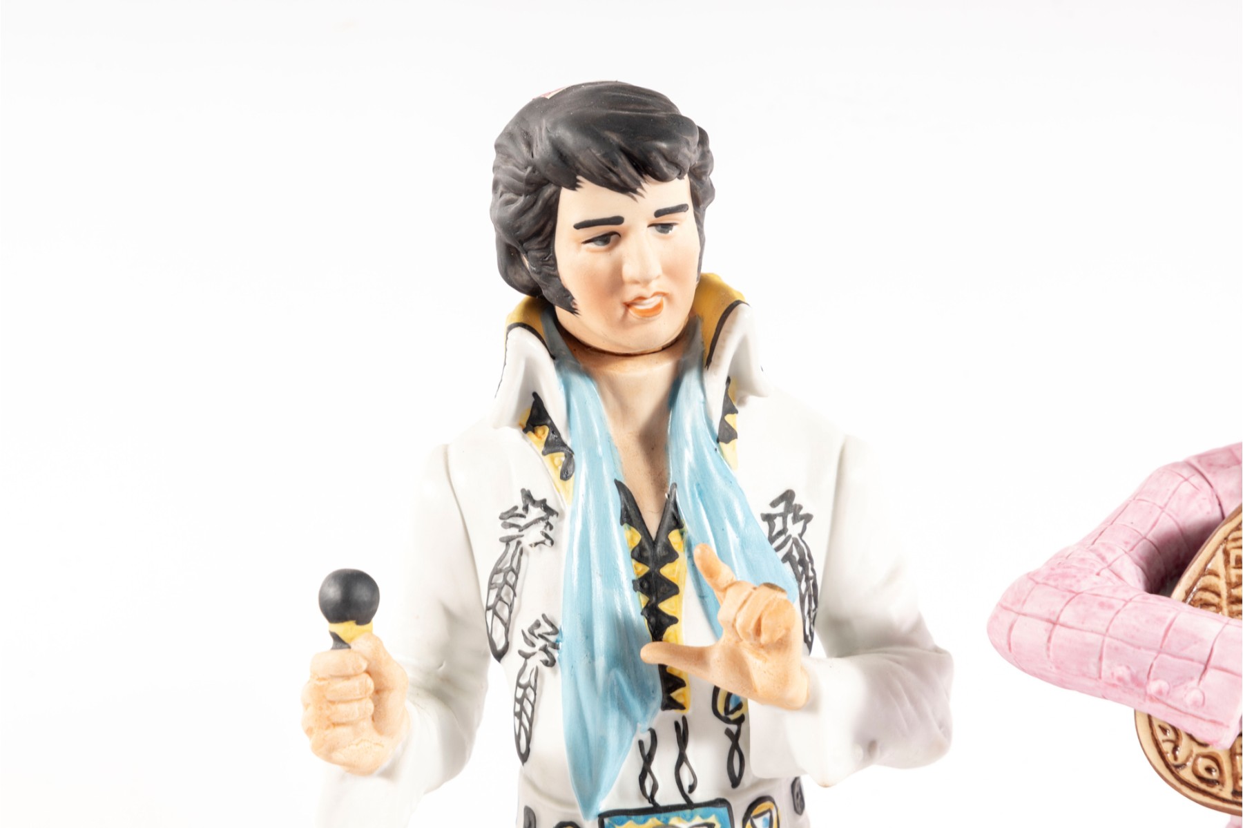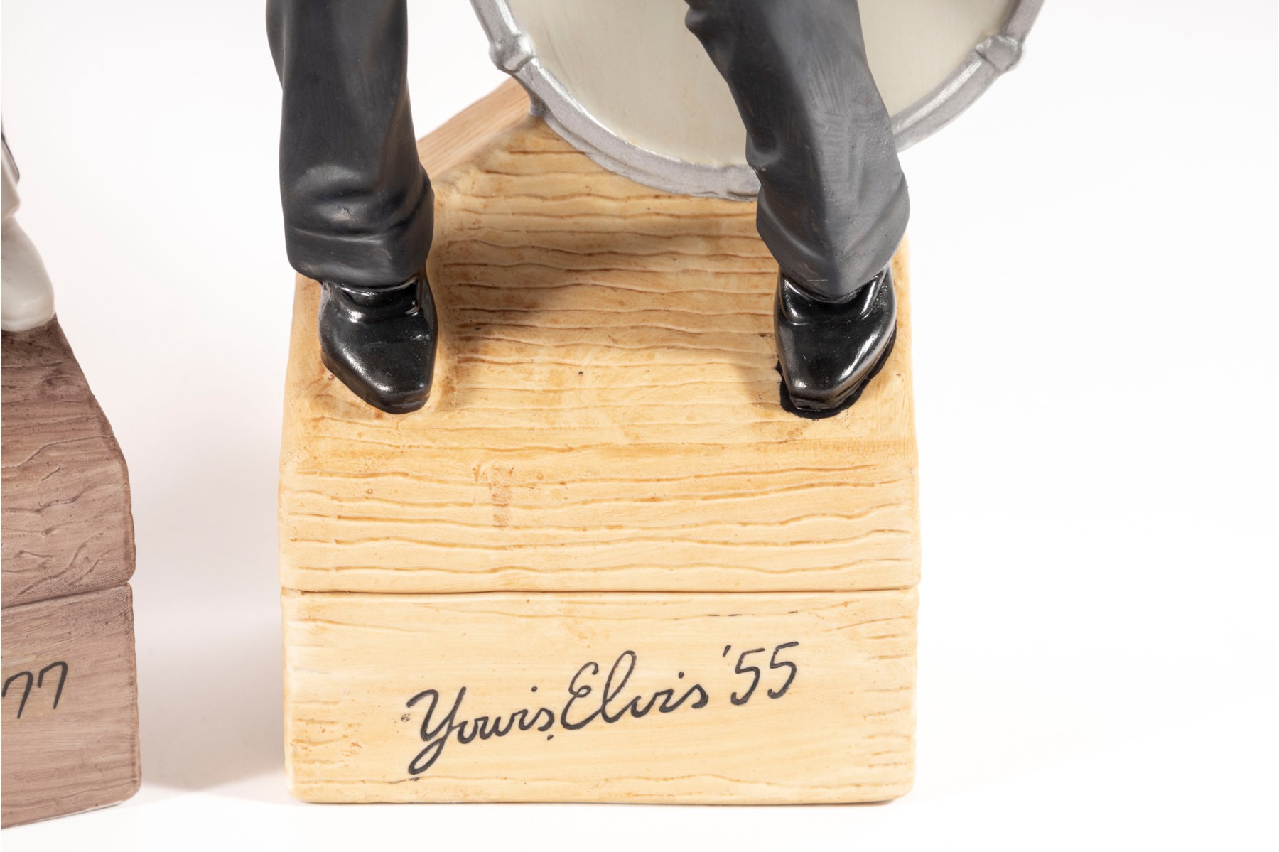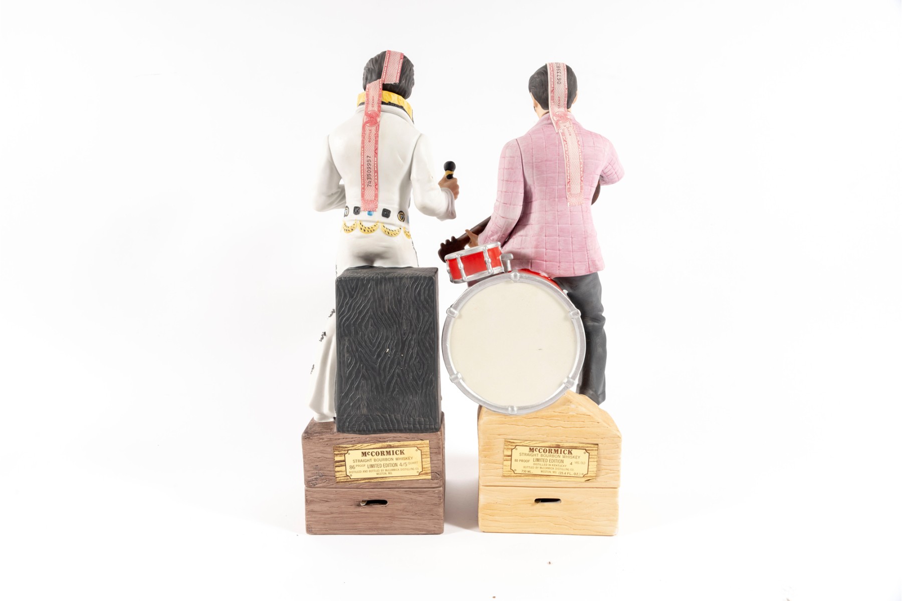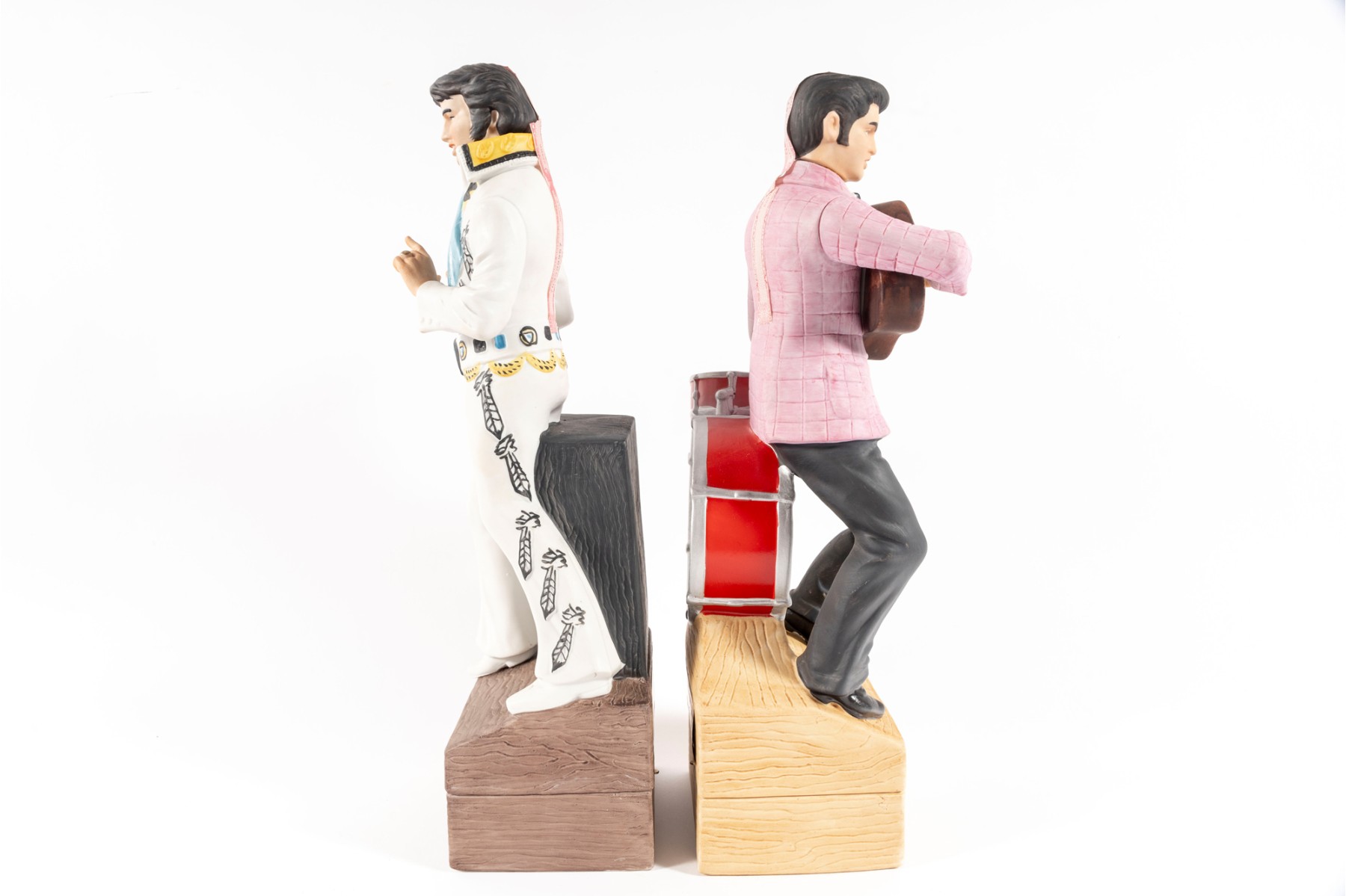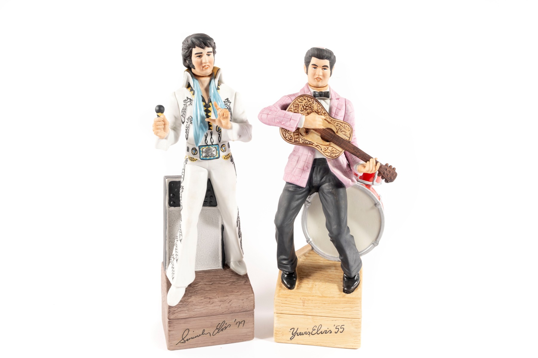 A pair of Bourbon Whiskey decanters, 1955 - 1977 limited edition Elvis Presley bottles crafted of hand-painted porcelain. Features removable heads which serve as corks, and contains the original whiskey. Paper seals are broken, see photos for details.