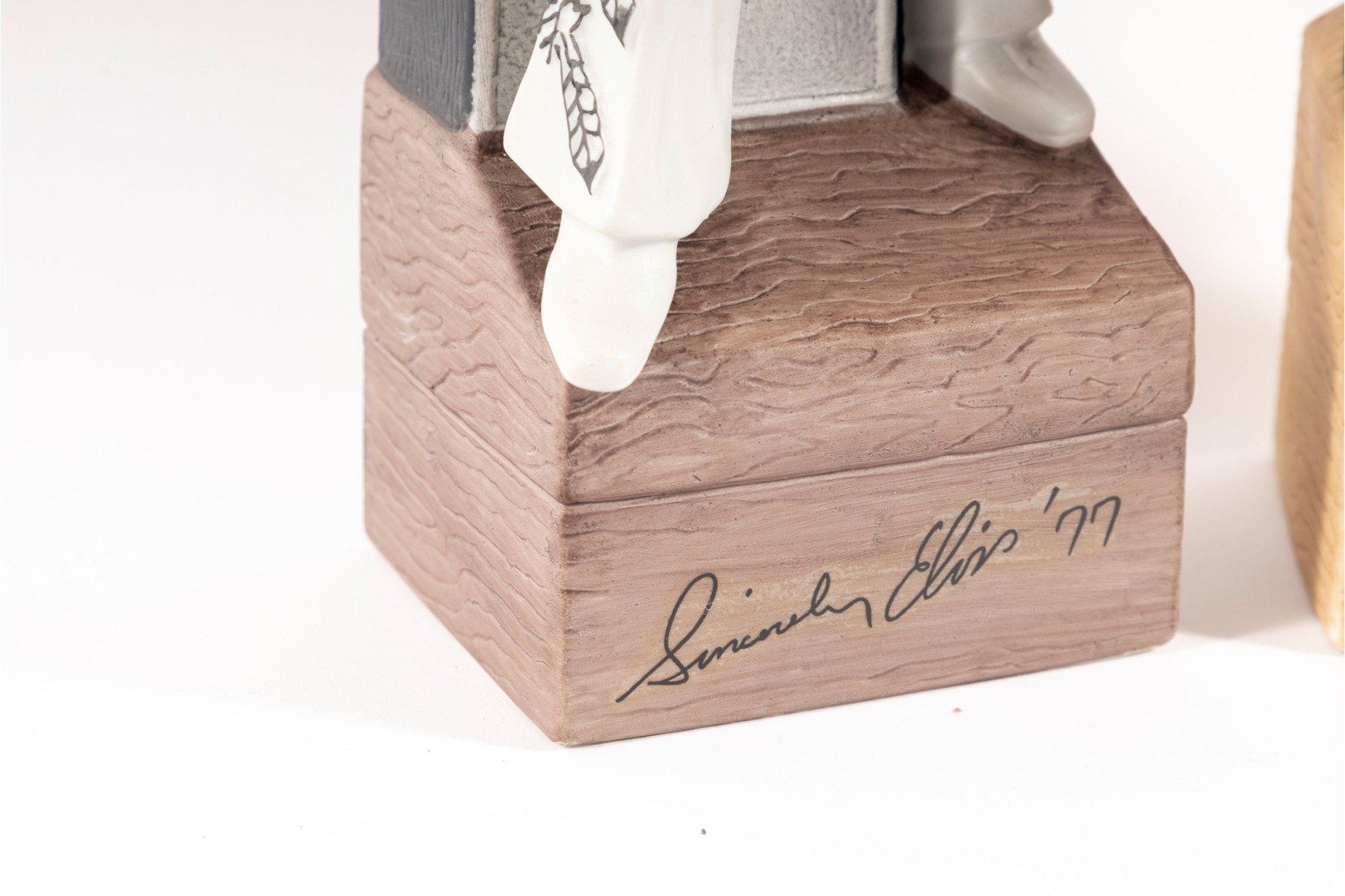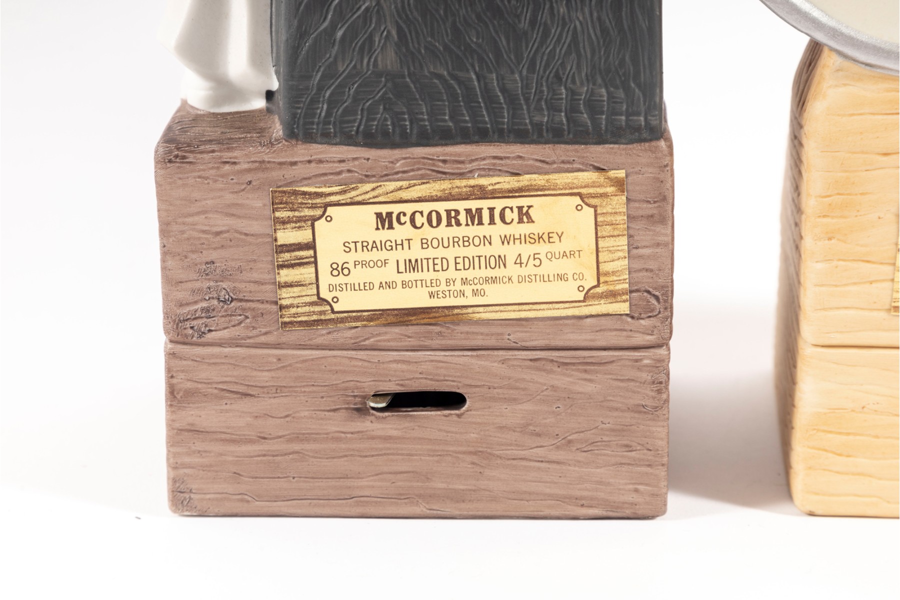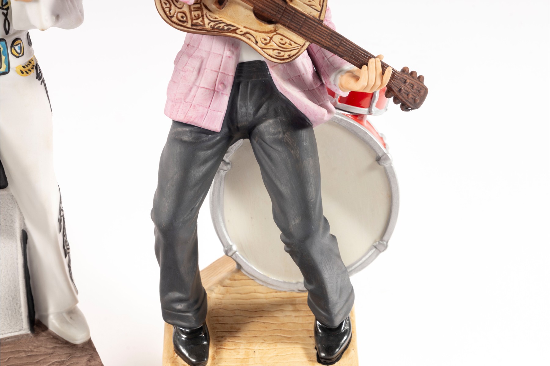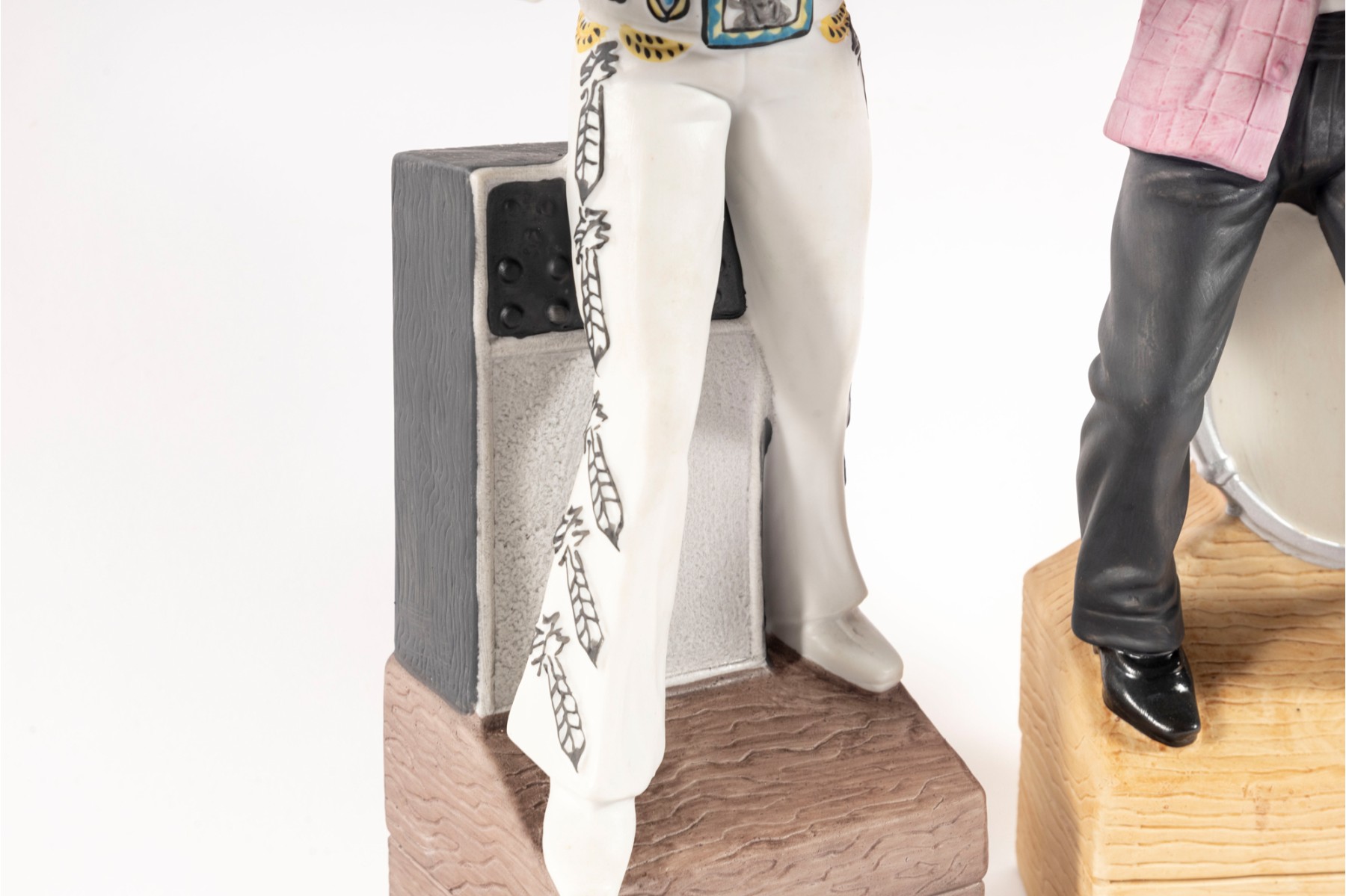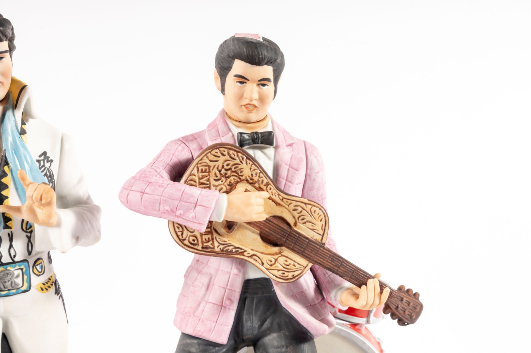 A pair of Bourbon Whiskey decanters, 1955 - 1977 limited edition Elvis Presley bottles crafted of hand-painted porcelain. Features removable heads which serve as corks, and contains the original whiskey. Paper seals are broken, see photos for details.