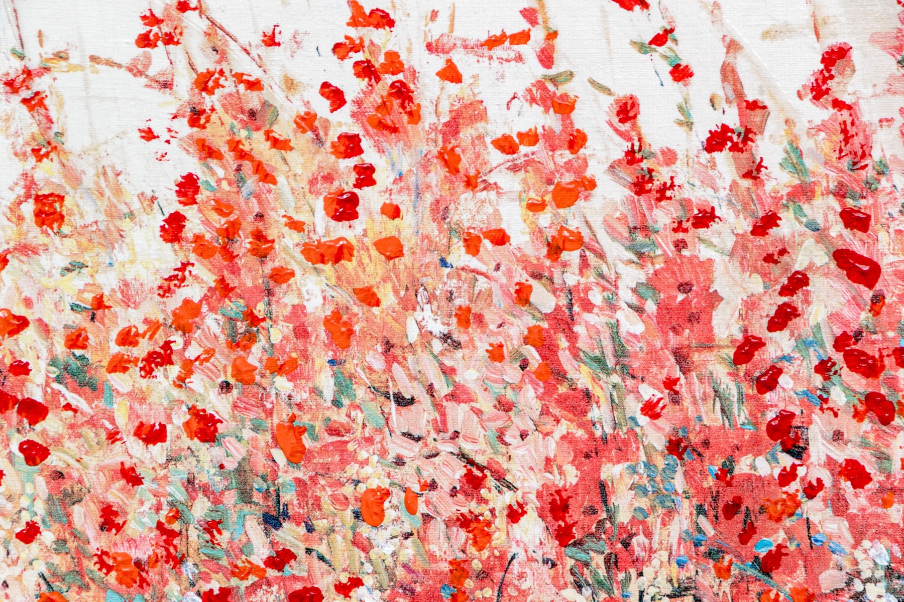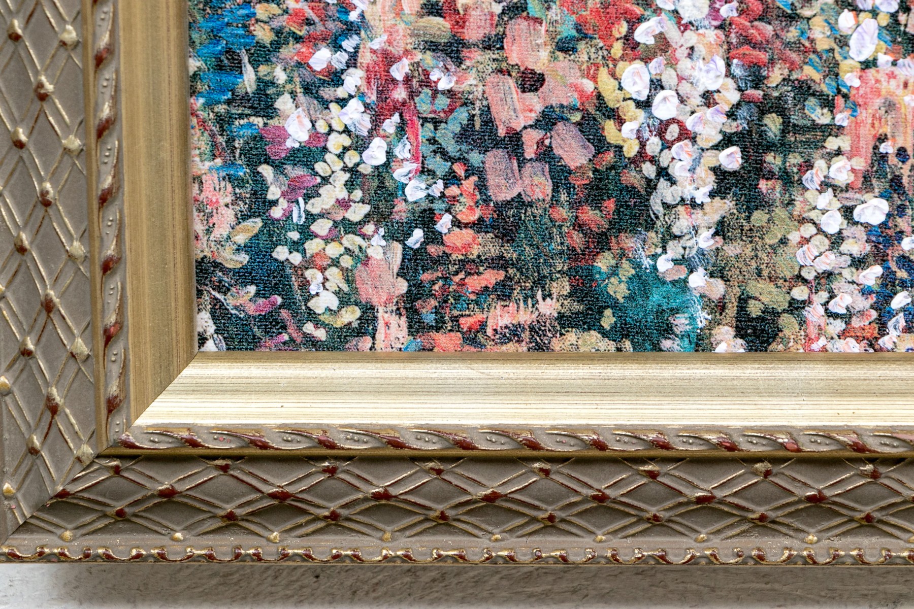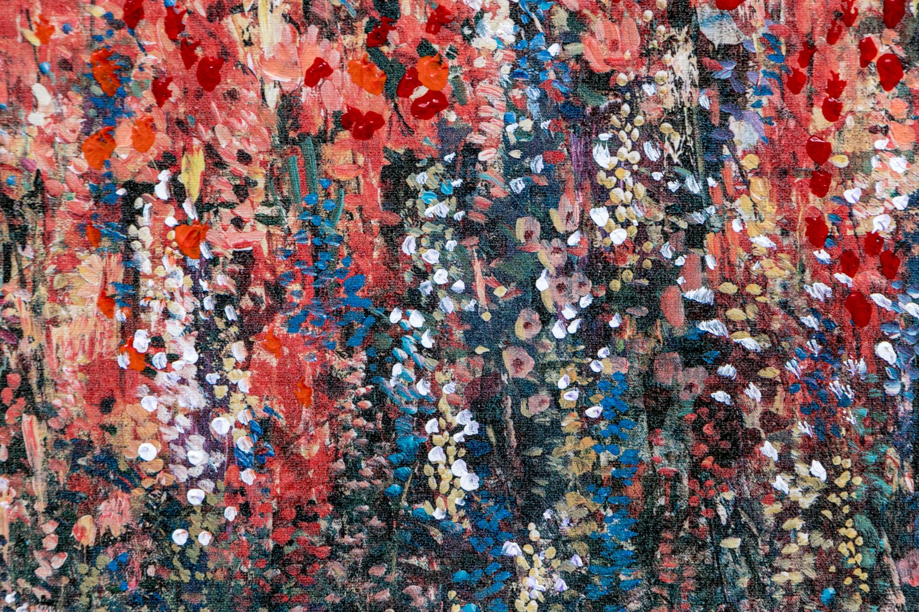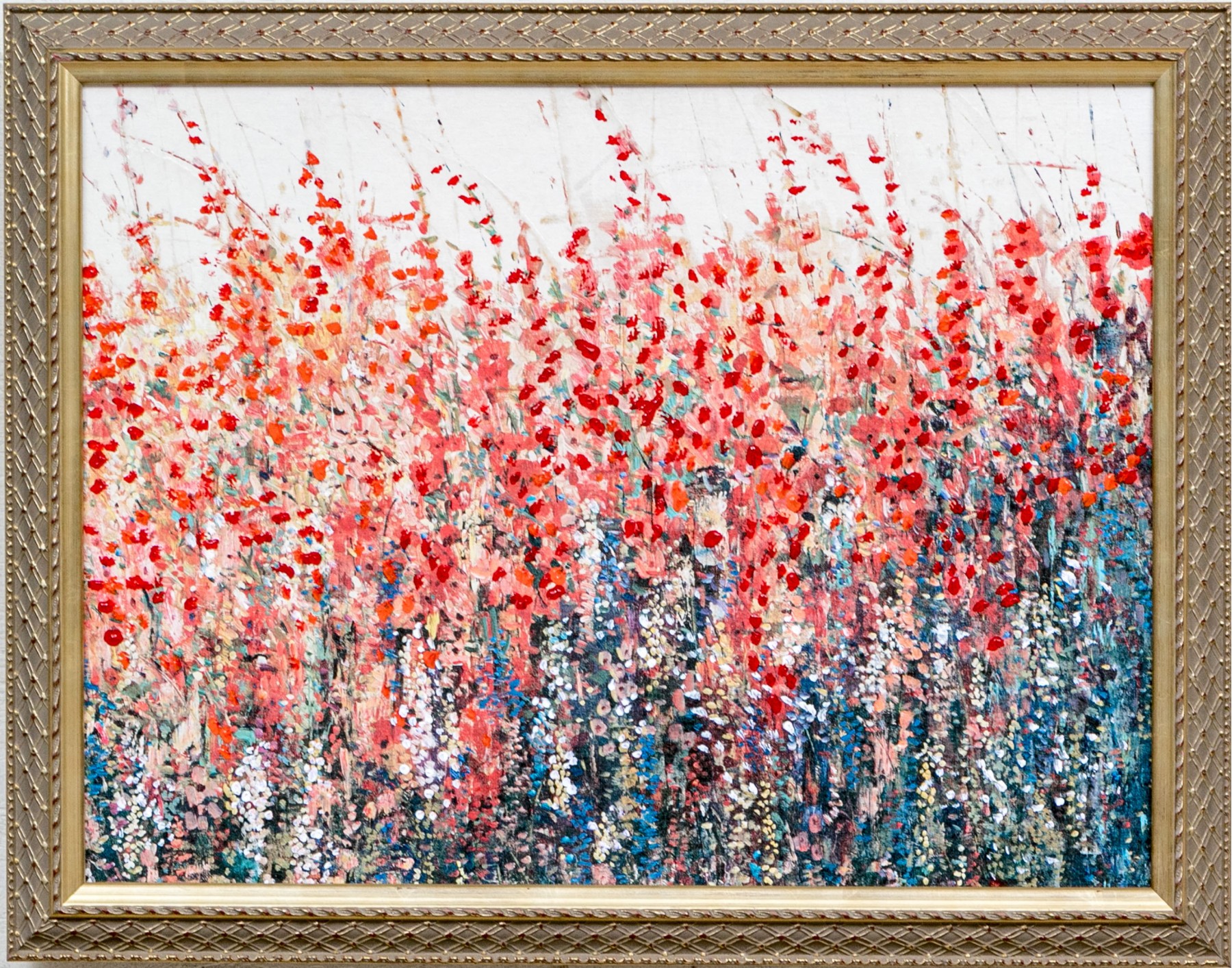 A garden planted with tall pink and coral flowers towering over white ones. Presented in a fine gilt frame.