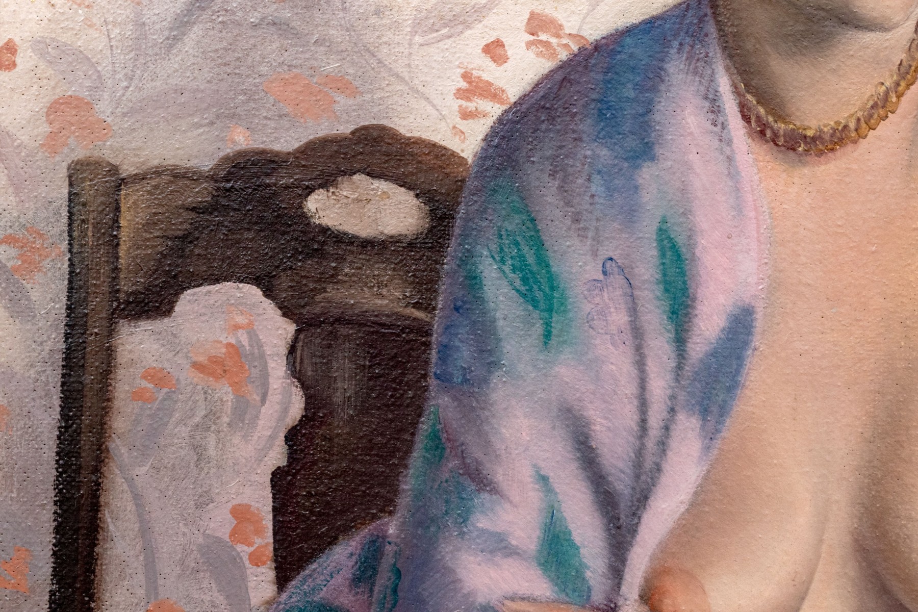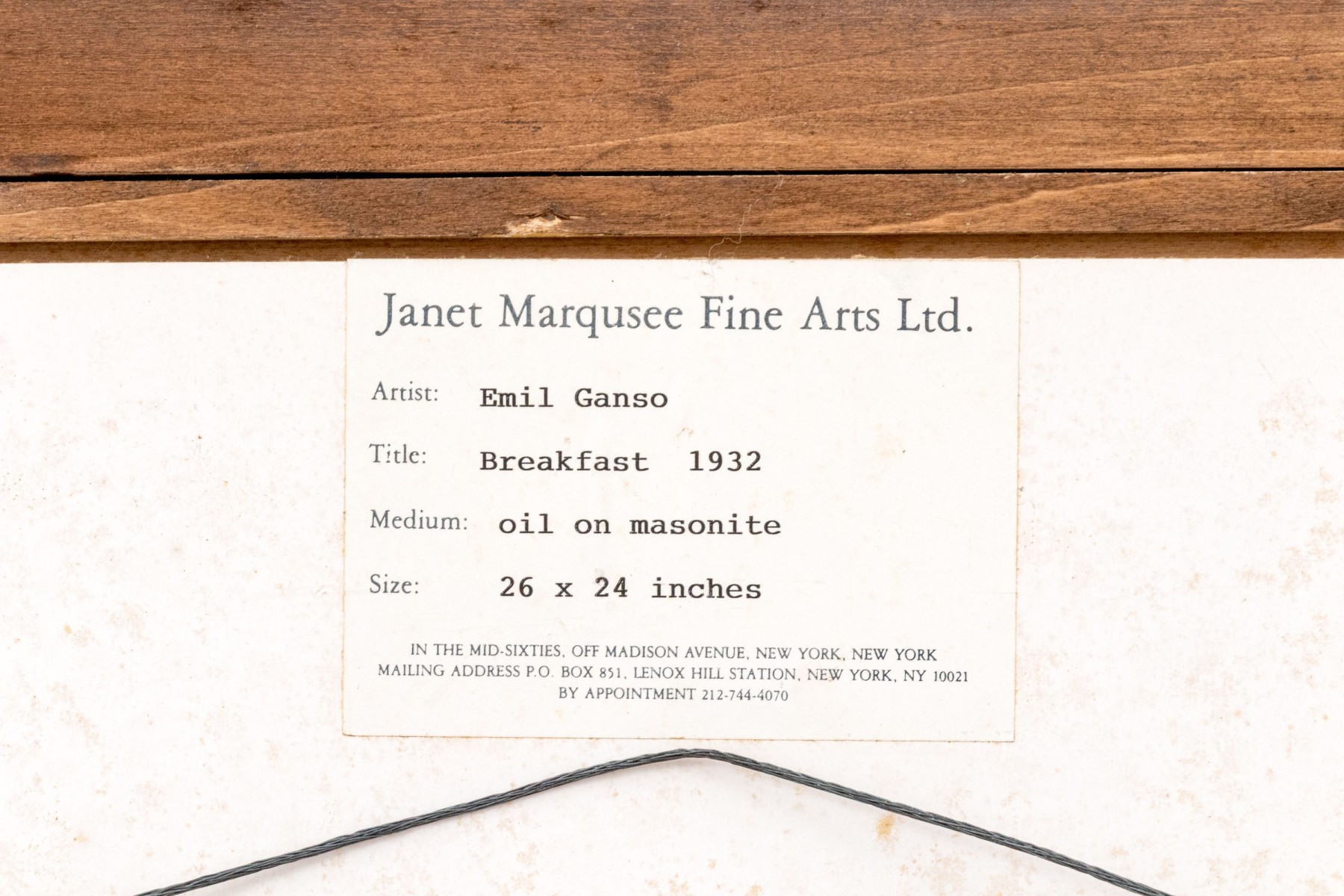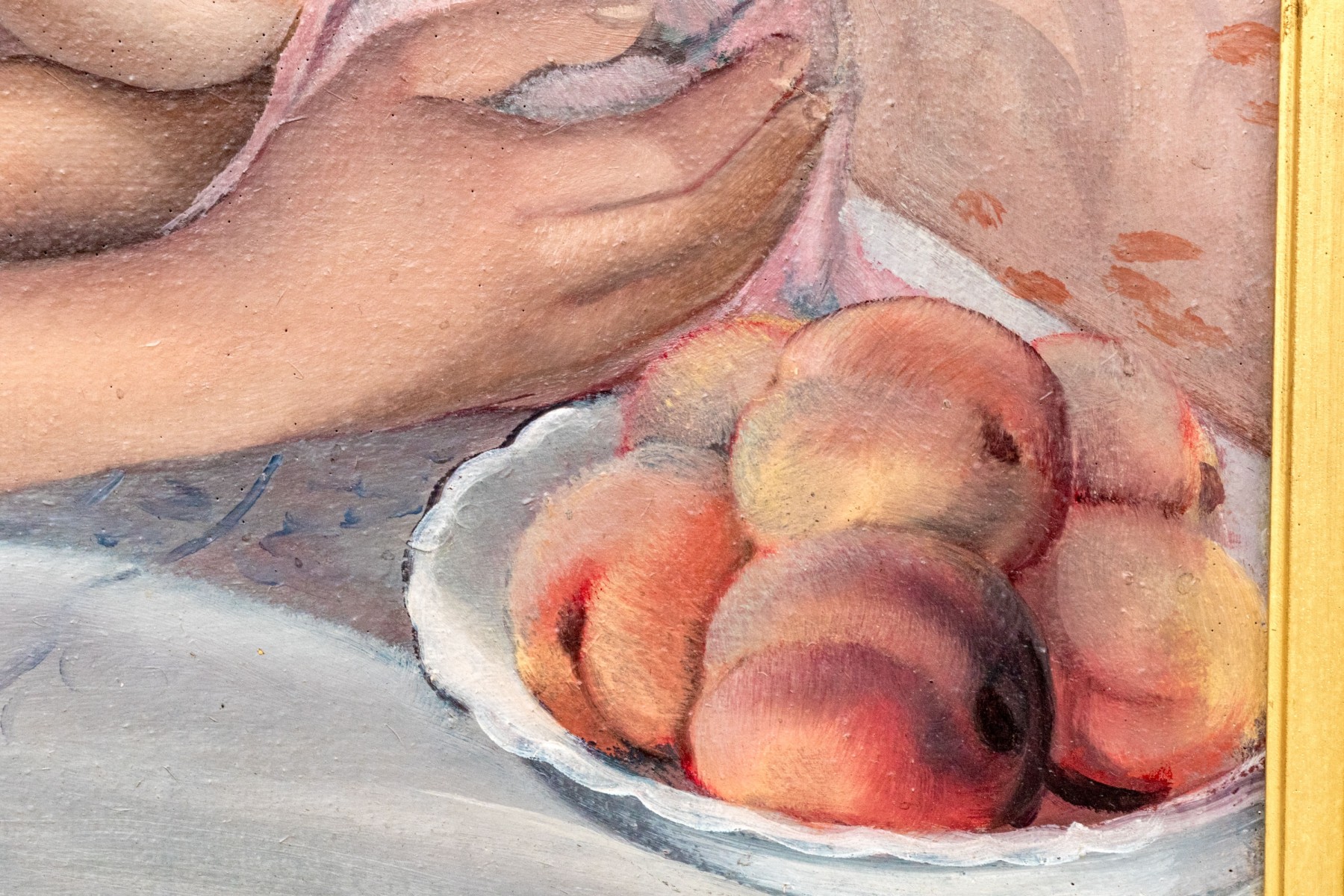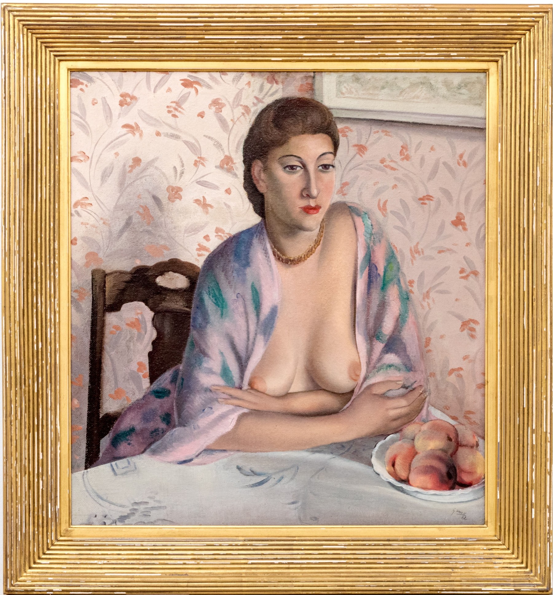 Emil Ganso (German-American, 1895-1941) "Breakfast" oil painting on masonite depicting a female nude draping a pink, green, and blue robe or shawl around her shoulders wearing a gold necklace seated at a table with arms crossed. The figure leans forward in a brown wood fiddle splat chair at a breakfast table covered with a white tablecloth set with a bowl of peaches. The tablecloth features a floral pattern the compliments pale pink wallpaper with vining patterns. Signed lower right and dated 1932.